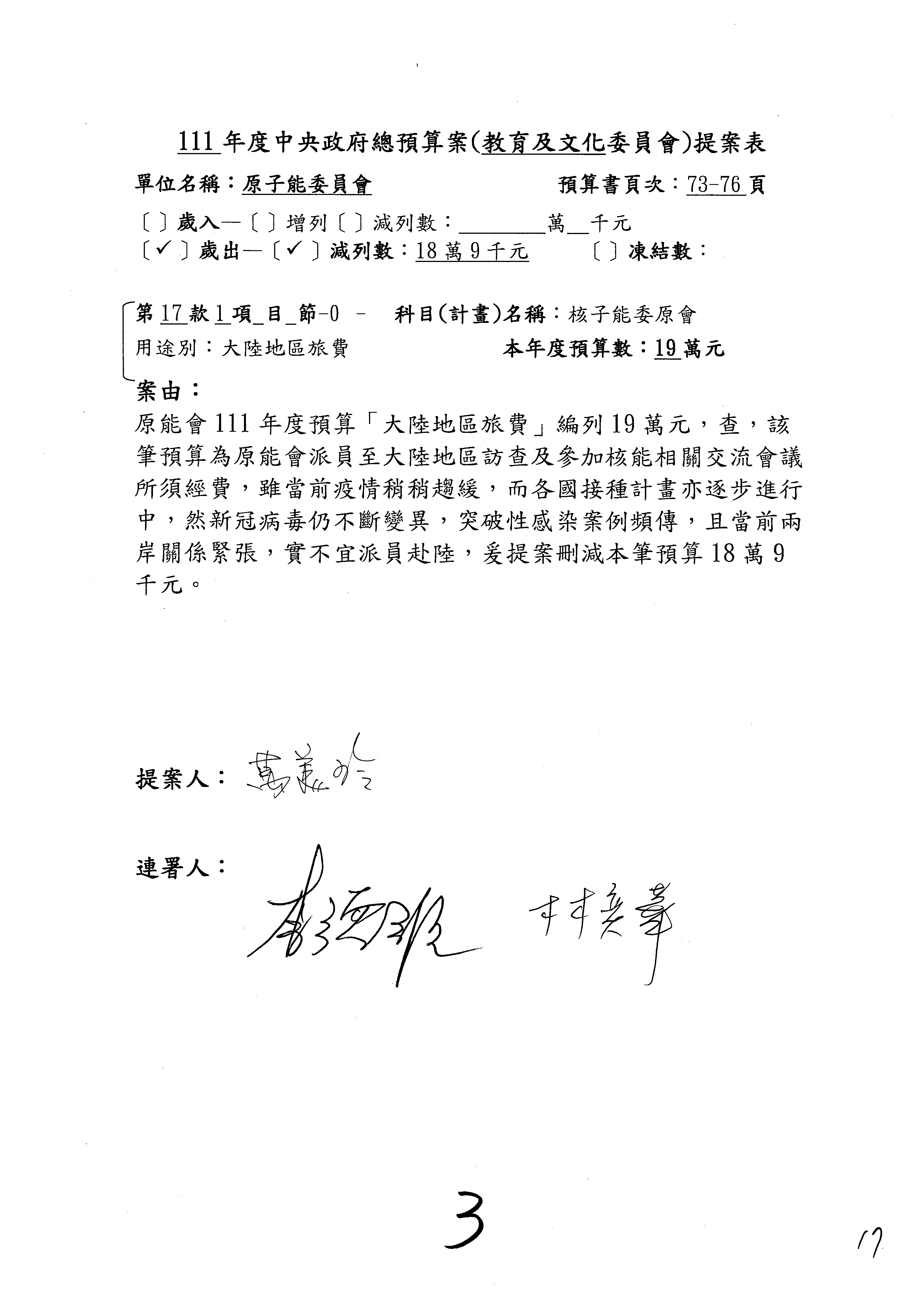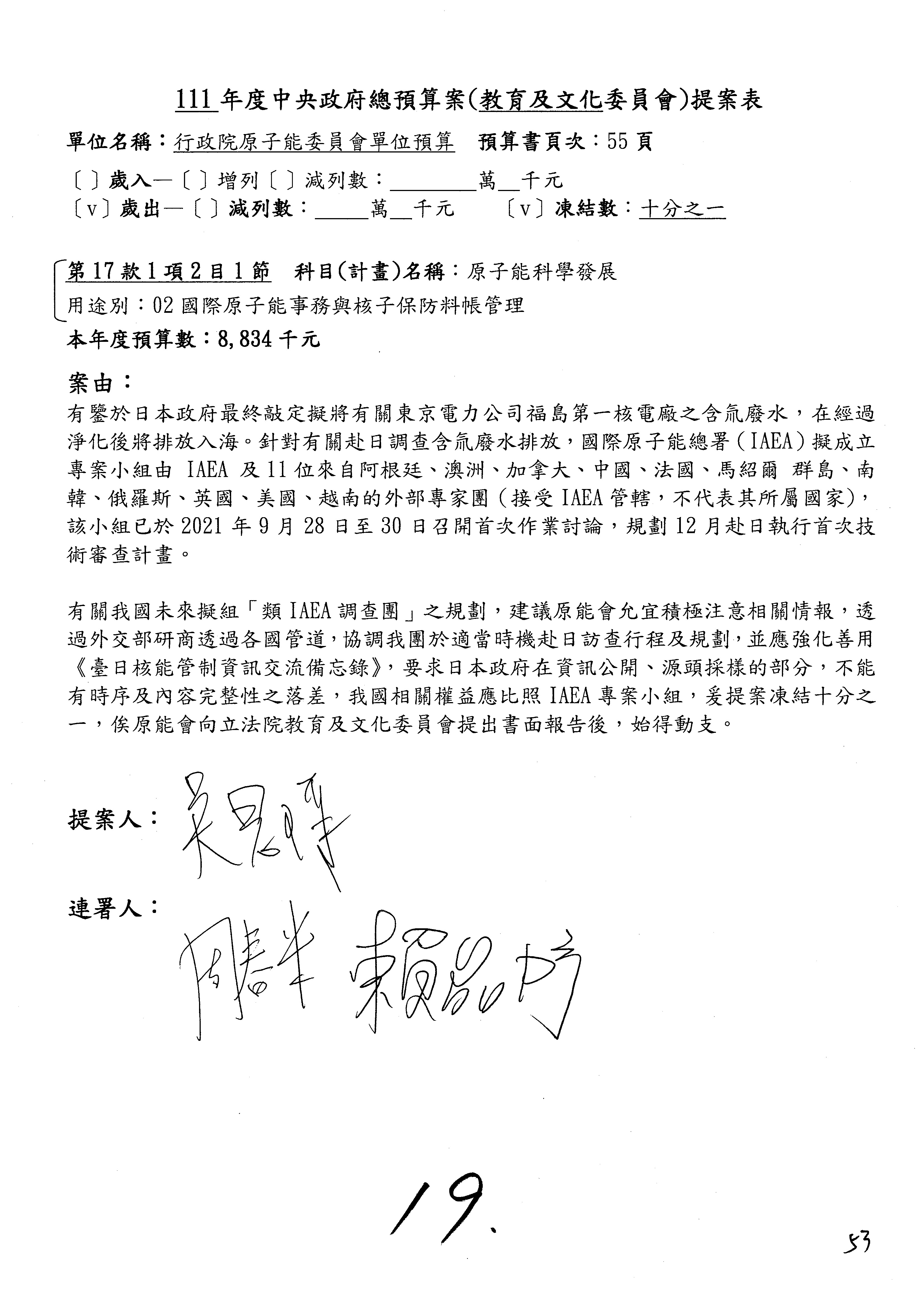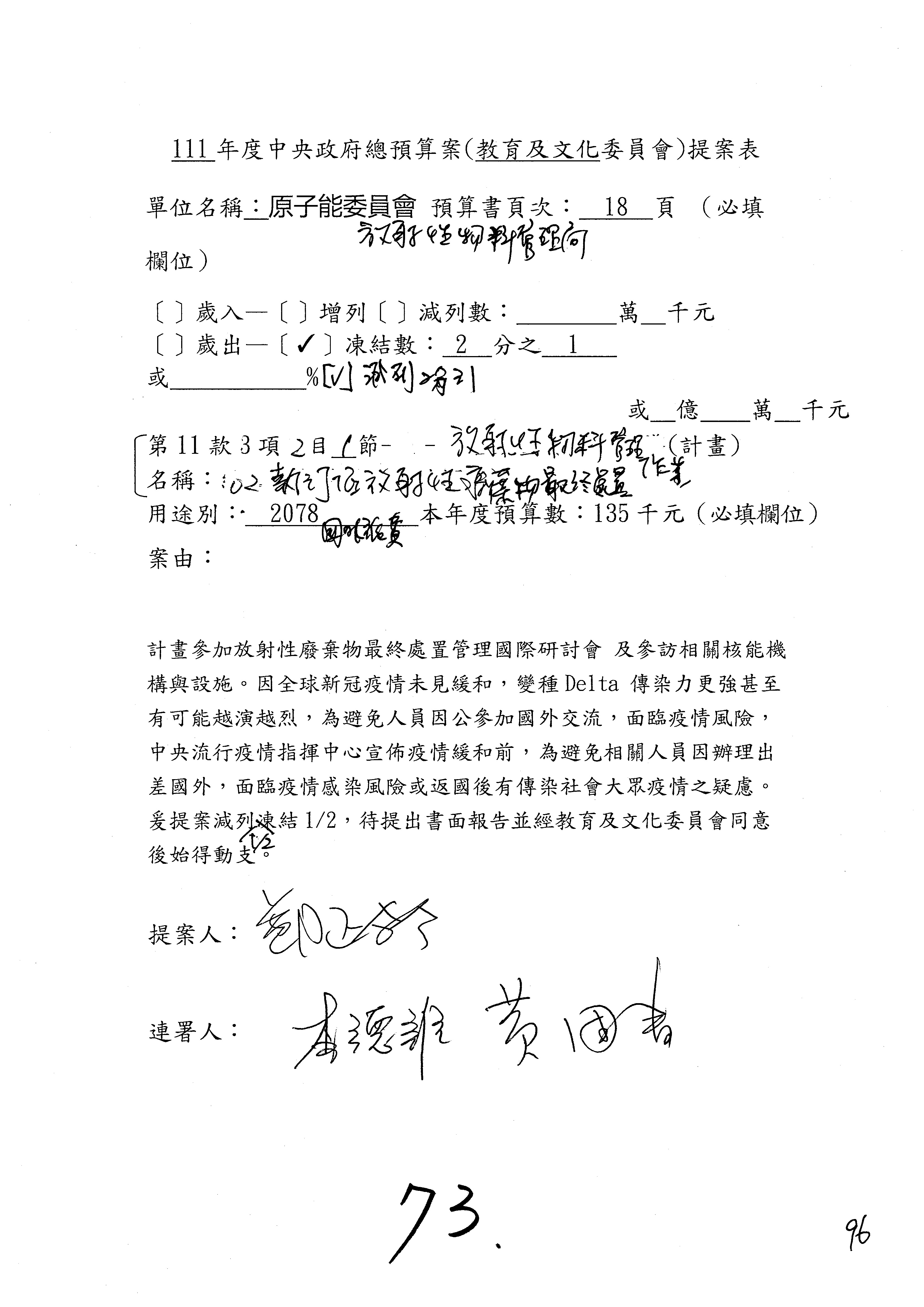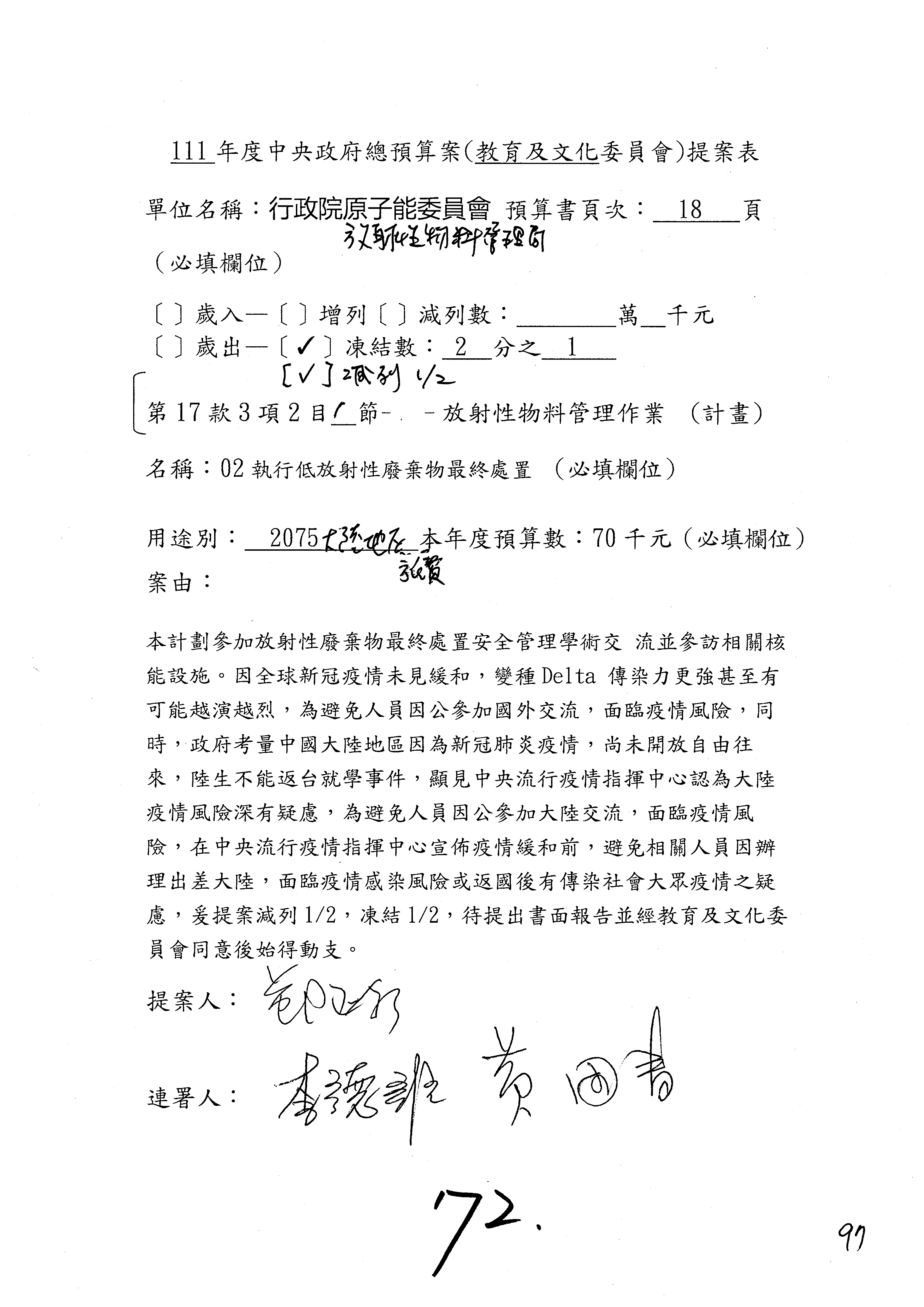 賴委員品妤:本席提的第98案是針對原能會核能研究所核能科技研發計畫之下國外旅費的部分,等一下大家可以討論一下。目前全球的疫情仍處於未明的狀況,全世界的疫情確實持續地存在著,但是不可否認其實一些國際間的交流也開始慢慢地展開,而且是視訊之外的。所以我希望等一下原能會能夠初步針對明年的交流計畫、預計的交流計畫做一個簡單的說明,我也希望之後一定要有一個詳細的書面報告給我。至於凍結的部分,我覺得等一下我們可以再來討論。
