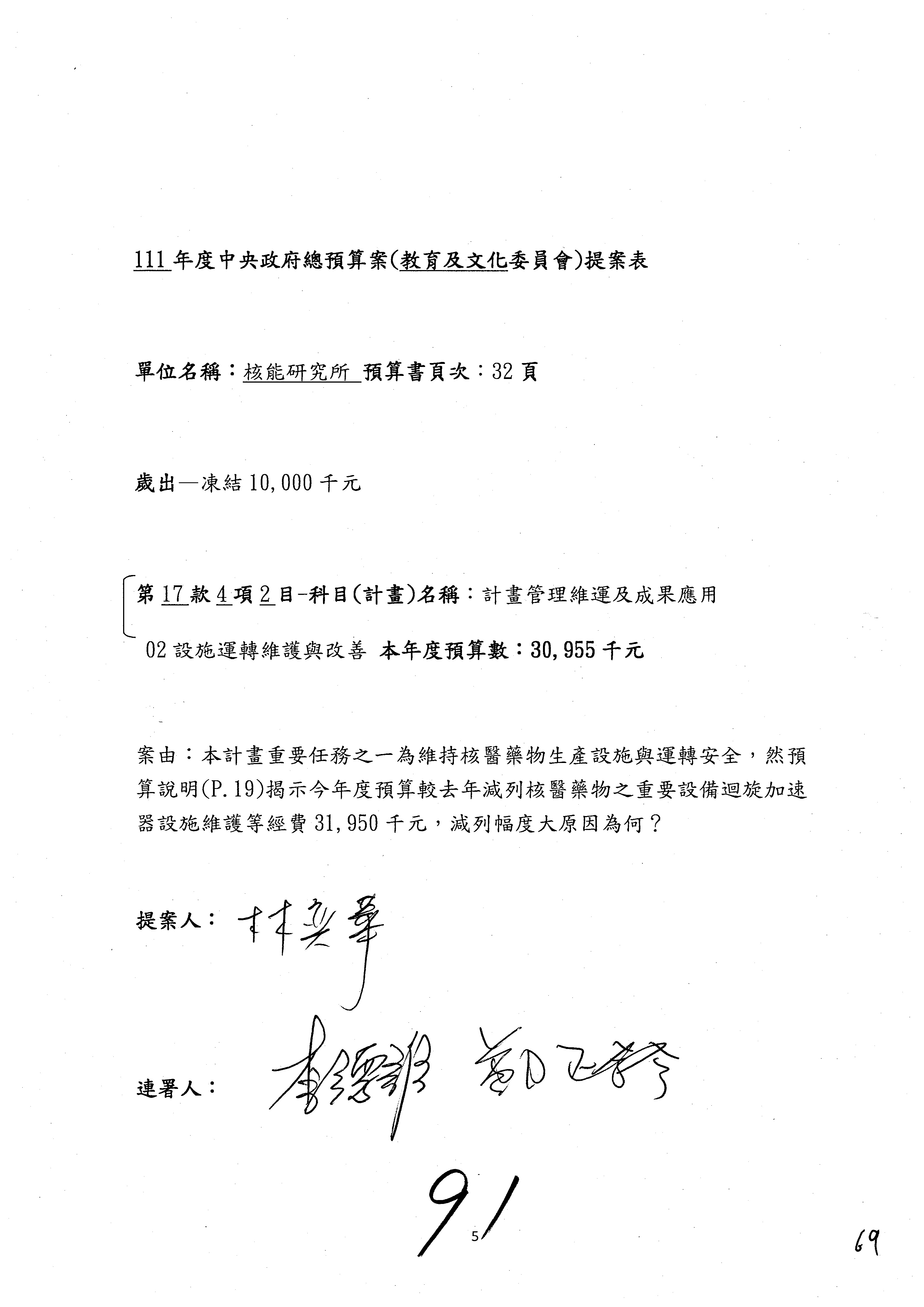 林委員奕華:本席有兩項提案,分別是第91案及第93案,第91案主要是在去年審查預算時,包括張廖萬堅委員和黃國書委員都有提出主決議,我們也都很支持,也就是關於核醫藥物的部分,希望可以針對重要設備─迴旋加速器想辦法爭取新的,因為去年是第27年,今年已經是第28年了。去年大家都很支持這項決議,但是我看到在今年的說明當中,一是因為預算減少,主要是去年已經換了一個大的東西,所以今年就不需要那麼多錢,可是我看到你們的意思是今年1月到10月的當機率僅8%,你們好像是覺得8%和以前的23.1%比起來少很多,但也不能說8%的當機率就很少啊!因為去年委員所提出的主決議我們都很支持,這部分現在到底有沒有換新的可能?