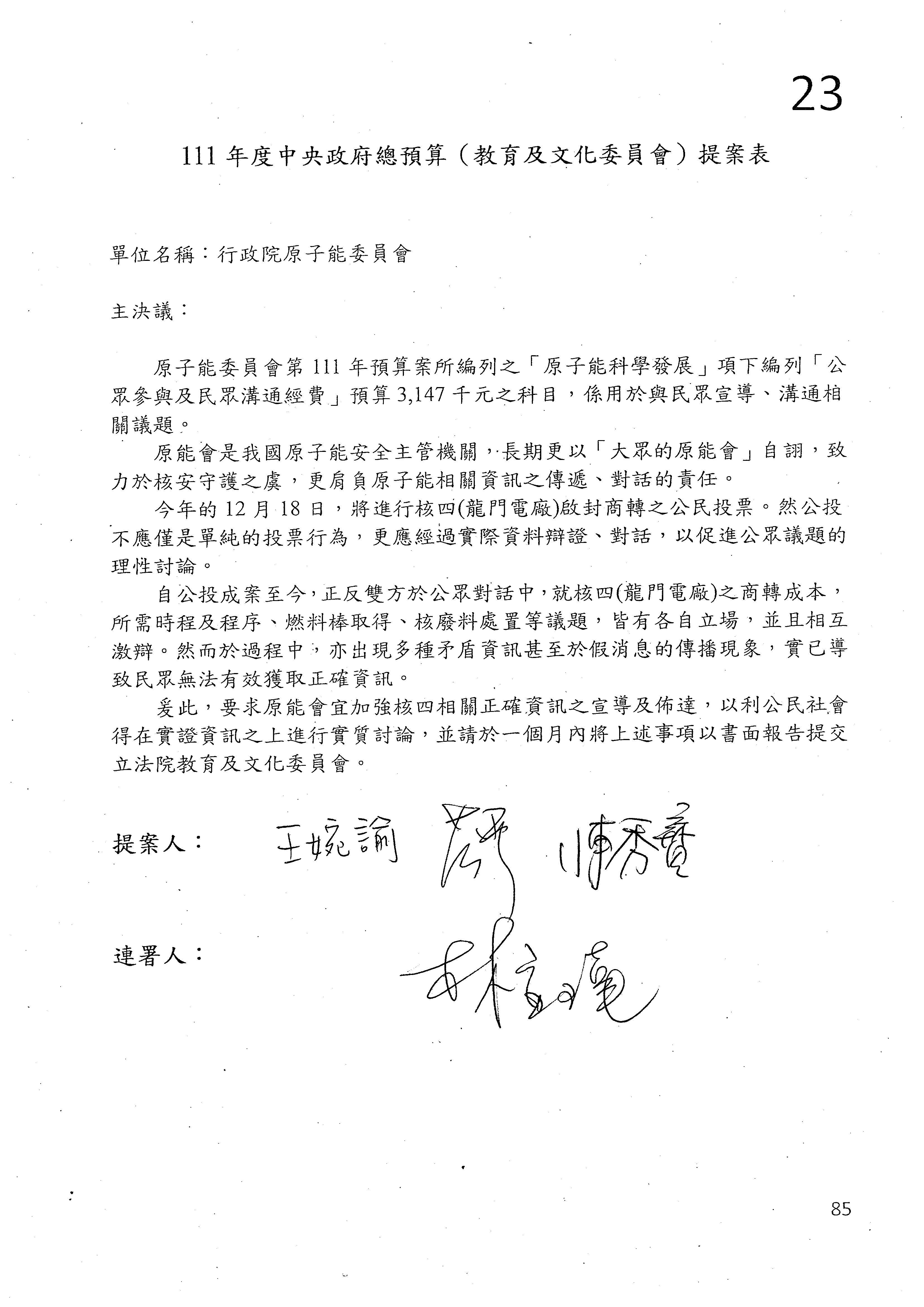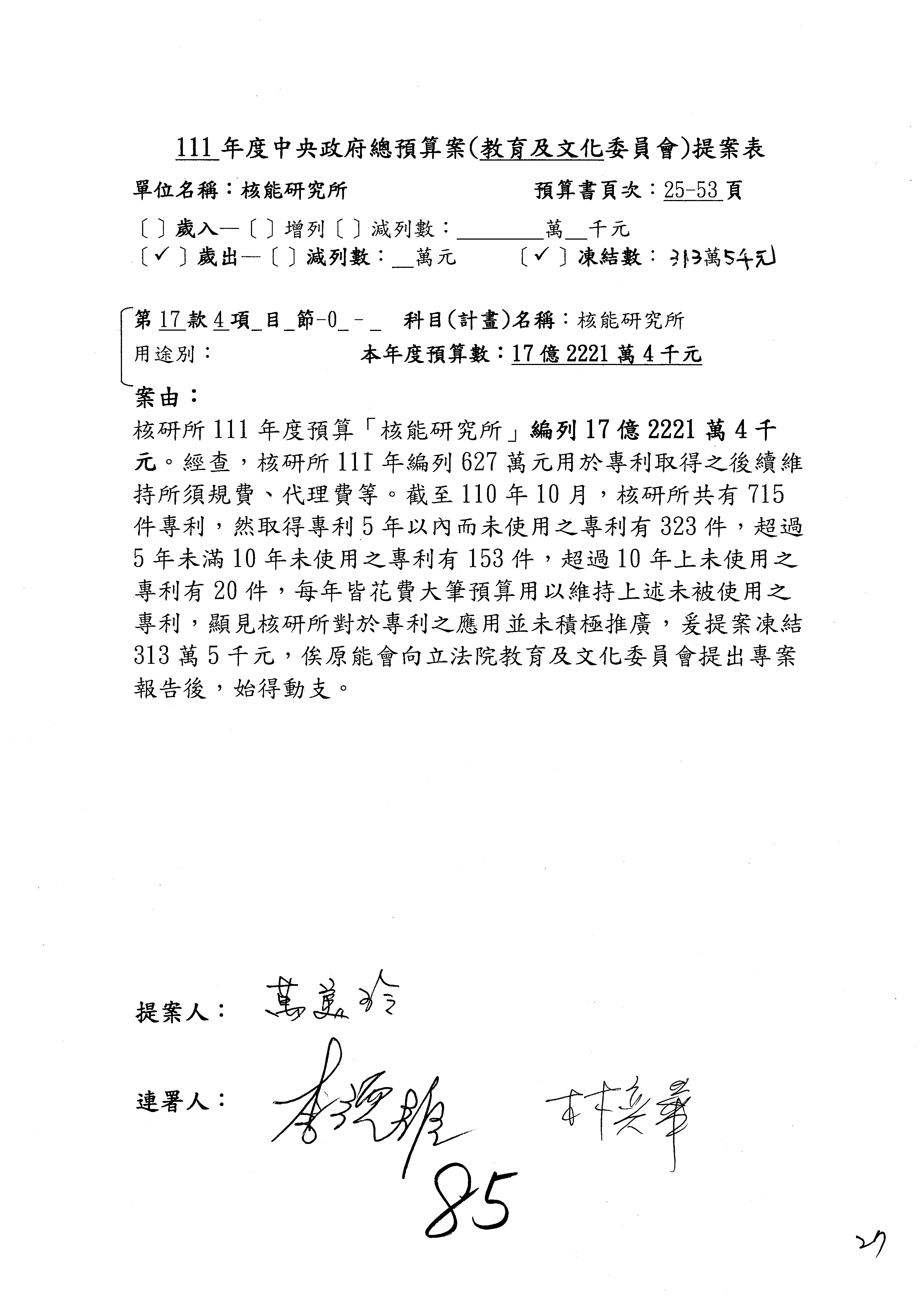 第85案相關預算數為17億多,目前萬委員美玲不在場,相關預算照列。