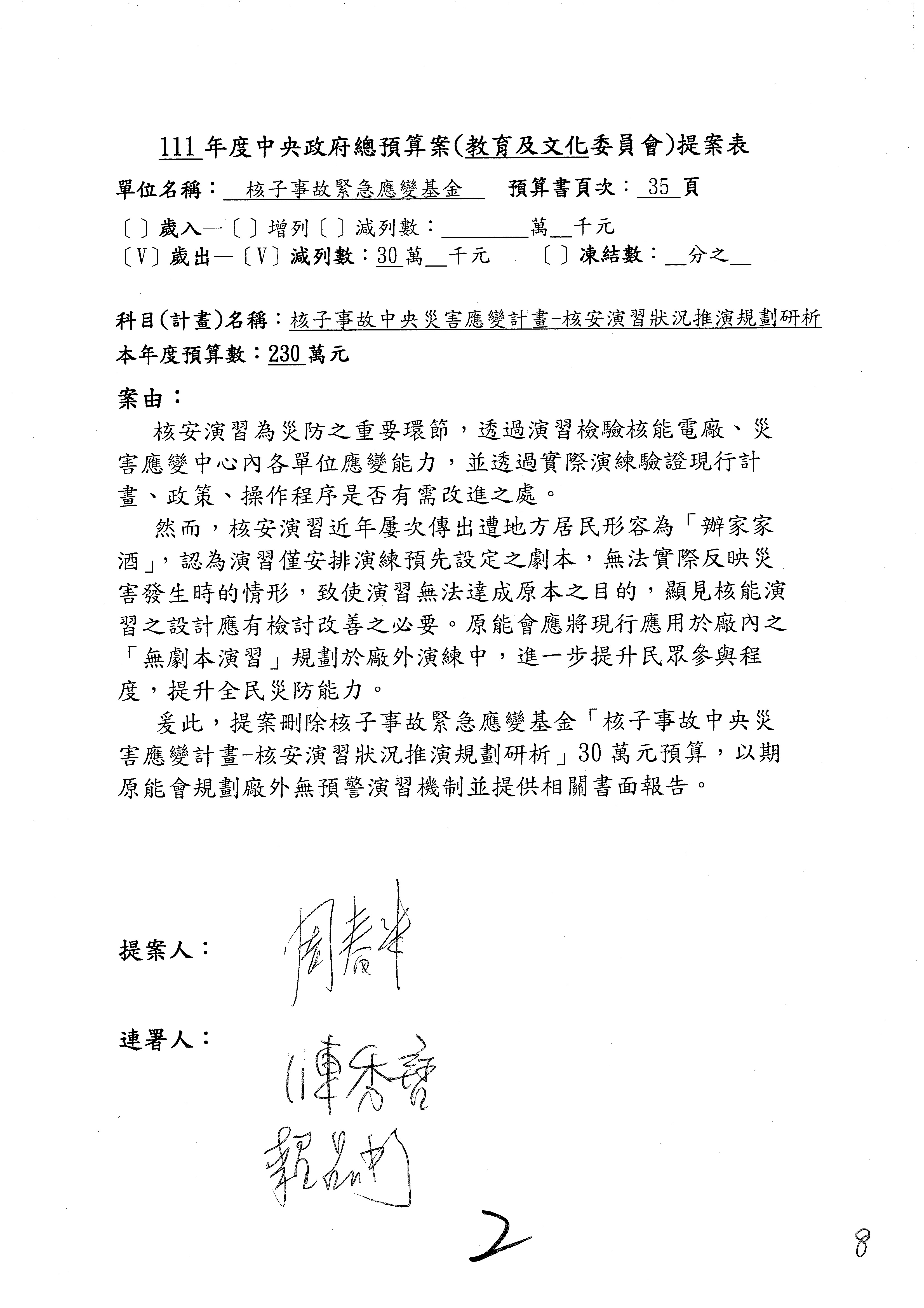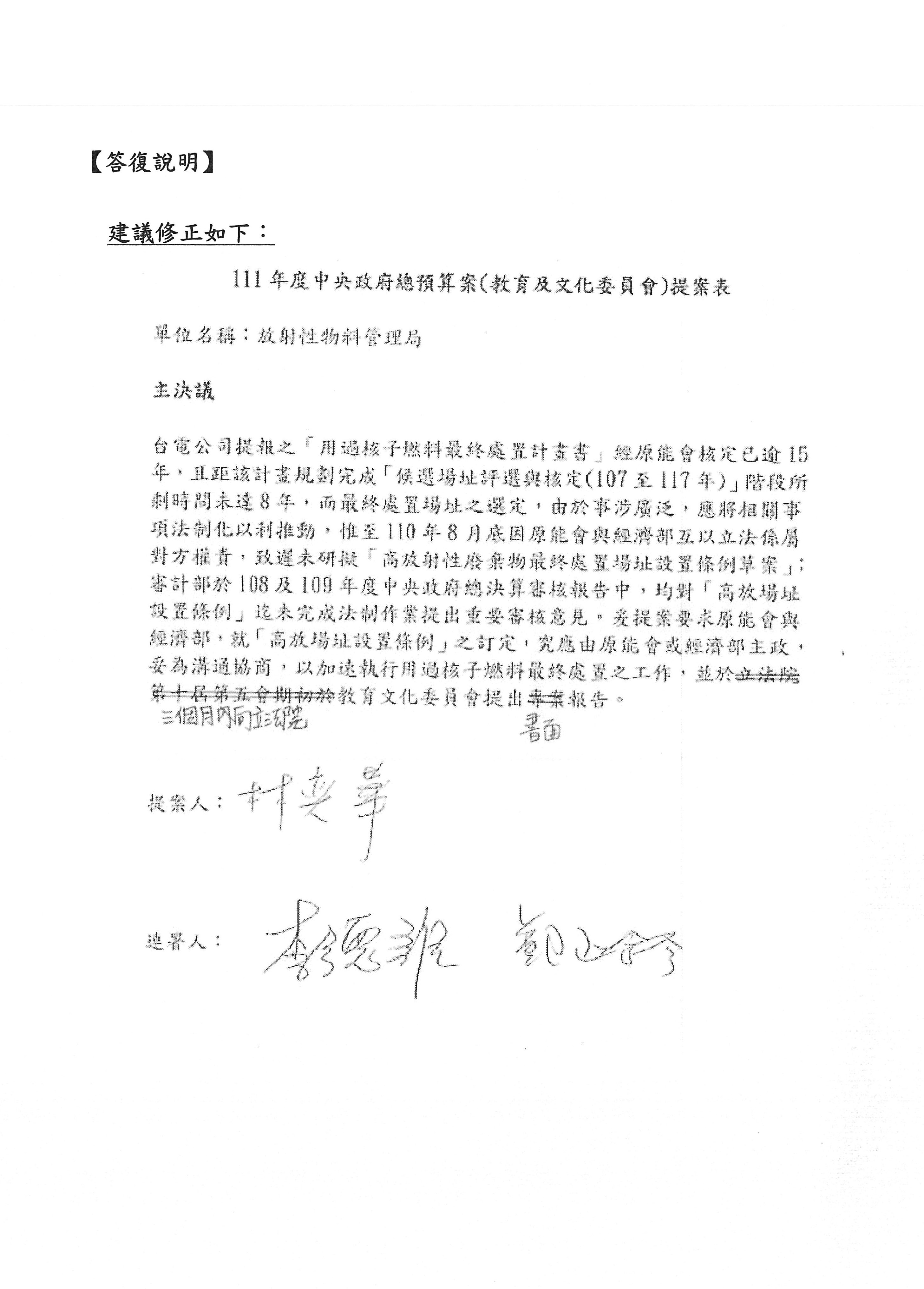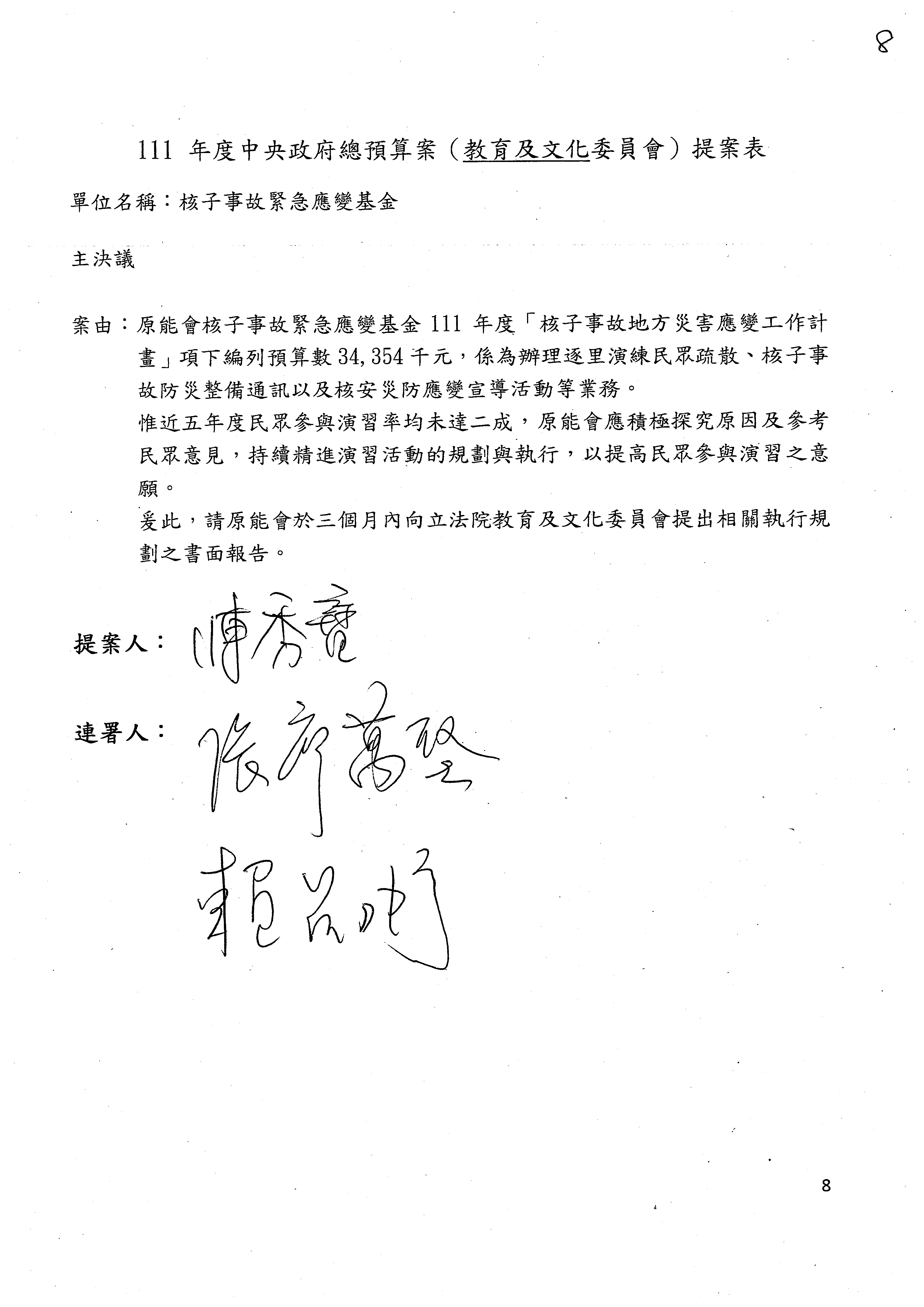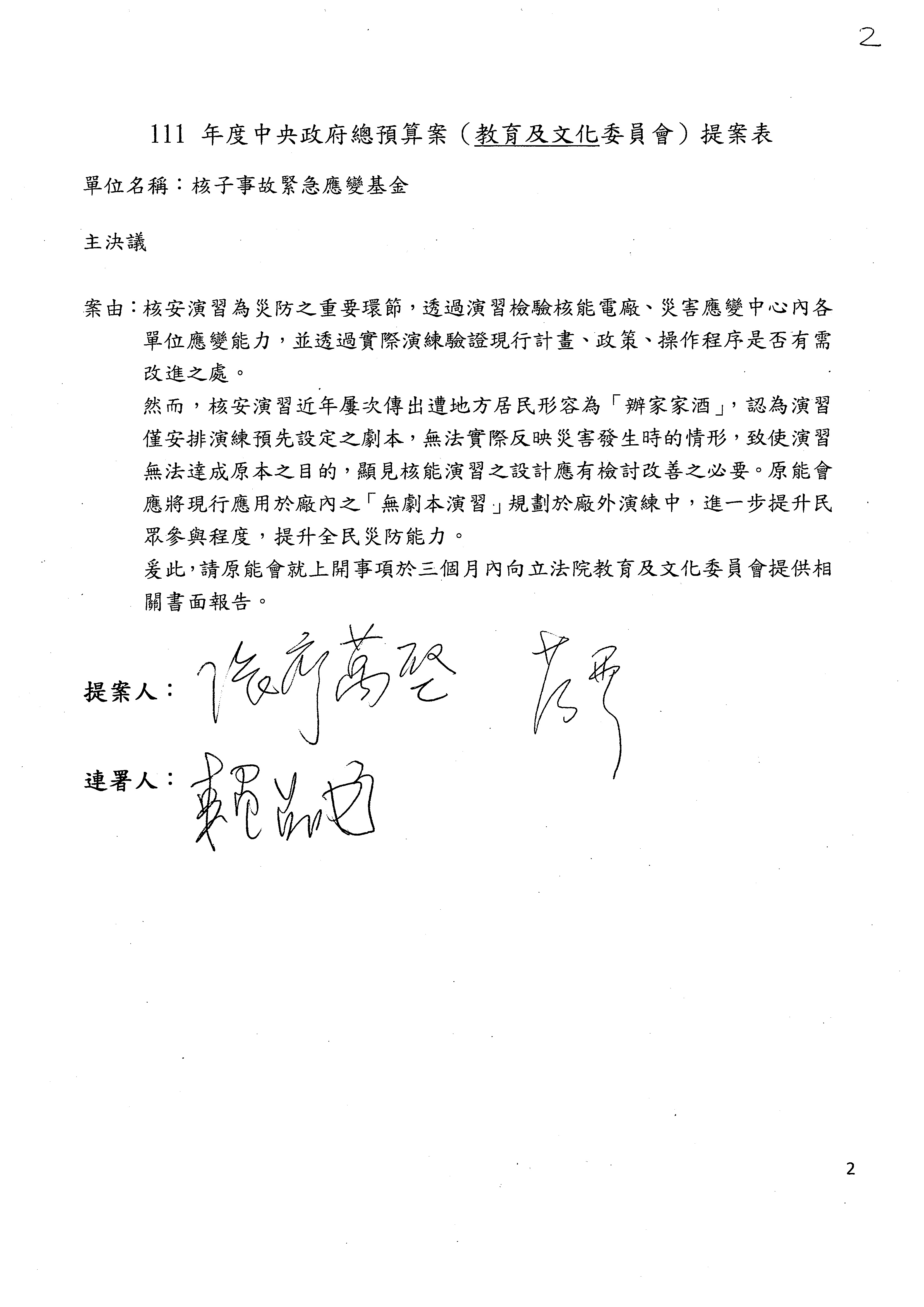 張廖委員萬堅:我沒有提案,不過周春米委員請我大概提一下,就是一般來講核安演習都有劇本,但是有了劇本之後,有些居民都會擔心劇本的內容距離現實太遠,所以原能會能不能有一些無劇本的演習,演練突發狀況如何應變,這樣是不是比較能夠提升民眾參與的程度?要不然他們認為有劇本的演習好像辦家家酒,每個人都照著演,行禮如儀,演完了好像就演完了,反而不利於提升全民的災防能力。你們有沒有考慮過舉行類似無劇本的演習來檢視成果?所以周委員才提了小小的減列,可以改凍結,沒關係。