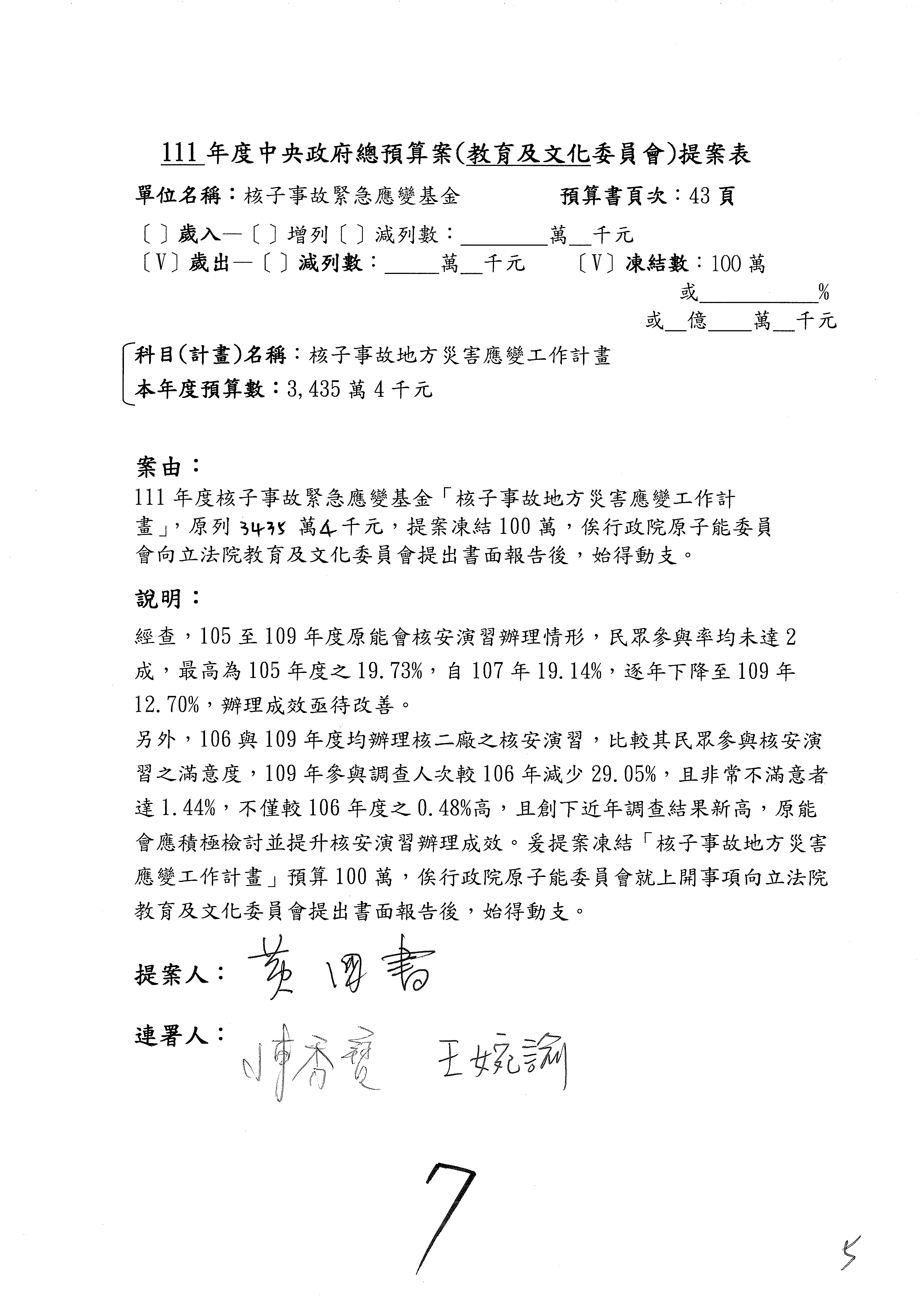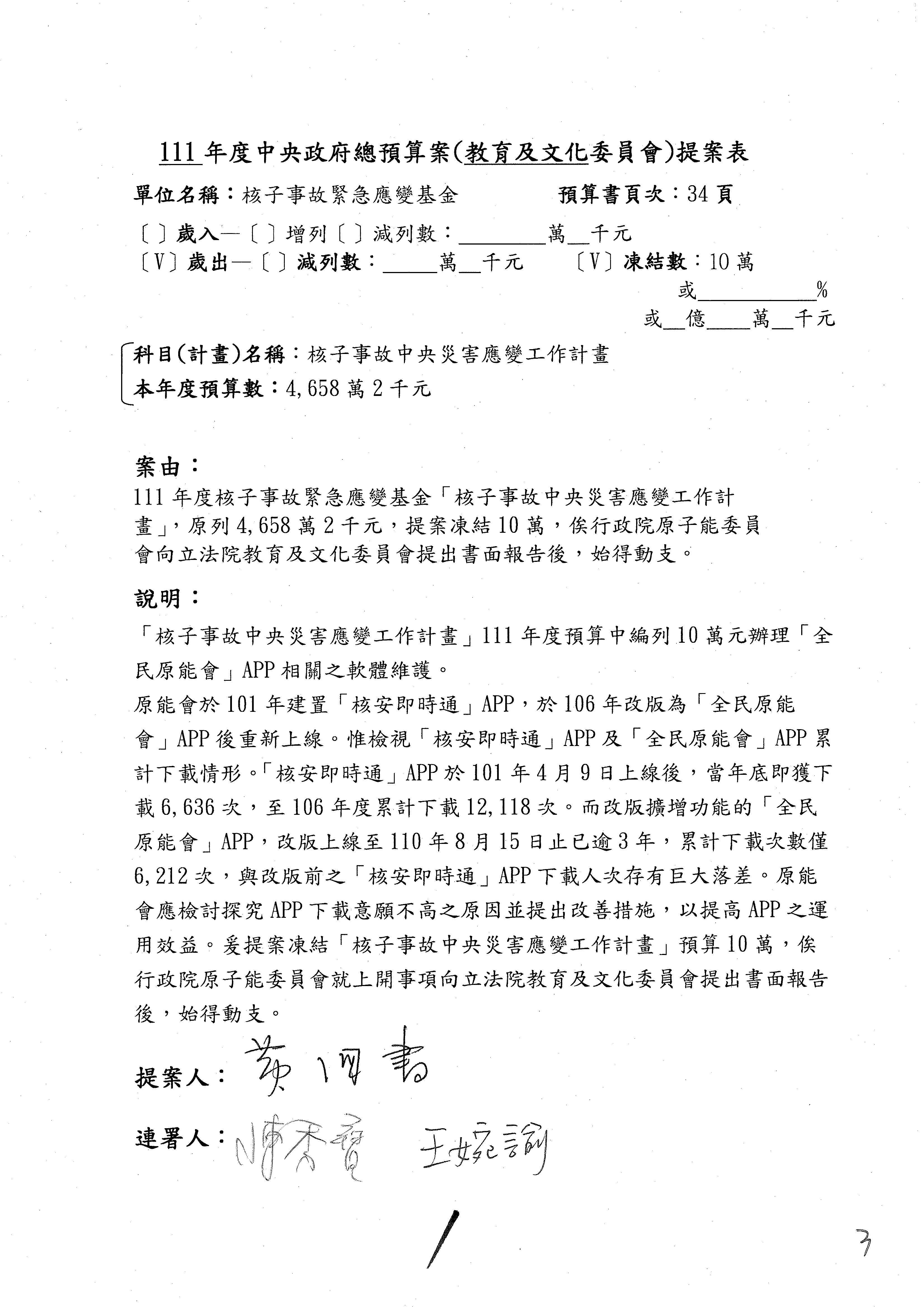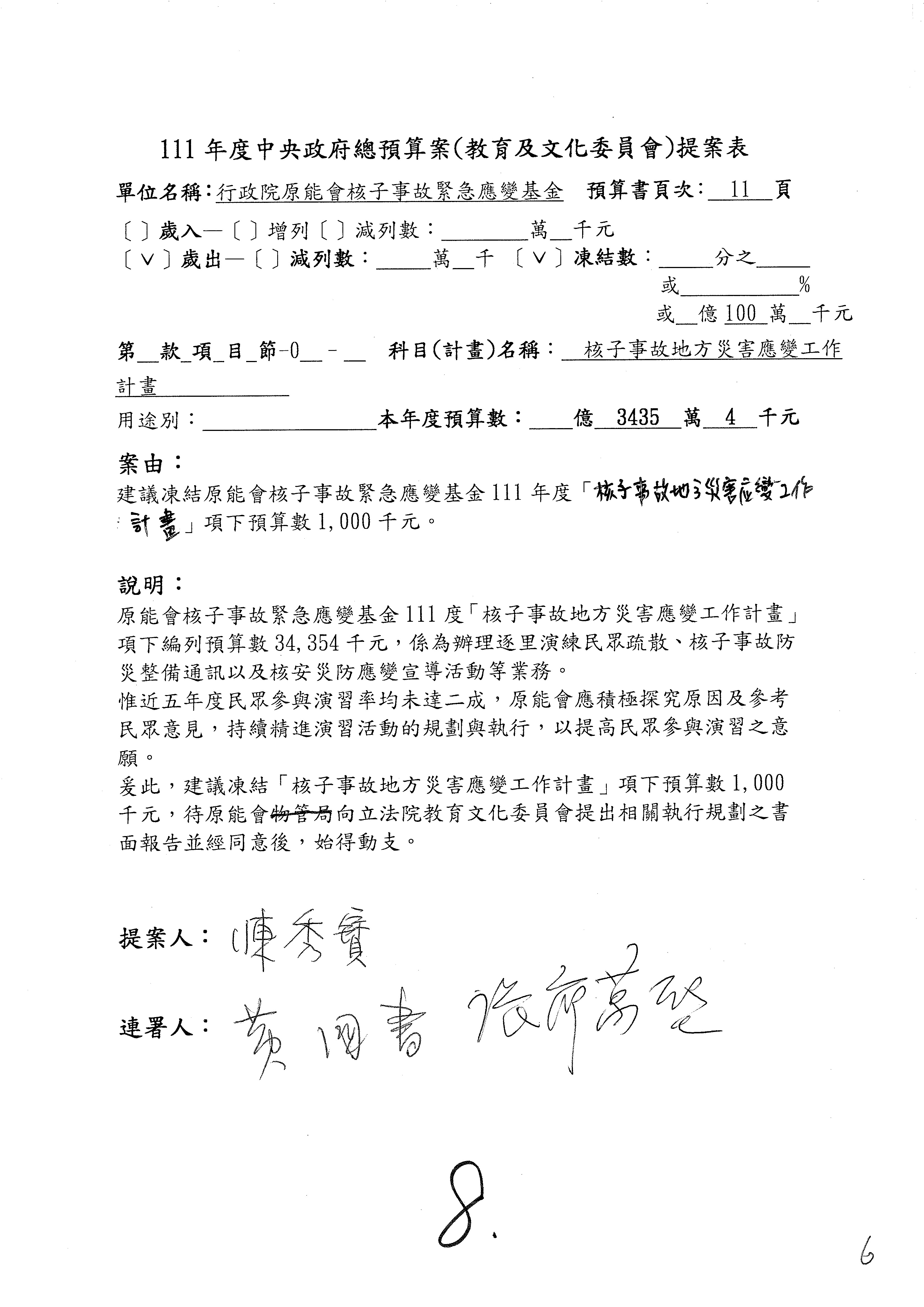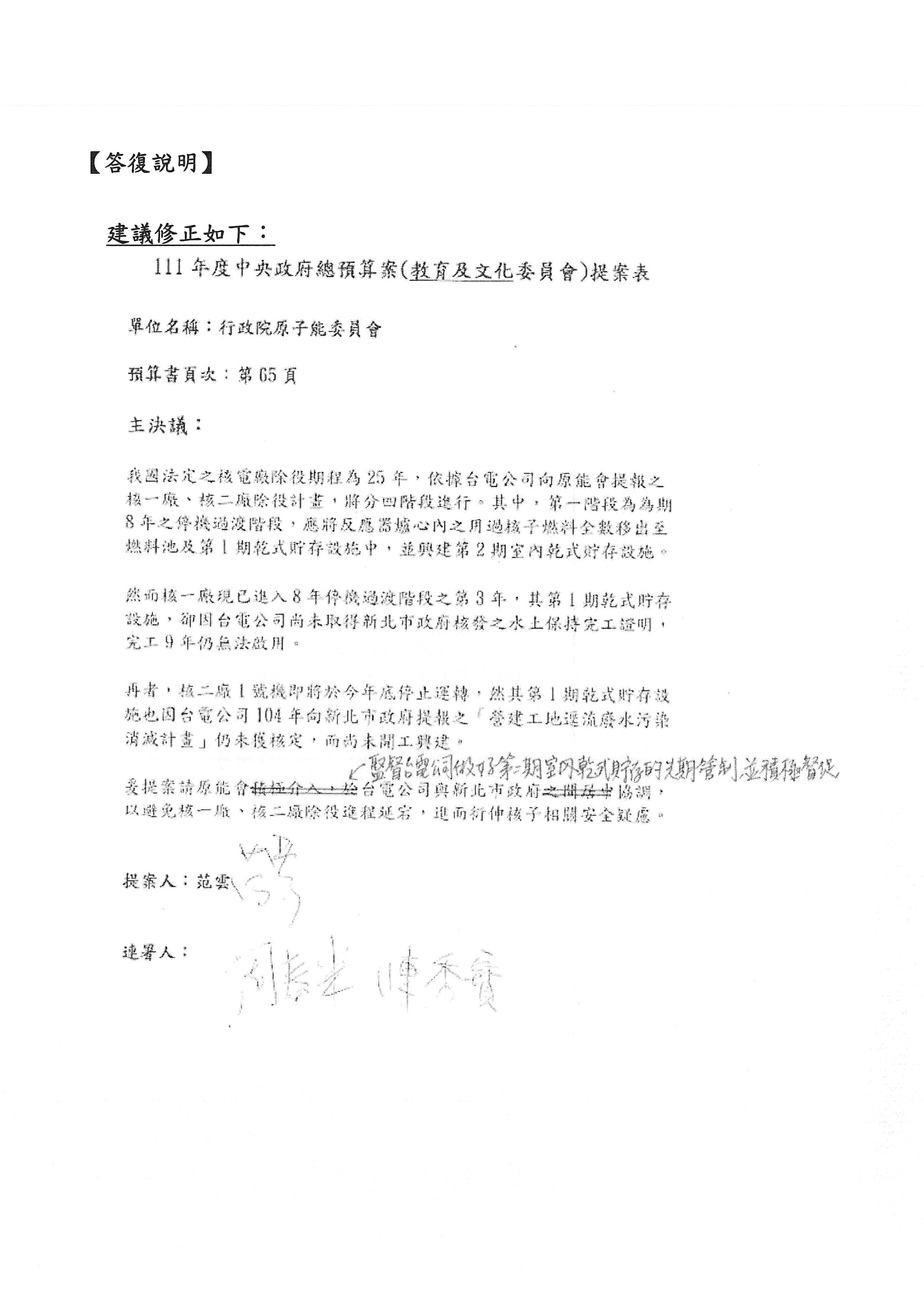 張廖委員萬堅:我沒有提案,不過周春米委員請我大概提一下,就是一般來講核安演習都有劇本,但是有了劇本之後,有些居民都會擔心劇本的內容距離現實太遠,所以原能會能不能有一些無劇本的演習,演練突發狀況如何應變,這樣是不是比較能夠提升民眾參與的程度?要不然他們認為有劇本的演習好像辦家家酒,每個人都照著演,行禮如儀,演完了好像就演完了,反而不利於提升全民的災防能力。你們有沒有考慮過舉行類似無劇本的演習來檢視成果?所以周委員才提了小小的減列,可以改凍結,沒關係。