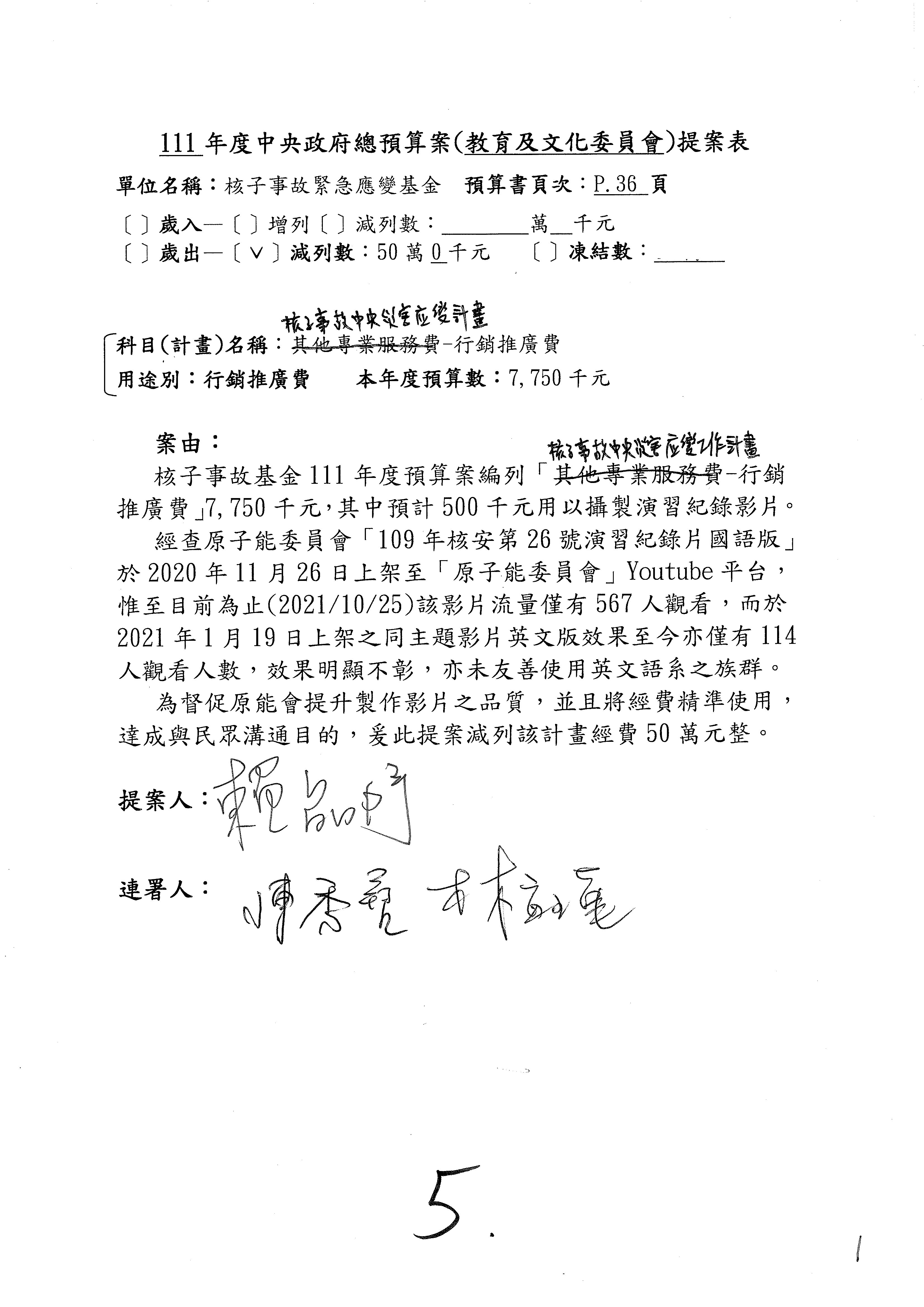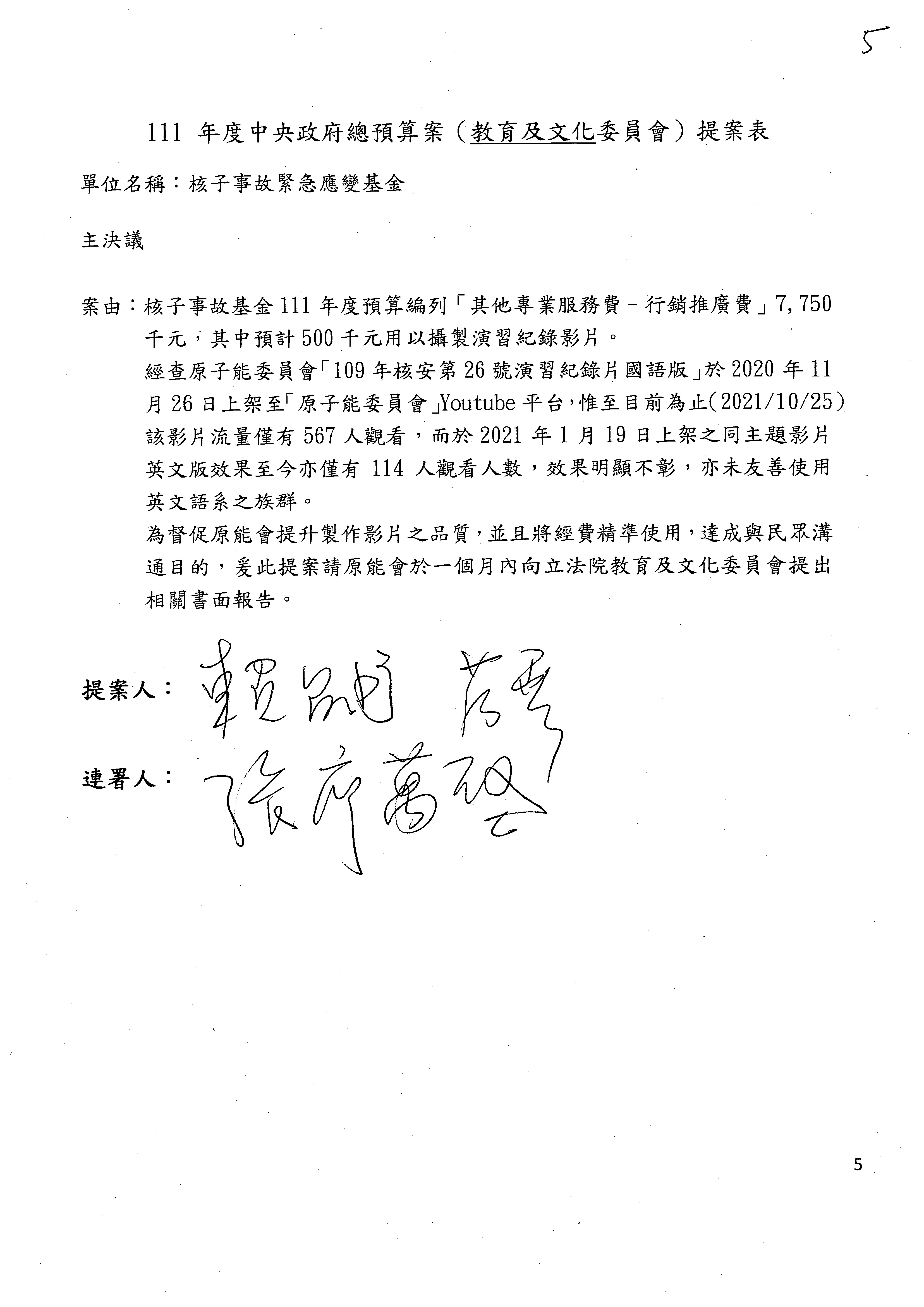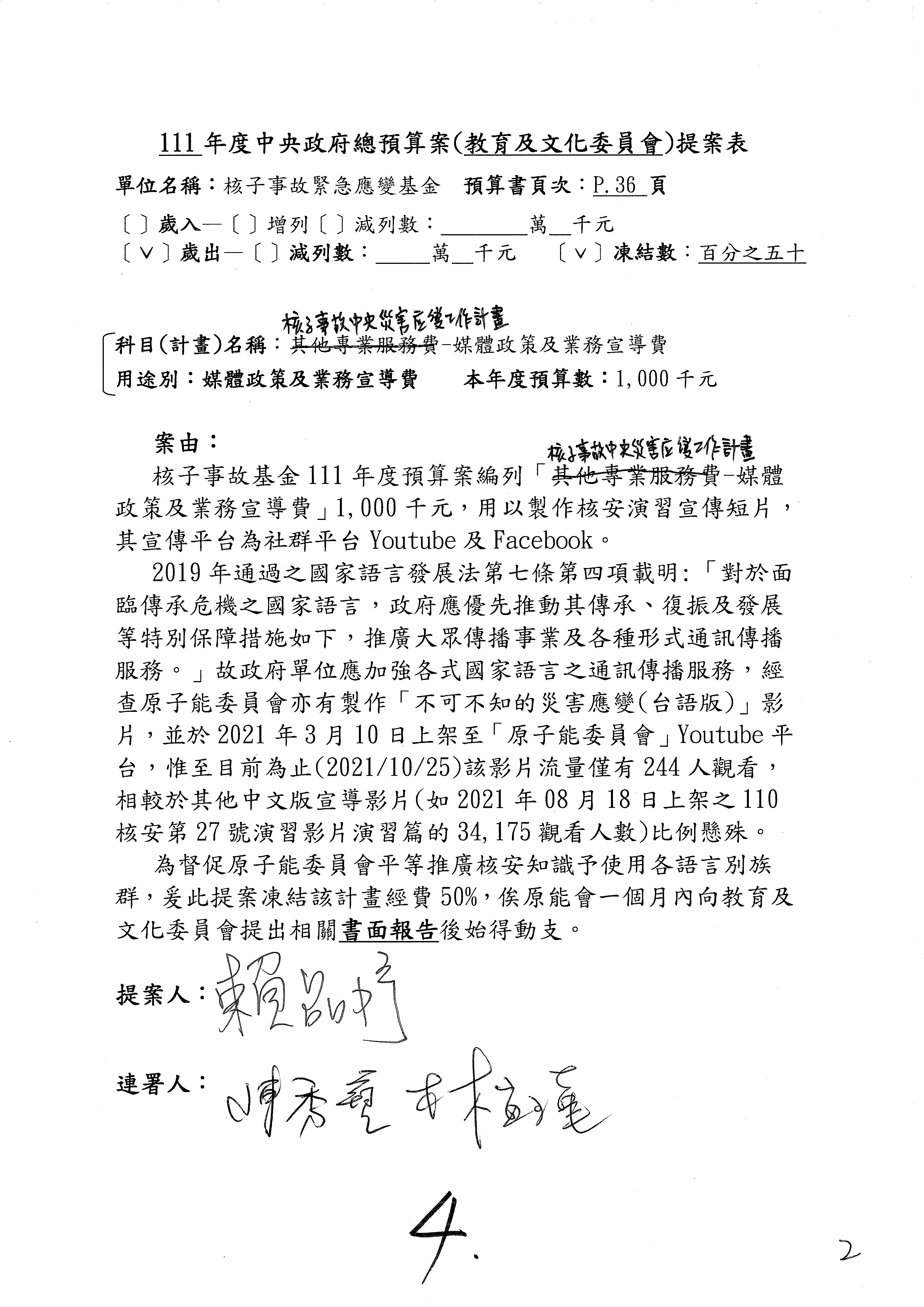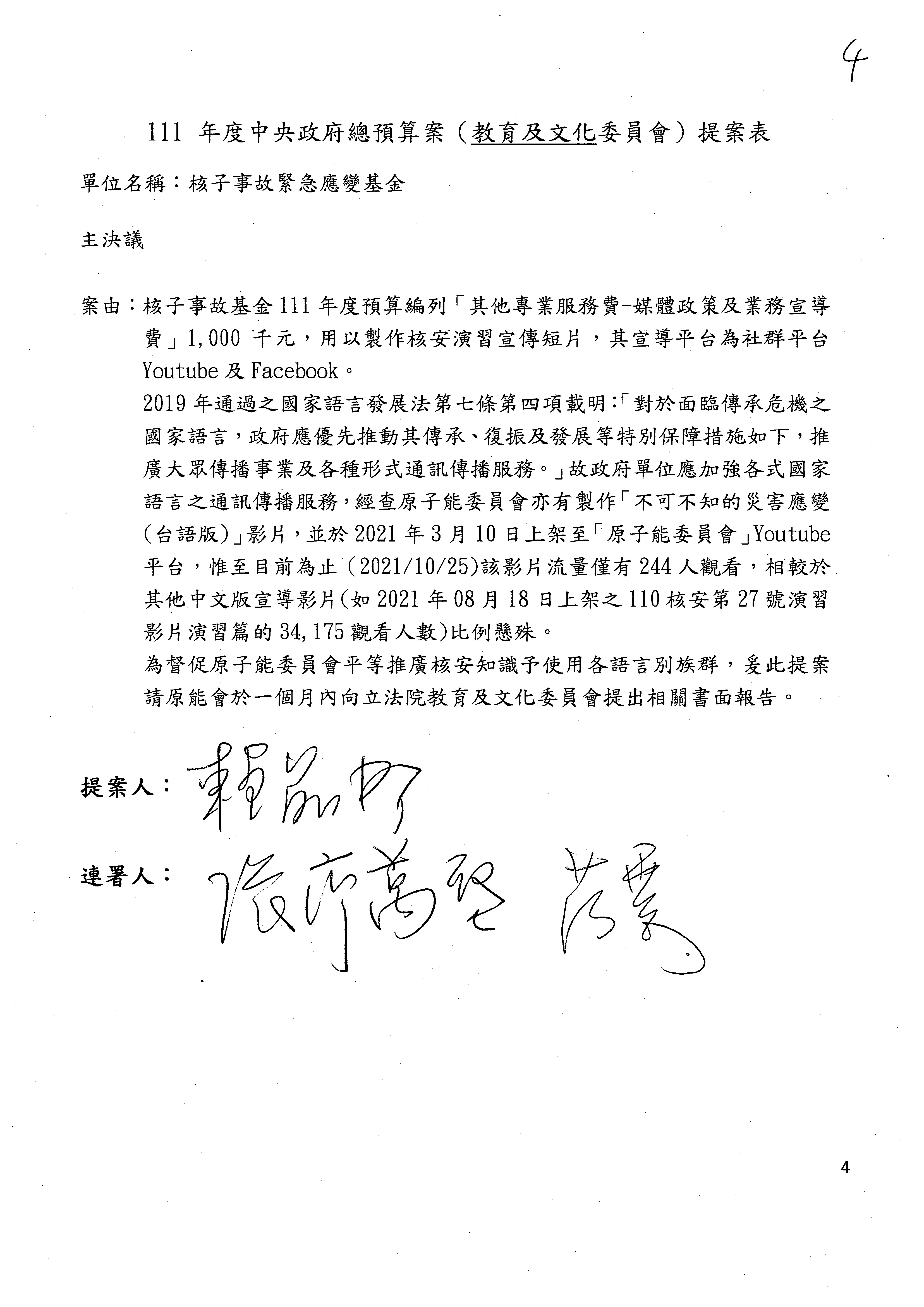 賴委員品妤:本席的提案是第4案及第5案,我覺得這兩個案子的問題都是一樣的。這兩個案子主要是針對原能會有撥預算去做一些宣導短片,宣傳的平臺都是YouTube及Facebook。第一個,尤其是以我的選區的特殊性,我確實覺得要跟民眾好好地解釋清楚這些東西是很必要的一件事情,因為很多東西原能會可能在網站上有寫,但是民眾不一定有辦法或能夠主動地看到這些資訊,其實很多應該宣導的東西,我們也會遇到民眾一問再問。