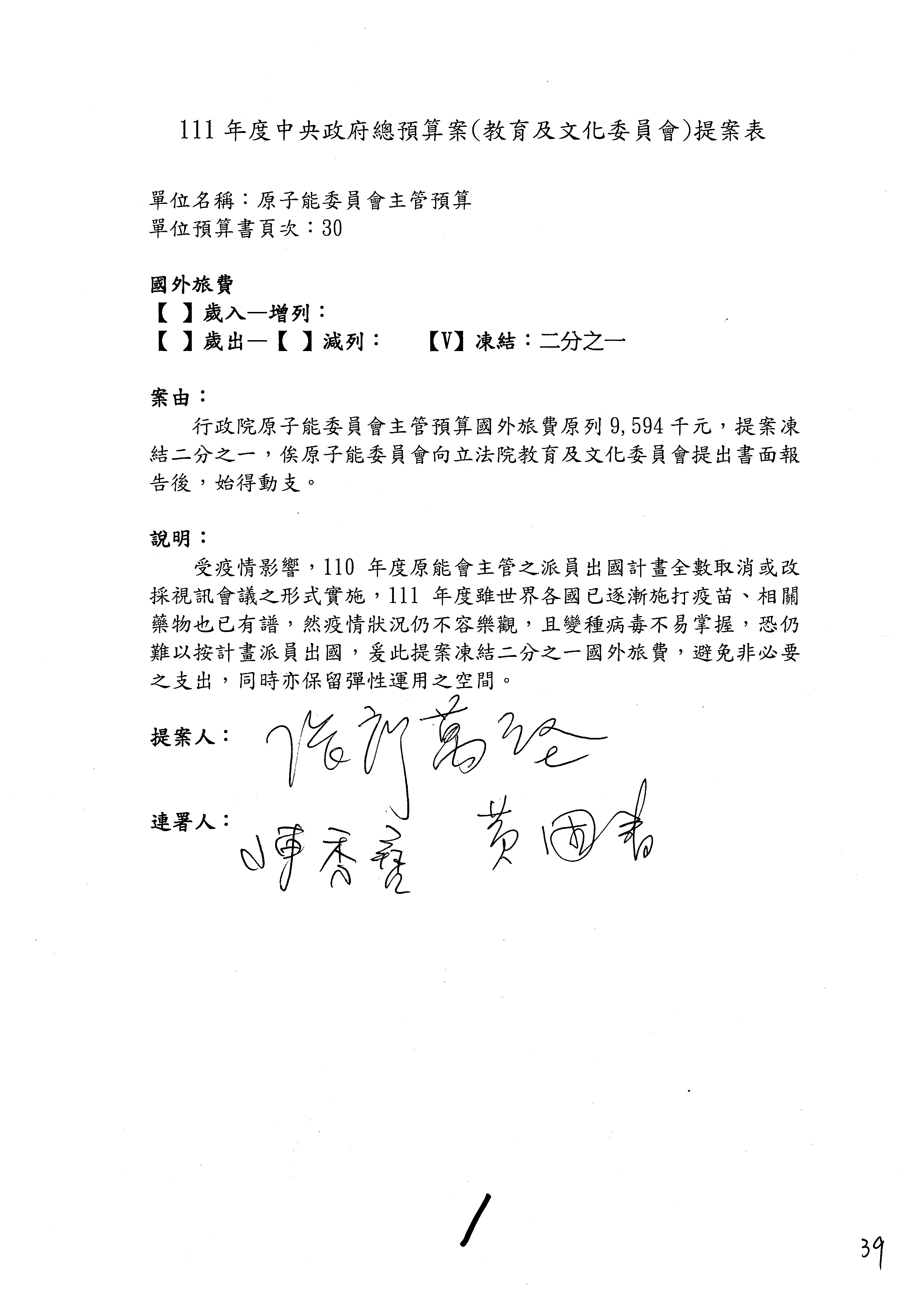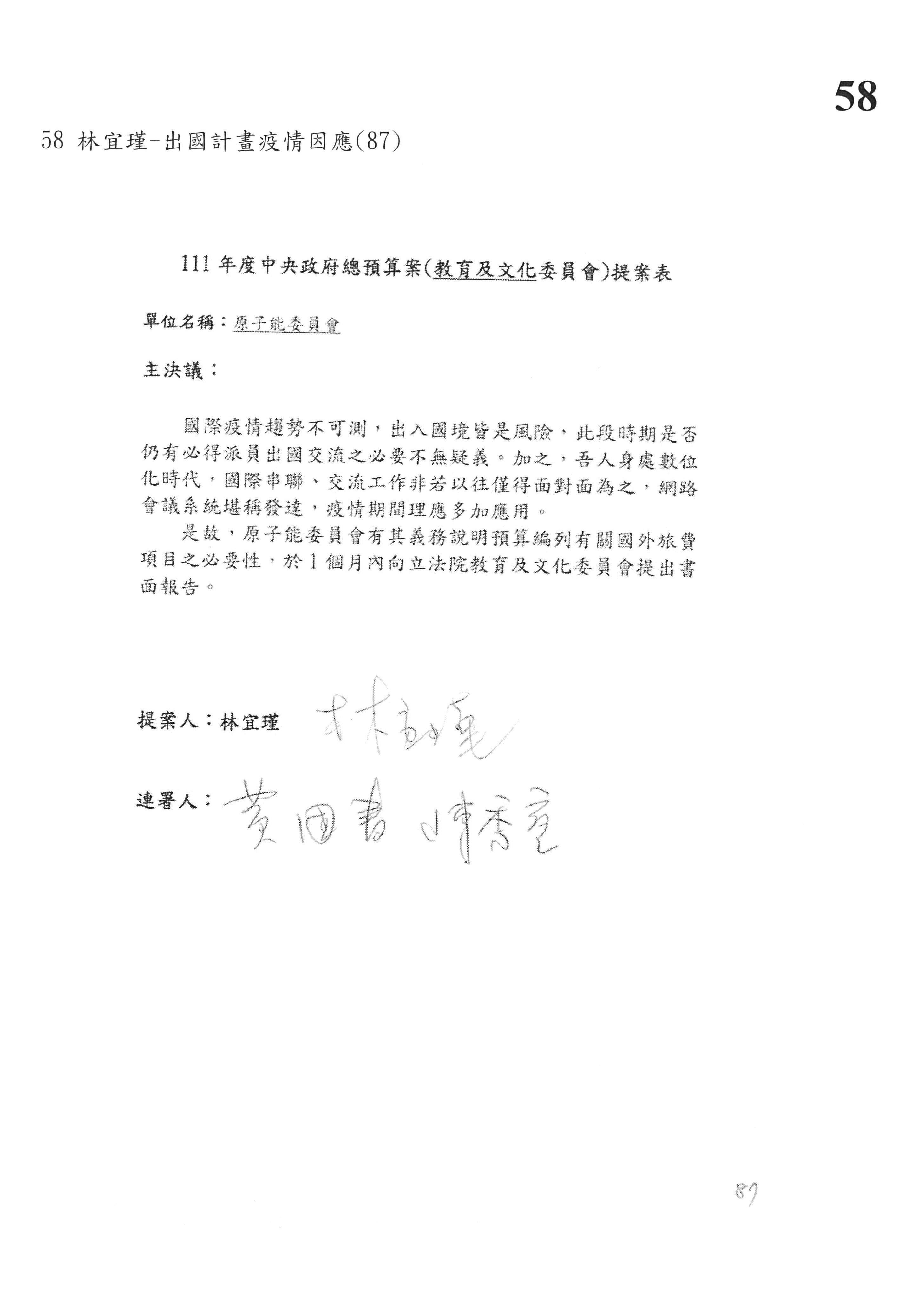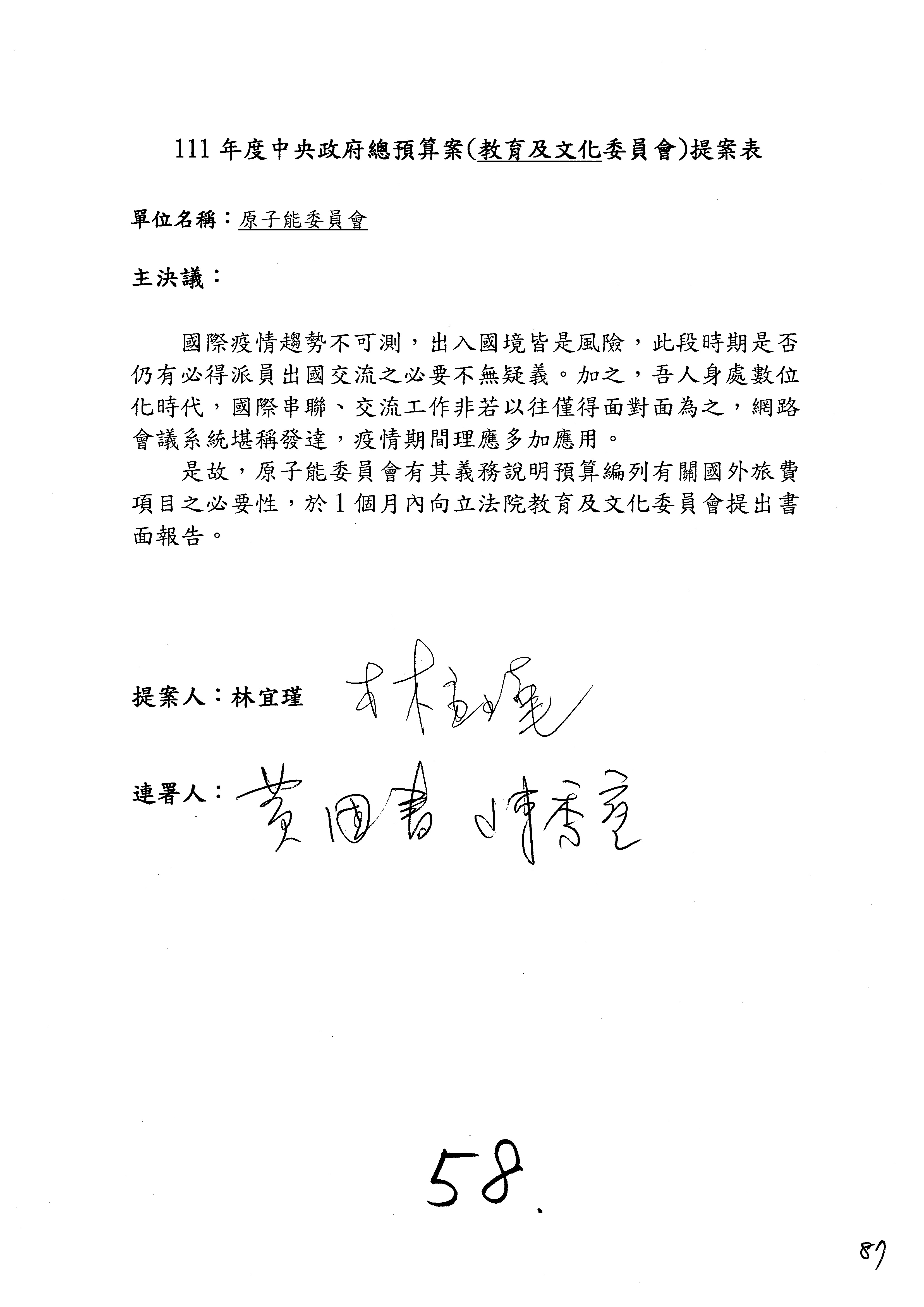 王處長重德:關於出國旅費編列在核研所的部分,核研所本身是研究機構,還是會跟國外有些交流,如果委員擔心明年疫情的影響,其實今年年中的時候主計總處有針對這一塊把整個出國旅費收回,所以還是懇求委員同意我們照列出國旅費的部分,謝謝。