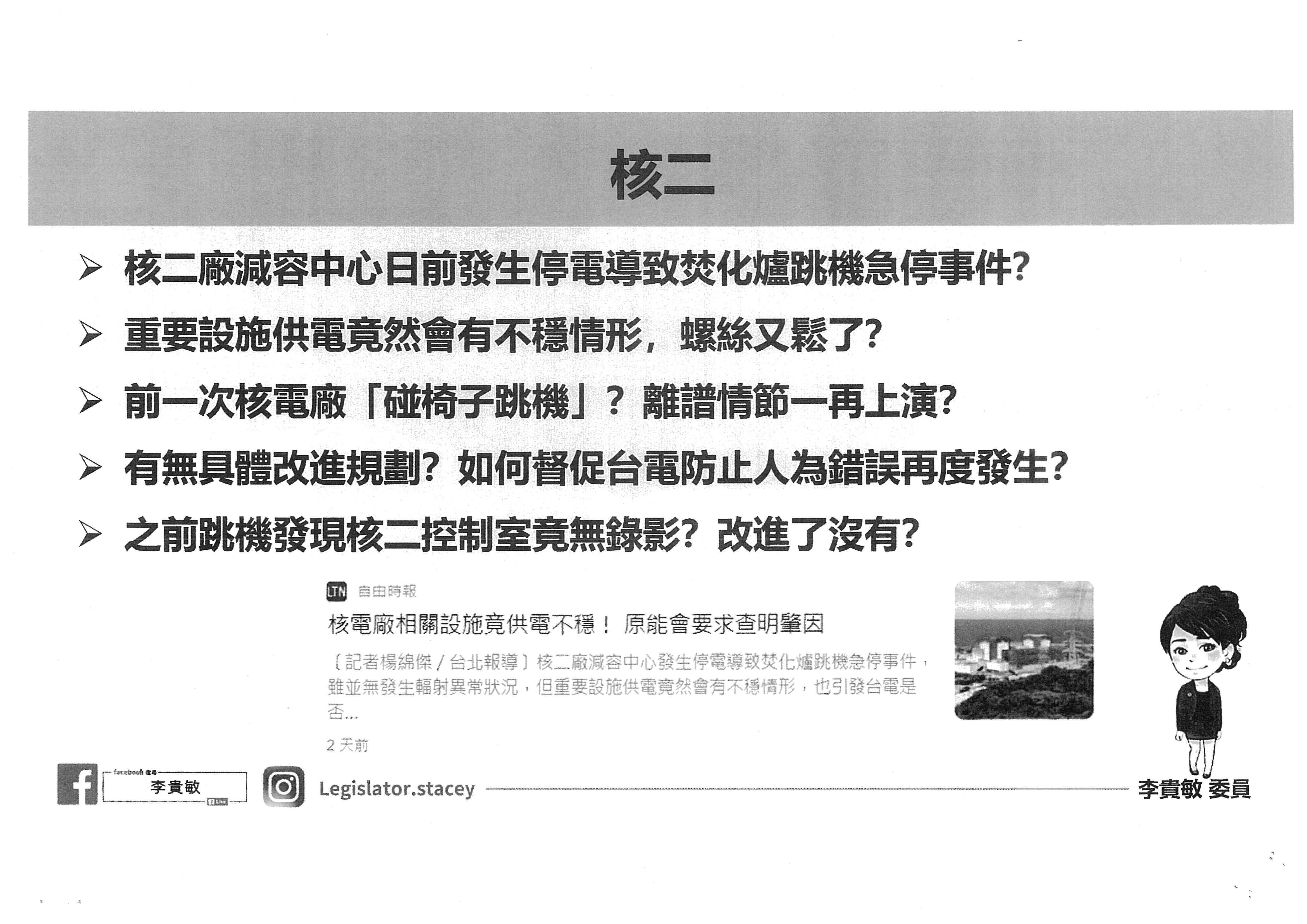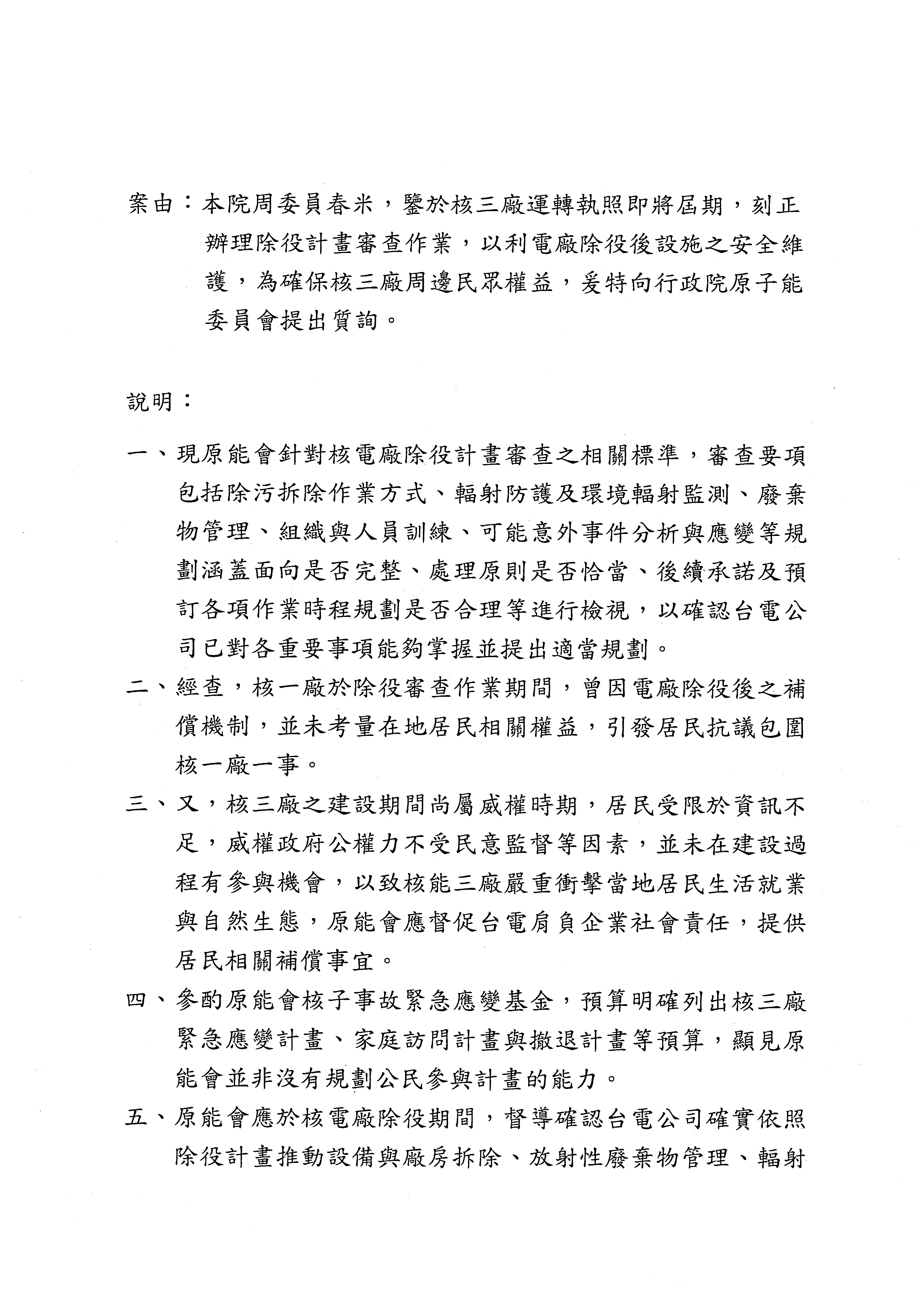 「鑒於今年七月核二廠就曾發生誤觸事件,造成主蒸汽隔離閥關閉、反應器急停。11月3日,核二廠減容中心又因外電喪失,焚化爐自動切換至緊急停機模式,而在停機過程中,造成袋式過濾器因燃燒不完全的火星影響,發生破孔情形。減容中心應有備援電力措施,避免此情形發生,然經查備用電源設備已於一個月前損壞,刻未修復。請原子能委員會於一個月內,針對此一監控安全機制之重大疏忽,繳交書面檢討報告至本委員會。