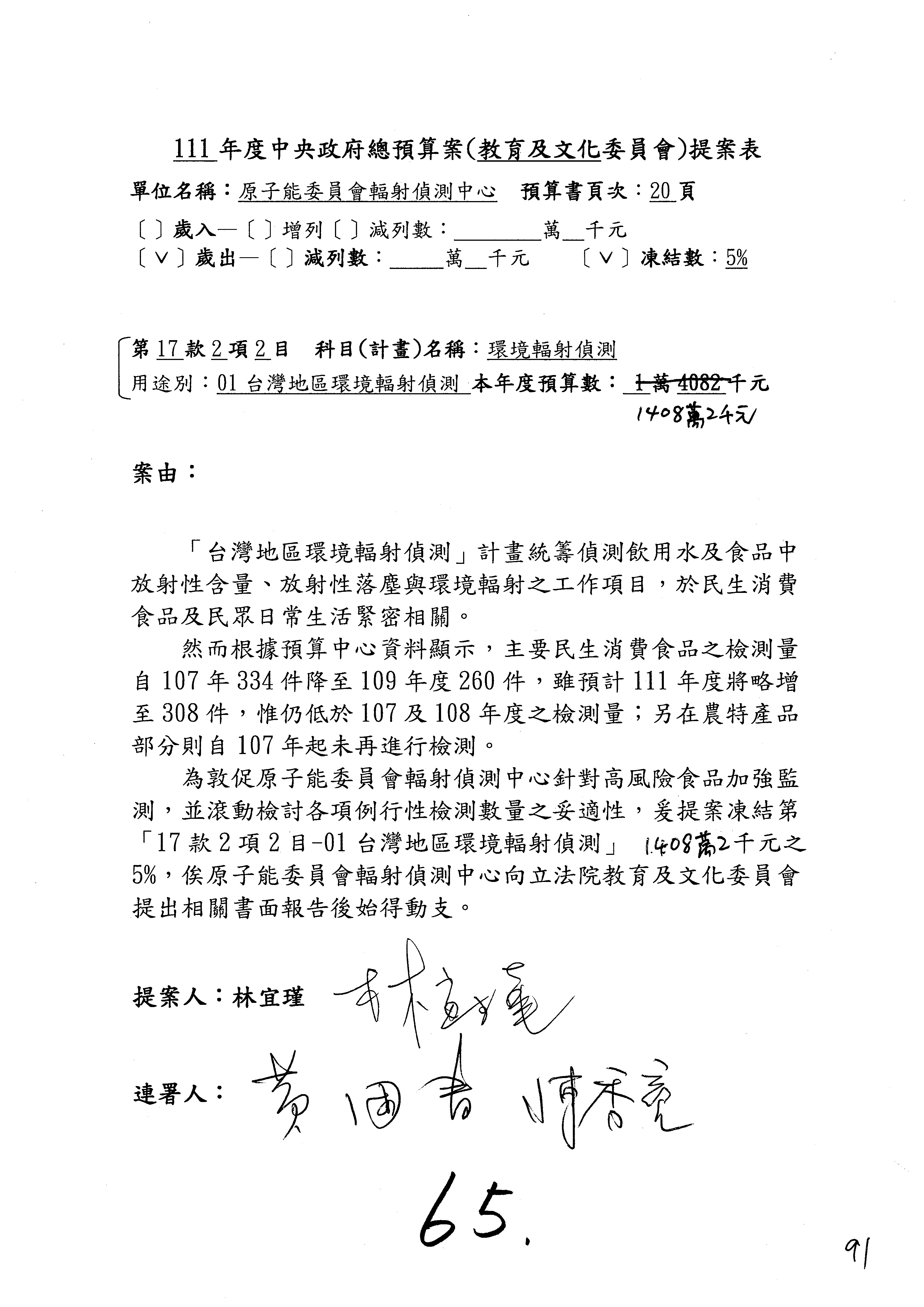 林委員奕華:第91案剛才已經說明過,112年度我們就會看到預算了,那部分是分為四年,我想相關預算就不凍結。