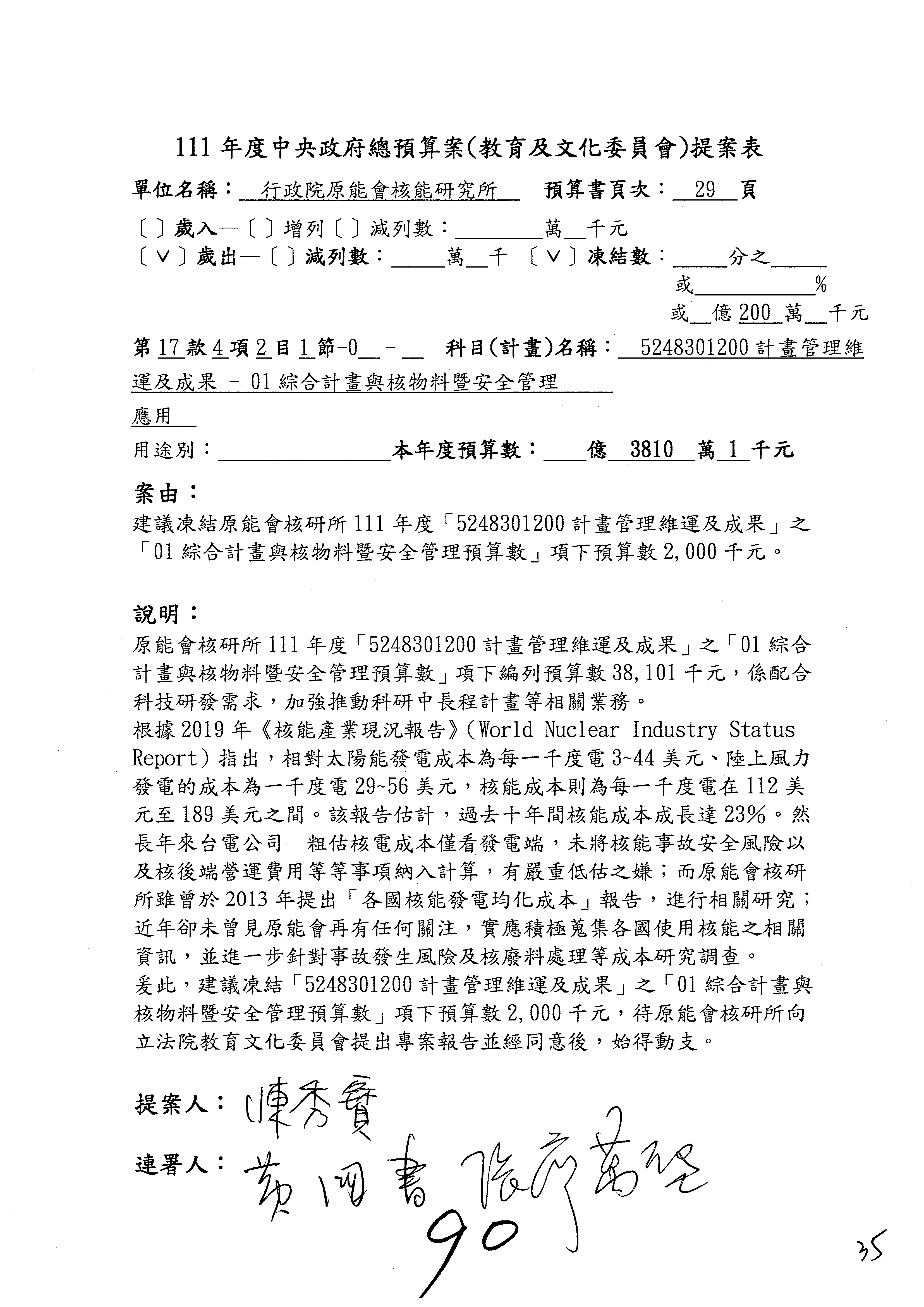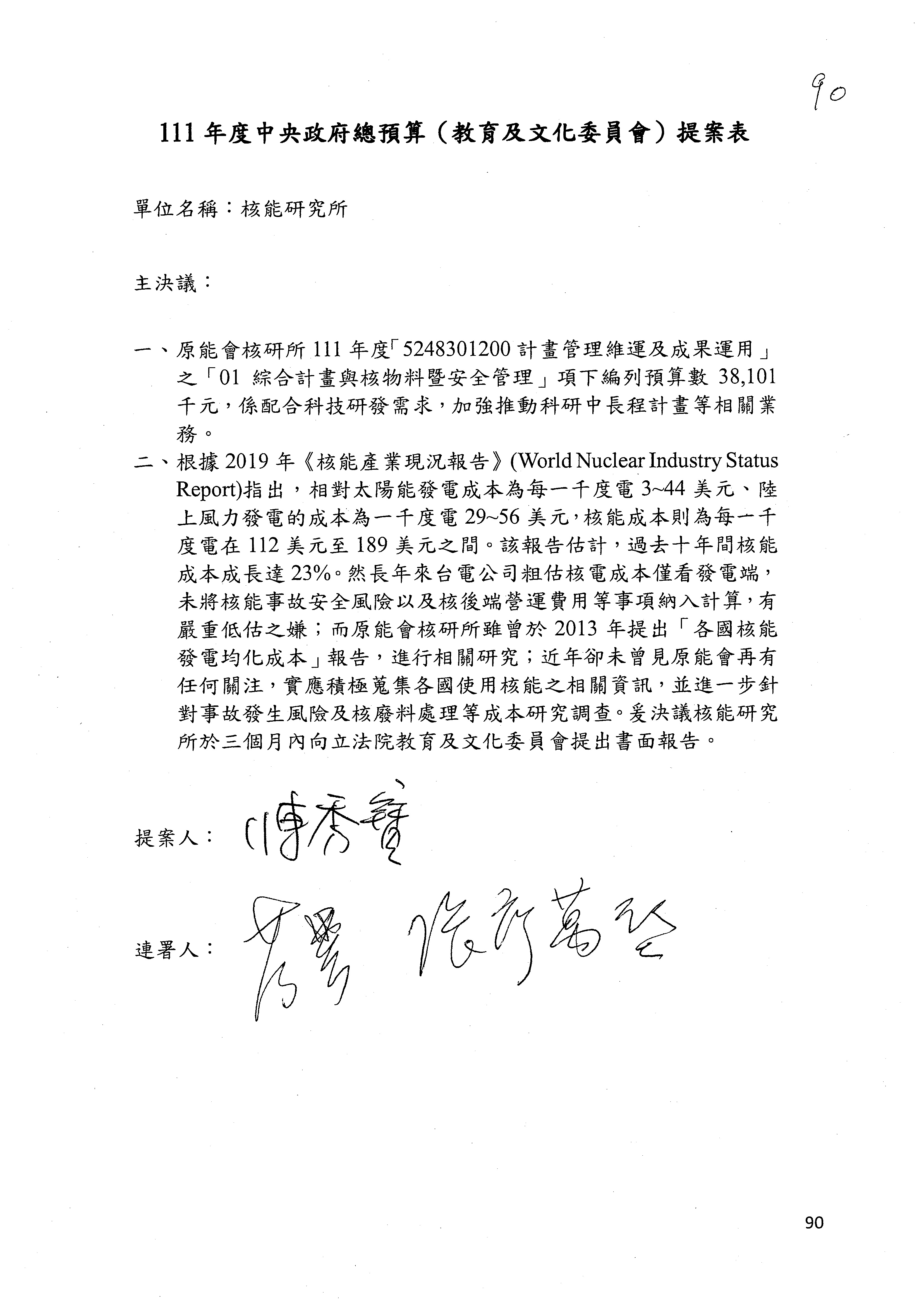陳委員秀寳:關於第2目「計畫管理維運及成果應用」,本席提的是第90案及第92案,第90案是關於核電成本的問題,在2019年的核能產業現況報告指出,相對於太陽能發電成本每一千度是3至44美元,陸上風力發電成本每一千度是29至56美元,核能發電成本每一千度為112至189美元之間,過去十年間,核能發電成本成長23%,但是長年以來,台電初估核電成本僅看發電端,並沒有將核能事故安全風險及核後端營運費用等等納入計算,這有非常嚴重的低估之嫌。