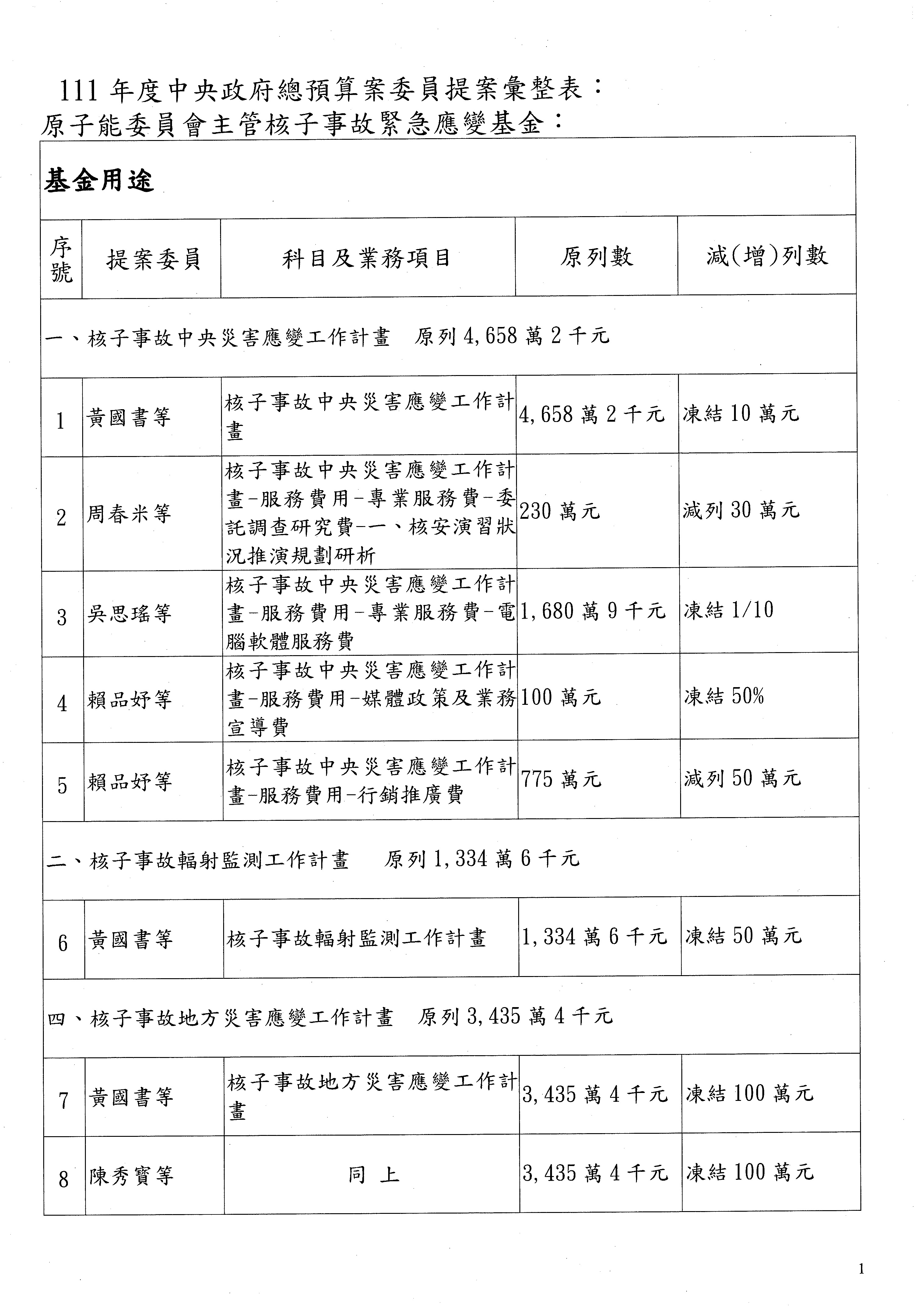 繼續處理基金部分。先處理「一、核子事故中央災害應變工作計畫」第1案到第5案。