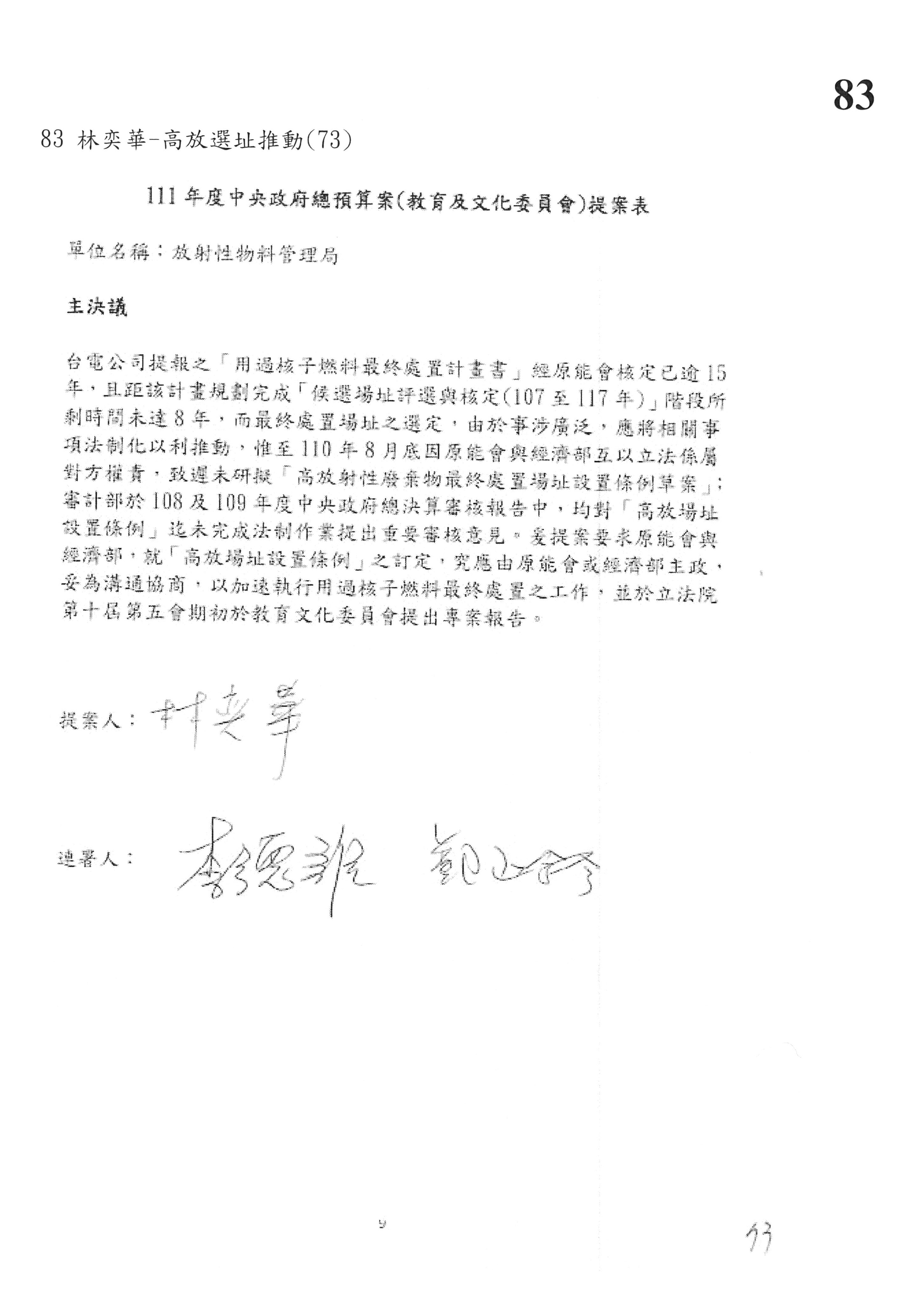 主席:林奕華委員第83案的主決議文字出來了,可是林奕華不在場,是不是就修正通過?好。
