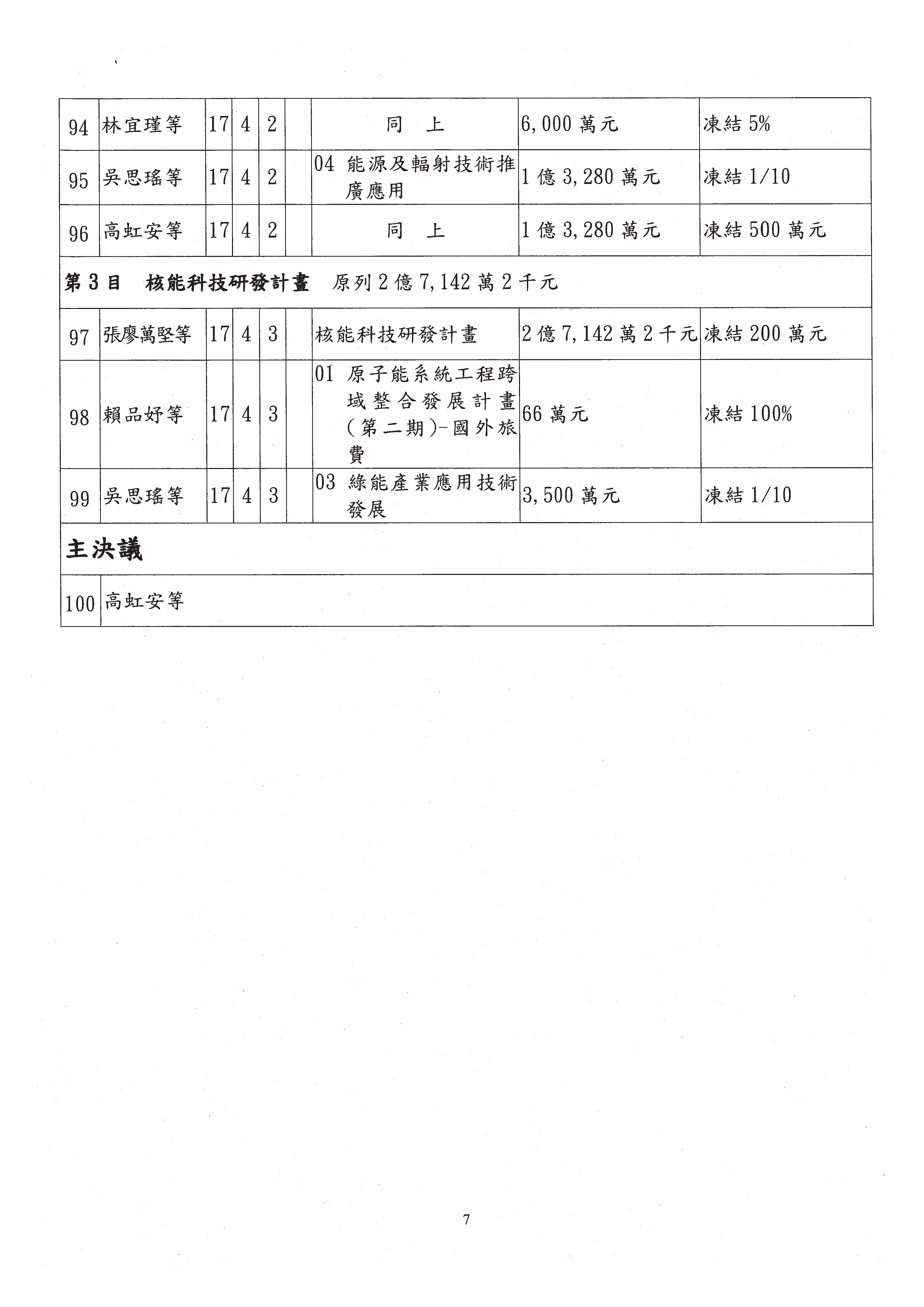 處理第3目「核能科技研發計畫」第97案到第99案。