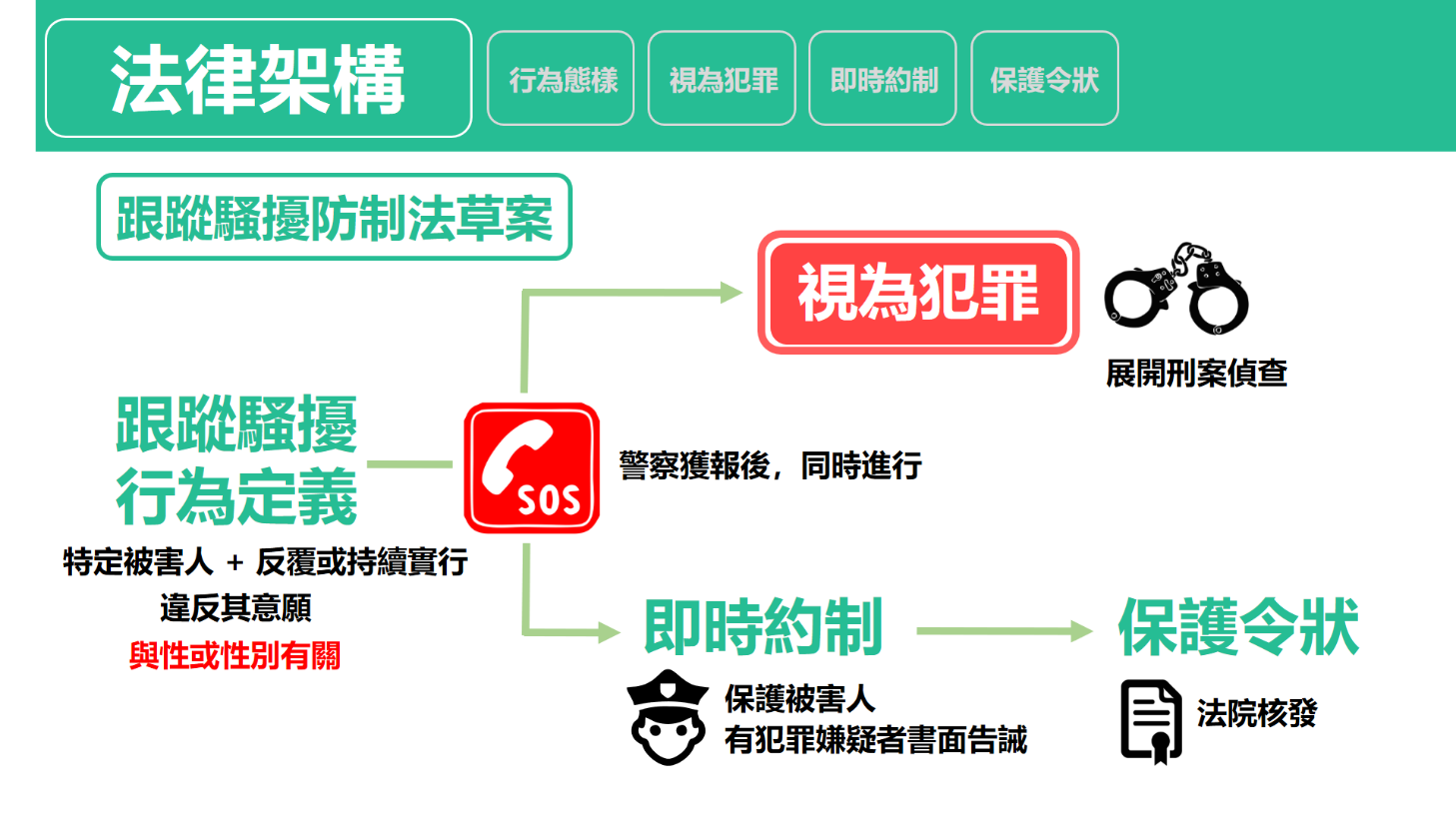 3.「跟蹤騷擾防制法草案」第四條明定警察機關受理跟蹤騷擾行為案件之調查、核發書面告誡等事宜,為減少社會疑慮、警方執法之模糊,以及完善保障被害人之權益,其執行應依循下列規範: