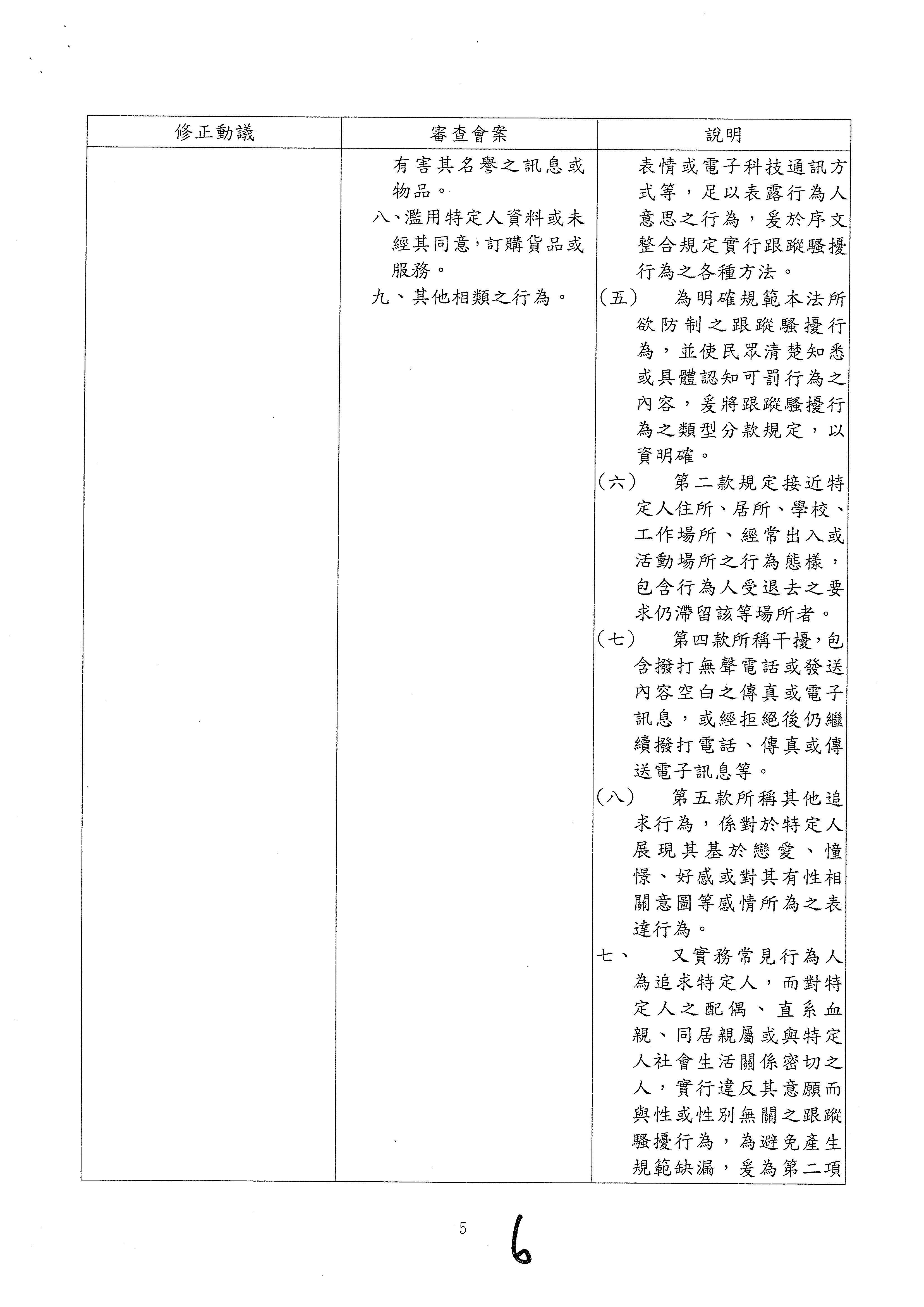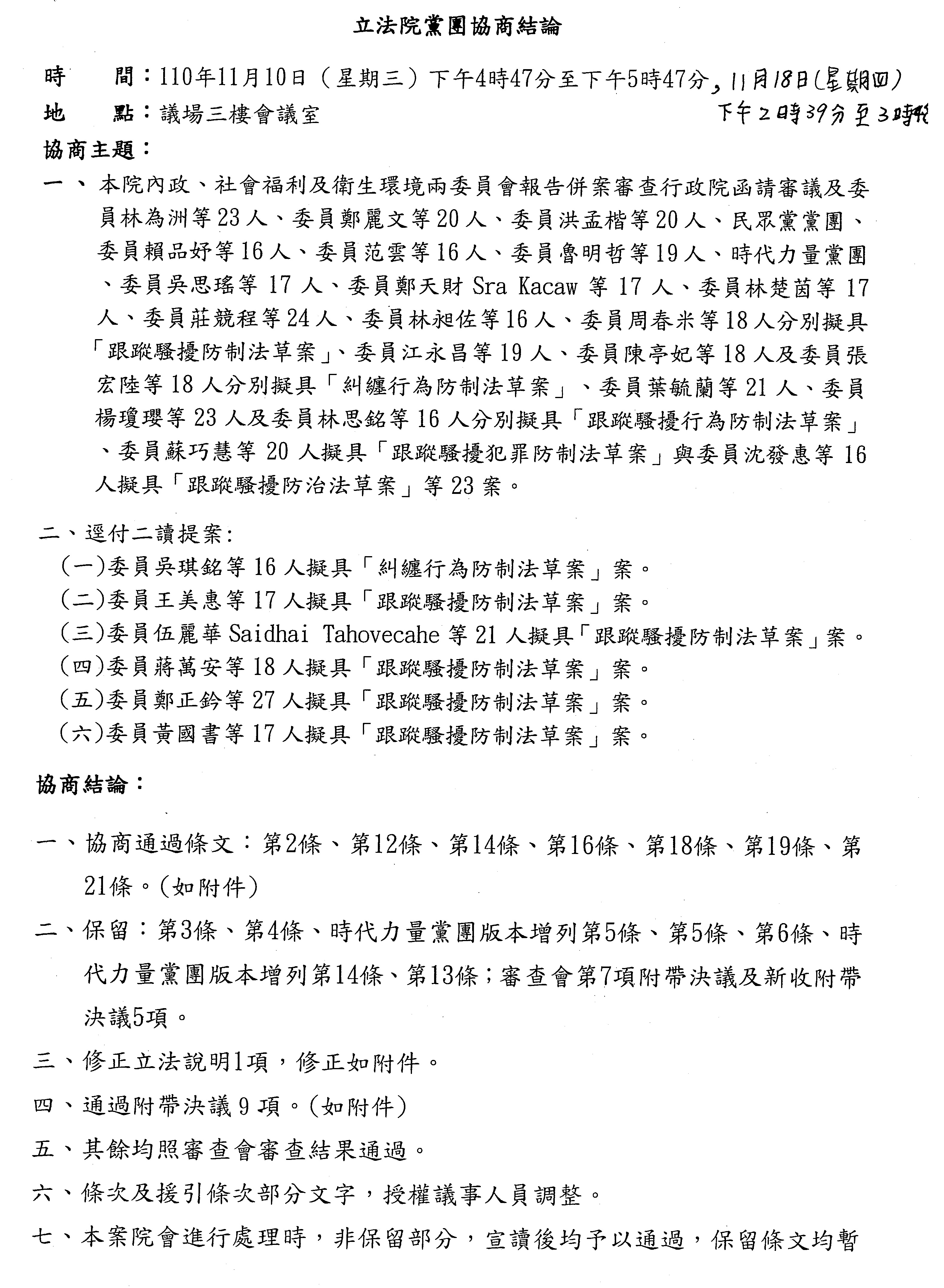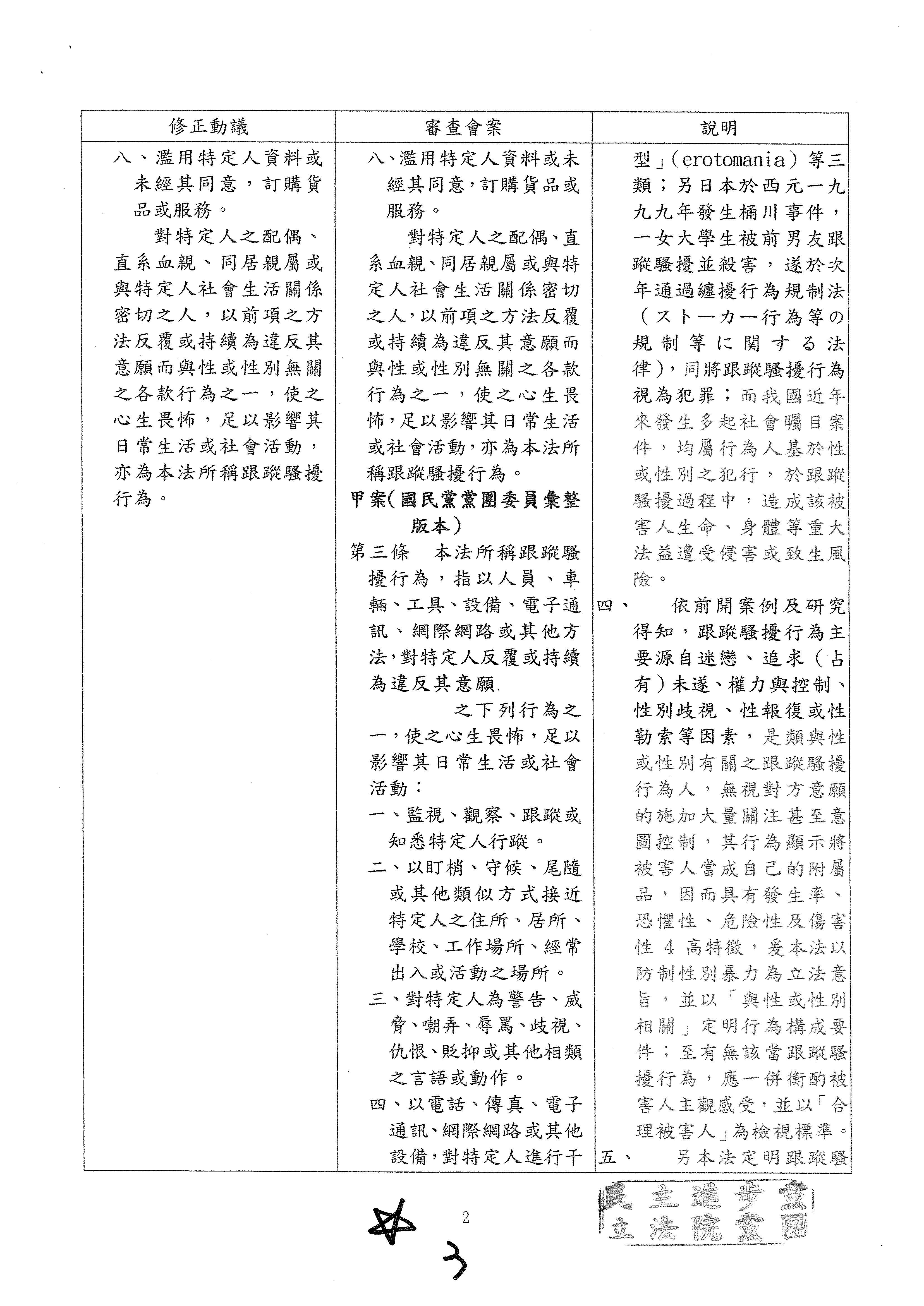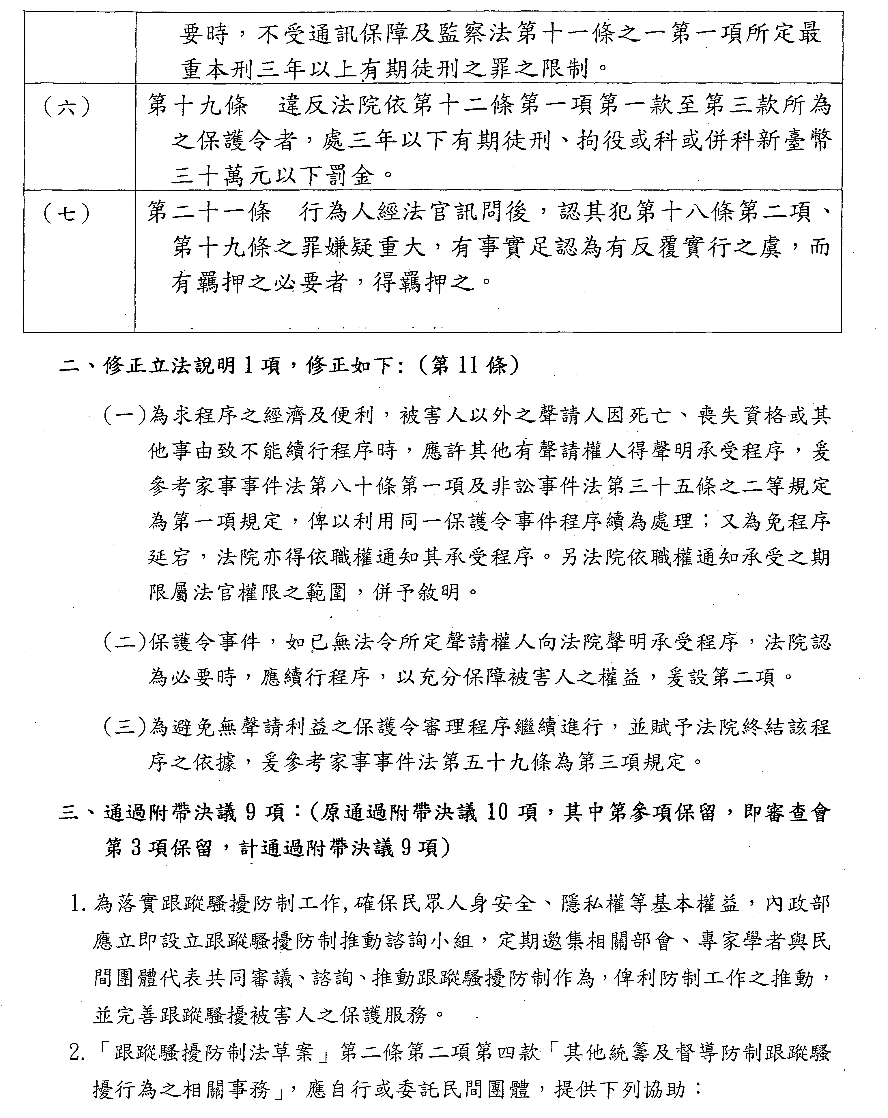 另,委員吳琪銘等擬具「糾纏行為防制法草案」,委員王美惠等、委員伍麗華Saidhai Tahovecahe等、委員蔣萬安等分別擬具「跟蹤騷擾防制法草案」,經第3會期第11次會議決定:逕付二讀;委員鄭正鈐等、委員黃國書等分別擬具「跟蹤騷擾防制法草案」,分經第4會期第4次、第6次會議決定:逕付二讀,與相關提案併案協商。