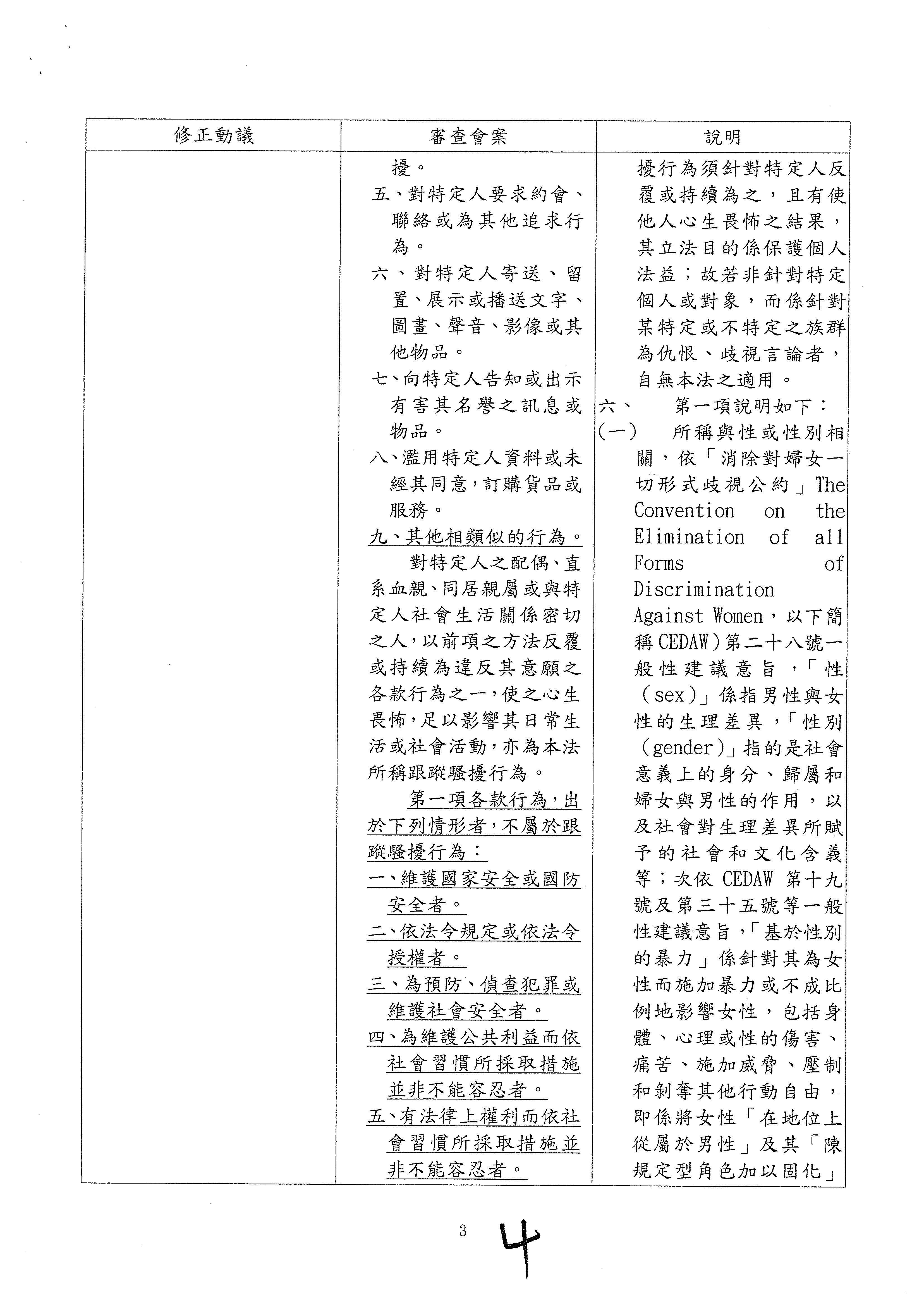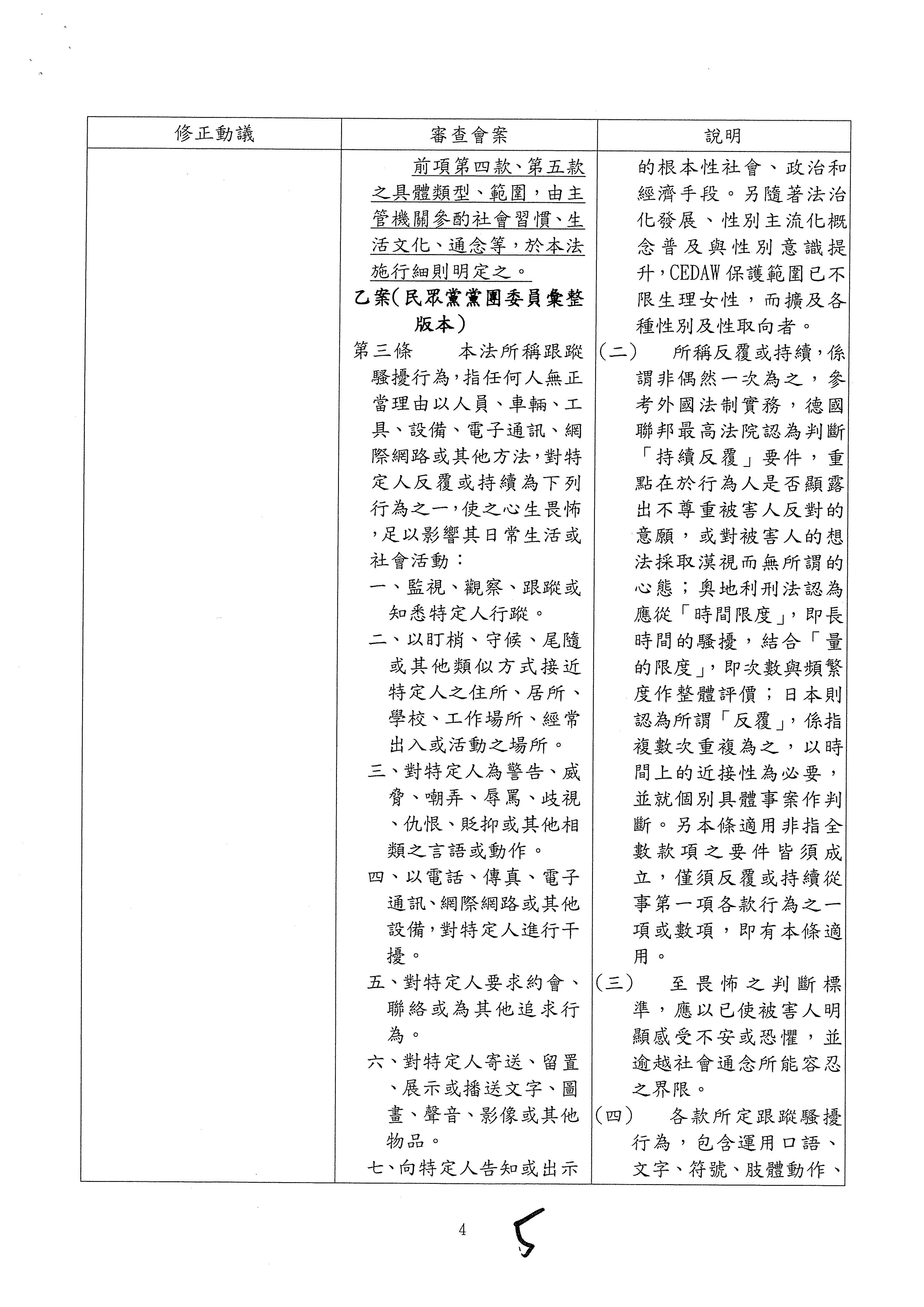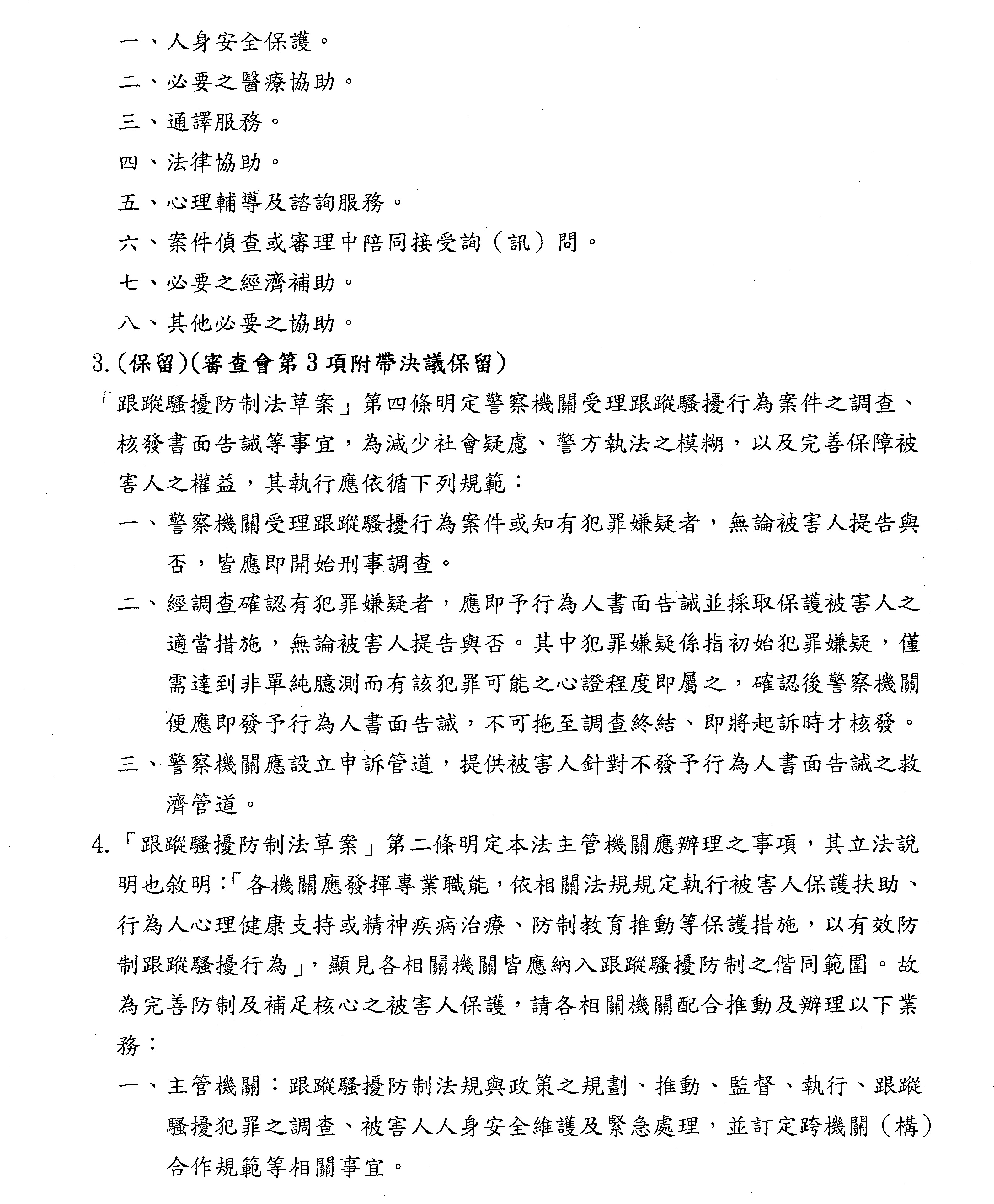 另,委員吳琪銘等擬具「糾纏行為防制法草案」,委員王美惠等、委員伍麗華Saidhai Tahovecahe等、委員蔣萬安等分別擬具「跟蹤騷擾防制法草案」,經第3會期第11次會議決定:逕付二讀;委員鄭正鈐等、委員黃國書等分別擬具「跟蹤騷擾防制法草案」,分經第4會期第4次、第6次會議決定:逕付二讀,與相關提案併案協商。