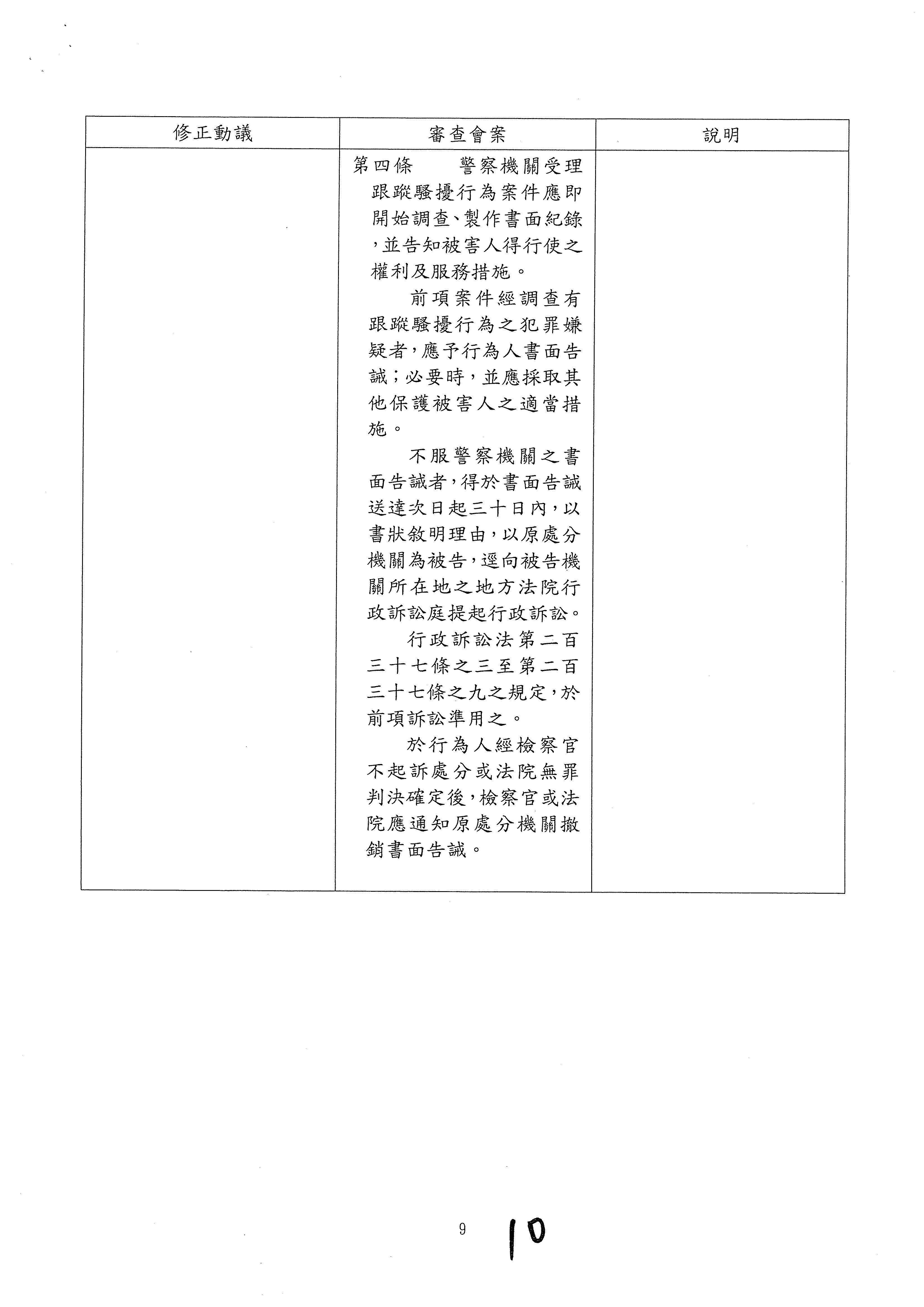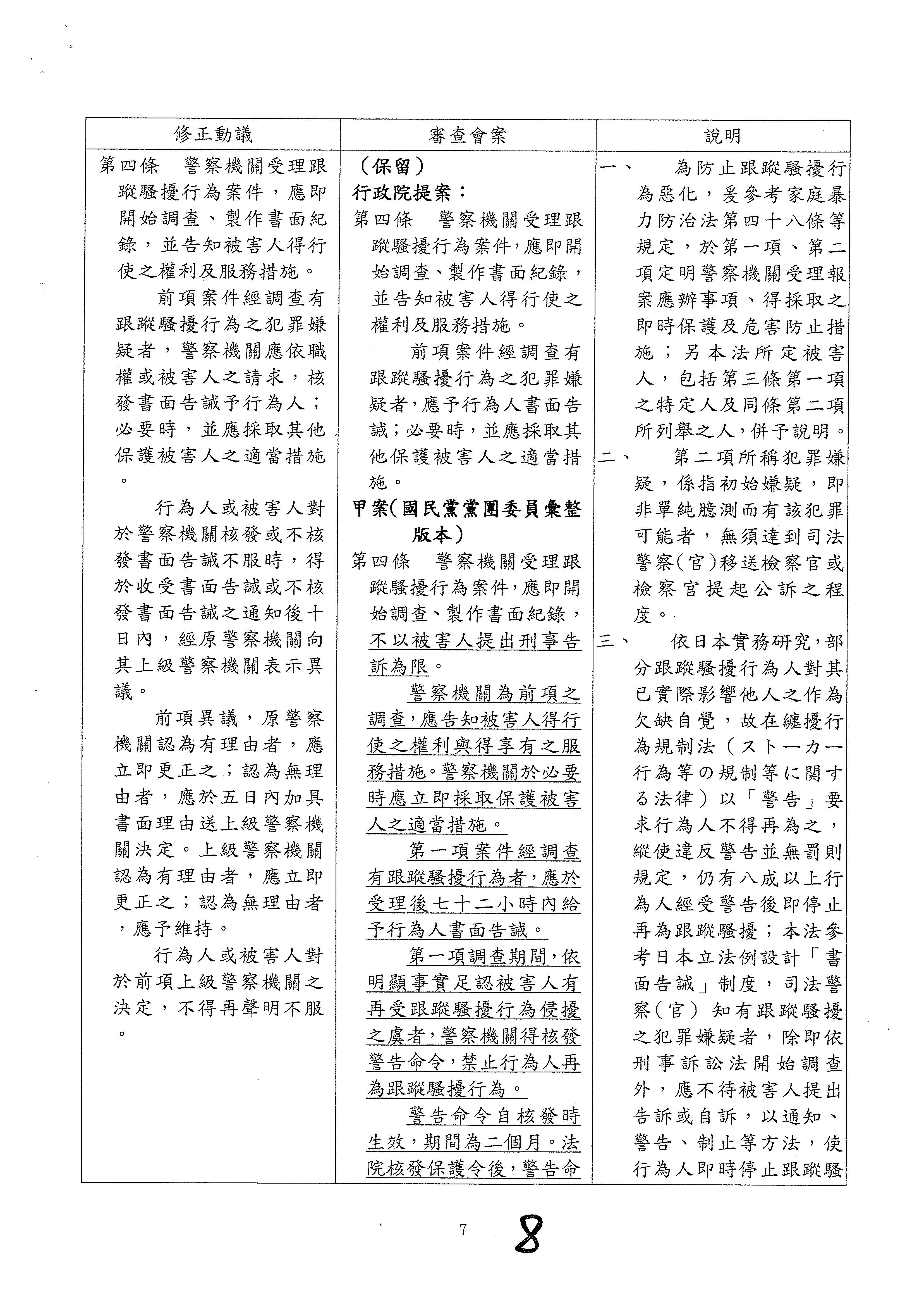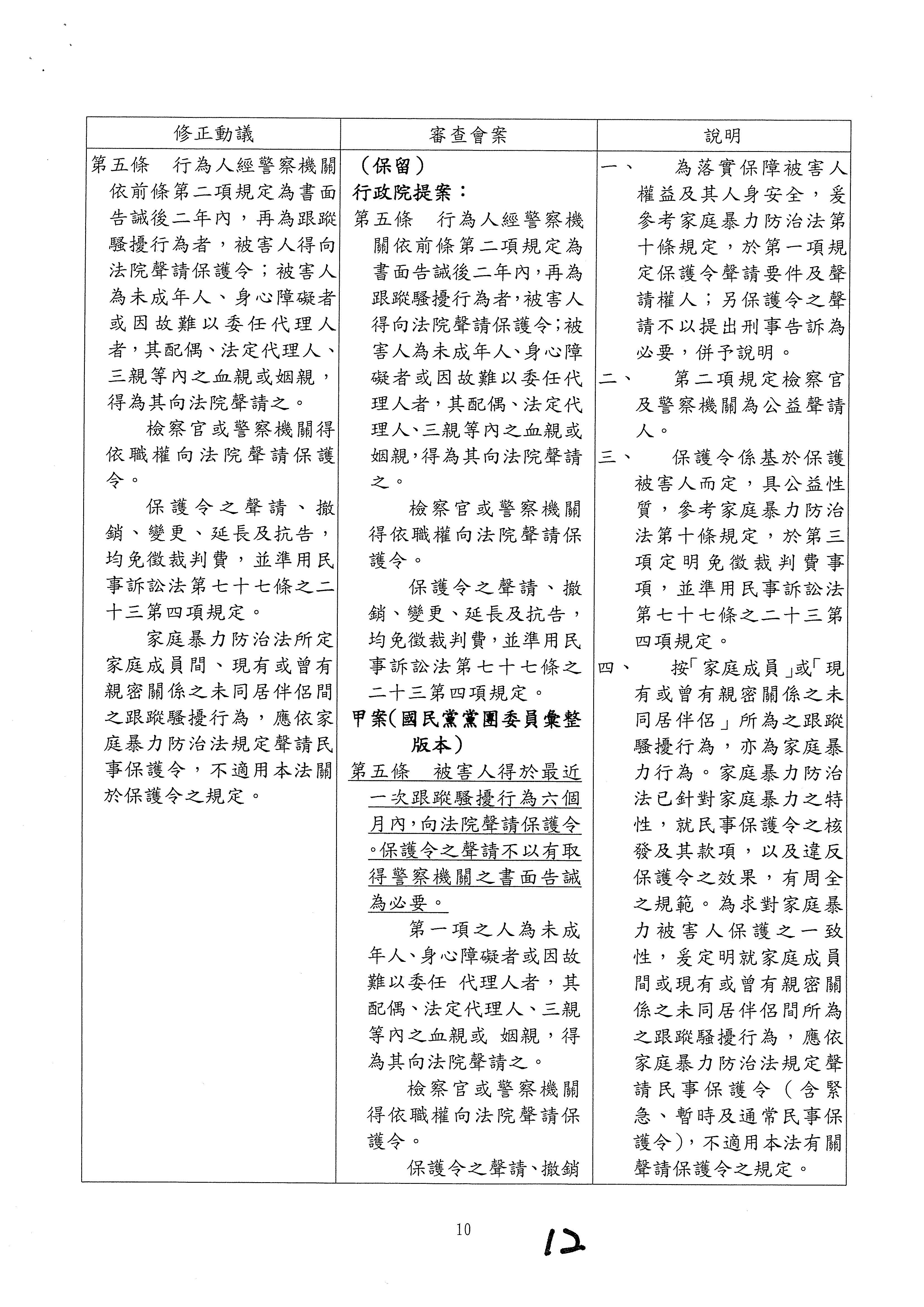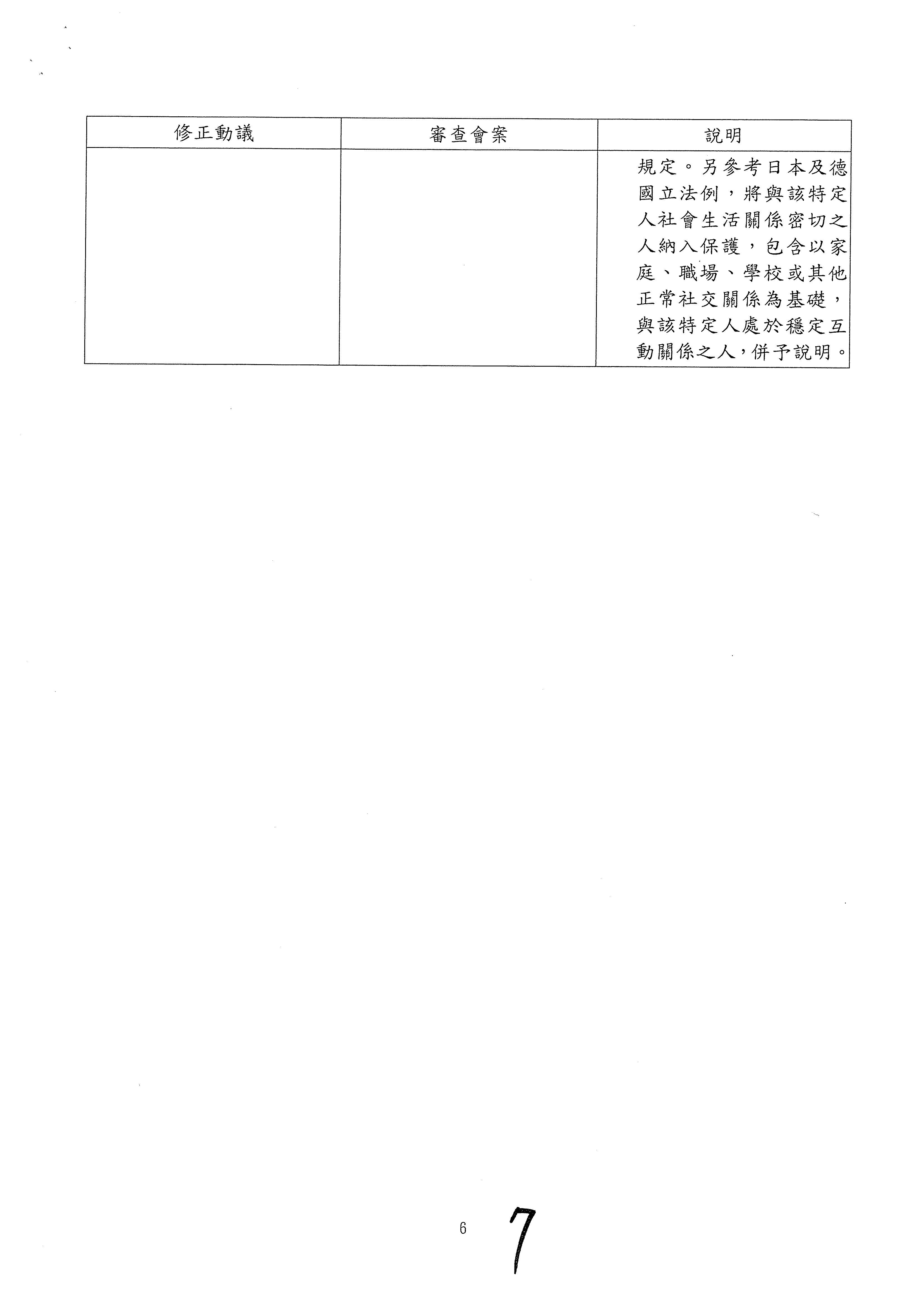 另,委員吳琪銘等擬具「糾纏行為防制法草案」,委員王美惠等、委員伍麗華Saidhai Tahovecahe等、委員蔣萬安等分別擬具「跟蹤騷擾防制法草案」,經第3會期第11次會議決定:逕付二讀;委員鄭正鈐等、委員黃國書等分別擬具「跟蹤騷擾防制法草案」,分經第4會期第4次、第6次會議決定:逕付二讀,與相關提案併案協商。