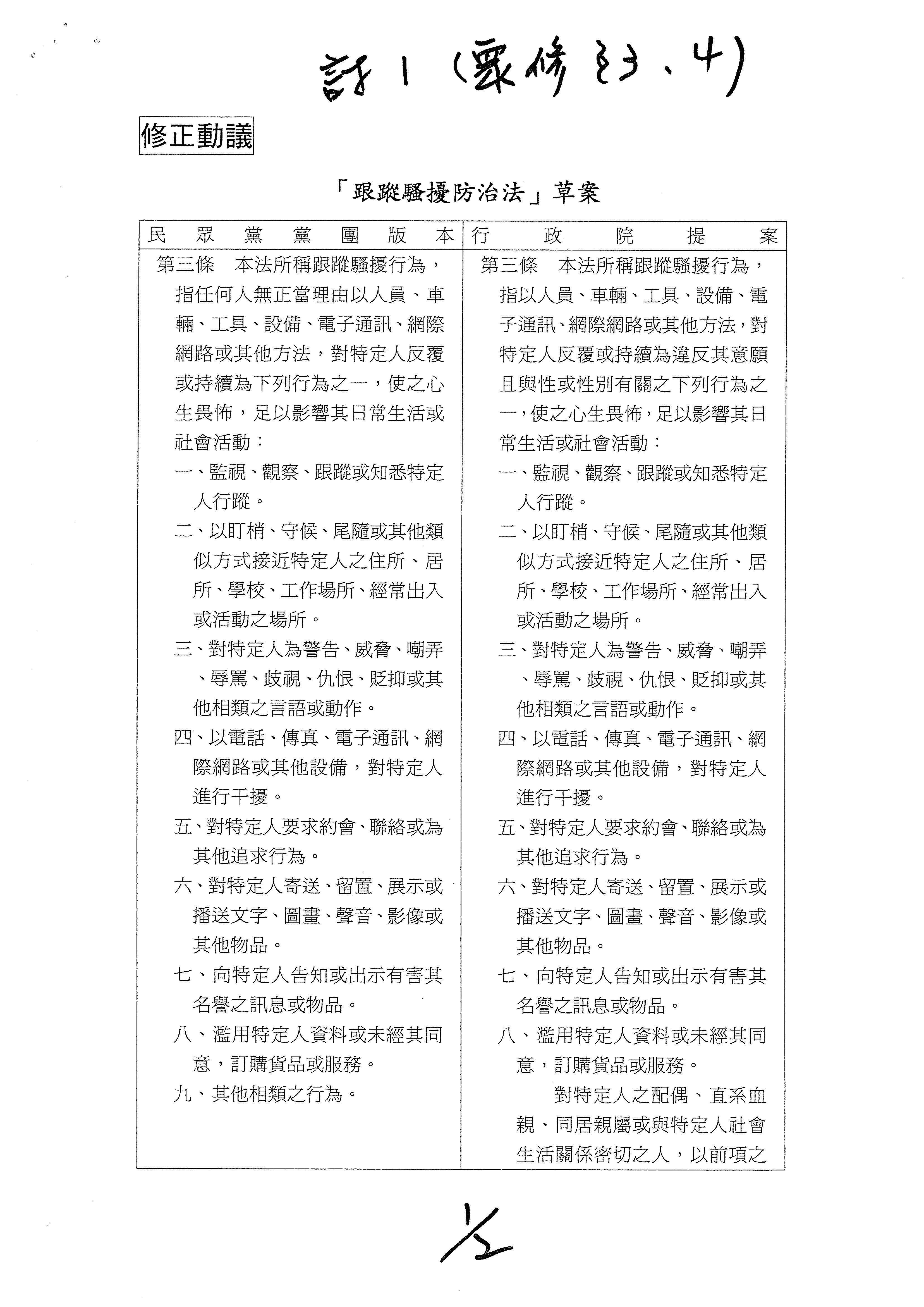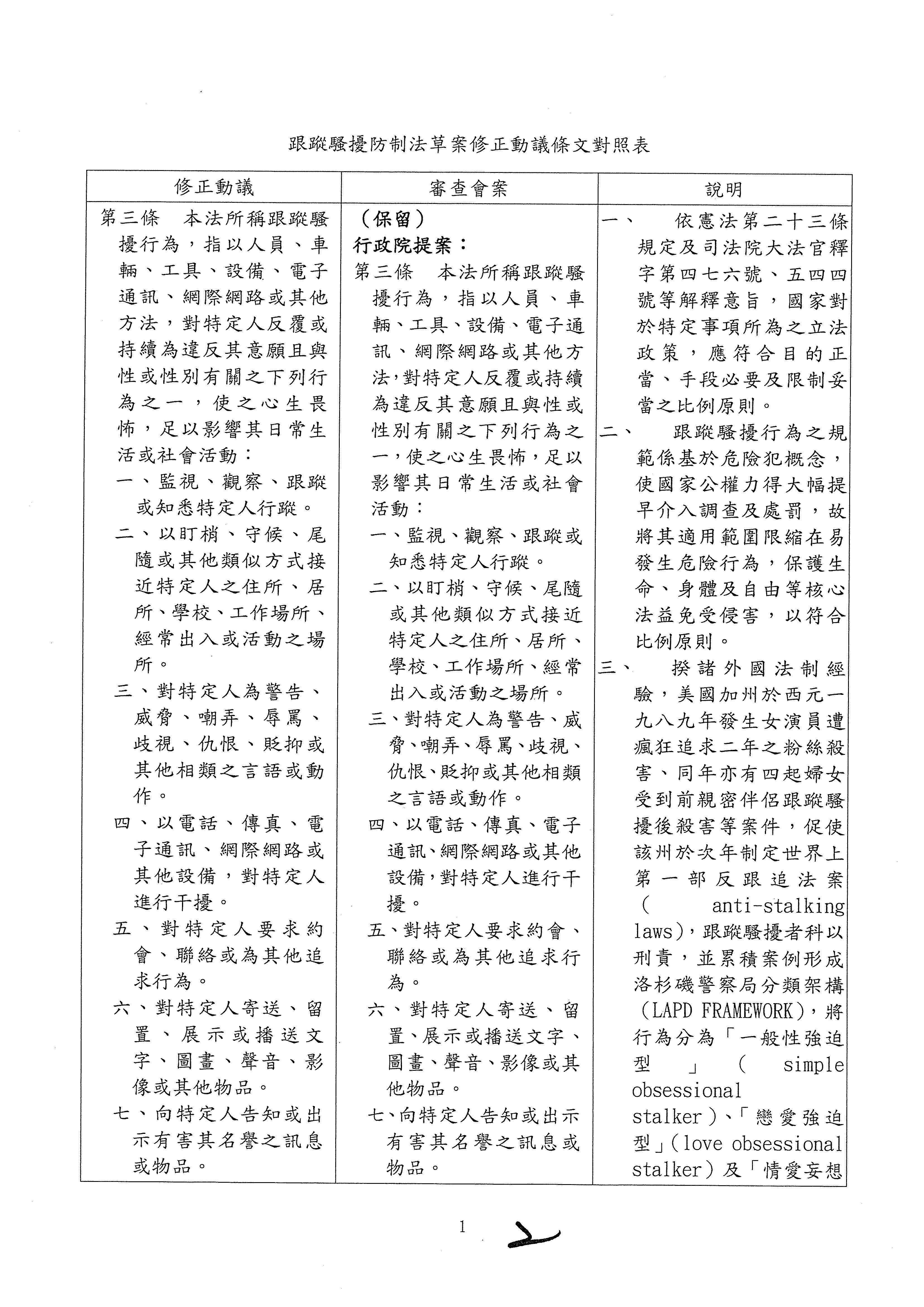 本院委員王美惠、湯蕙禎、莊瑞雄、趙正宇等17人,鑑於近期發生幾起社會矚目、令人遺憾的刑事案件,多與跟蹤騷擾行為有關,各界也期待應加速立法防制以維護性別平等,防制性別暴力。我國近年來已陸續制定並公布施行多部法律,如性侵害犯罪防治法、家庭暴力防治法、性別工作平等法、性別平等教育法及性騷擾防治法等,以彰顯並落實性別主流化、被害人保護等憲法人權價值及國家重大政策。然對於跟蹤騷擾行為,尚無防制此一犯罪的法律。跟蹤騷擾行為是一種嚴重的性別暴力,為保護被害人人身安全,有效防制性別暴力,將跟蹤騷擾行為入罪化、犯罪態樣明確化,同時也賦予檢察官及警察相關權力,爰擬具「跟蹤騷擾防制法草案」。是否有當?敬請公決。