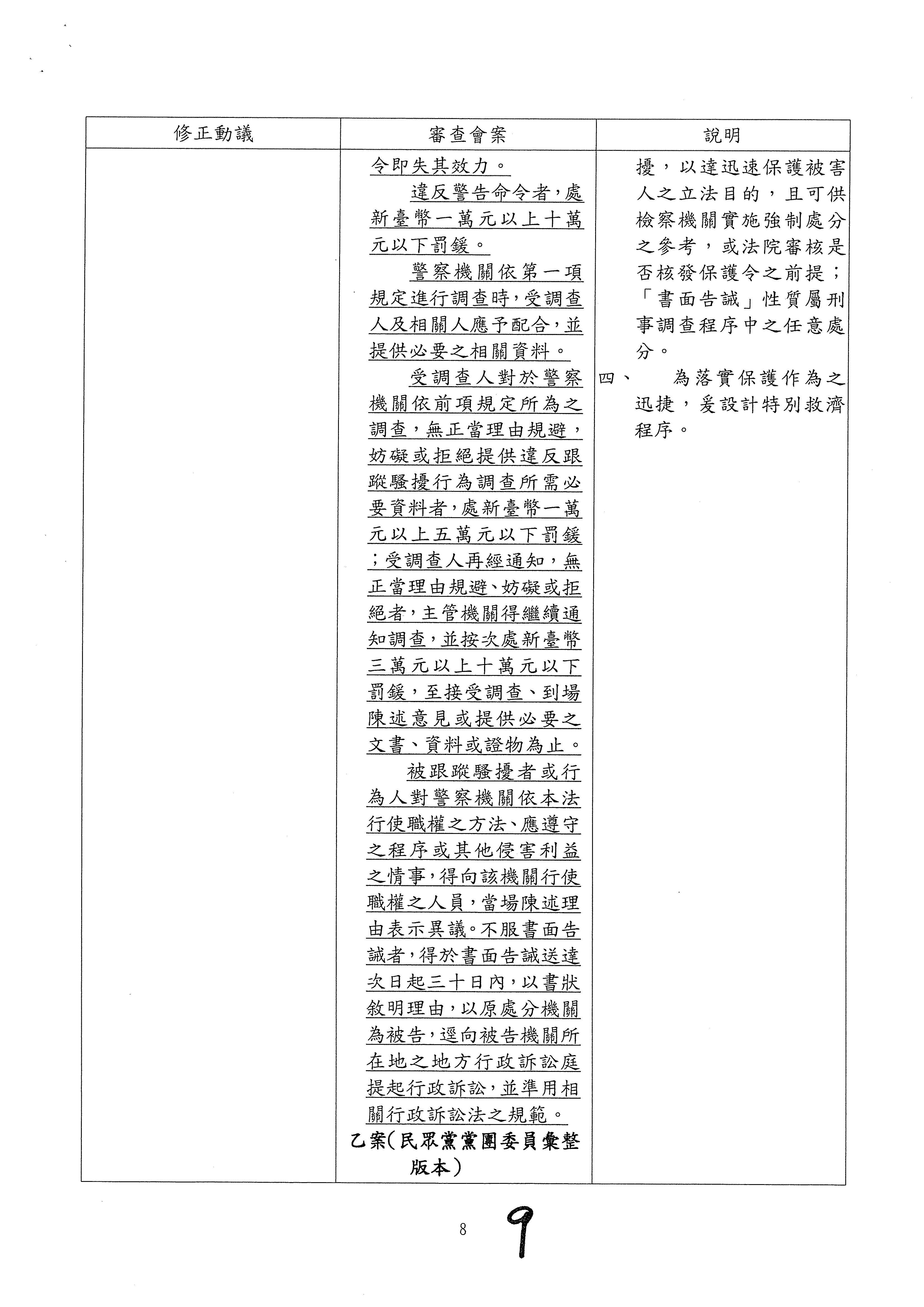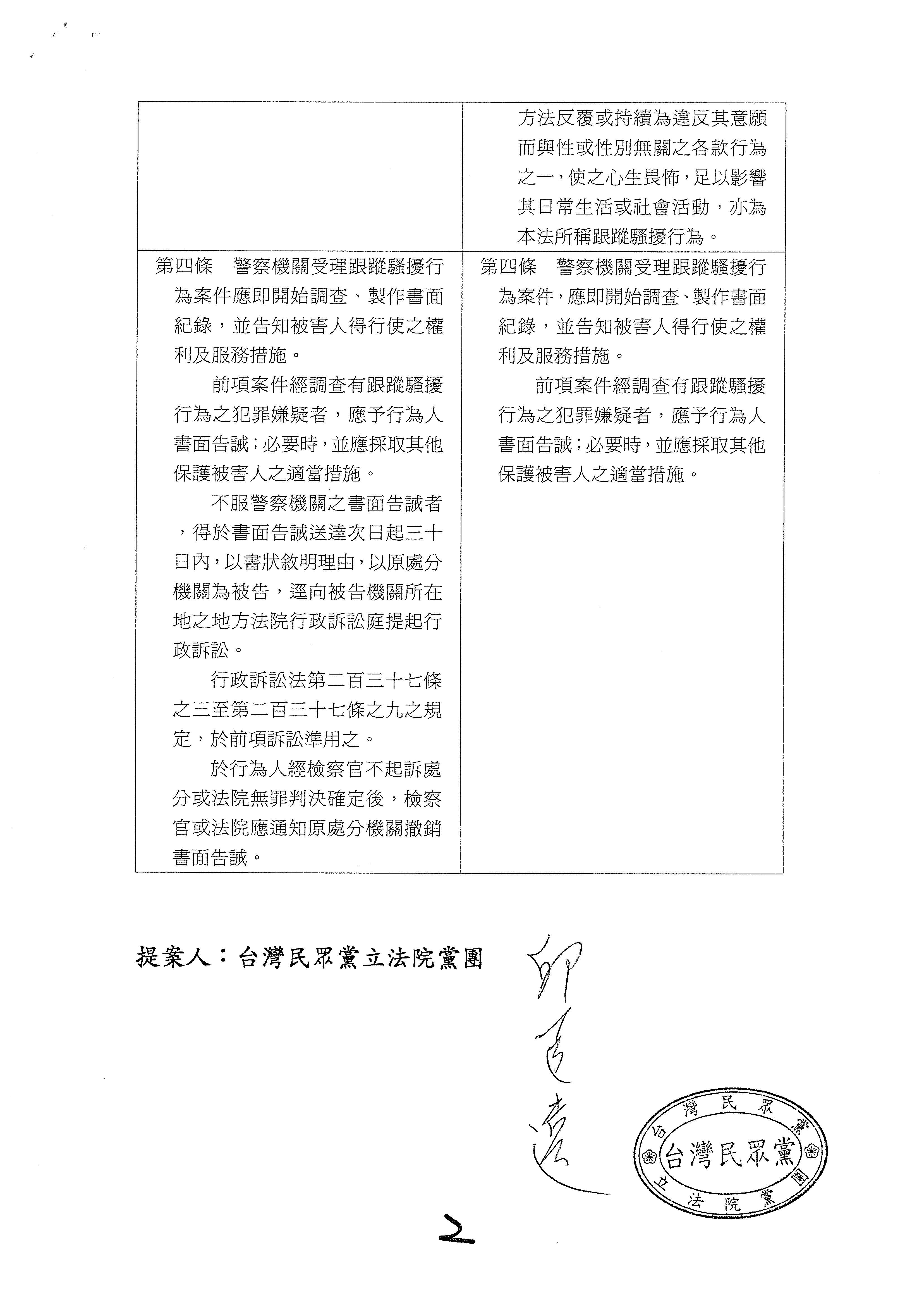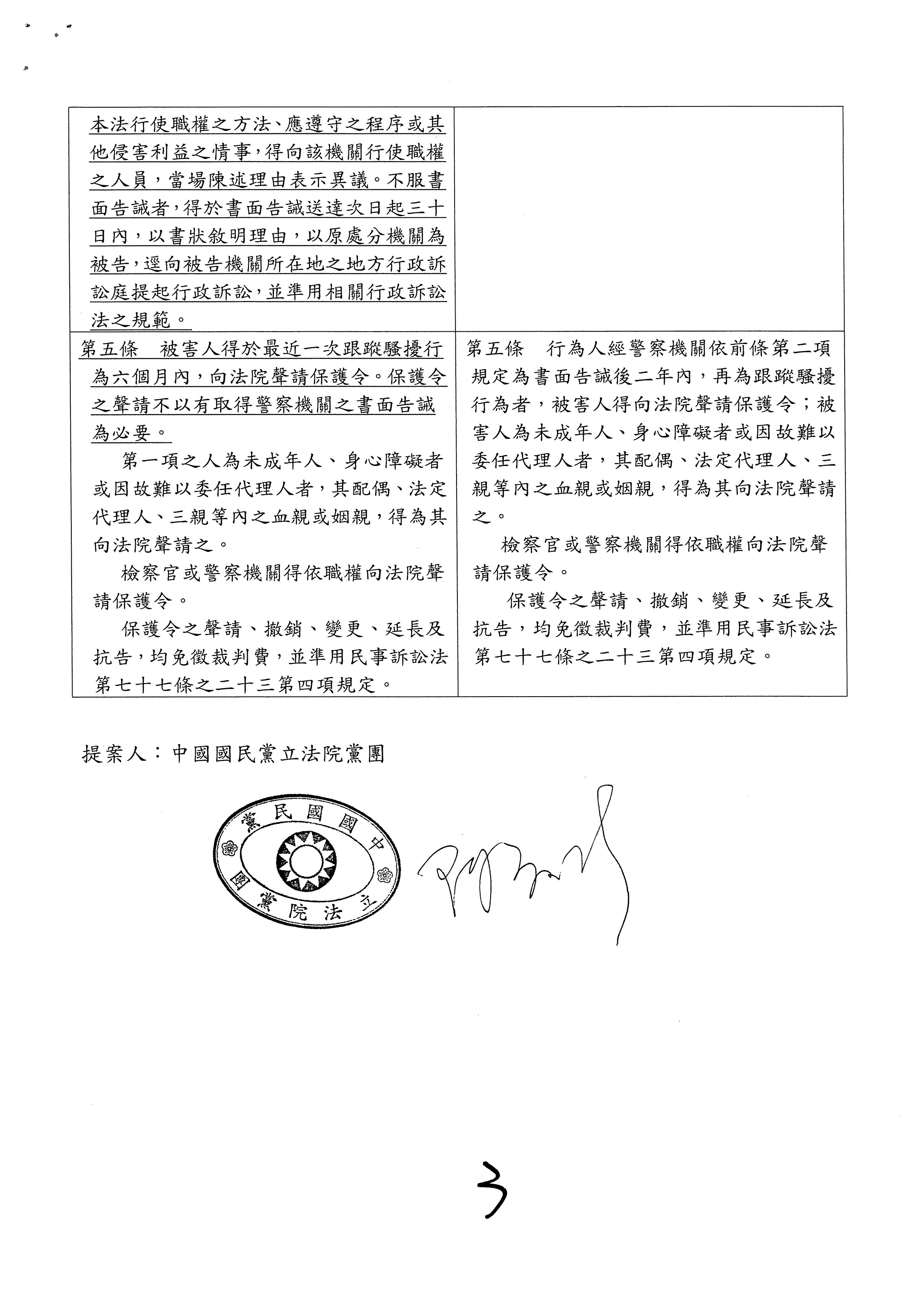 國民黨黨團的版本,希望警察處理跟騷,當然也會顧及配套,提供適當的執法工具。本黨的第四條不但設計了書面告誡及警告命令的黃牌、紅牌,在強制力上層次分明、方便遵循,甚至顧慮到警察機關的調查權限,納入了行政調查和違反調查的罰則。