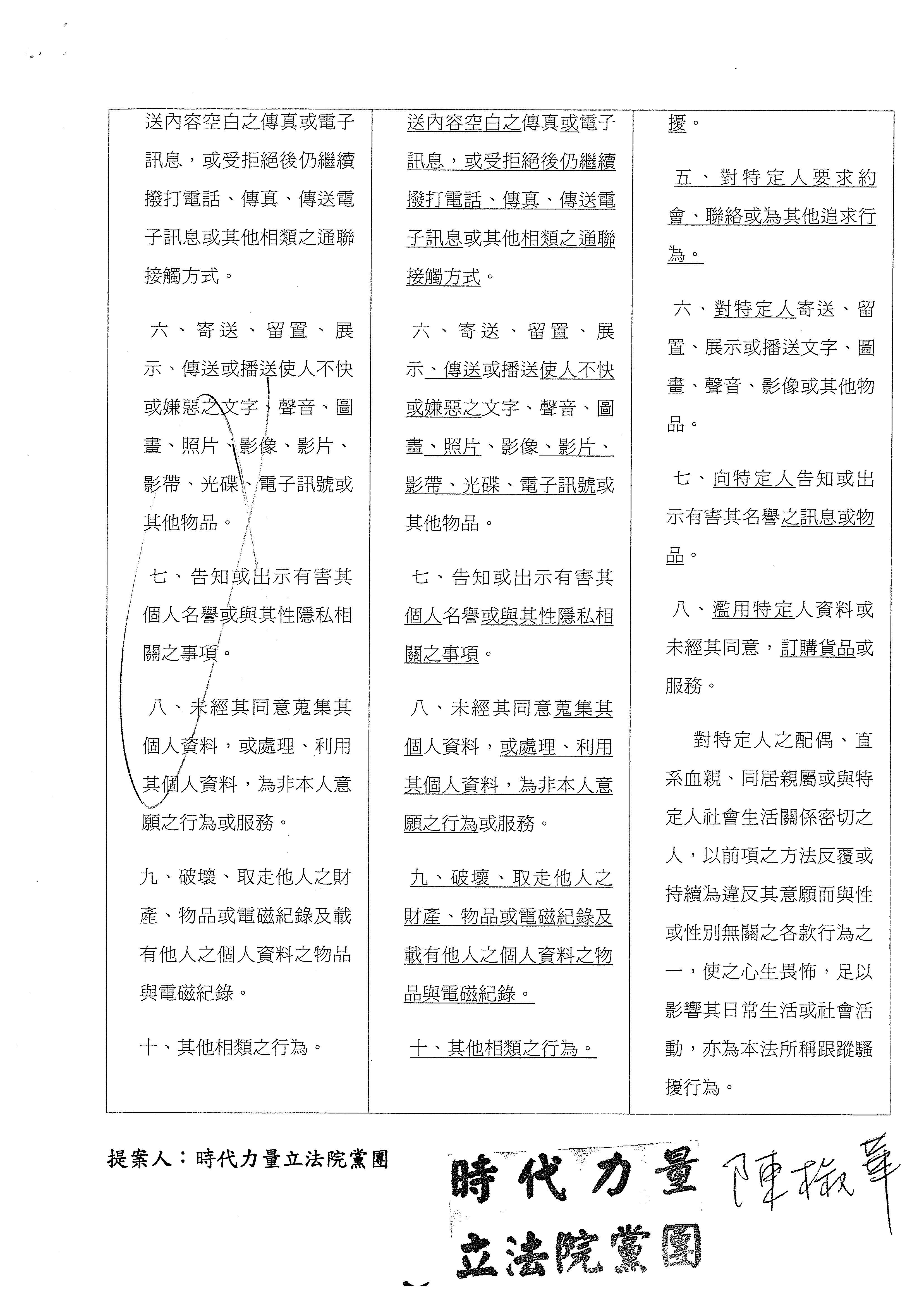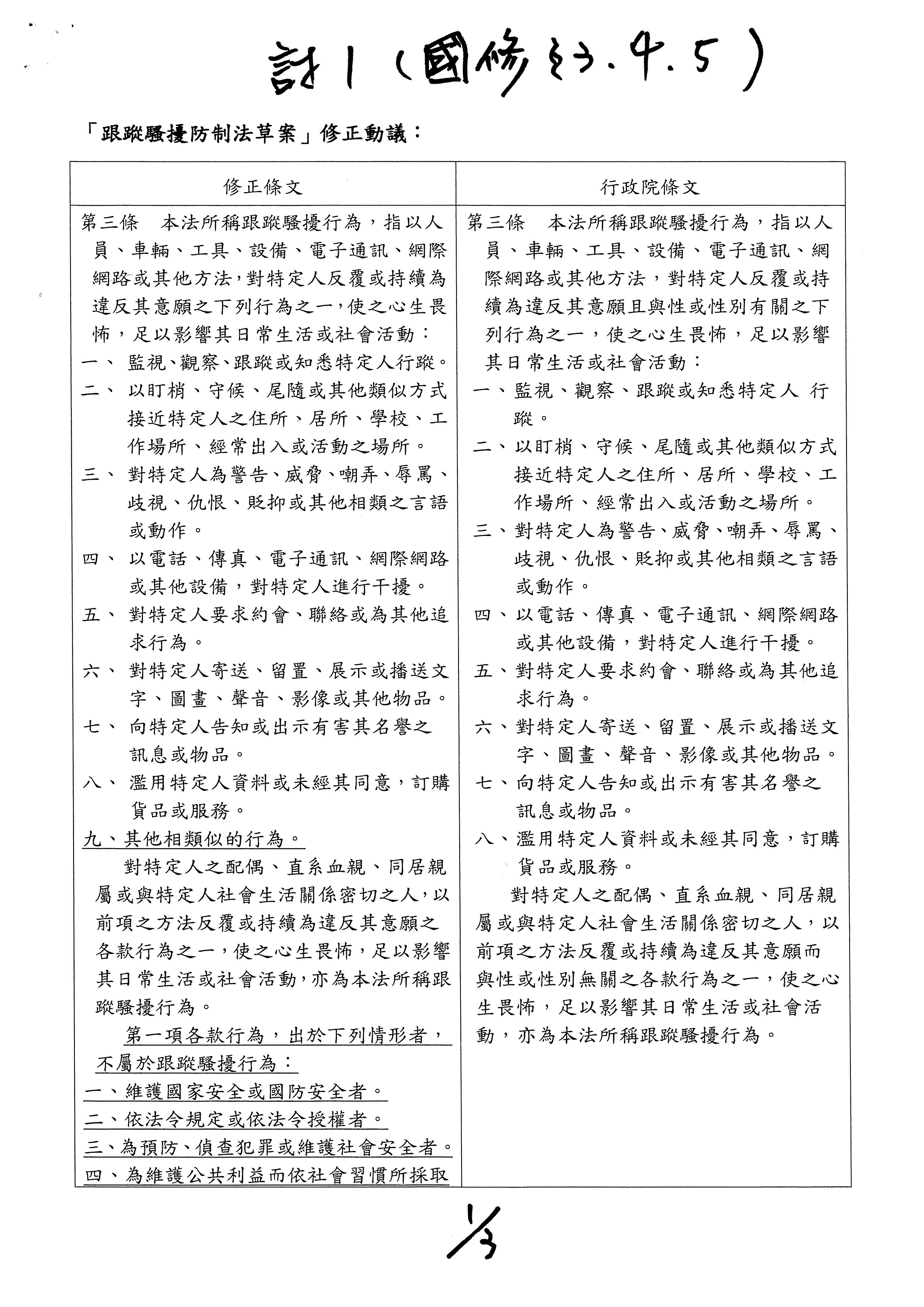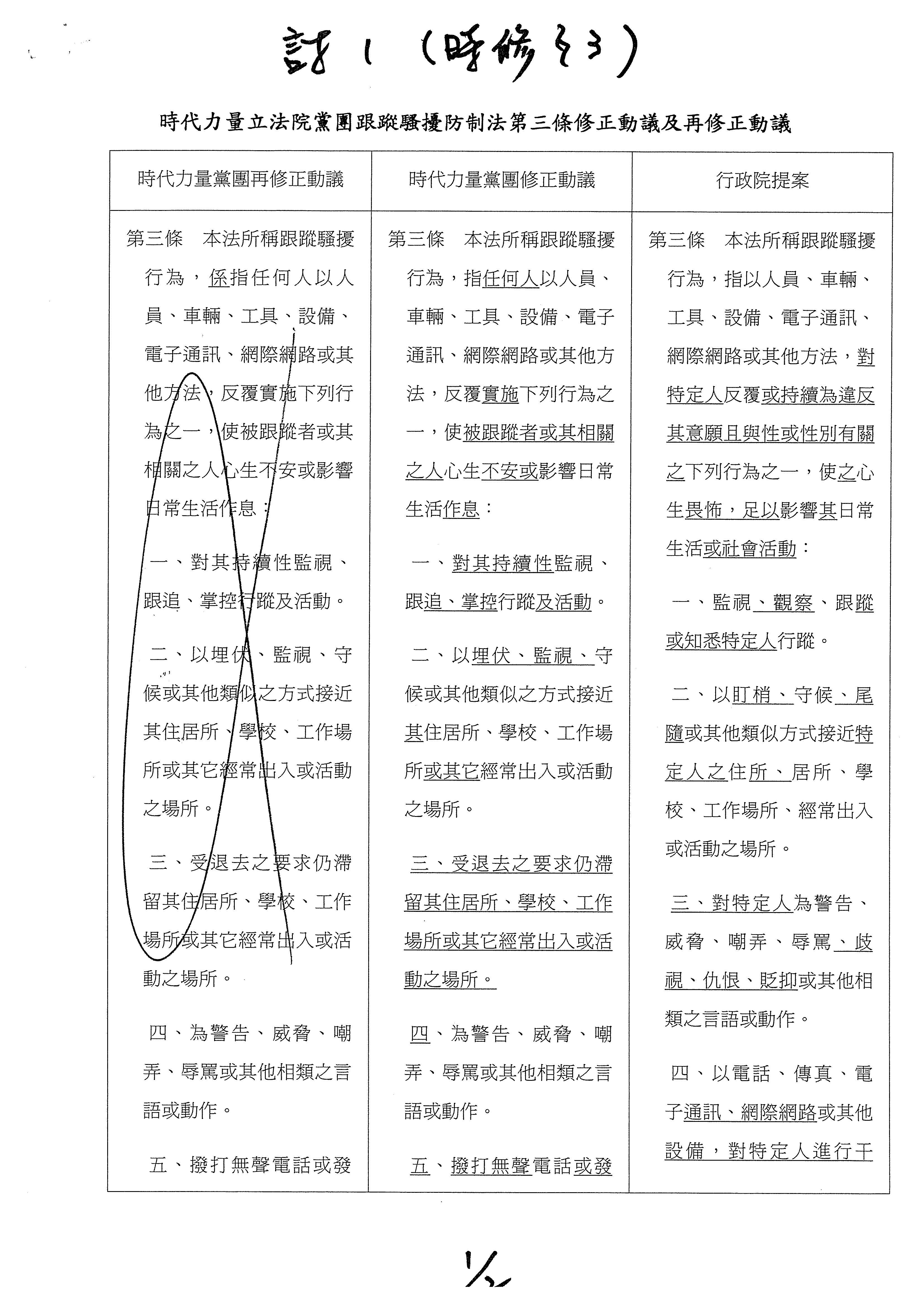 葉委員毓蘭:(13時29分)跟蹤騷擾防制法歷經兩屆委員的立法,在諸多遺憾中通過,本席最不能接受的就是執政黨口口聲聲說,民間版、在野黨版本太過理想化,擔心會增加警察的負擔,卻沒有認真考慮過警力和專業的配套,強推草率的行政院版本。在第三條的行為定義中,執政黨堅持限縮在性與性別,想要縮小打擊面以減少案量,但是執政黨所談的權力關係是一種複雜糾纏的概念,也徒增第一線受理報案的員警的困擾,反而增加民眾對警察的不信任感。