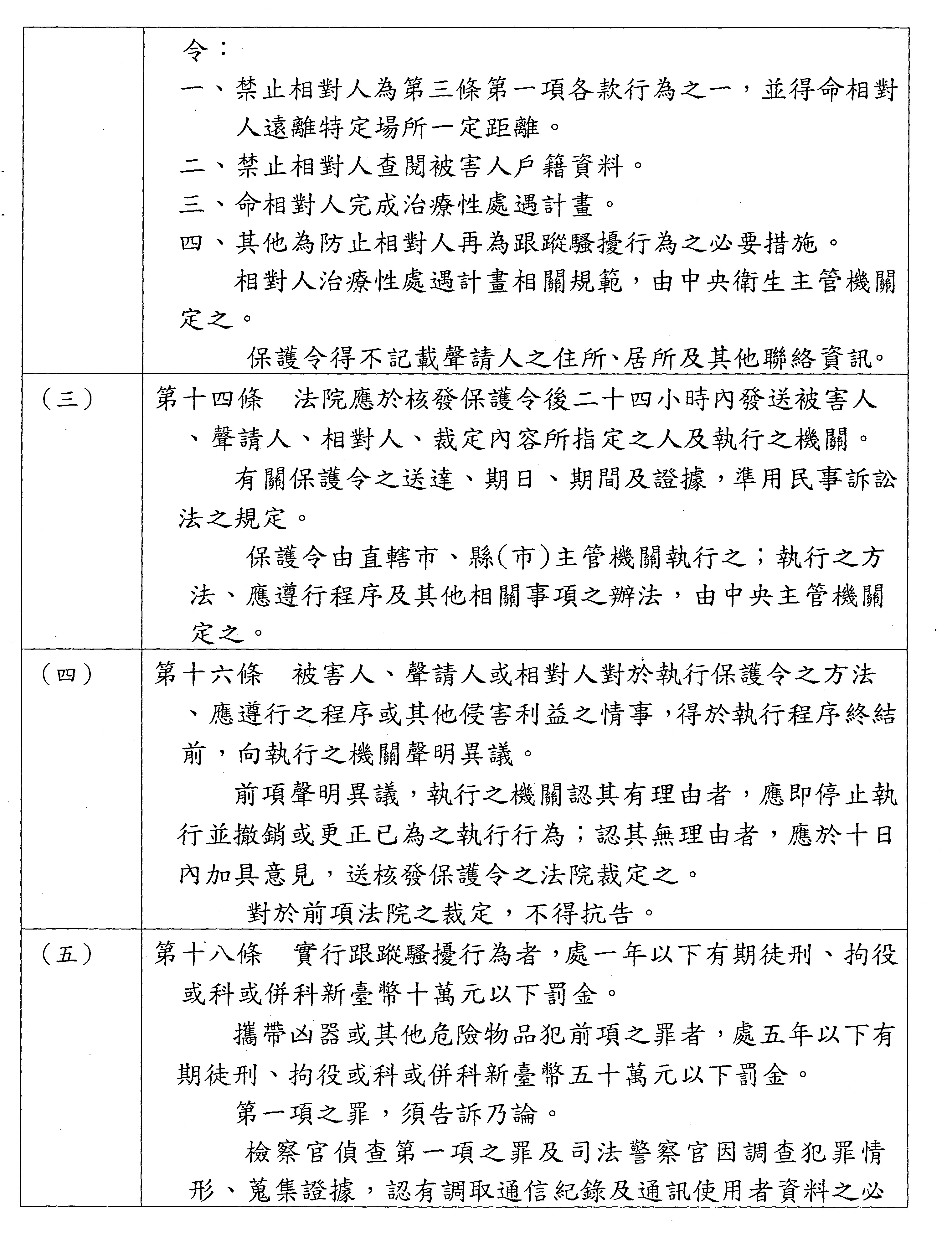 第十六條 法院應於核發保護令後二十四小時內發送被害人、聲請人、相對人、裁定內容所指定之人及執行之警察機關。 有關保護令之送達、期日、期間及證據,準用民事訴訟法之規定。 警察機關執行保護令之方法、應遵行程序及其他相關事項之辦法,由主管機關定之。 |