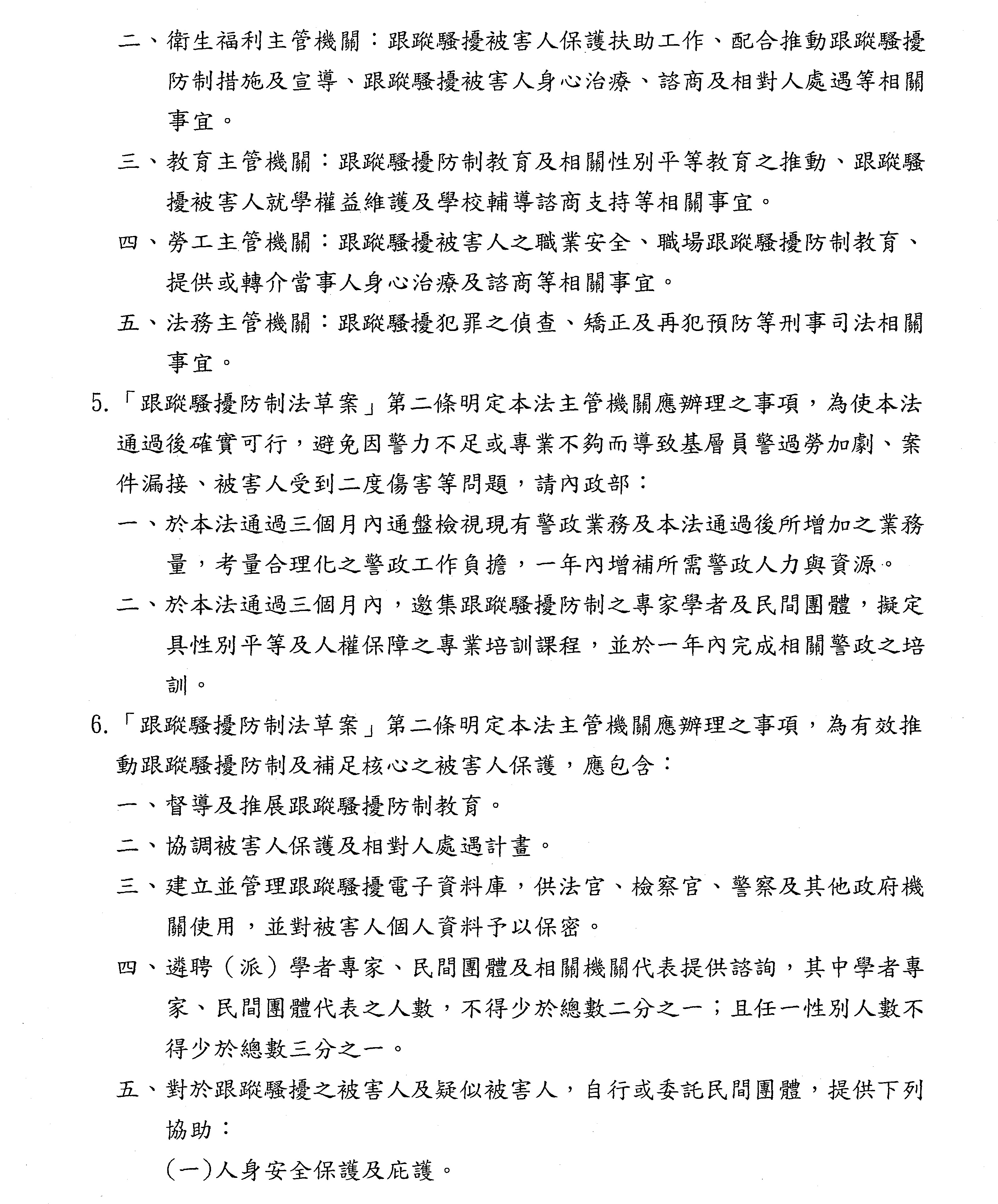 為促使國人人身安全及行動自由進一步獲得保障,有關「跟蹤騷擾防制法」立法完成後,主管機關於訂定本法施行細則時,應邀請專家學者、婦女團體及相關民間團體共同參與討論,藉由提供被害者服務之實際經驗及處理建議,以確實掌握跟蹤騷擾行為態樣及提出防制措施之研訂參考。