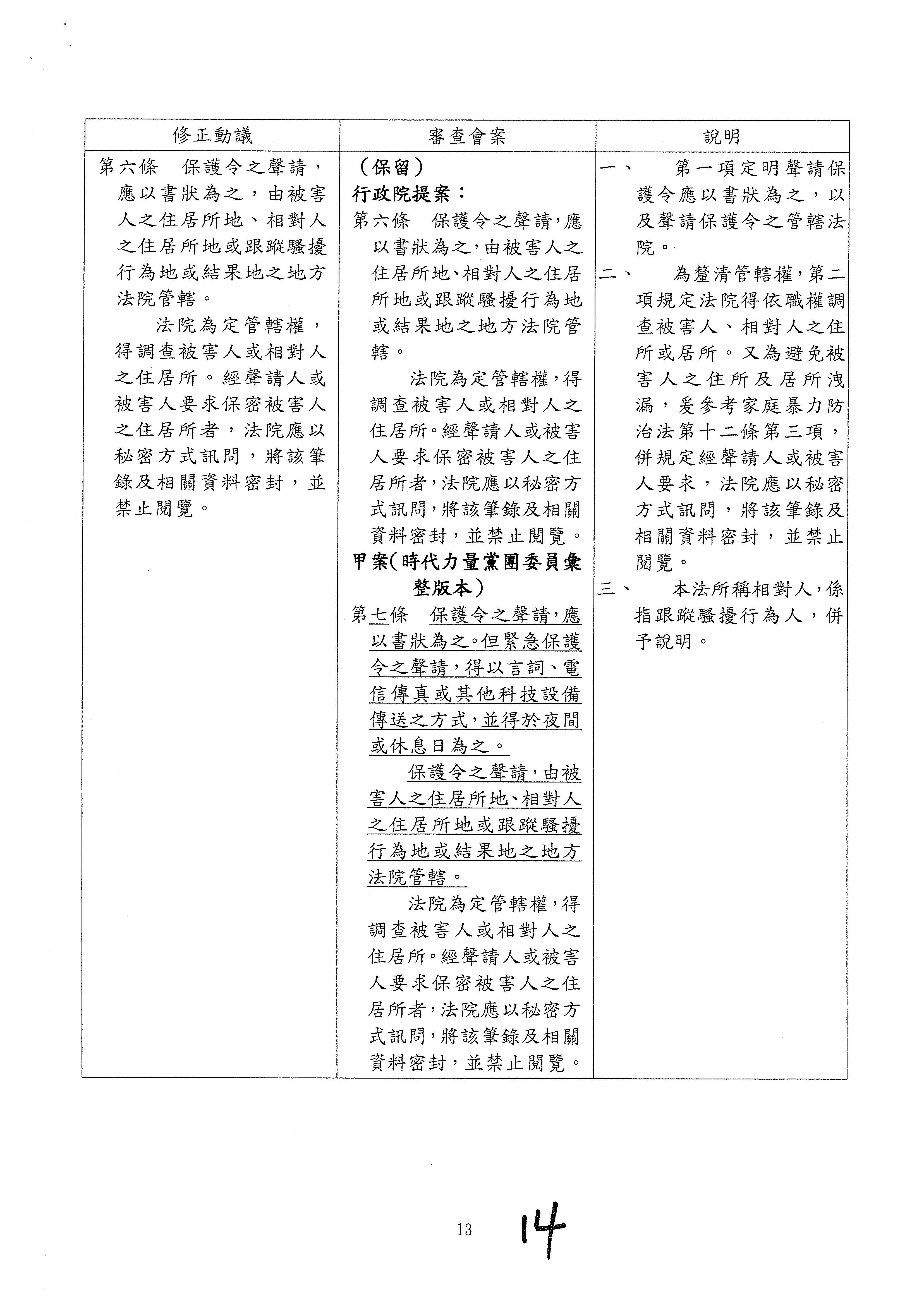 一、為識別裁判之對象、確定審理之方向及界限範圍,以利保護令事件程序之進行,爰參考家事事件法第七十五條第三項及非訟事件法第三十條第一項,於第一項規定聲請書應記載之事項;第四款所定具體措施,指第十四條第一項法院核發之各款保護令,併予說明。 二、為保護聲請人或被害人,於第二項規定保護令之聲請書得不記載住所及居所,僅記載送達處所。 三、為求慎重及便利民眾聲請,參考非訟事件法第三十條第二項規定,於第三項規定聲請人或代理人應於聲請書內簽名及不能簽名時之處理方式。 |
