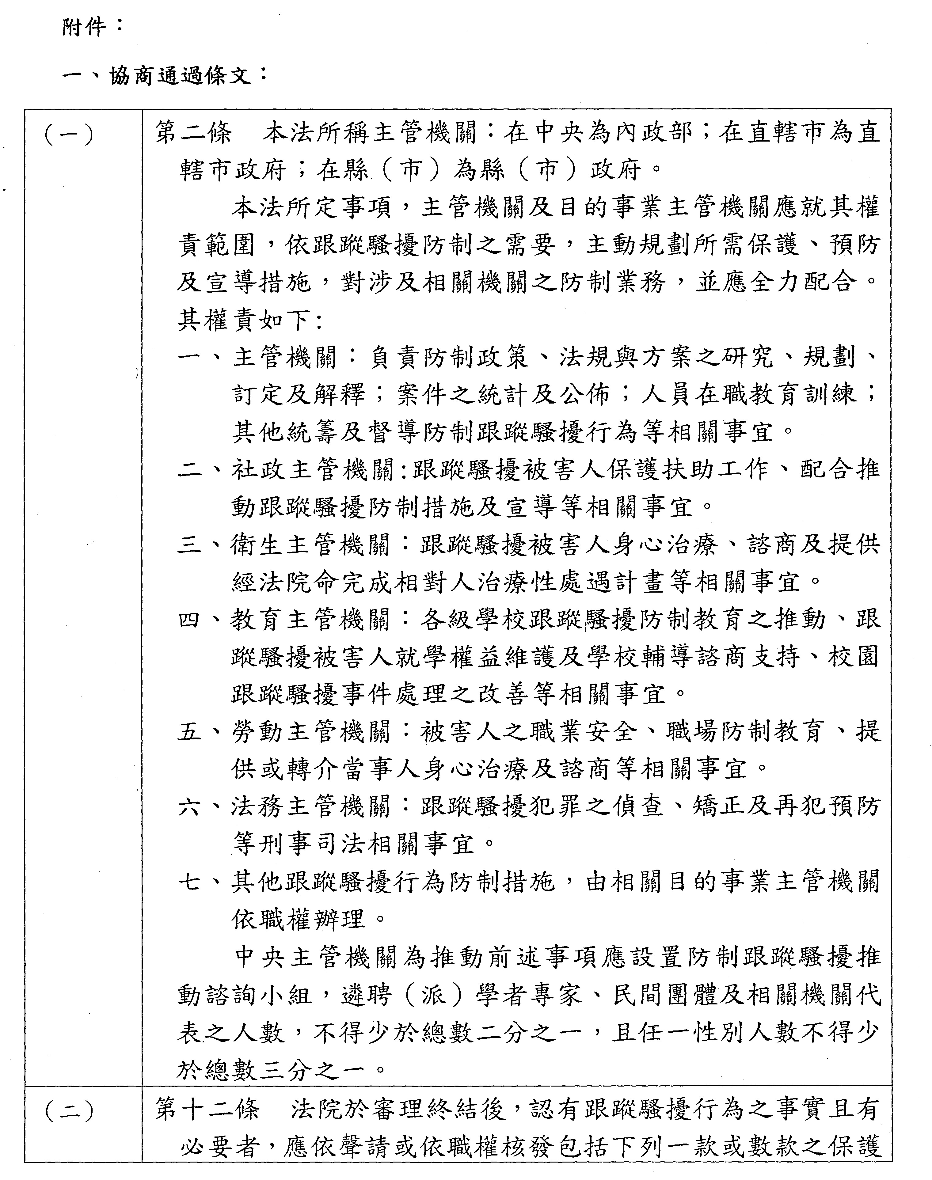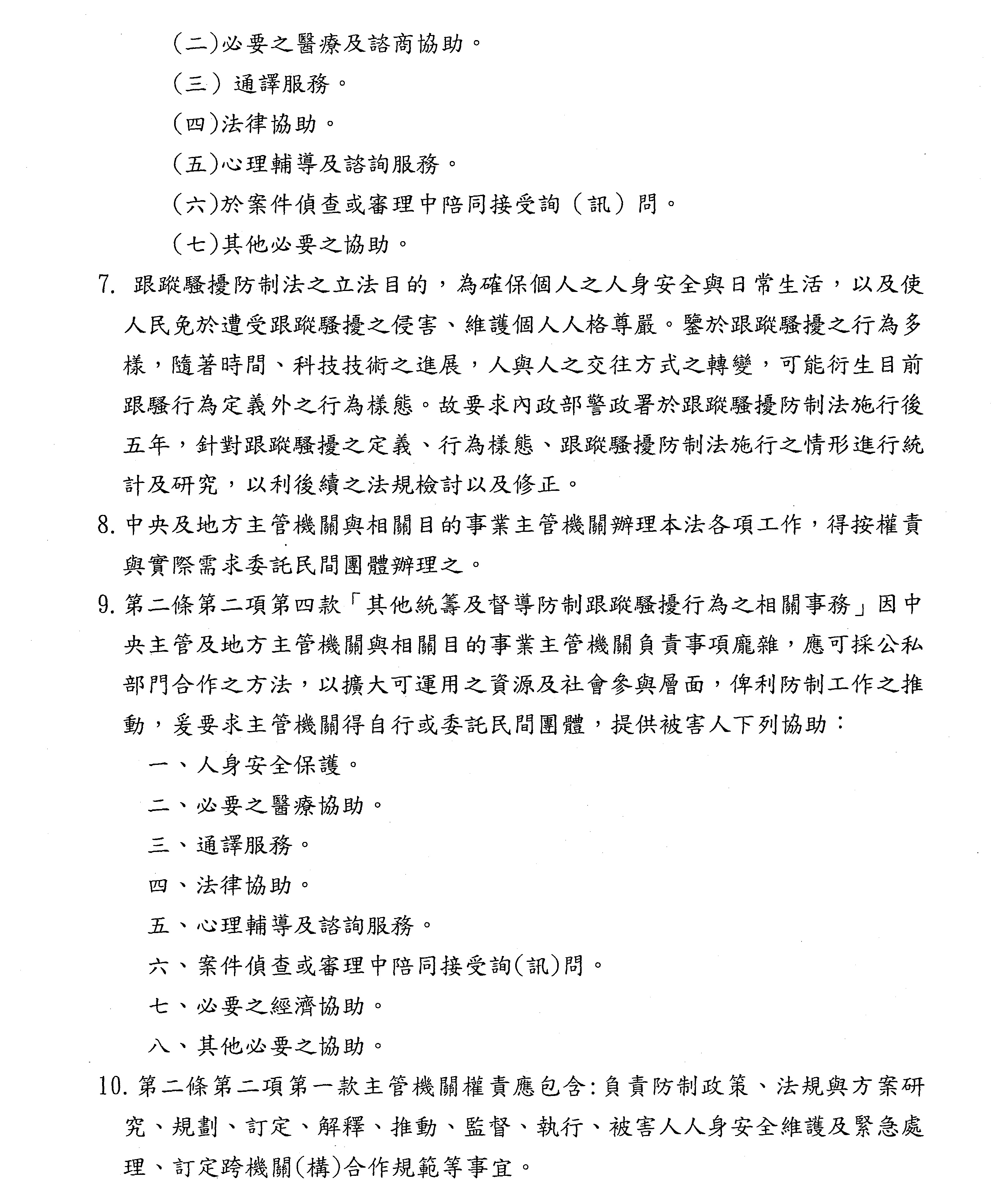 壹、有關「跟蹤騷擾防制法」第二條第二項第一款「主管機關……其他統籌及督導防制跟蹤騷擾行為等相關事宜」,應包含: