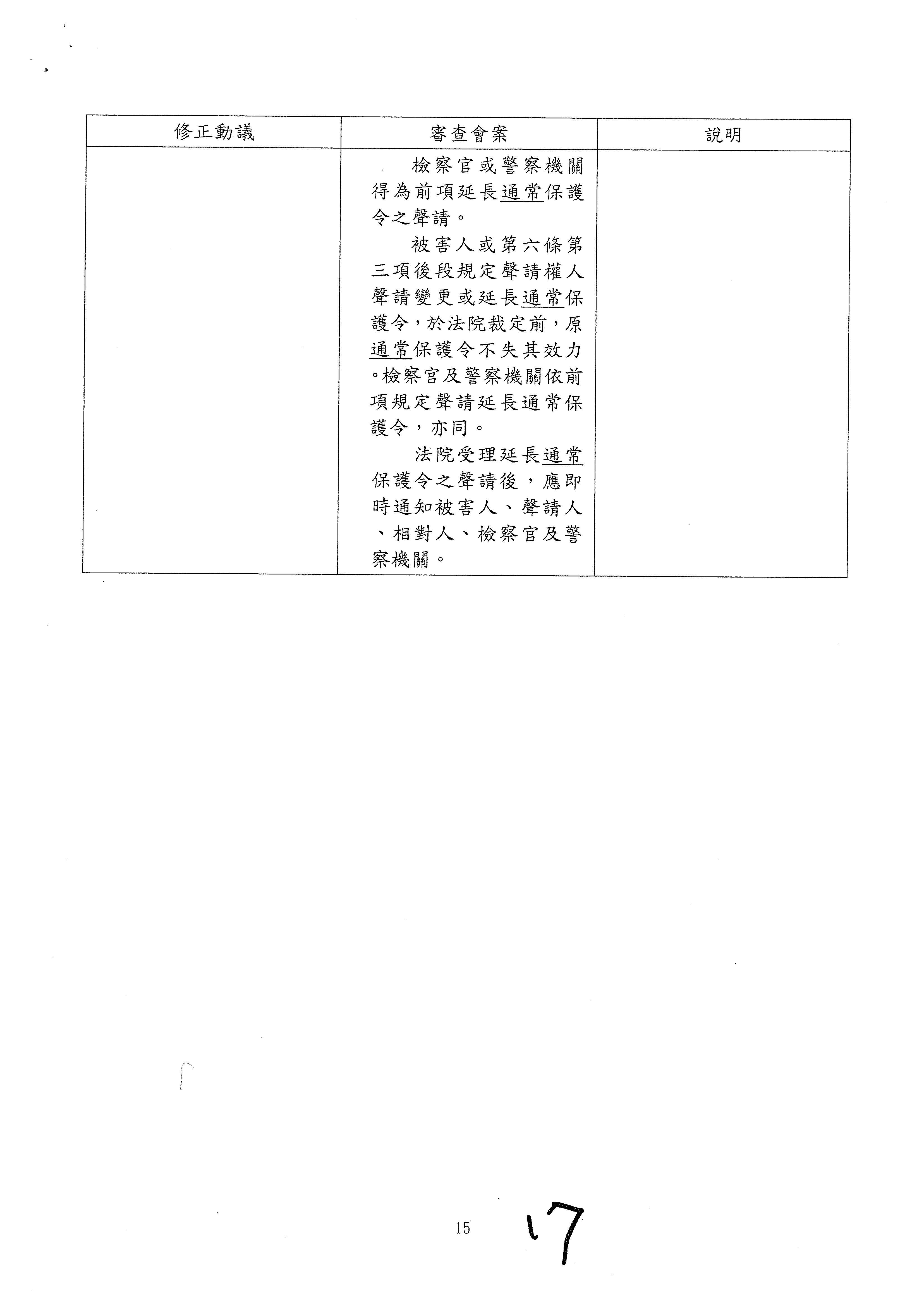 江委員永昌:(13時36分)院長,與會同仁。今天三讀通過跟蹤騷擾防制法,警察機關對跟蹤騷擾行為2年效力的書面告誡,若行為人再犯,再透過保護令及刑事程序處理,這是我國法制往保障人民免於恐懼的自由邁向一大步。但是今天我們將所謂的跟蹤騷擾行為限定在與性或性別有關,是為了考量立法之初,警察與司法介入到人民私領域的互動,可能的衝擊會難以評估,所以採取比較保守的界定。