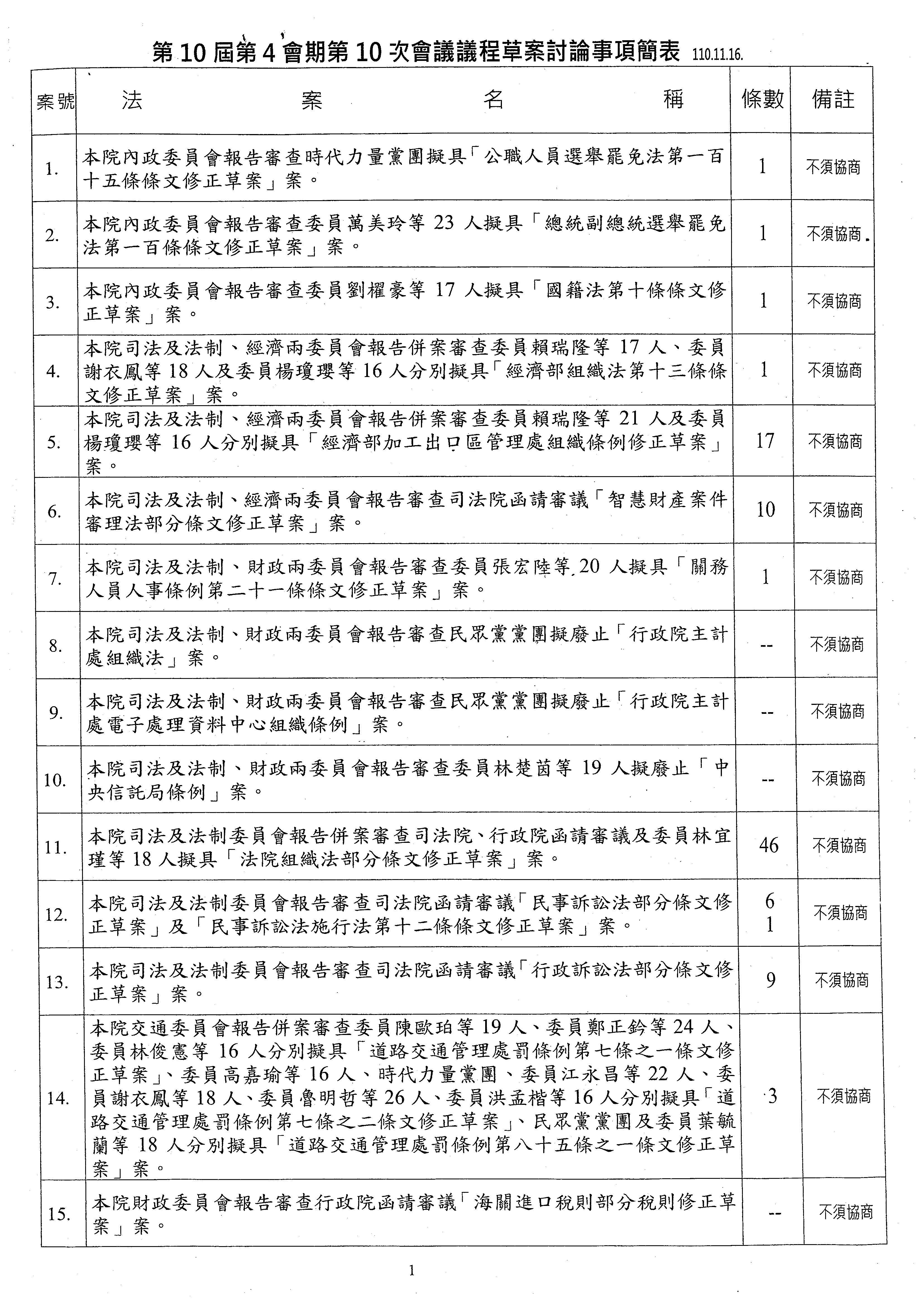 立法院第10屆第4會期第10次會議議事日程草案