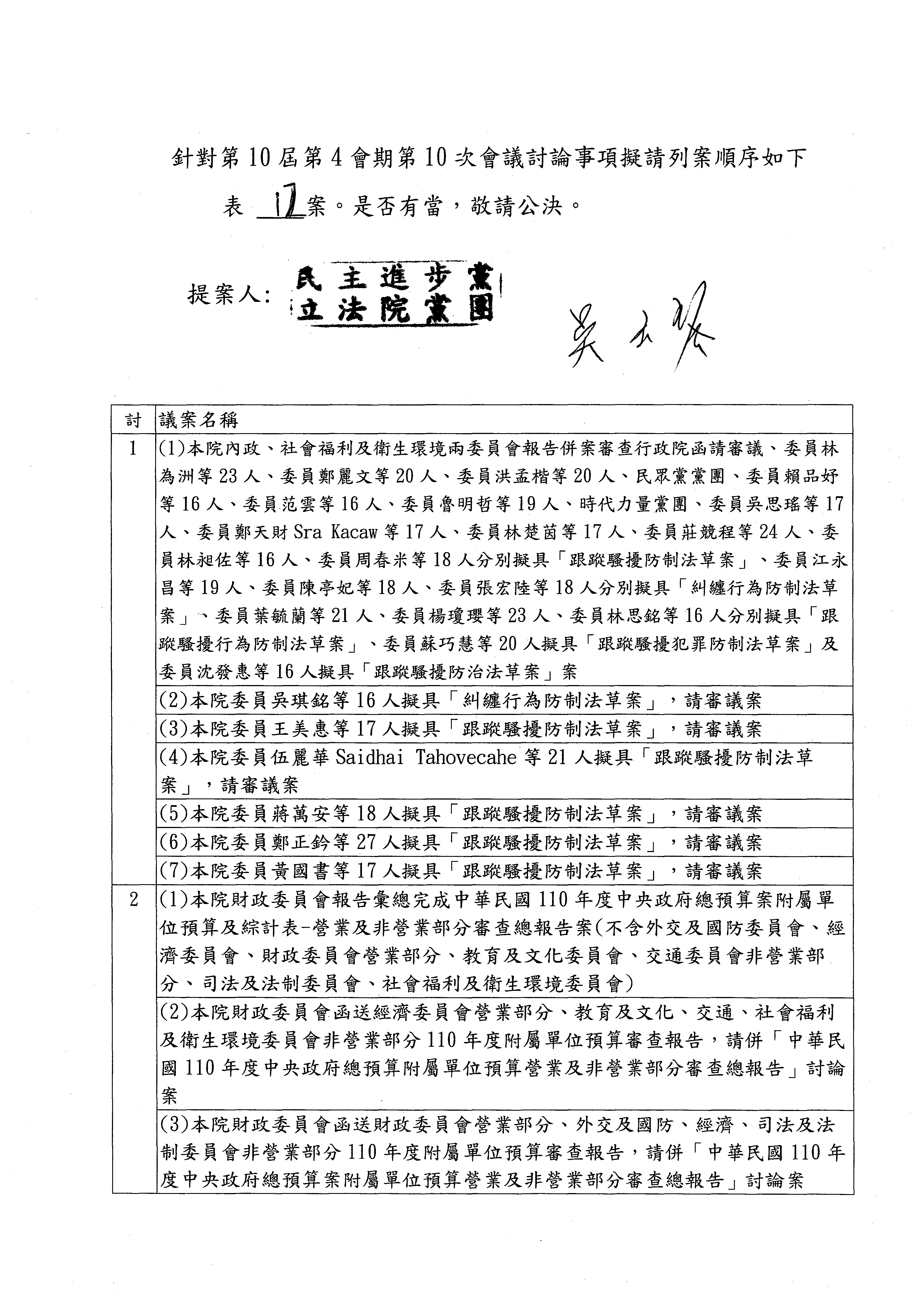 吳委員玉琴:民進黨立院黨團針對第10屆第4會期第10次會議討論事項擬請列案順序如下表12案。是否有當,敬請公決。議案部分,請議事人員代為宣讀。謝謝。