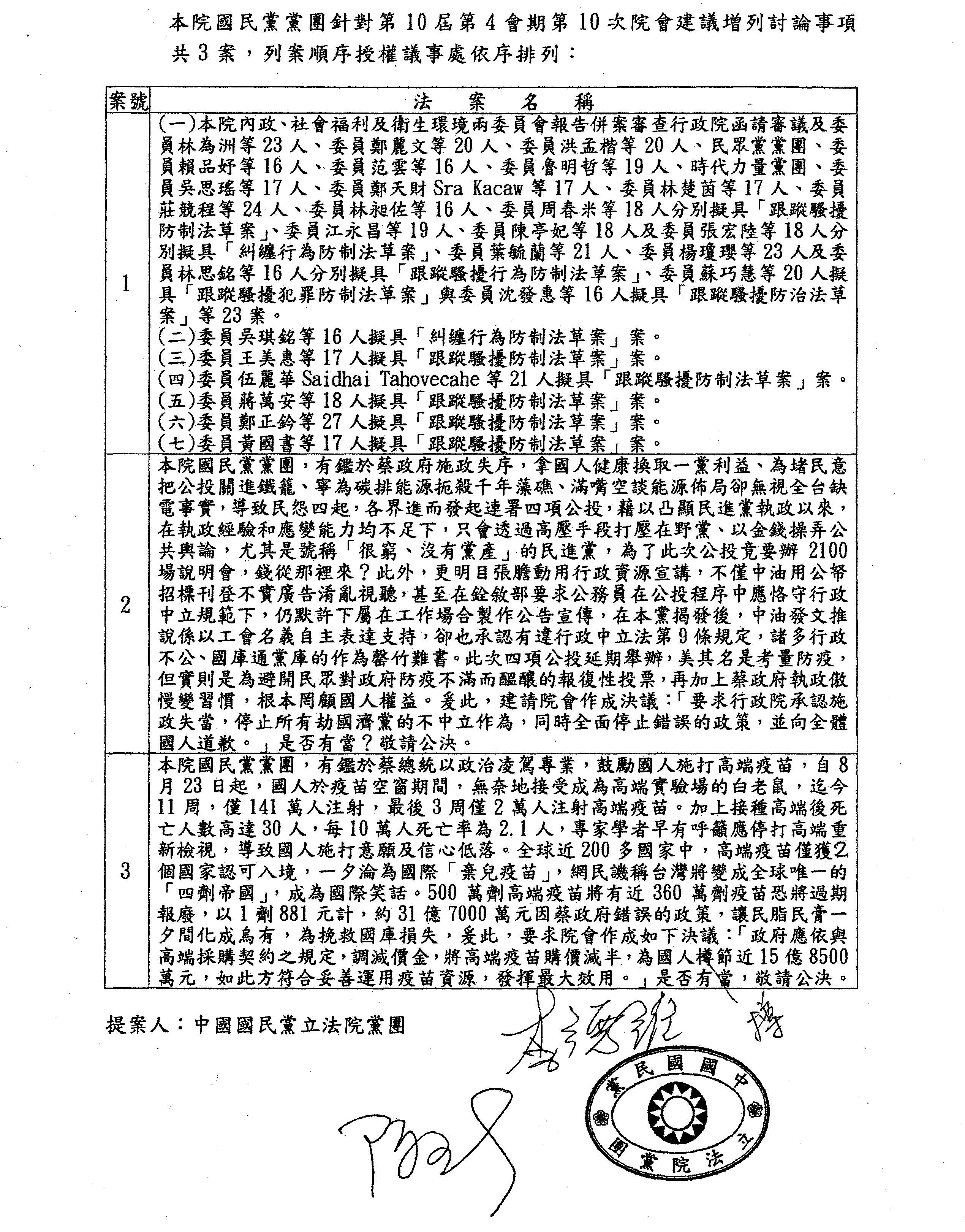 國民黨黨團提案: