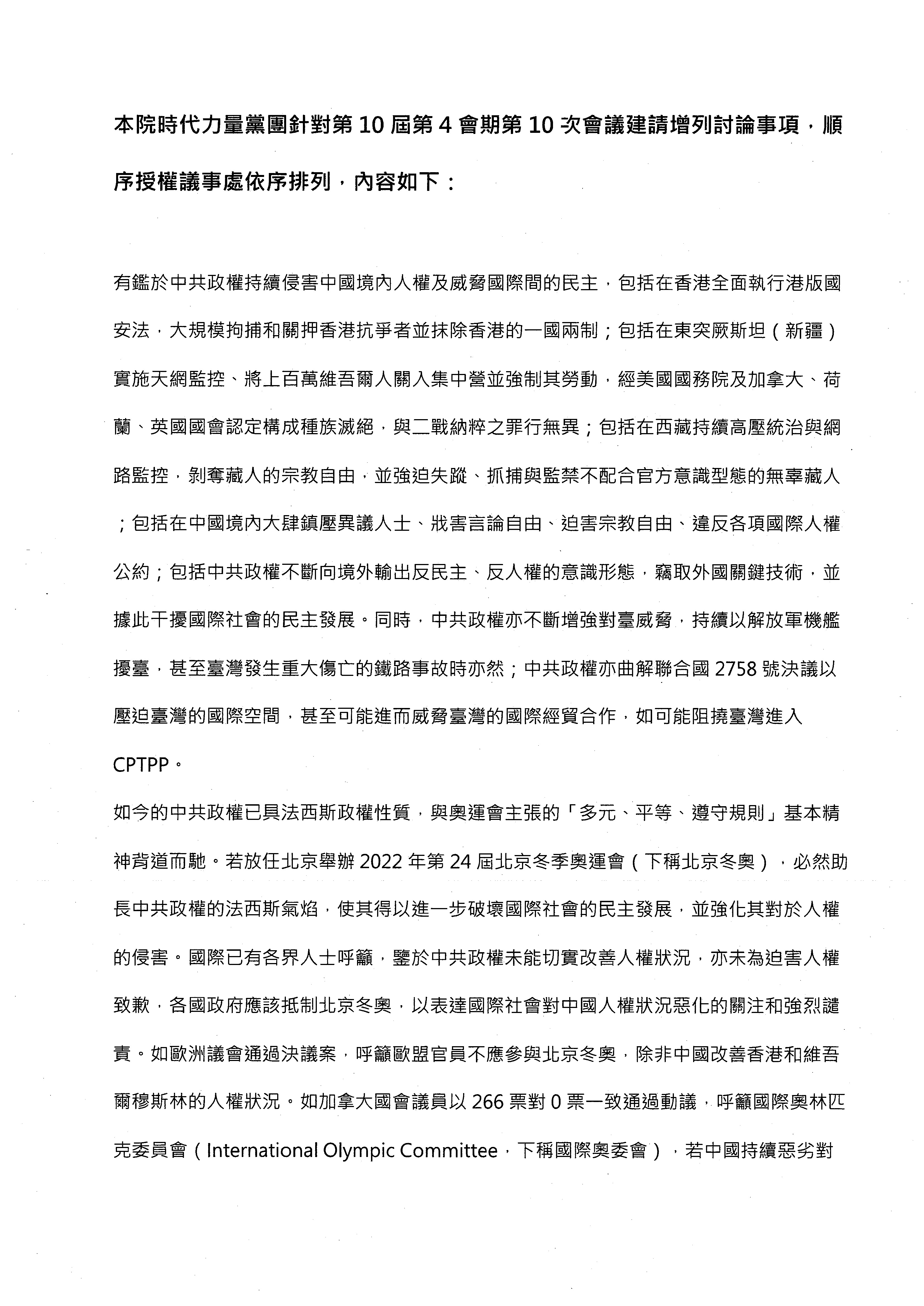 邱委員顯智:時代力量黨團針對第10屆第4會期第10次會議建請增列討論事項1案,順序授權議事處依序排列。內容請議事人員代為宣讀。