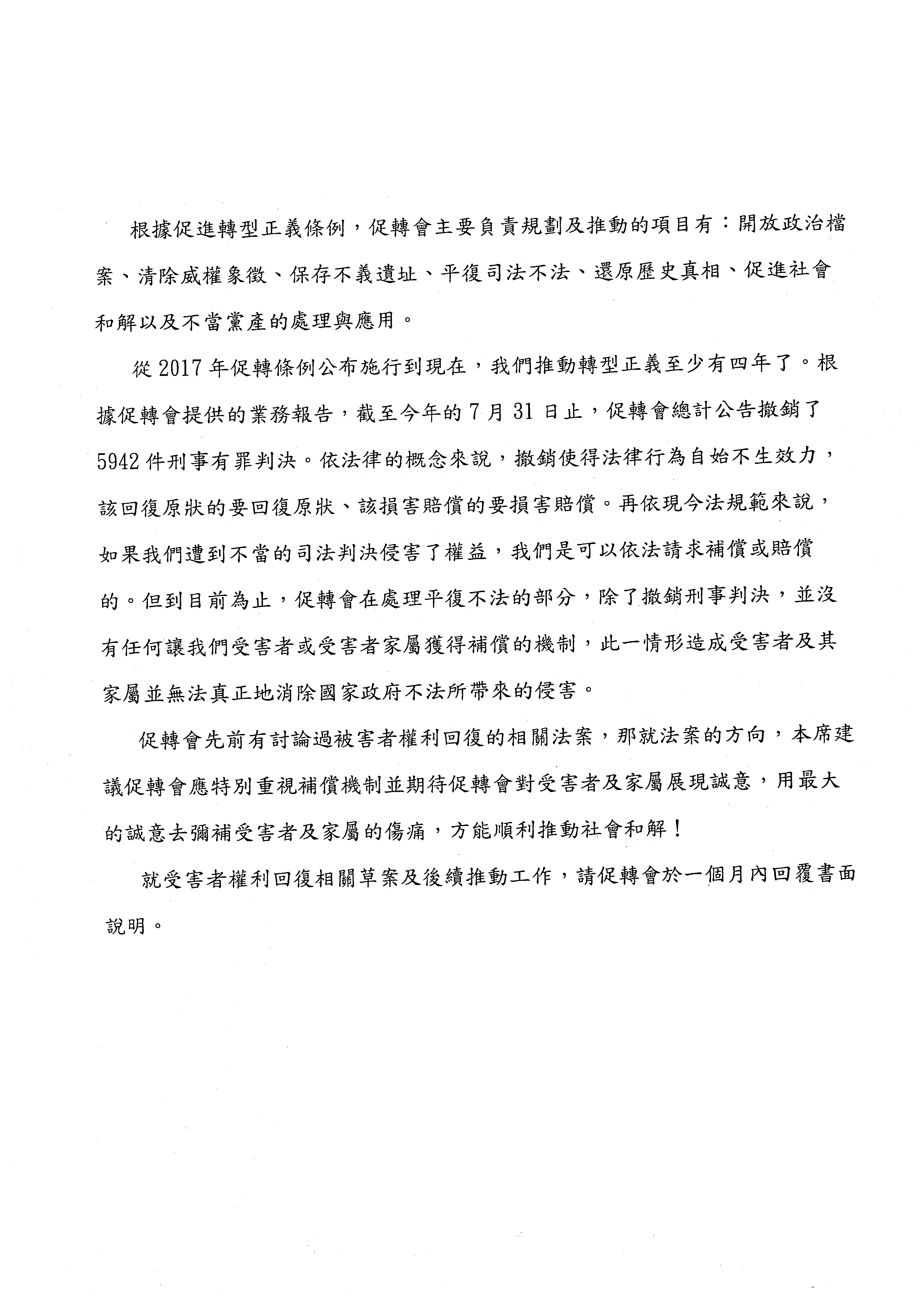 羅委員致政:(11時54分)代理主任委員,我想今天一整天聽下來,大家對於促轉會的認知、期待和看法不完全一樣,也包括促轉會自己的定位跟看法,因此我想利用今天這個機會跟主委再做進一步的釐清。你們的法定職掌很清楚地寫在促轉條例的第二條,我稍微整理了一下,包括開放政治檔案一路下來有很多,請問這些法定職掌,能在你們宣稱任期期滿的明年5月前完成嗎?還是有些會繼續推動?