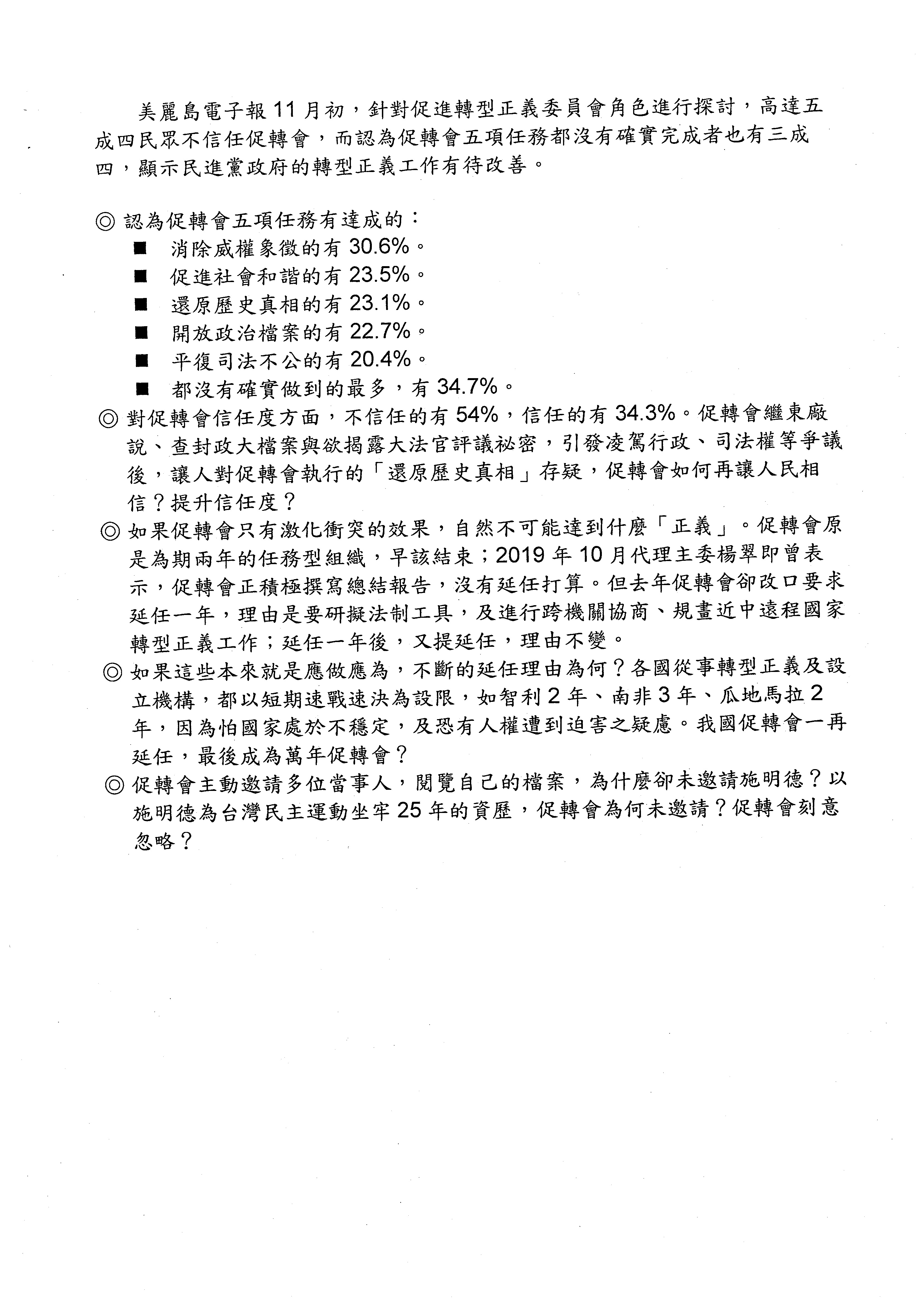 何委員志偉:我最後要做個小結,今天其實在短短的時間裡講了很多東西,剛剛也講到哪些事情是絕對不計代價一定要做到的,除了讓整個促轉會建立制度之外,另外我們有沒有時間軸的概念,哪些優先順序要去調整,這部分有沒有列出來?