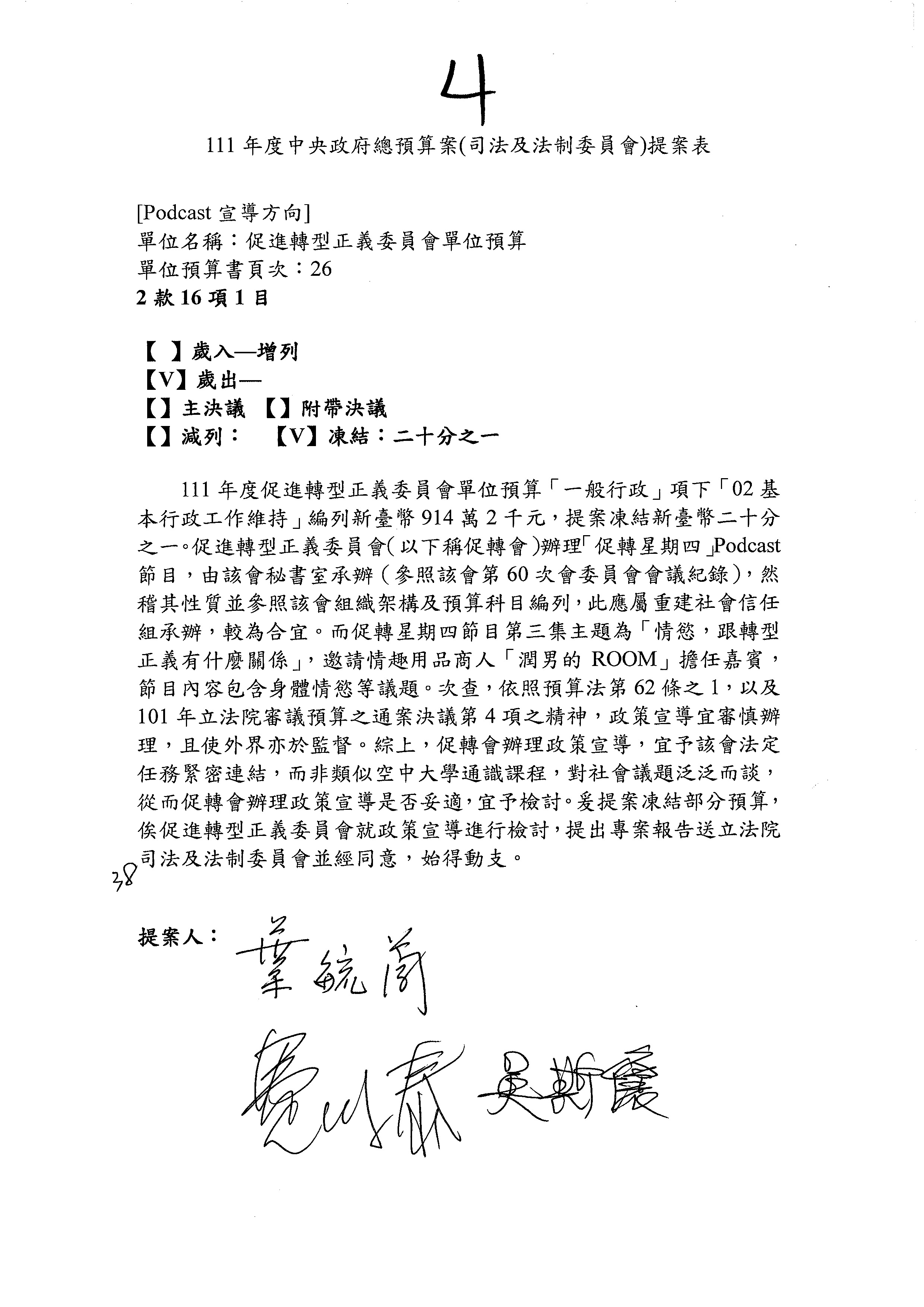 葉委員毓蘭:主席,我在第4案寫得很清楚,促轉會有一個叫「促轉星期四」的Podcast,但我覺得有一些節目的內容有問題,然是編在促轉會的公務預算,應該是要重建社會信任跟轉型正義,他們第三集的主題是「情慾,跟轉型正義有什麼關係?」邀請情趣用品商人「潤男的Room」主持人來擔任嘉賓,這部分過度牽強跟促轉有關,我覺得類似的這些事情要注意,每分錢都是老百姓非常辛苦的血汗錢,應該要更嚴謹、正面地對待。我本來是凍結二十分之一,但是我看到主席剛剛很努力在幫他們,我可以凍結20萬元及提書面報告。