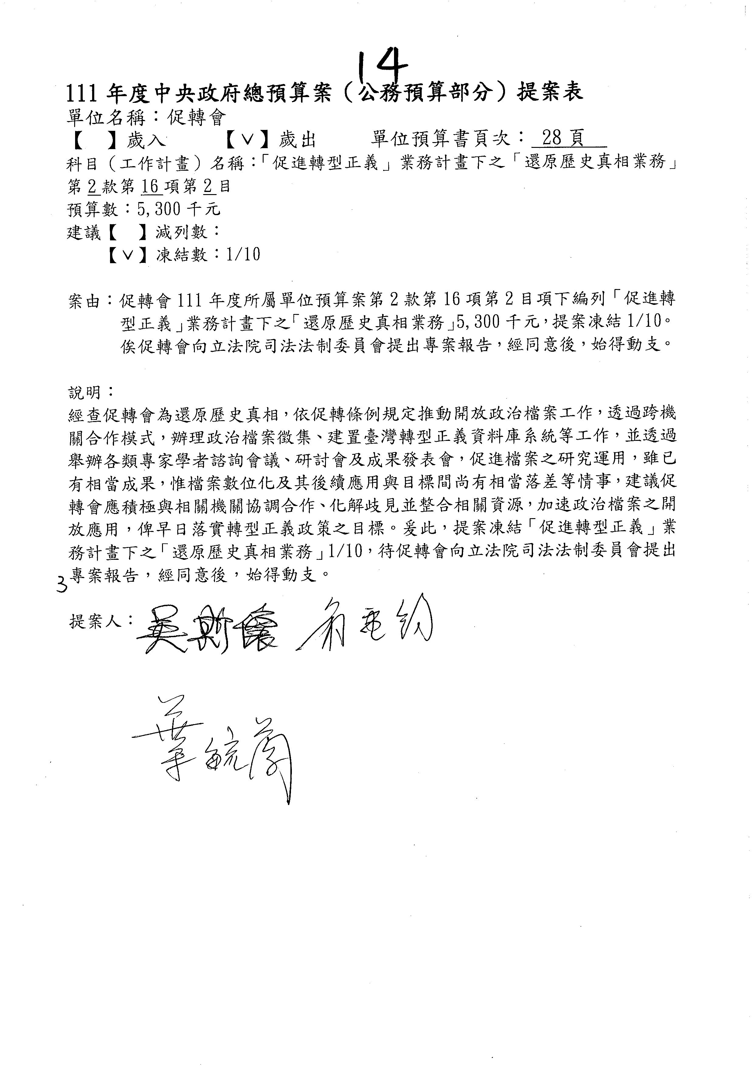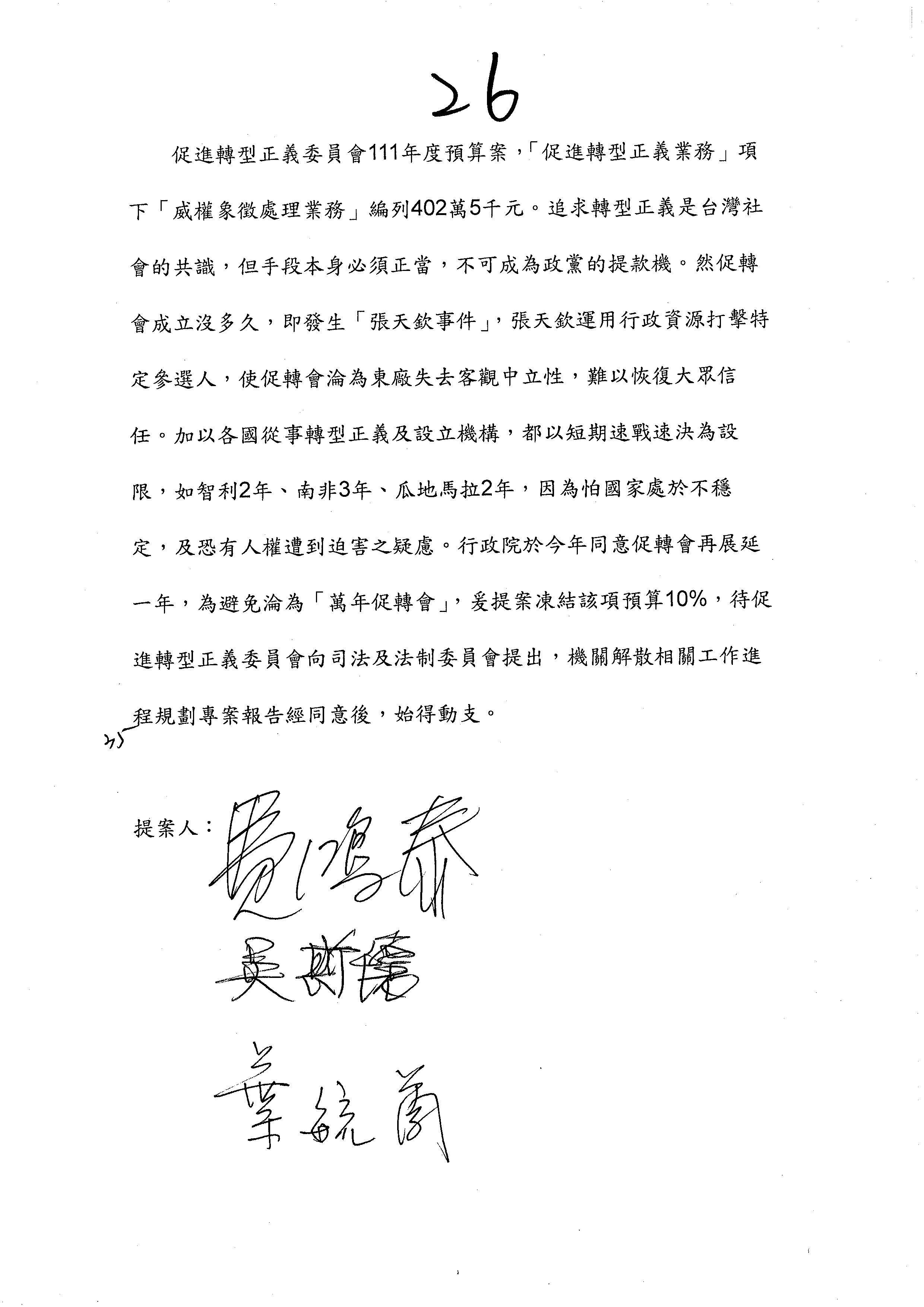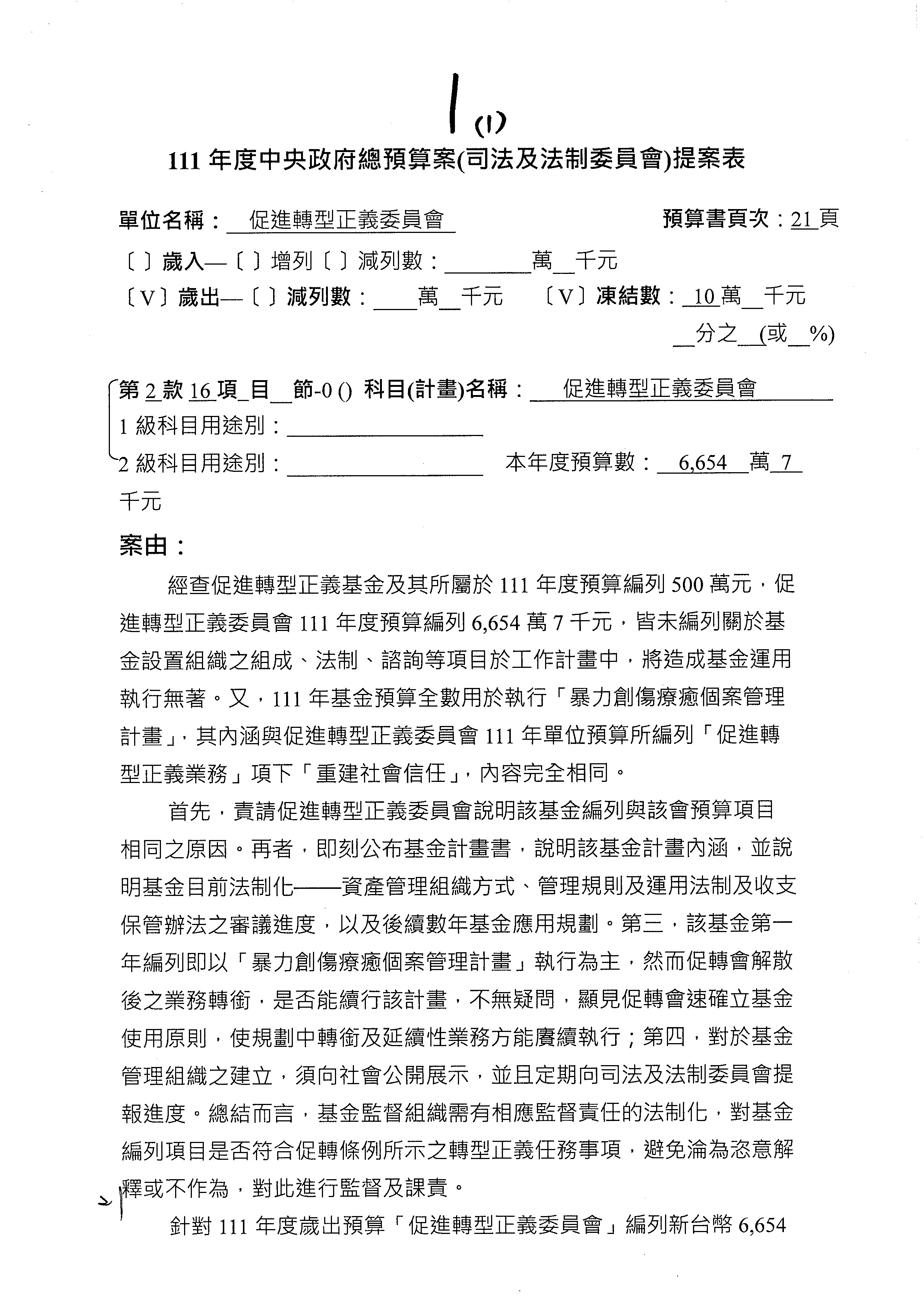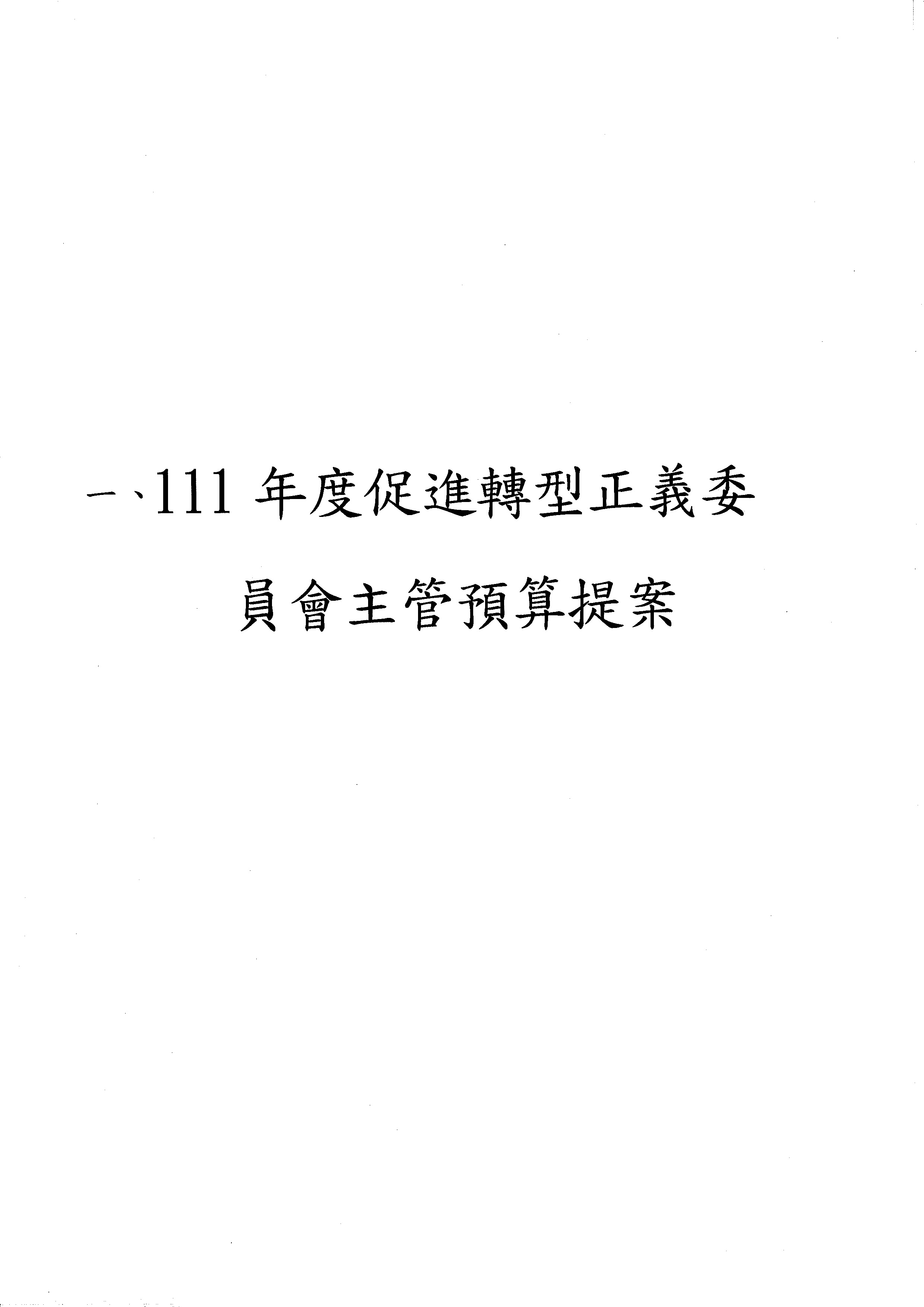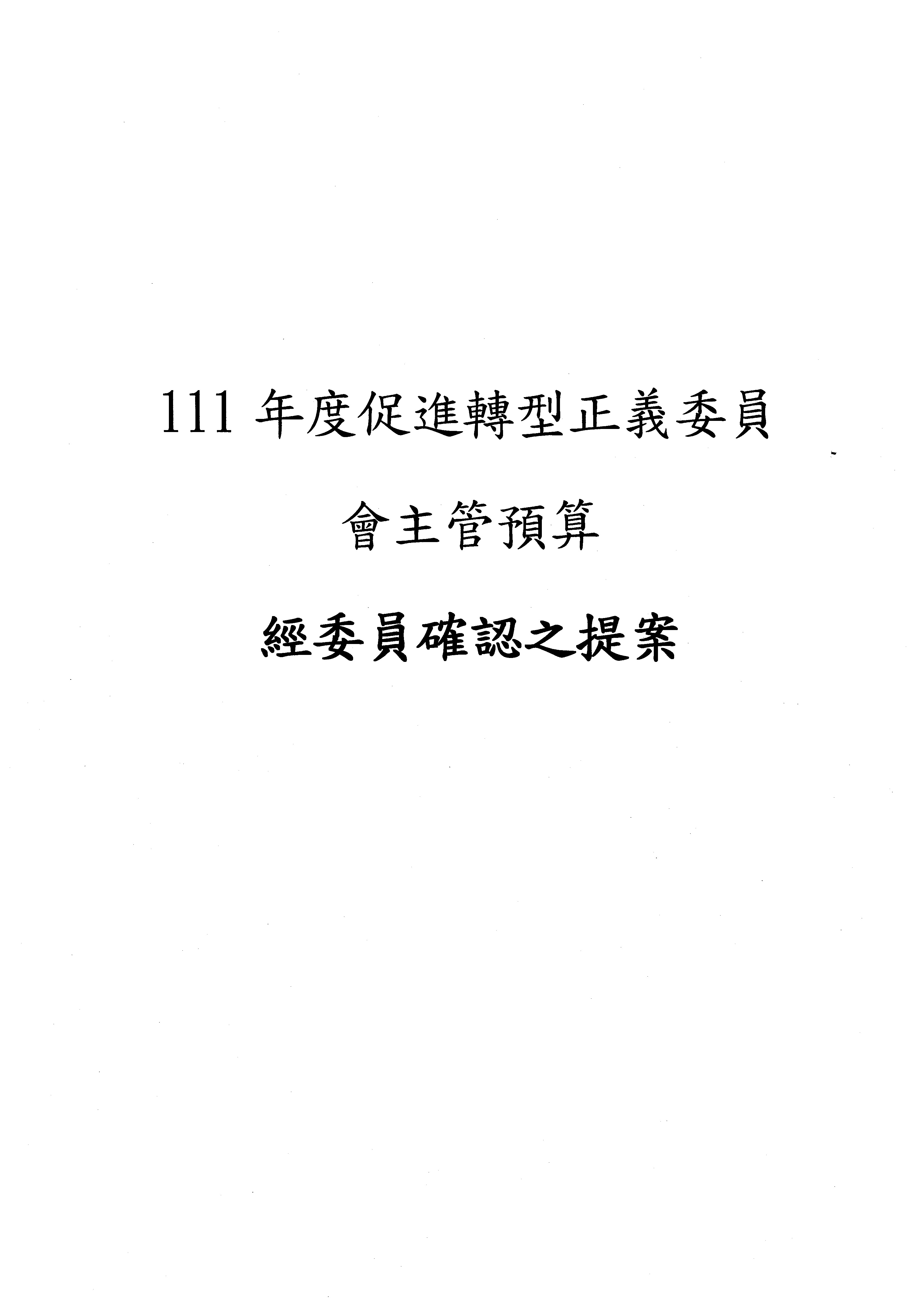 討論事項第一案:中華民國111年度中央政府總預算案關於促進轉型正義委員會主管收支部分審查完竣,提報院會,院會討論前須交黨團協商。