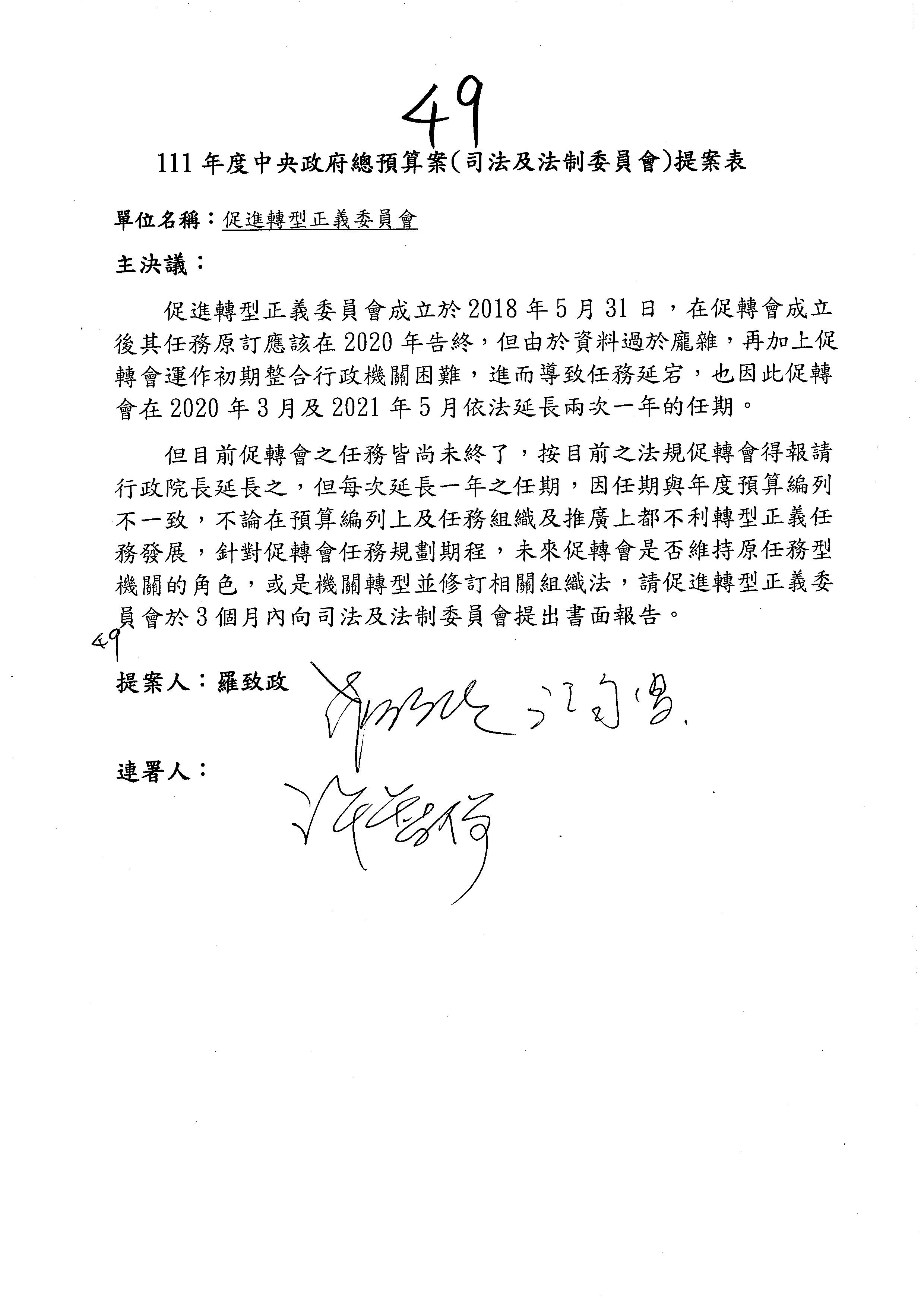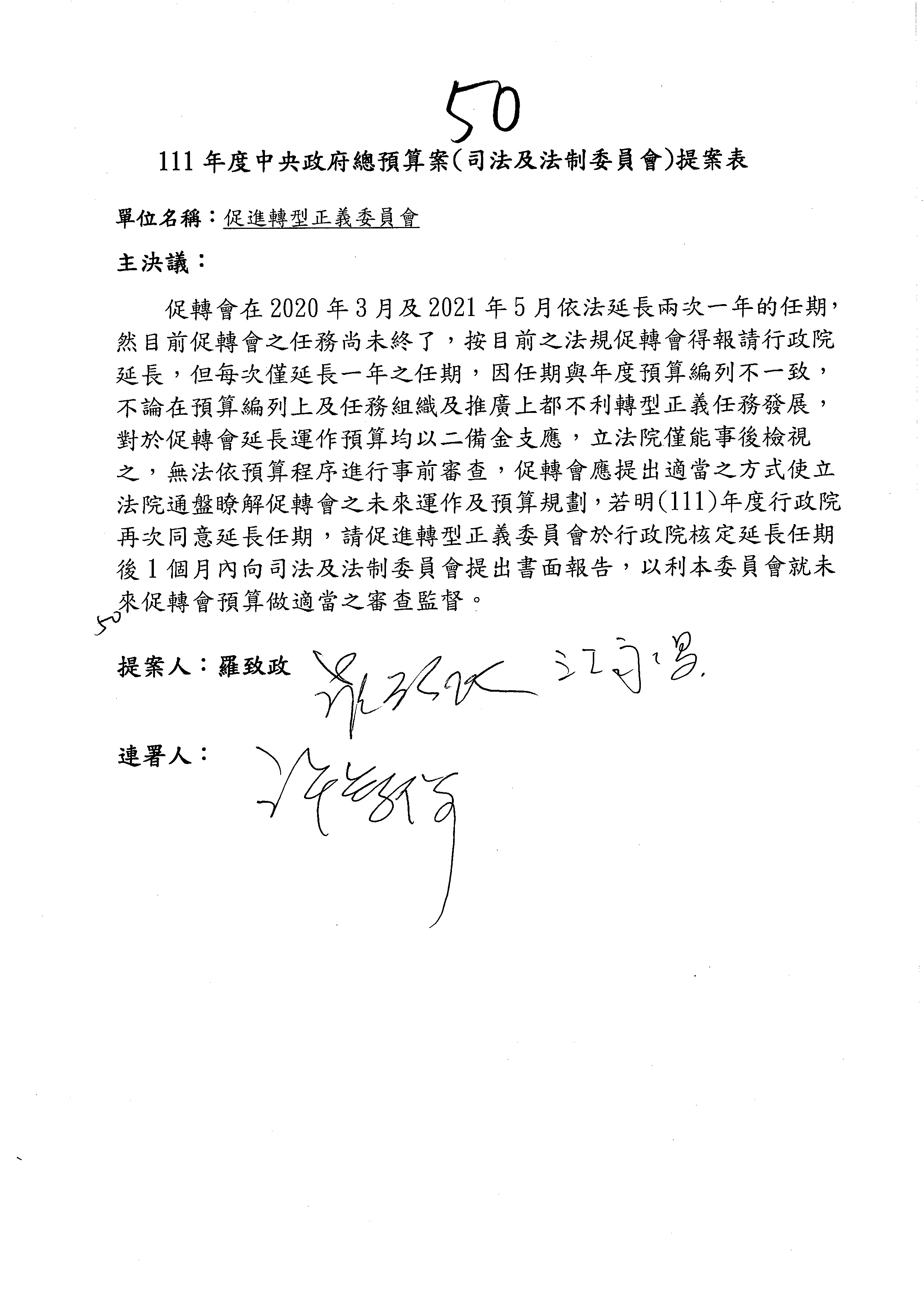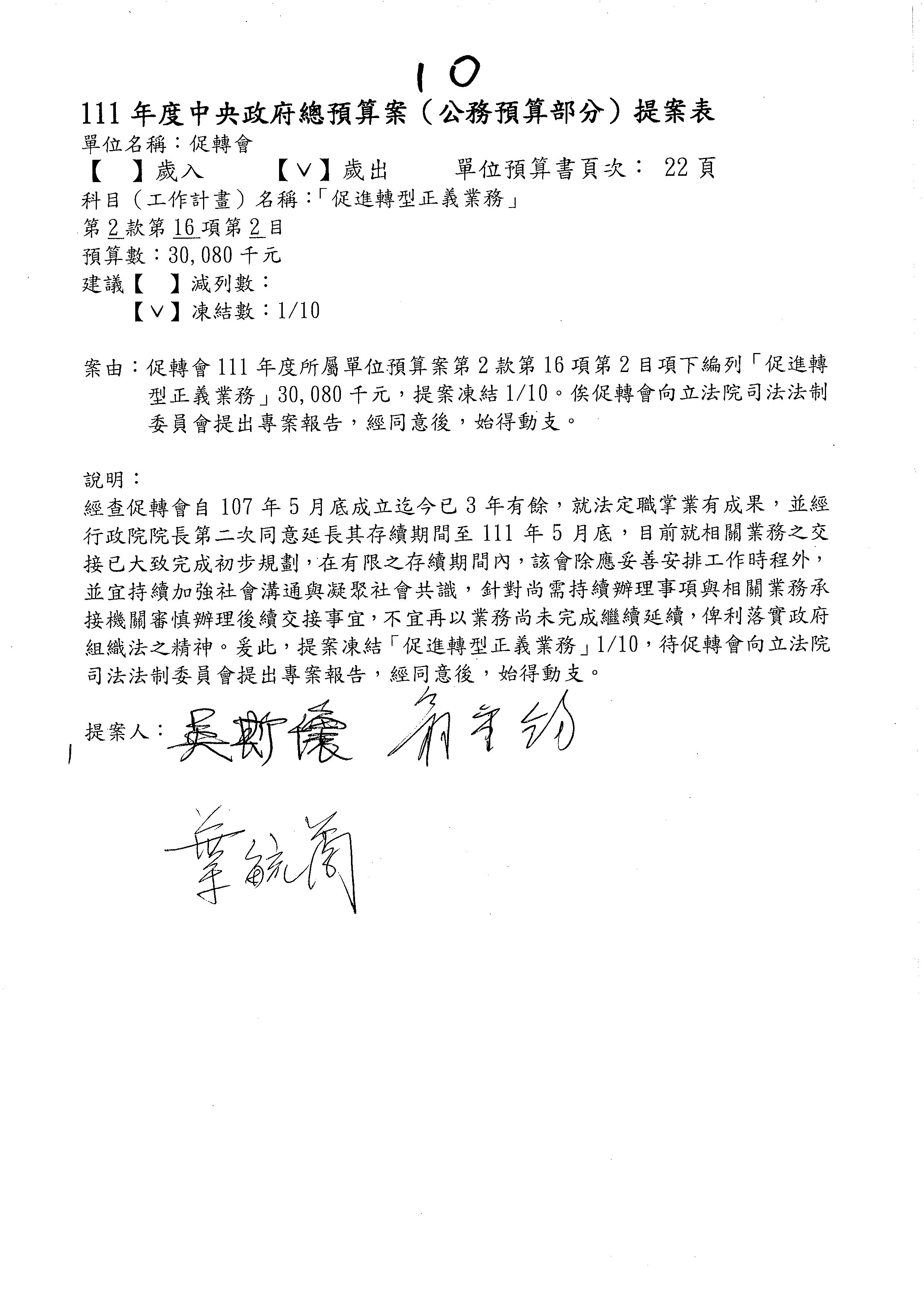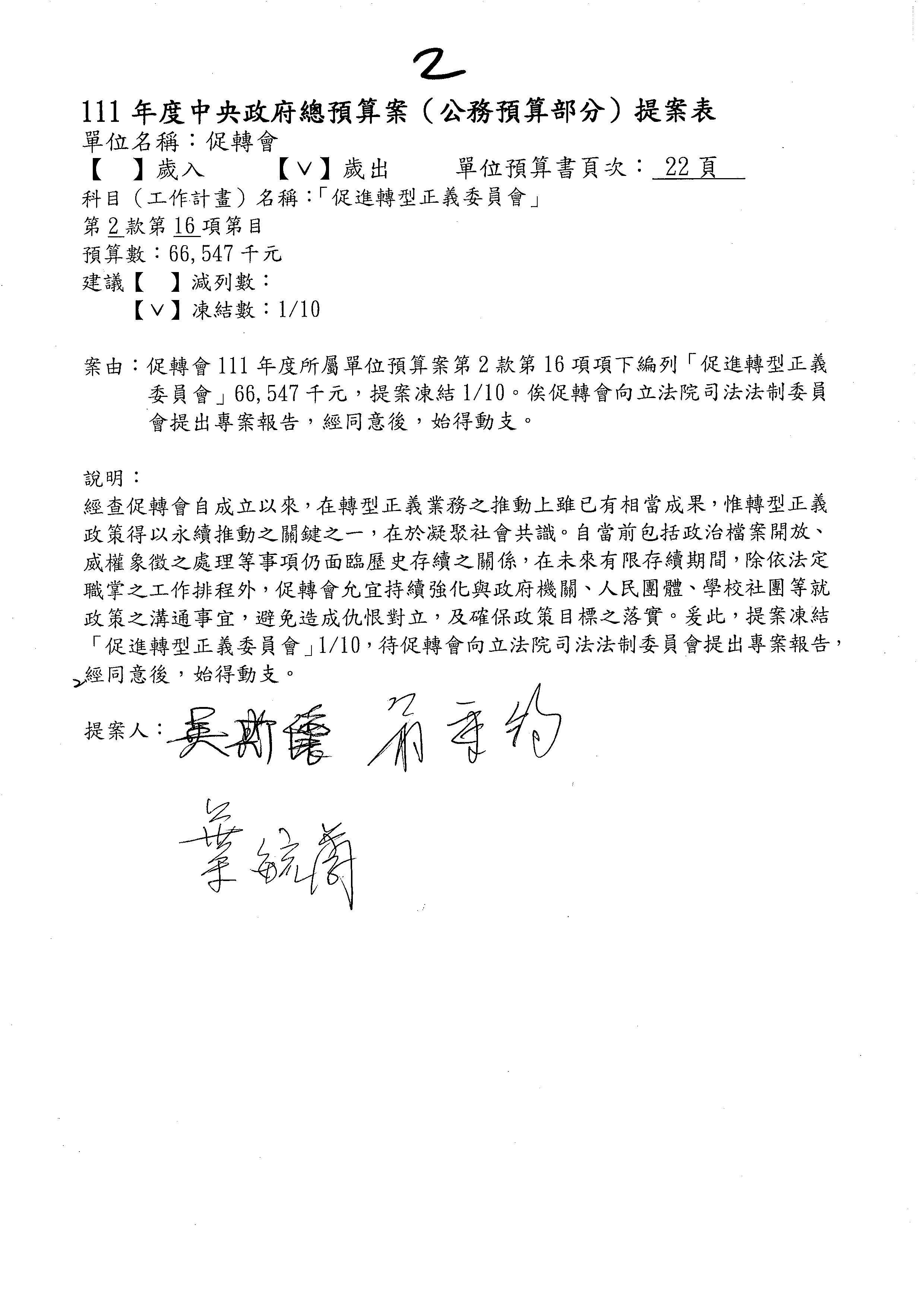討論事項第一案:中華民國111年度中央政府總預算案關於促進轉型正義委員會主管收支部分審查完竣,提報院會,院會討論前須交黨團協商。