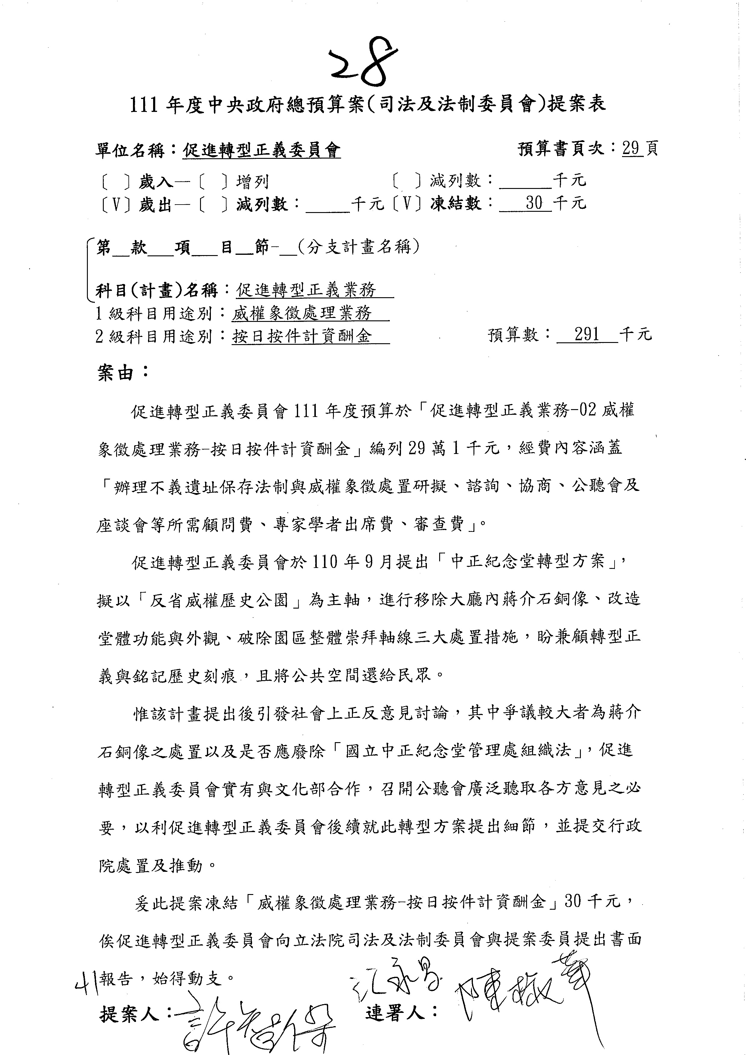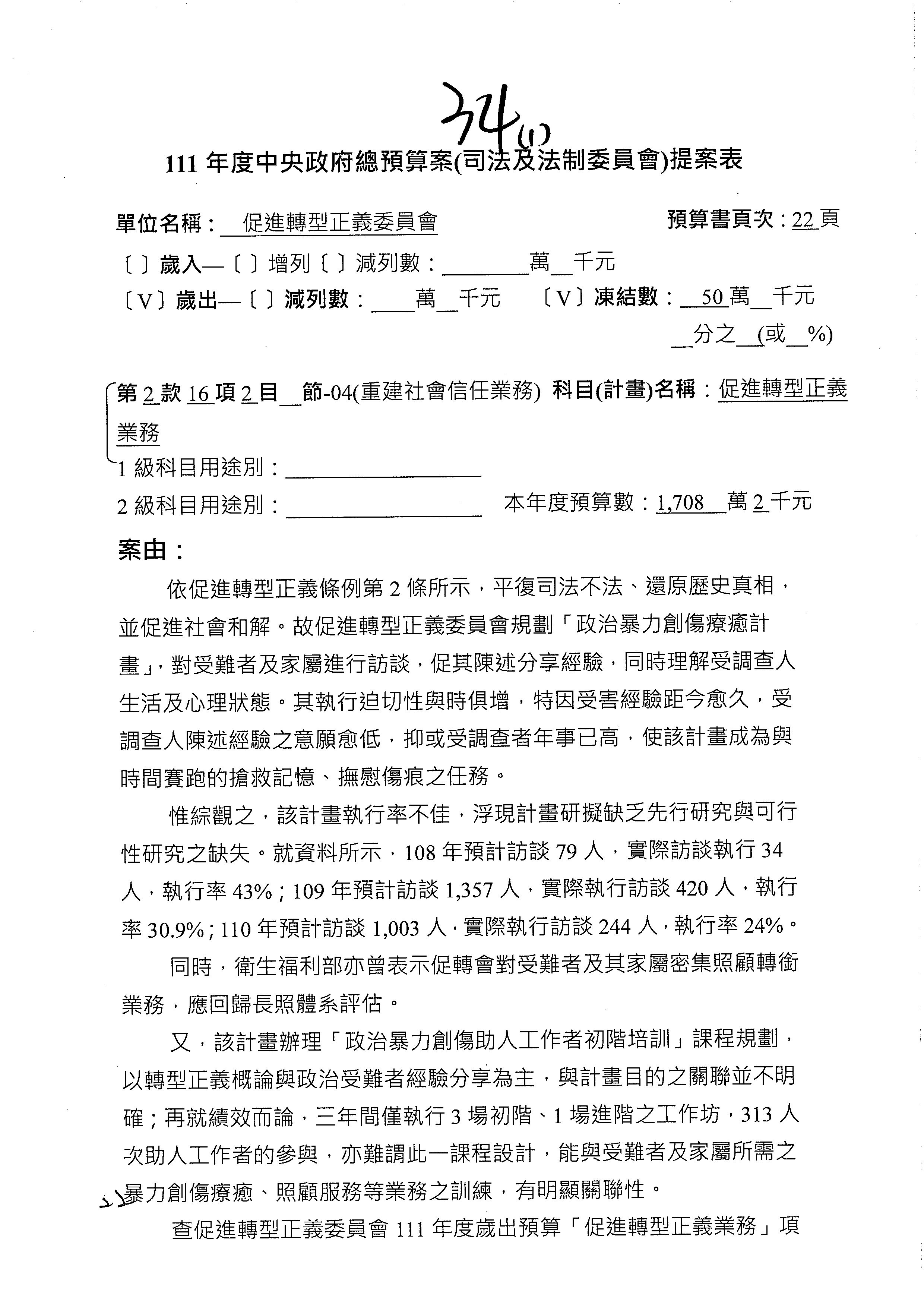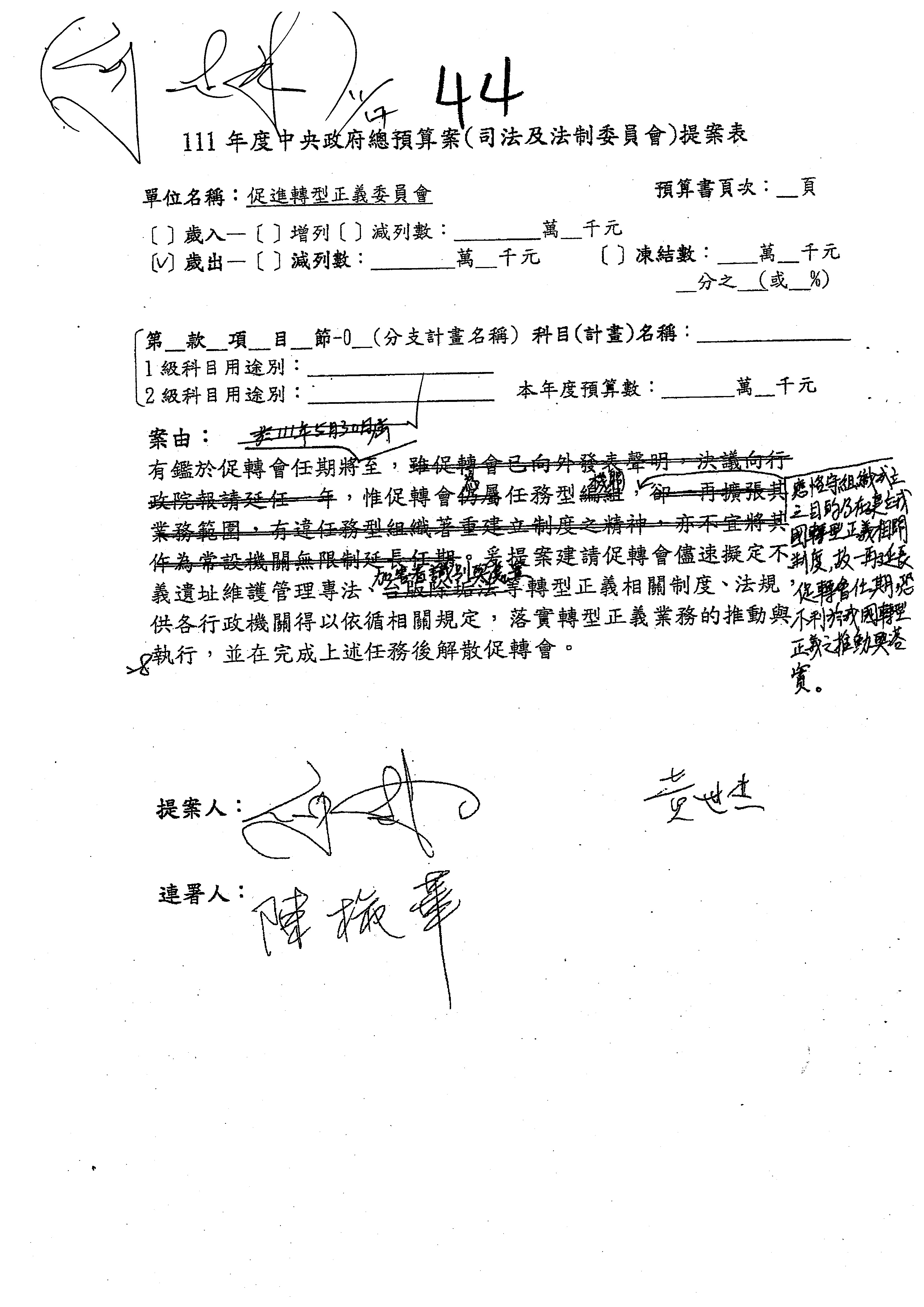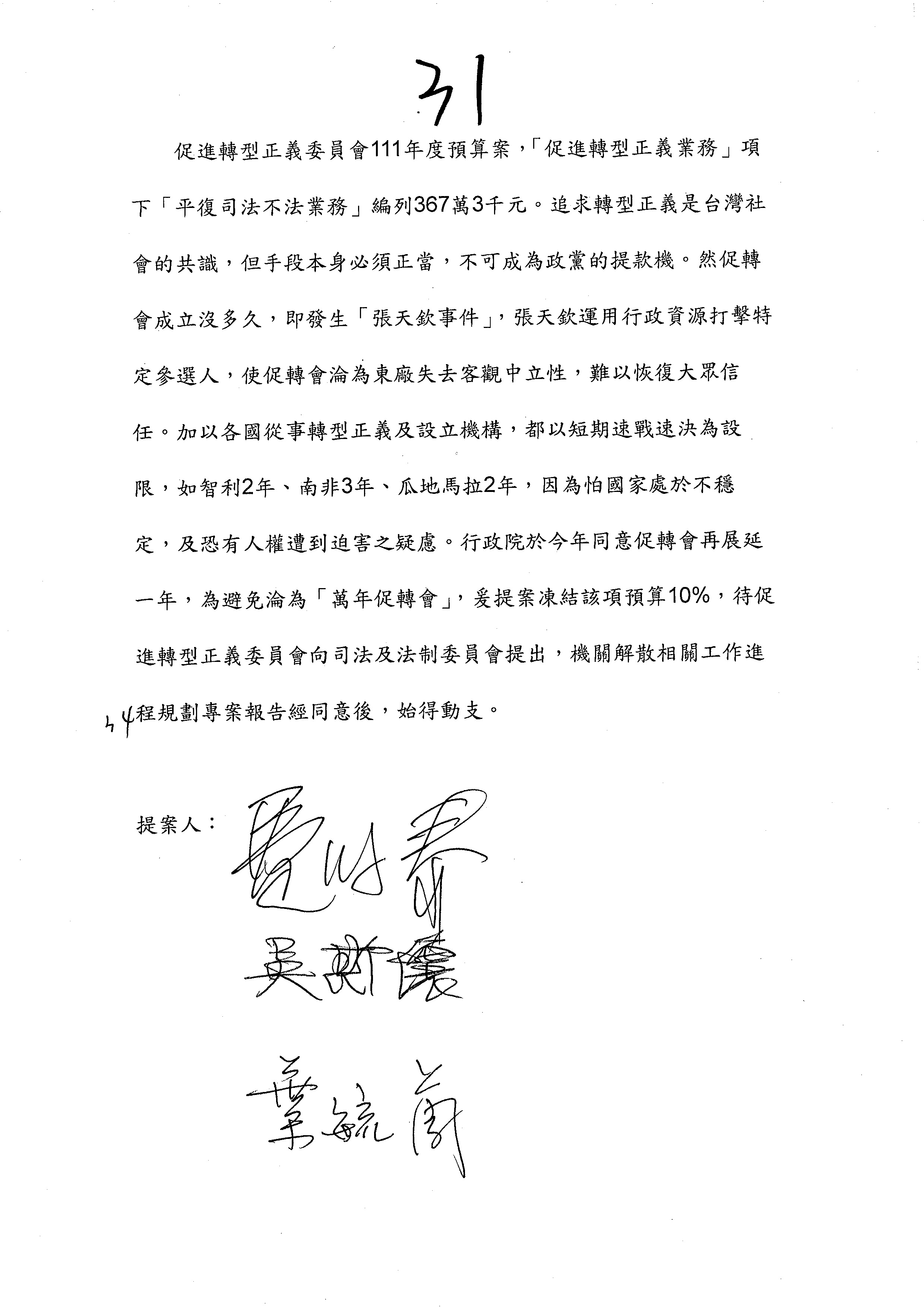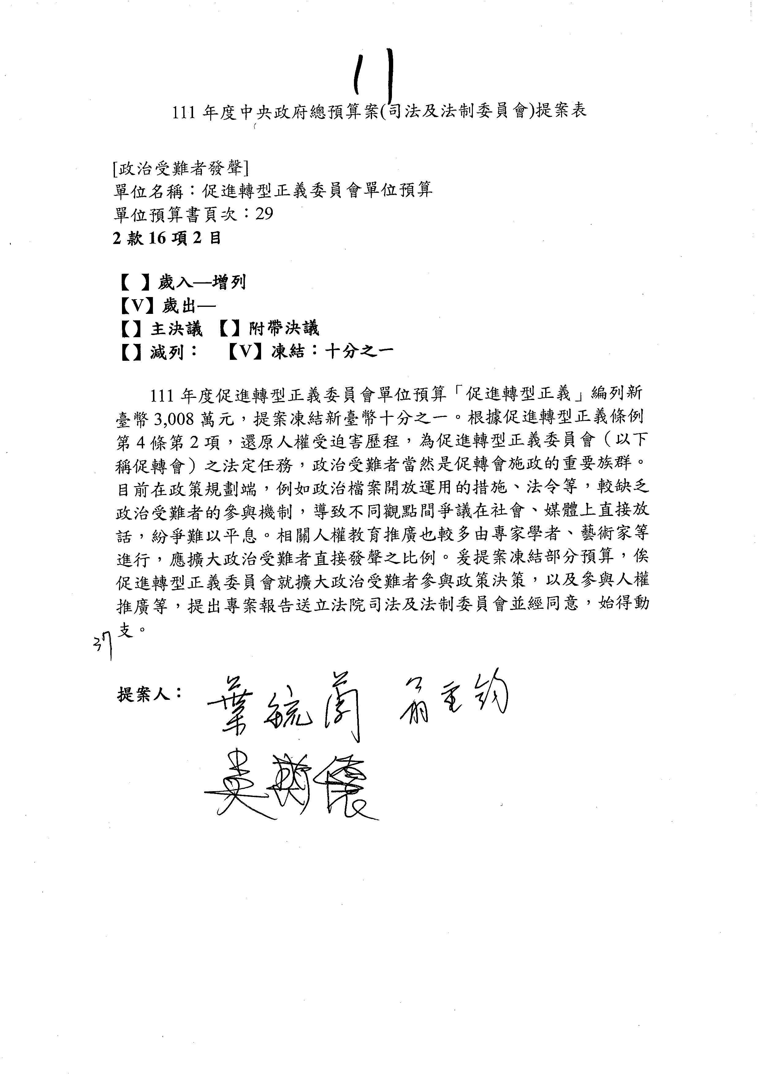 討論事項第一案:中華民國111年度中央政府總預算案關於促進轉型正義委員會主管收支部分審查完竣,提報院會,院會討論前須交黨團協商。