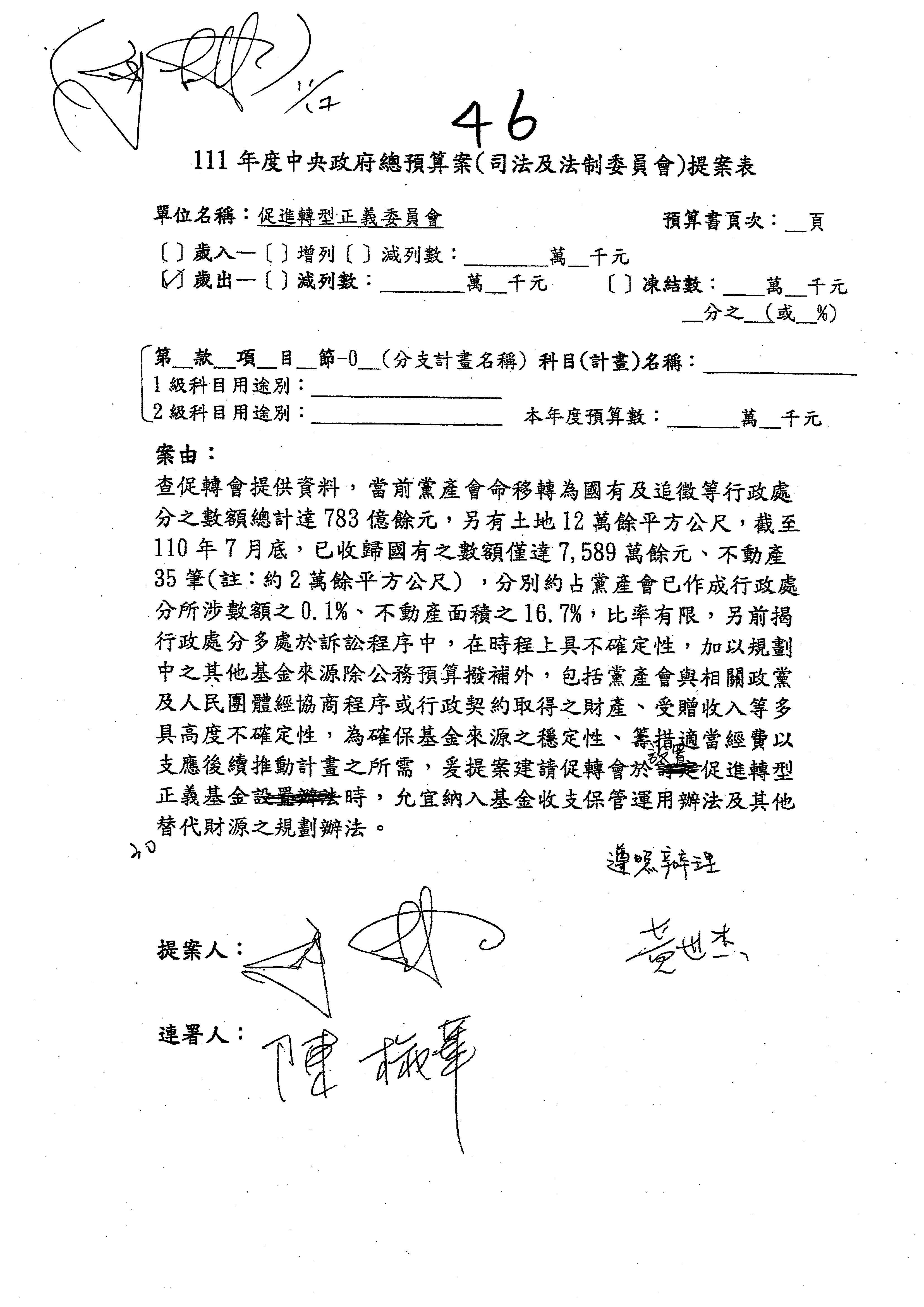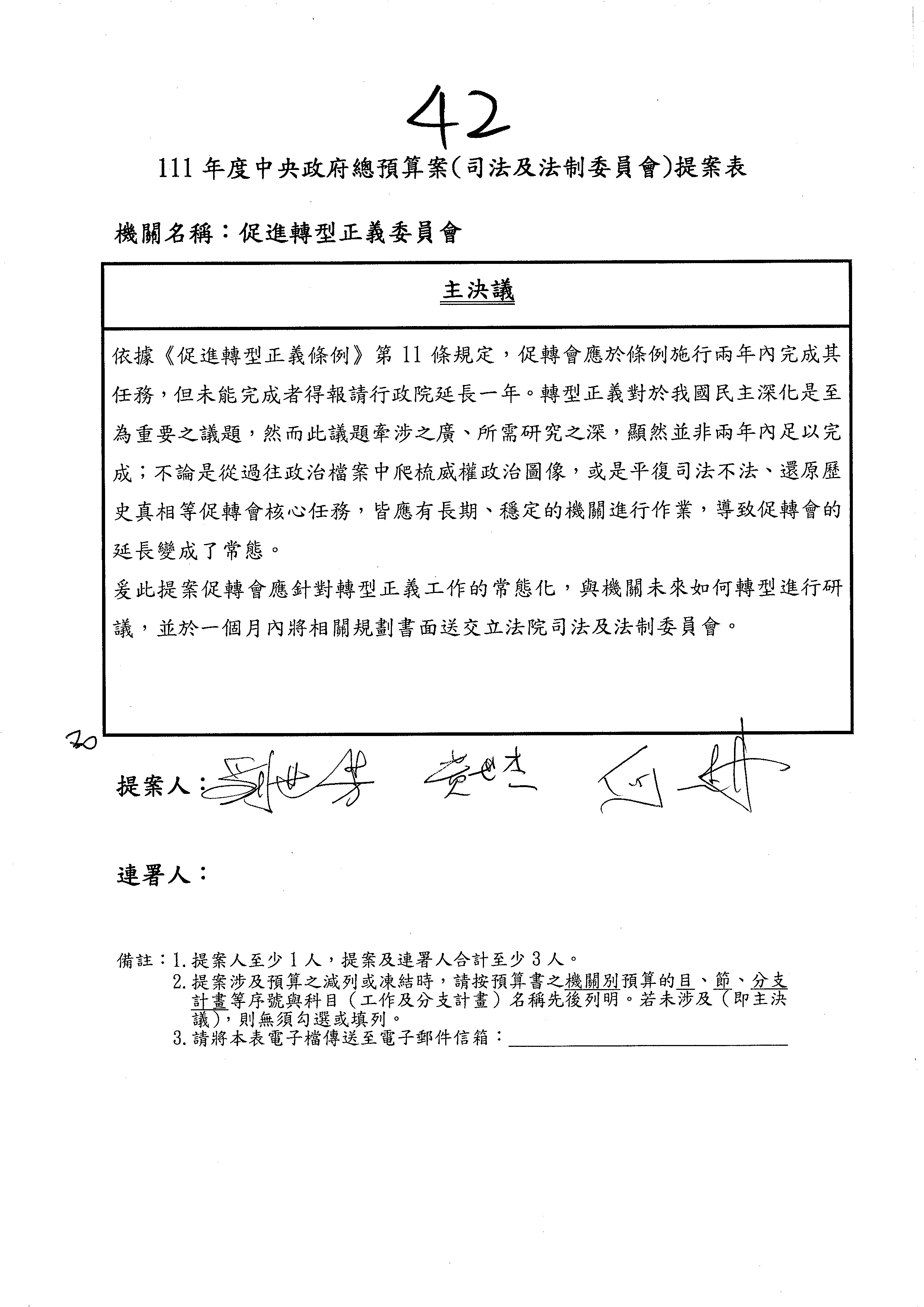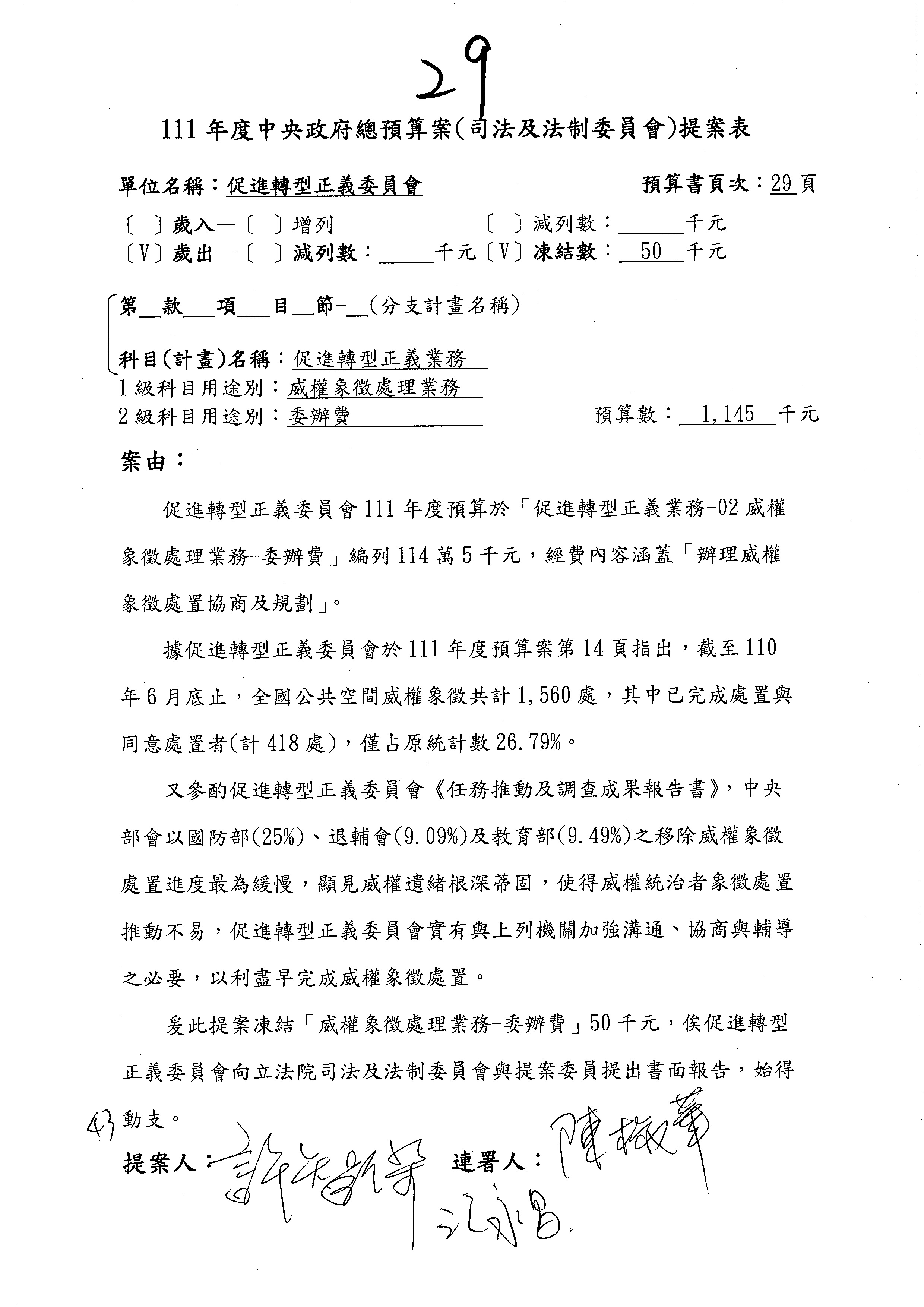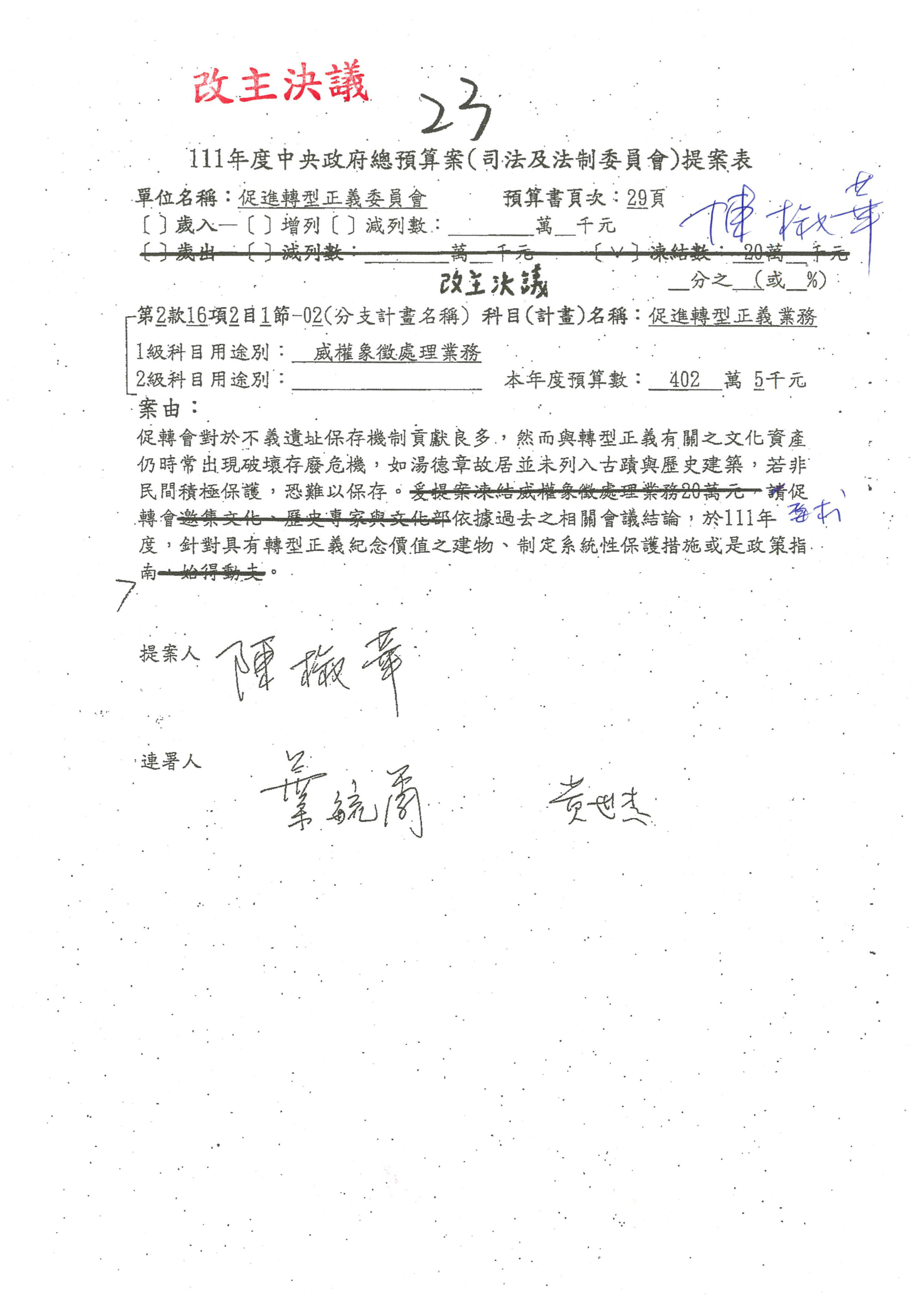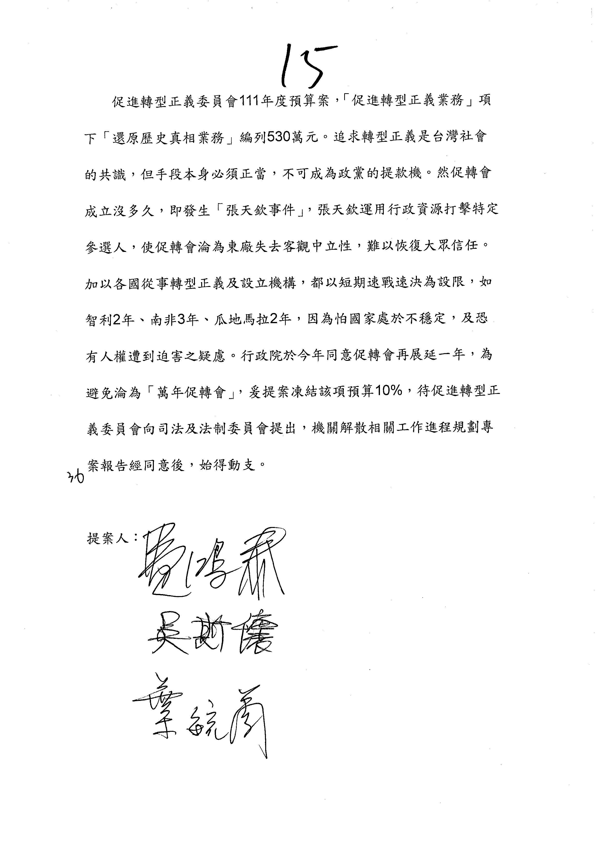 討論事項第一案:中華民國111年度中央政府總預算案關於促進轉型正義委員會主管收支部分審查完竣,提報院會,院會討論前須交黨團協商。