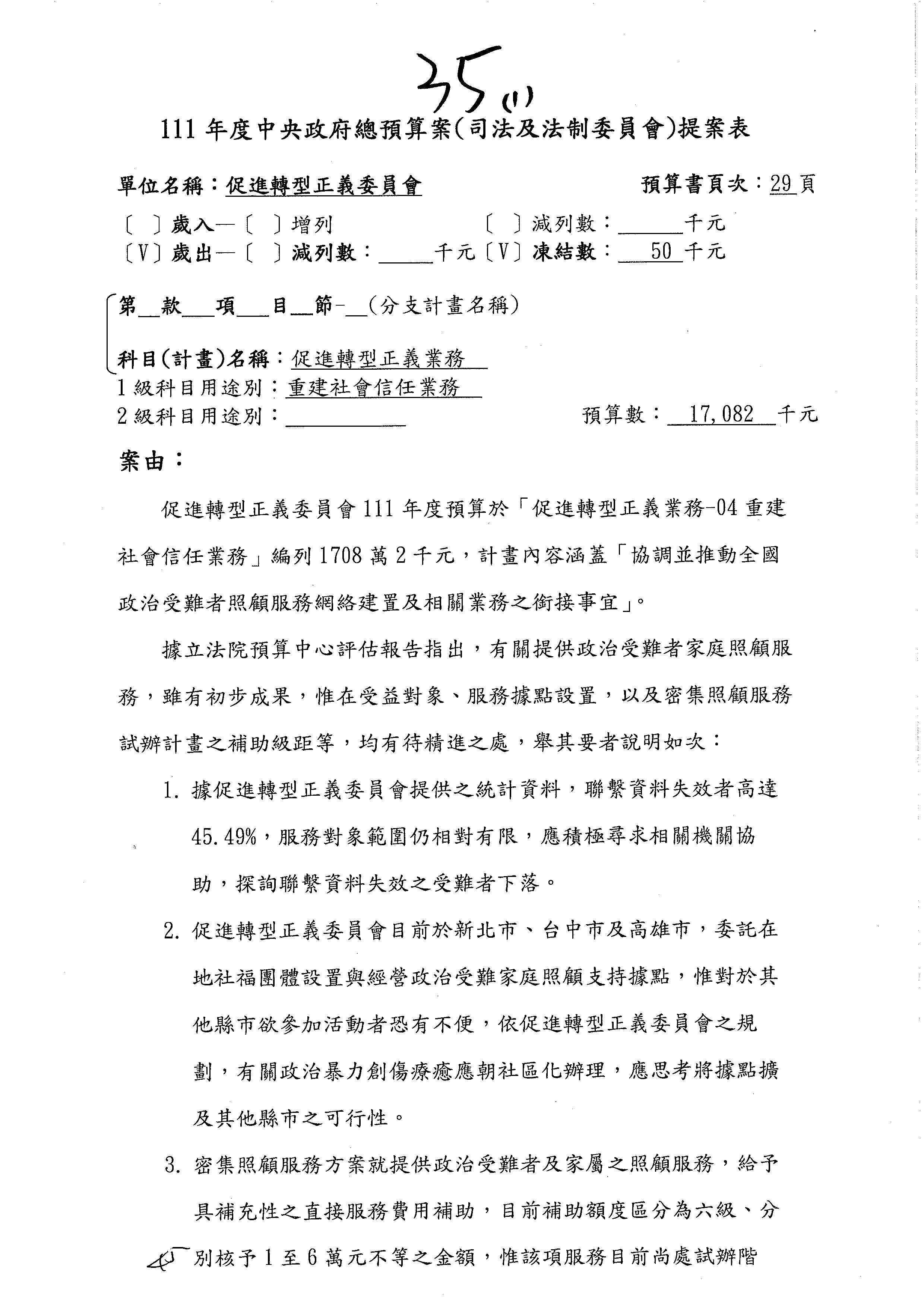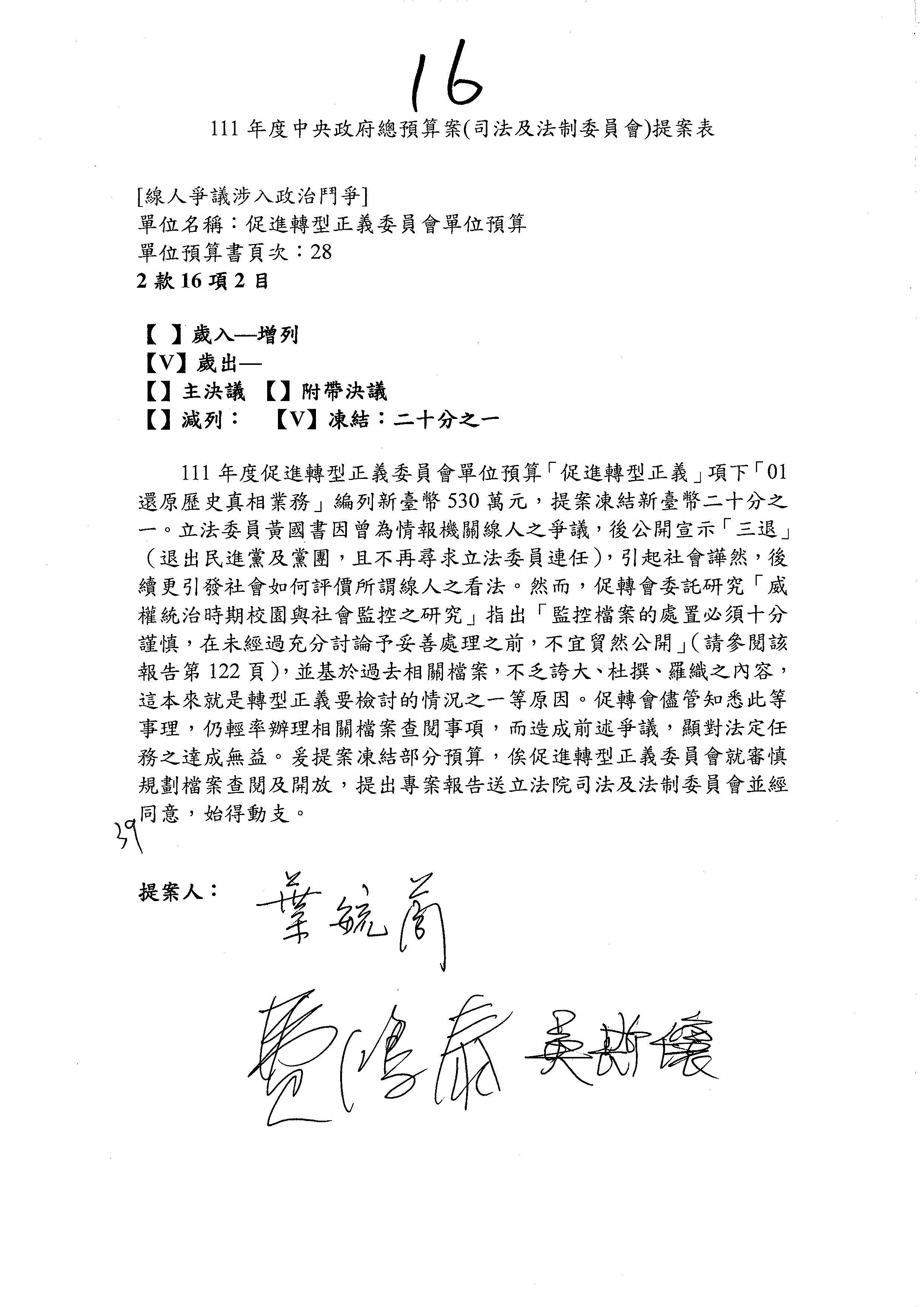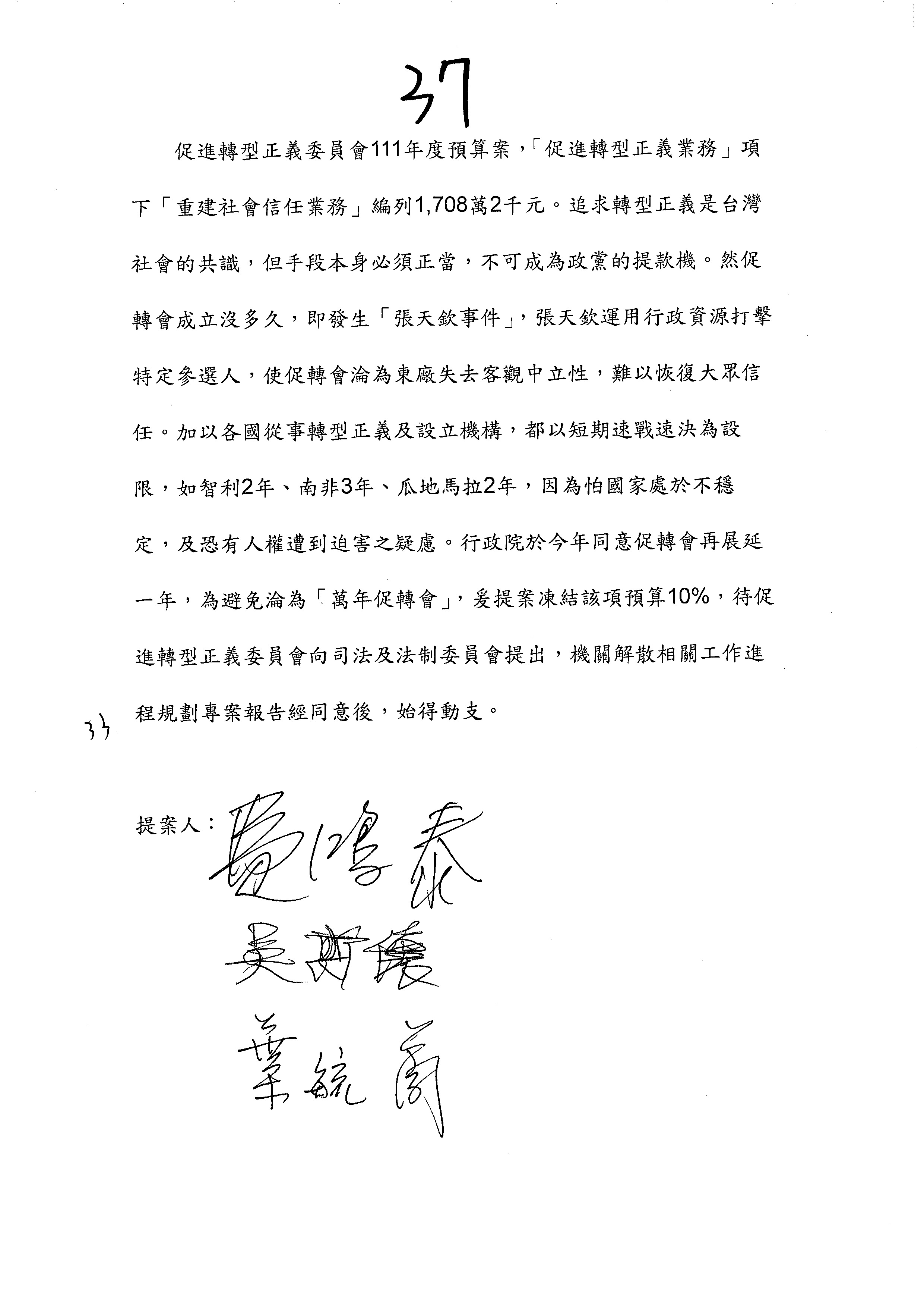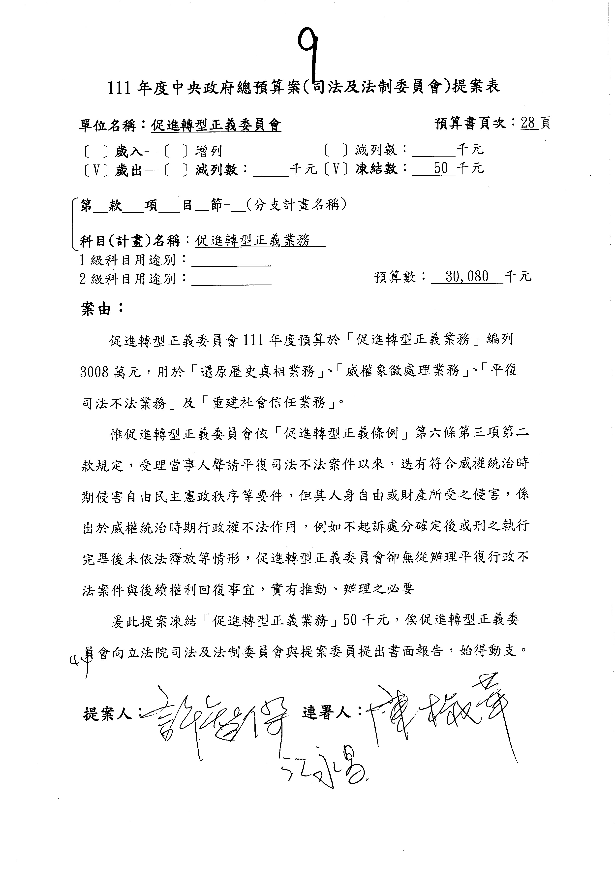 討論事項第一案:中華民國111年度中央政府總預算案關於促進轉型正義委員會主管收支部分審查完竣,提報院會,院會討論前須交黨團協商。