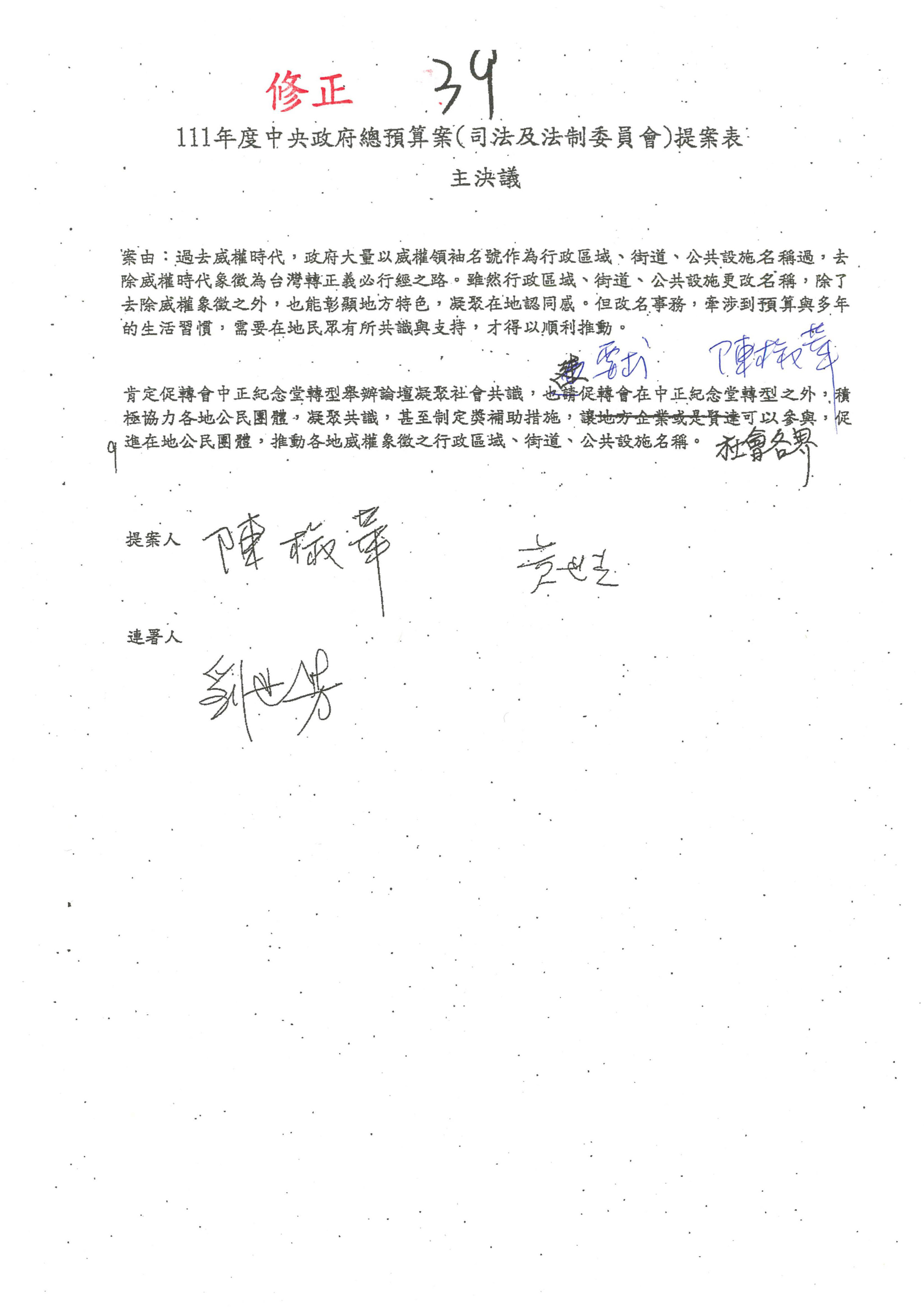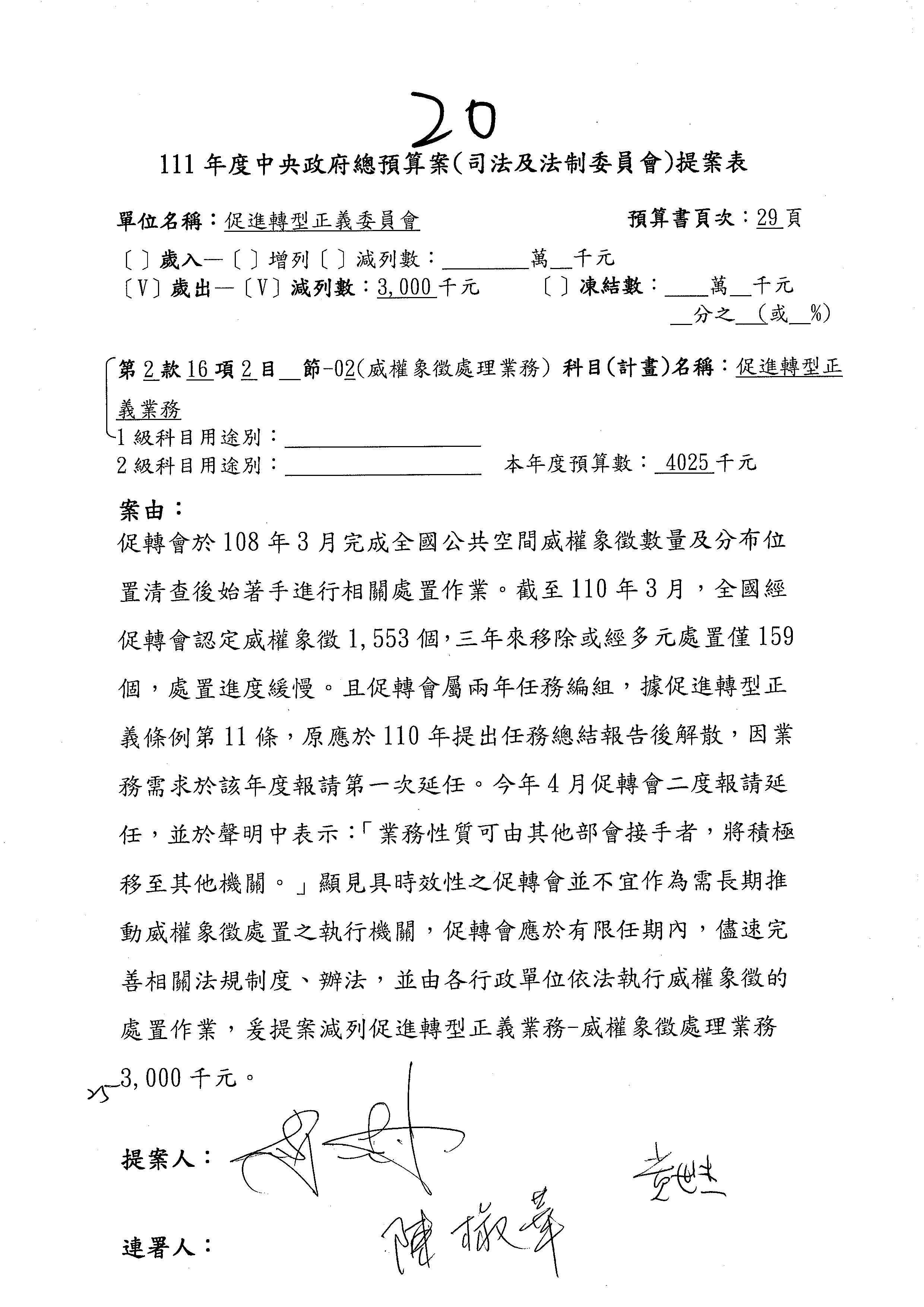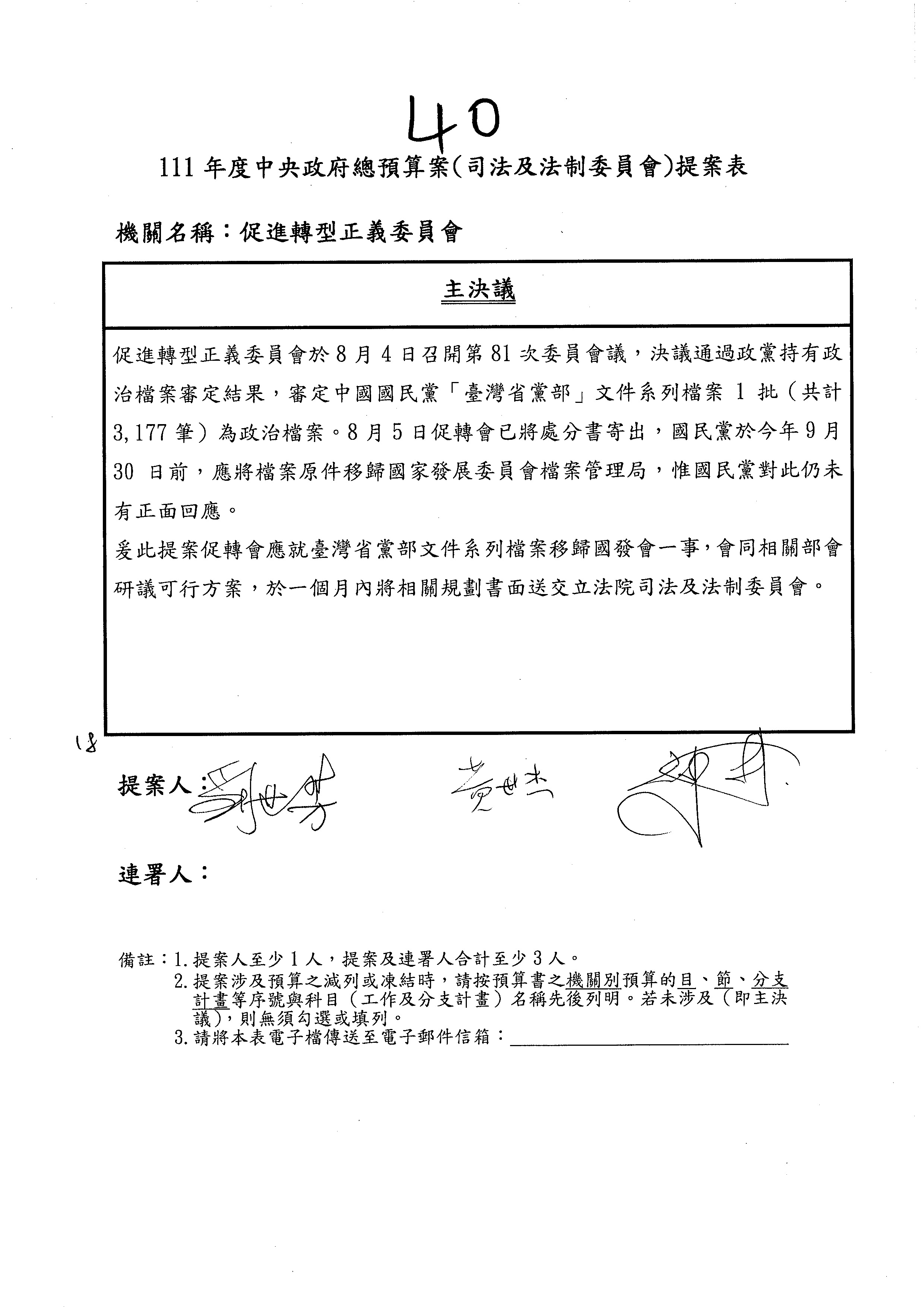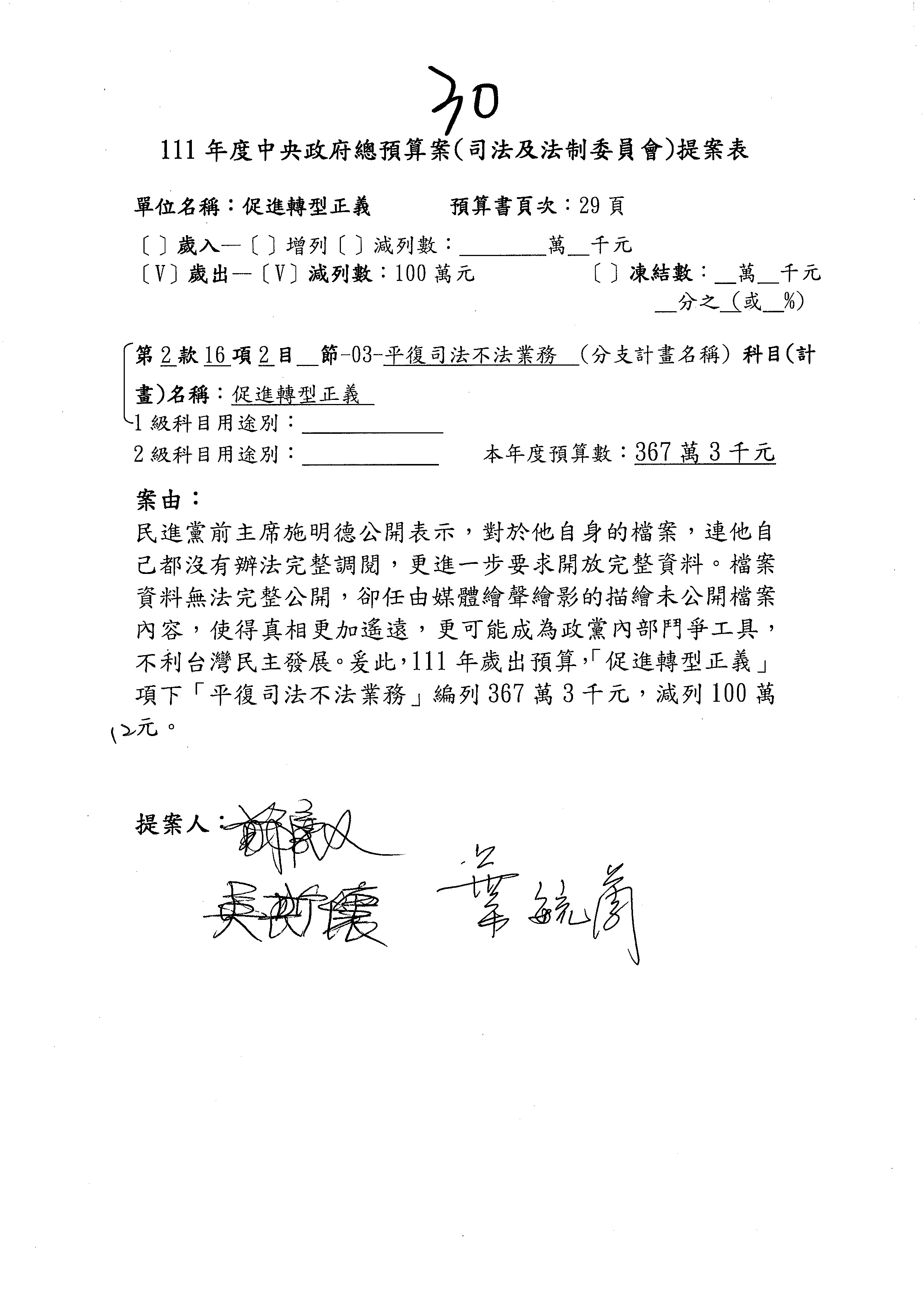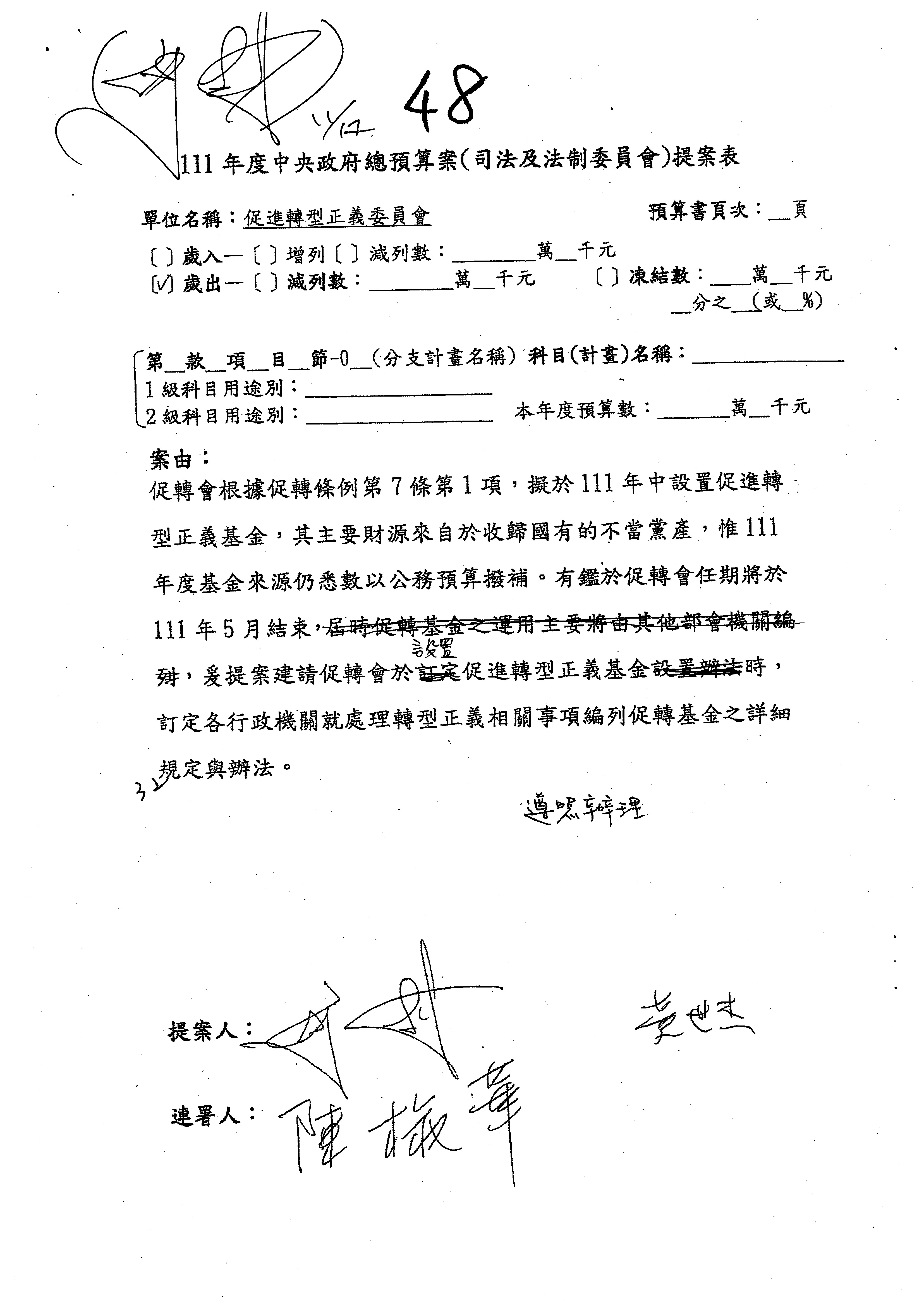 討論事項第一案:中華民國111年度中央政府總預算案關於促進轉型正義委員會主管收支部分審查完竣,提報院會,院會討論前須交黨團協商。