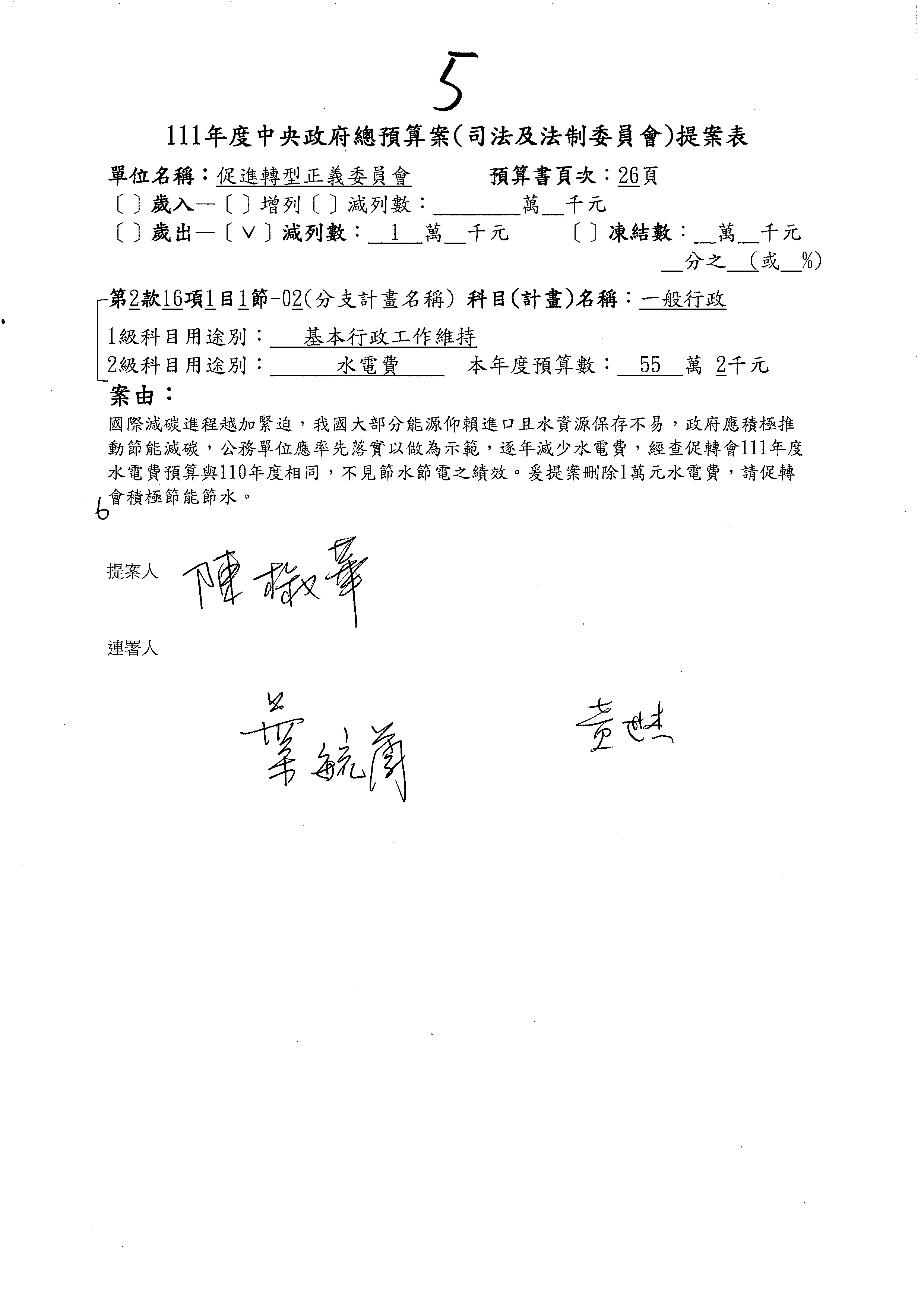陳委員椒華:謝謝主席。促轉會有支持我的第5案,希望後續在省水節電方面能具體落實,看看可不可以減更多,也希望未來的水電單能每季提送給我,謝謝。