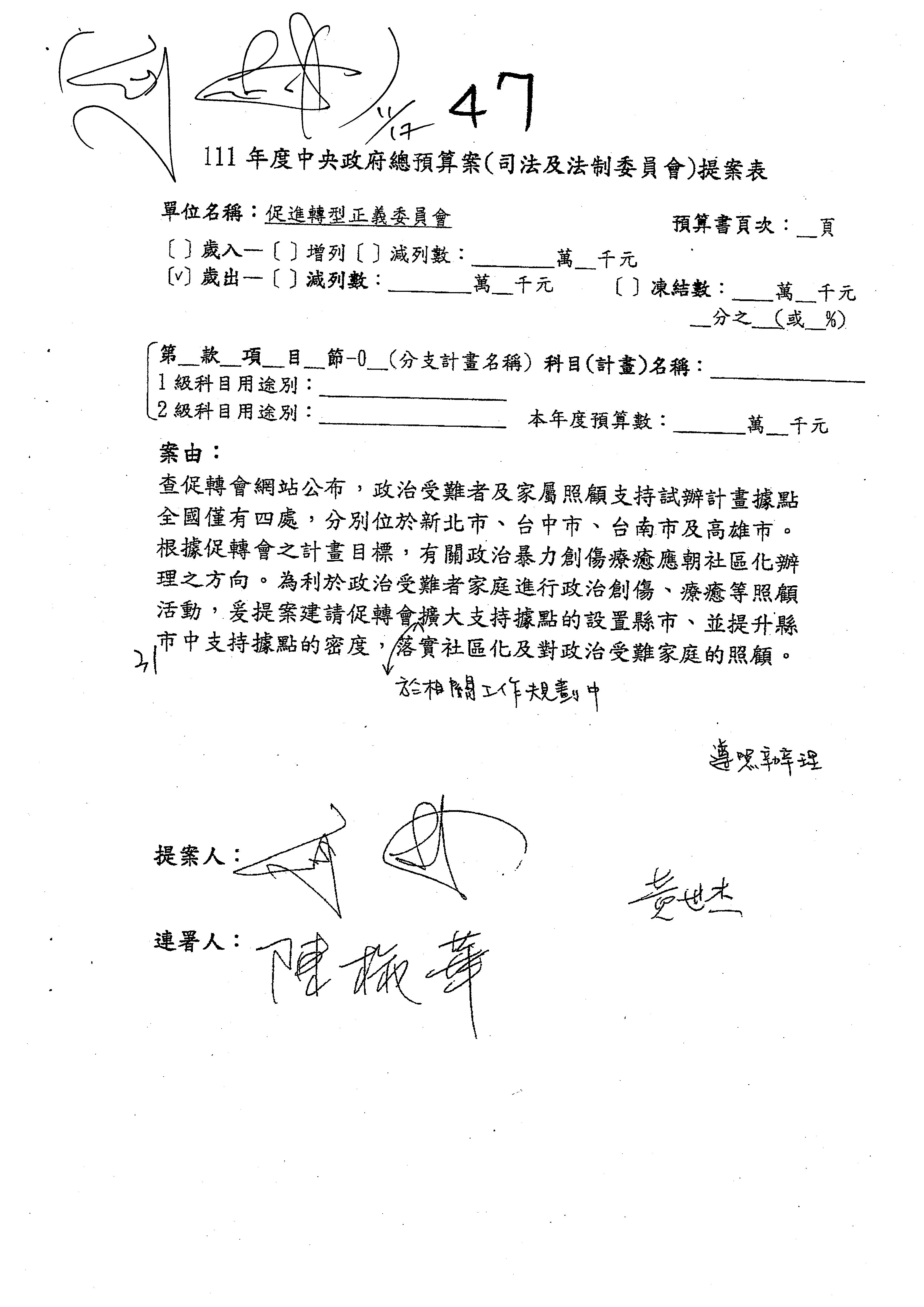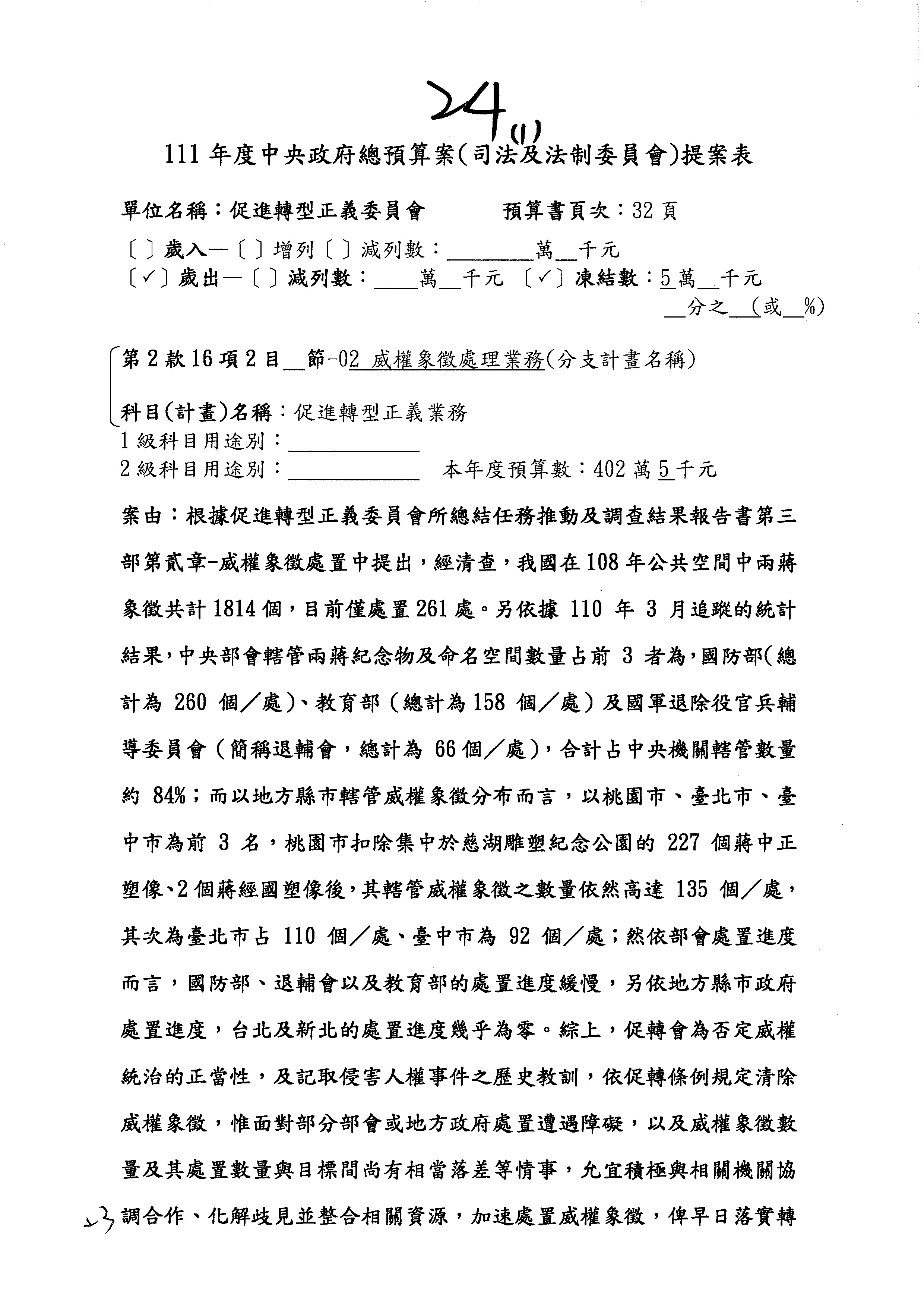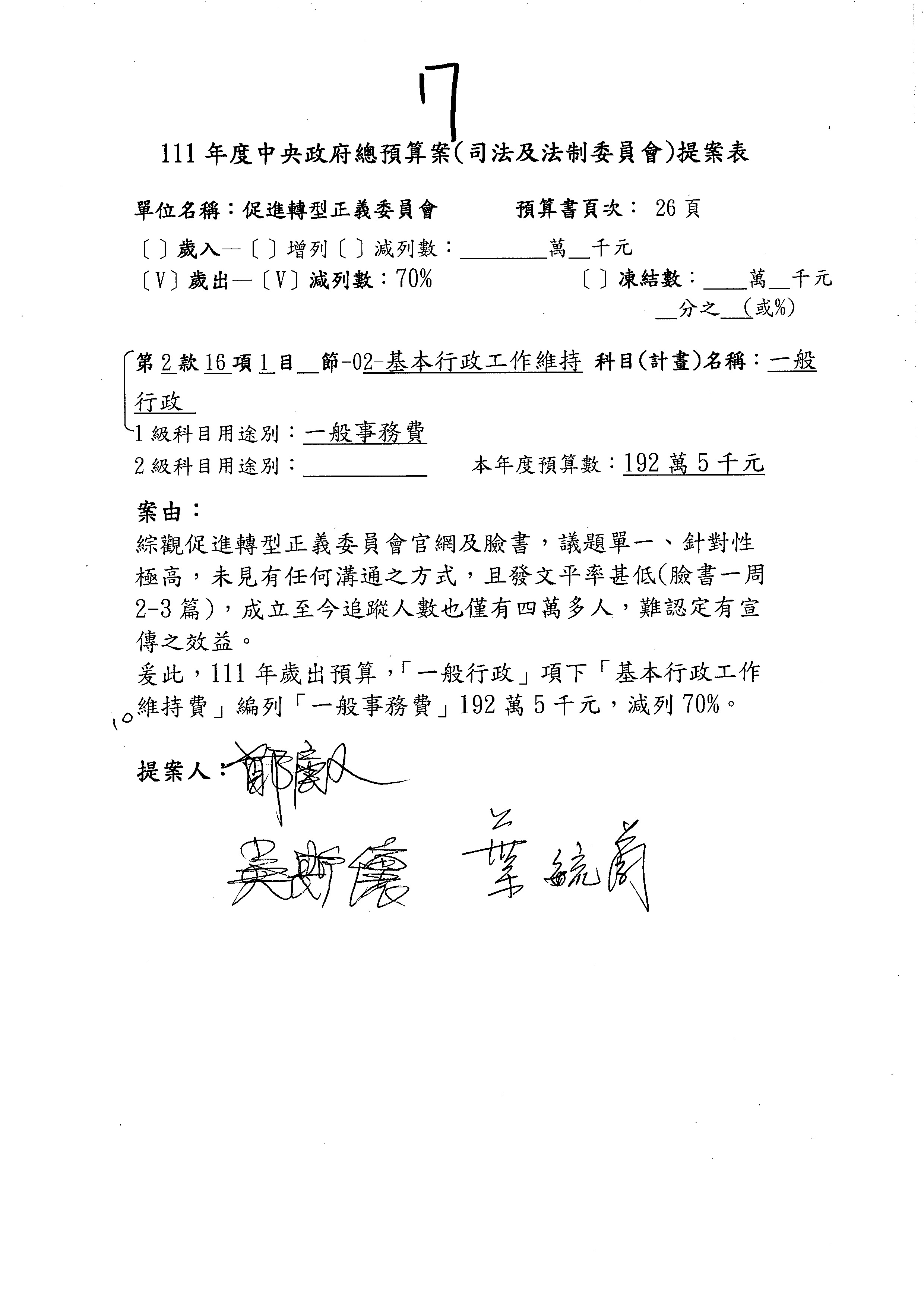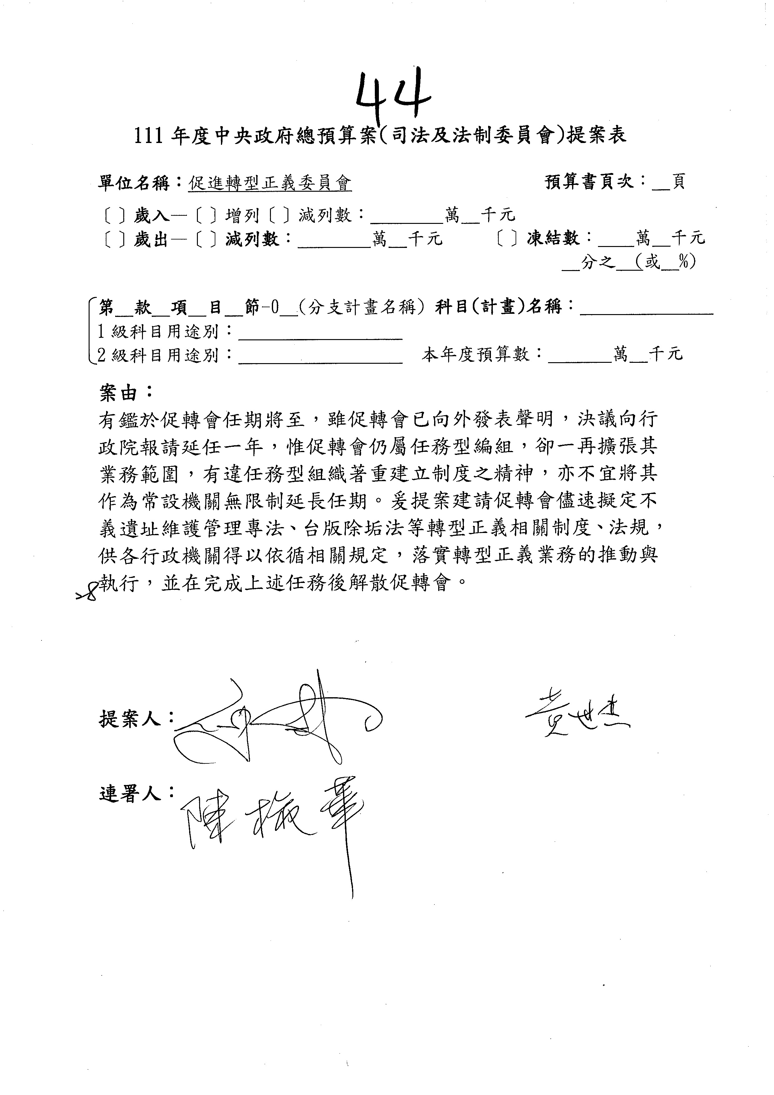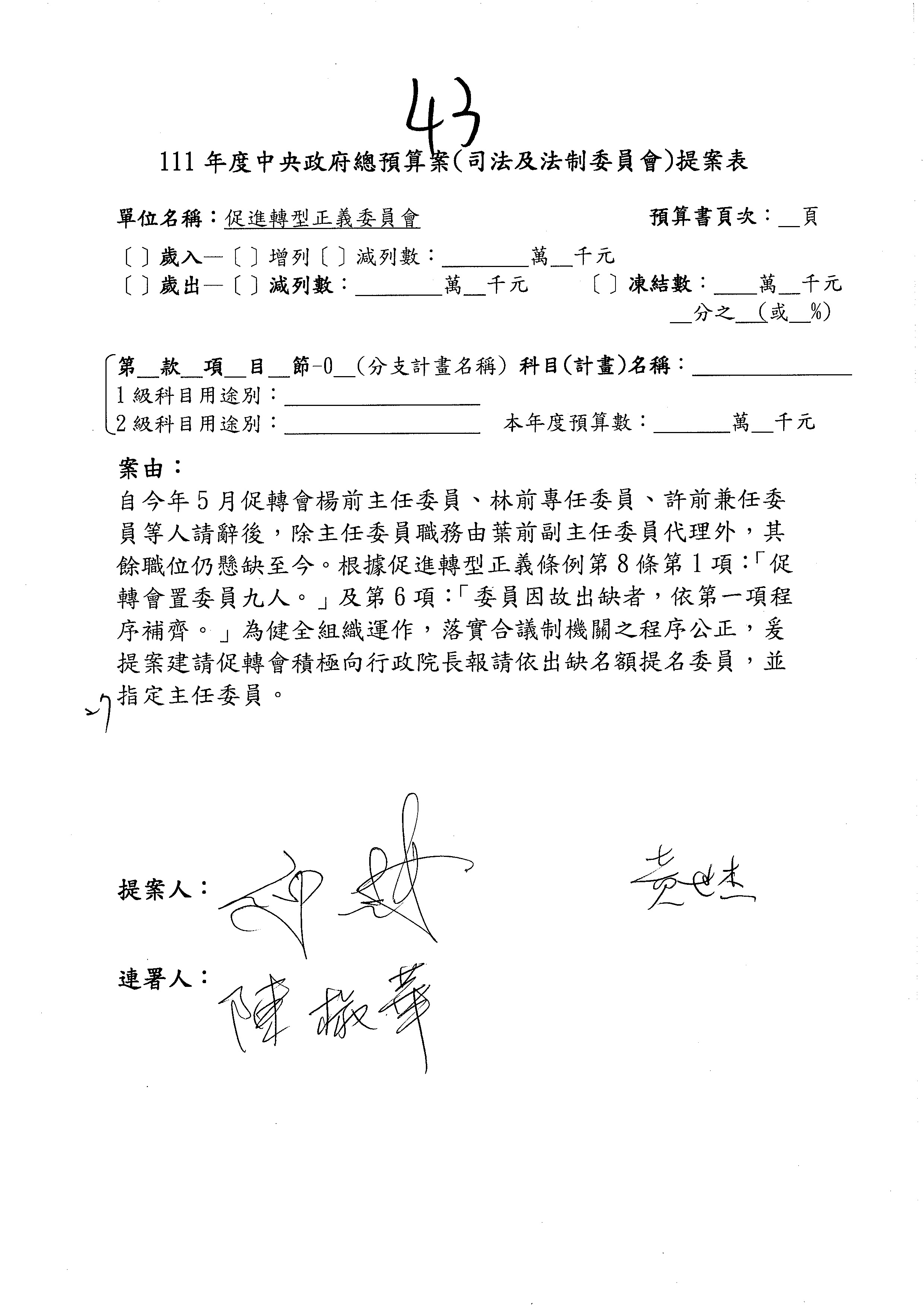 剛才已經宣讀完預算數及委員提案,我們現在開始進行預算審查。現在進行討論事項第一案,審查111年度中央政府總預算案關於促進轉型正義委員會主管收支部分。