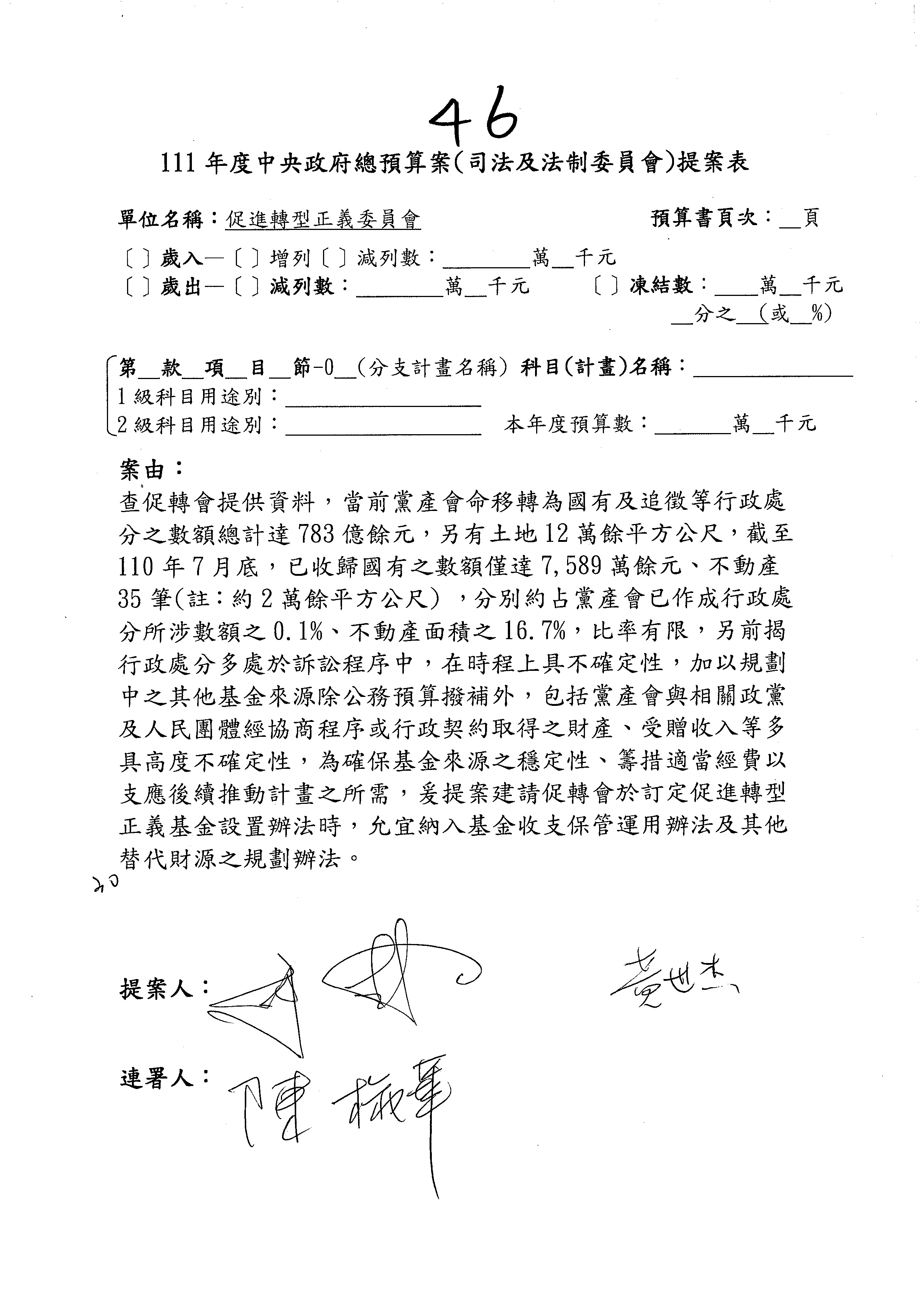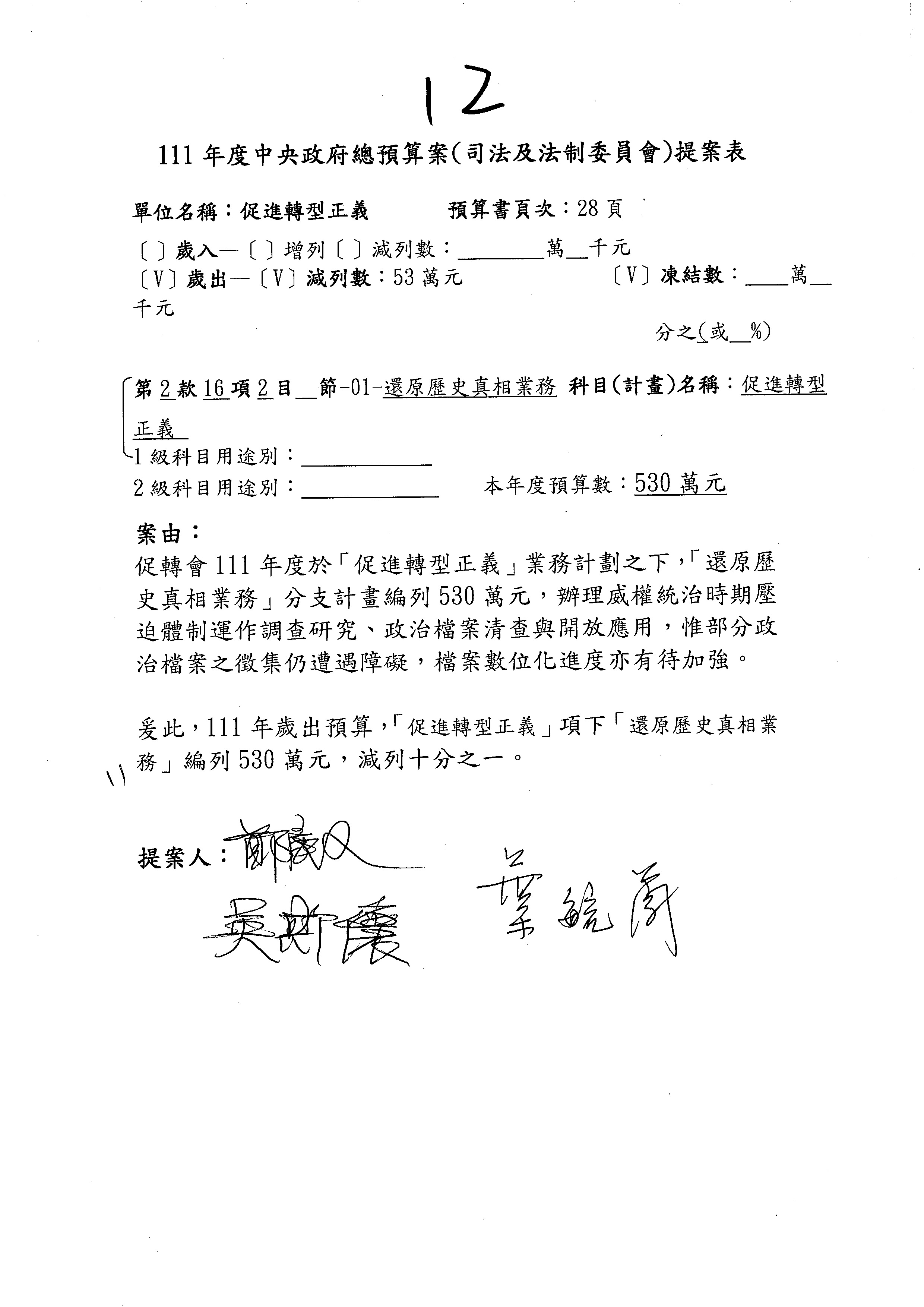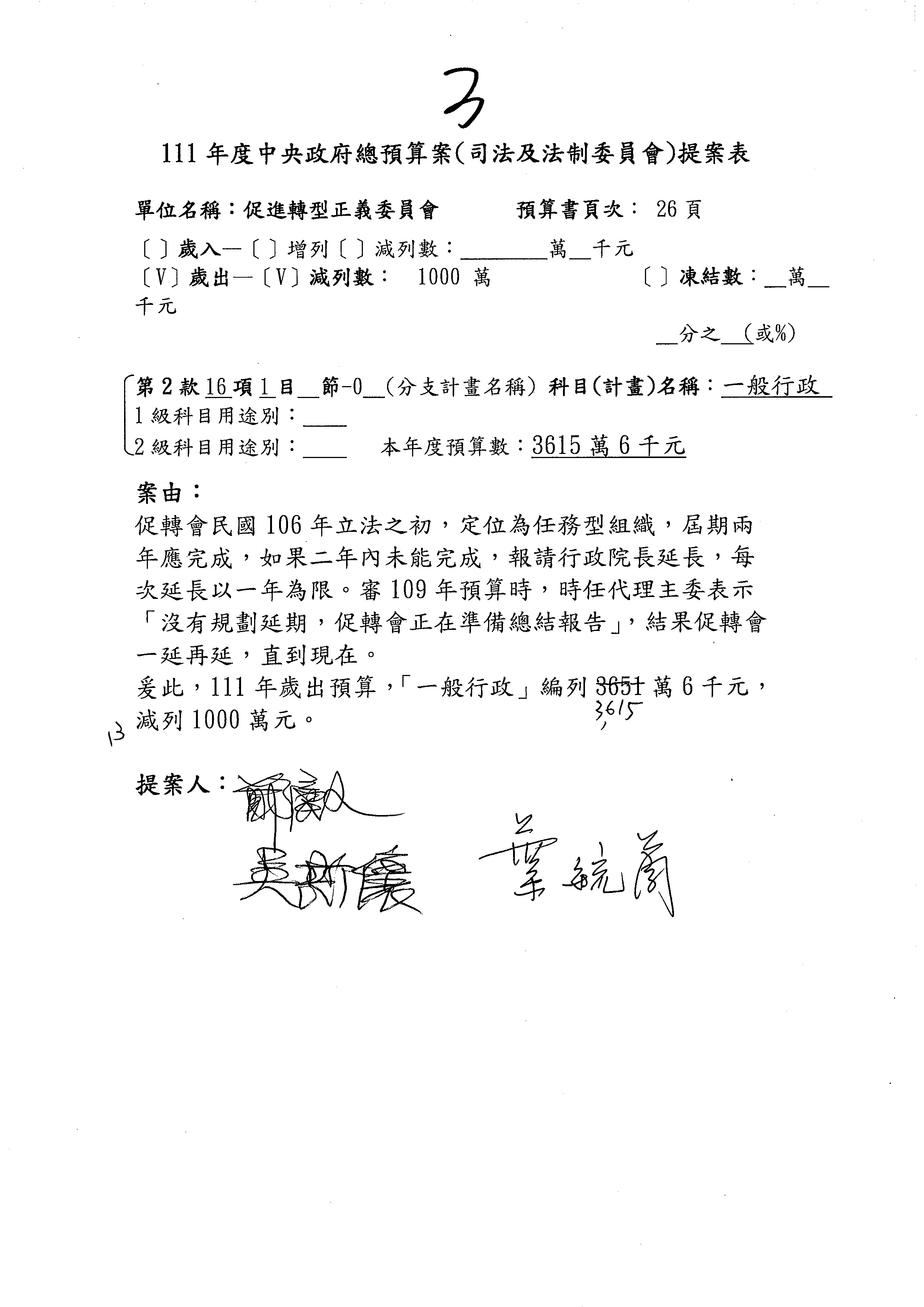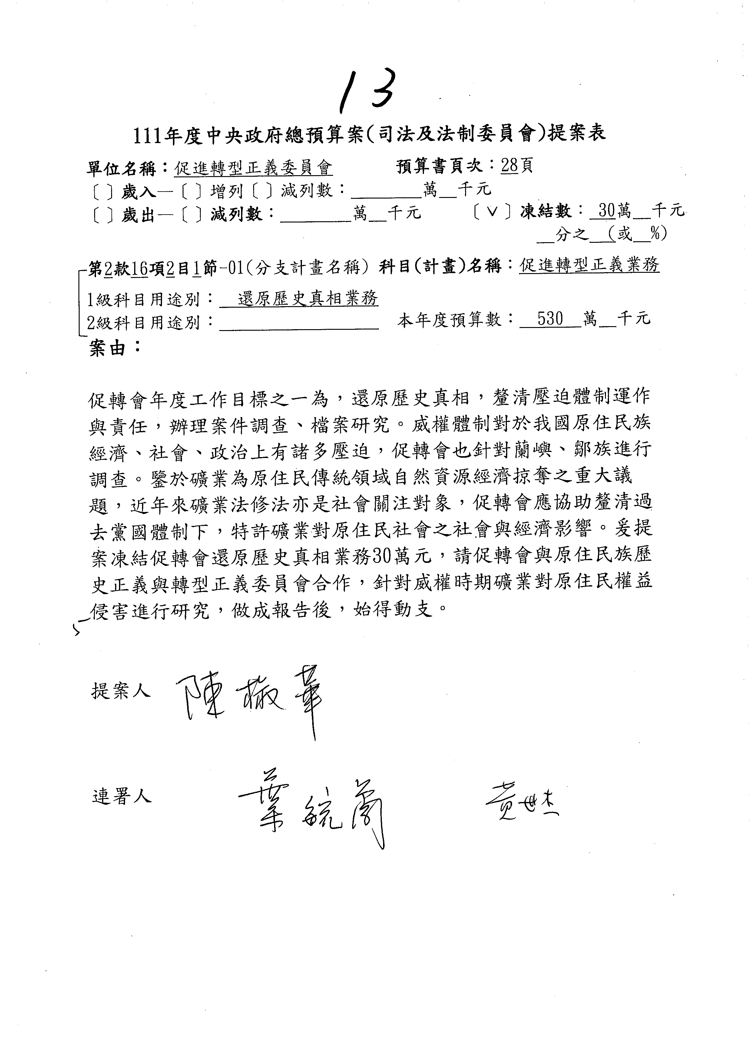 剛才已經宣讀完預算數及委員提案,我們現在開始進行預算審查。現在進行討論事項第一案,審查111年度中央政府總預算案關於促進轉型正義委員會主管收支部分。