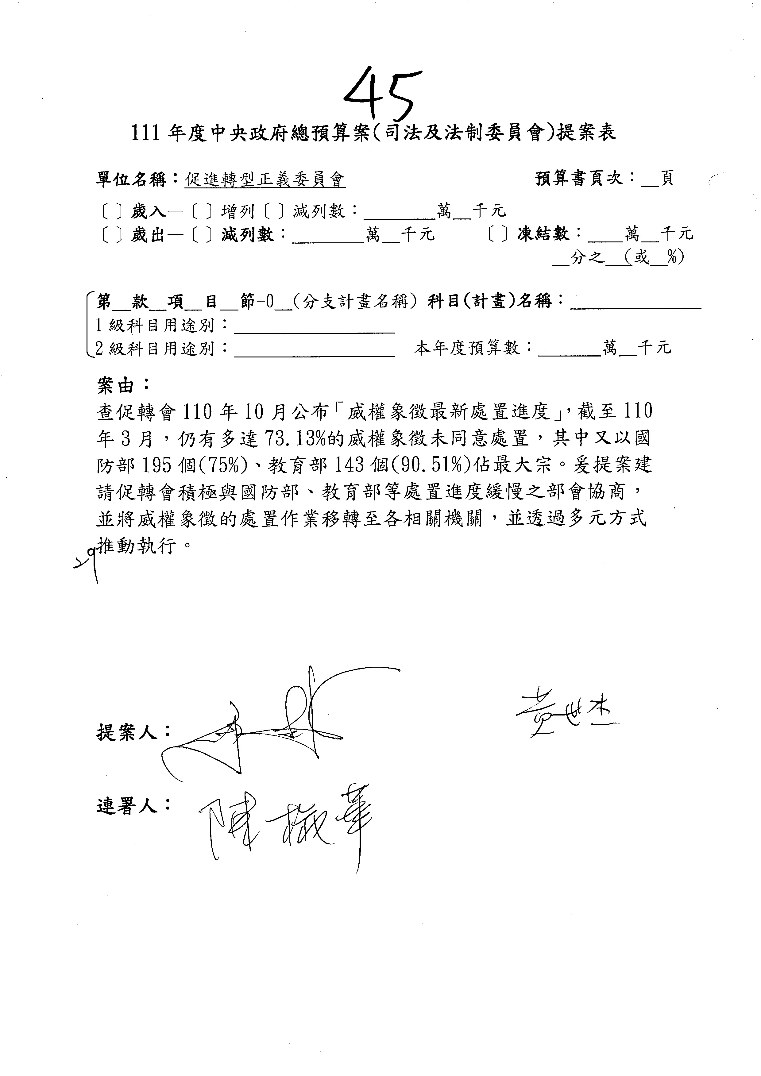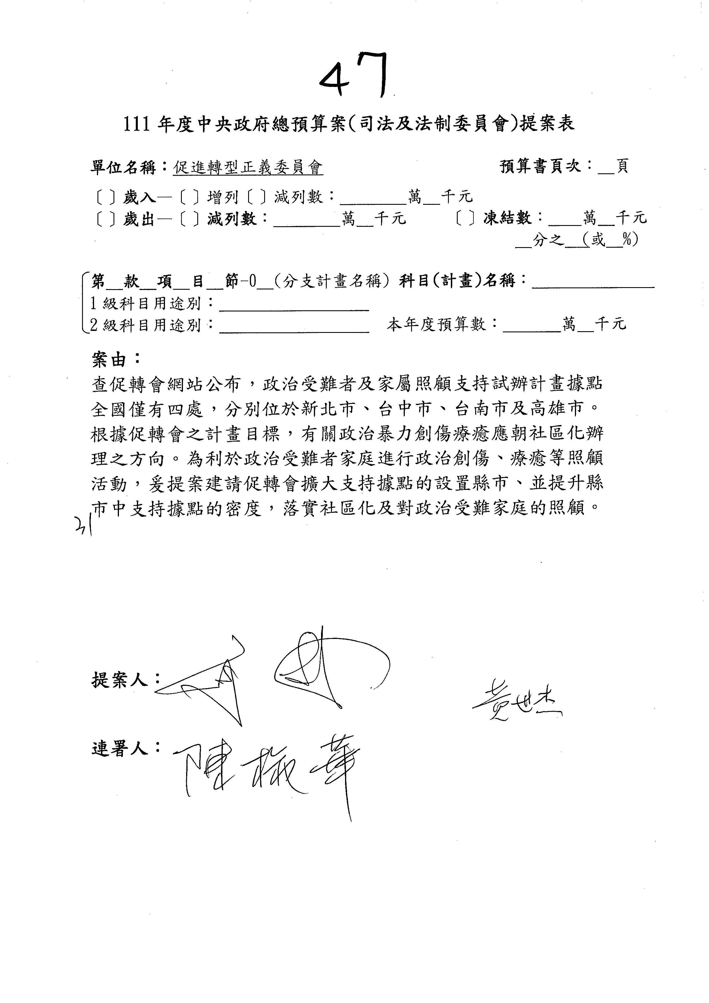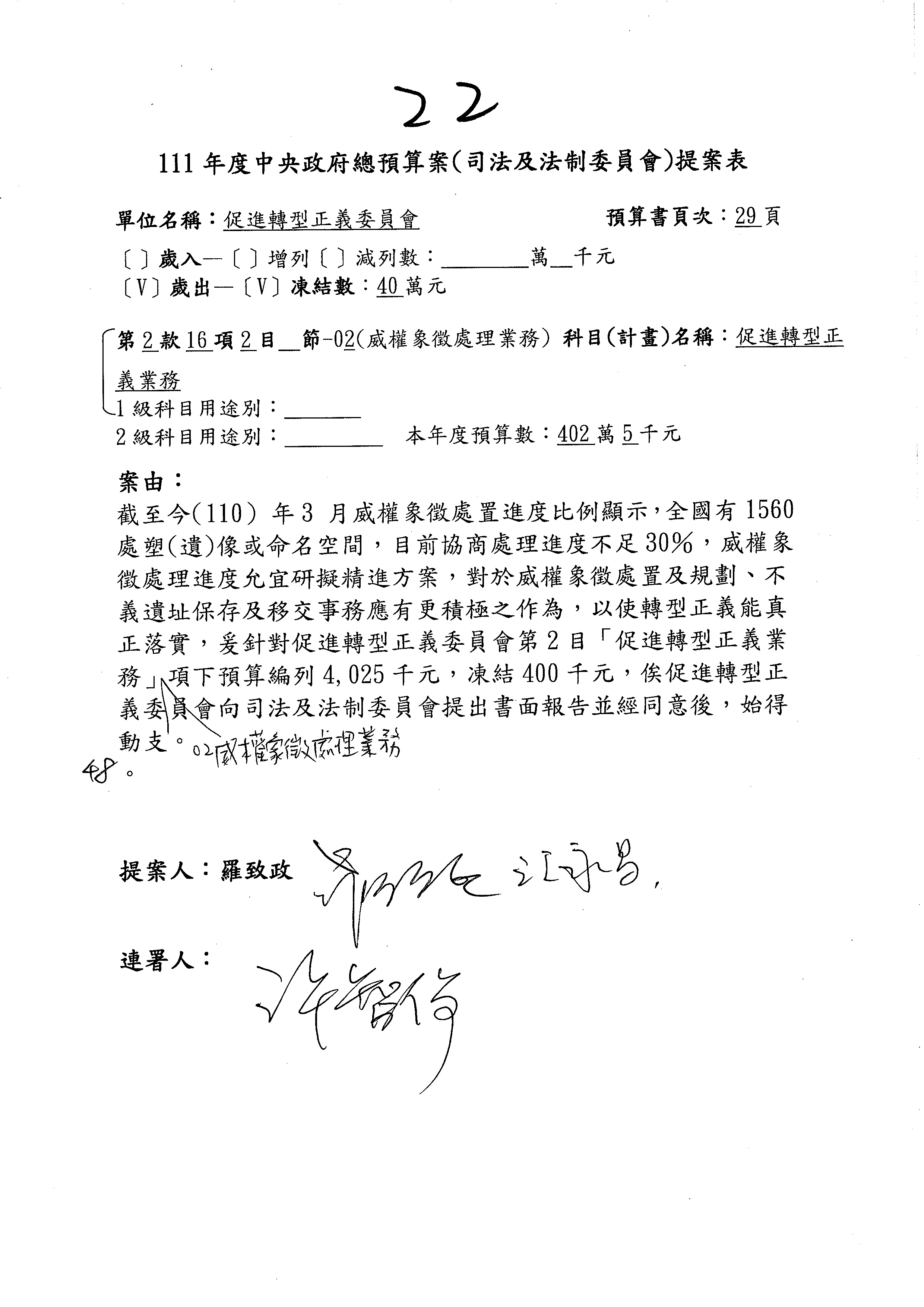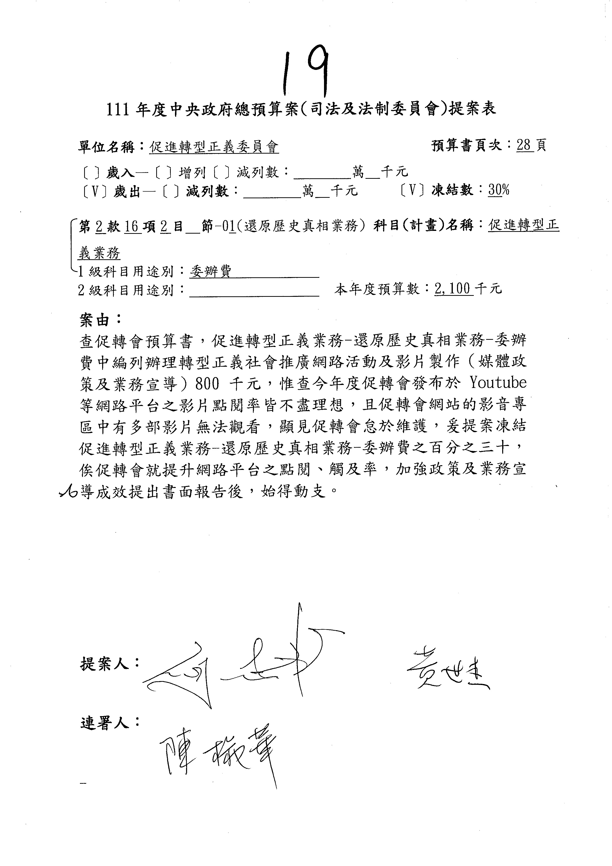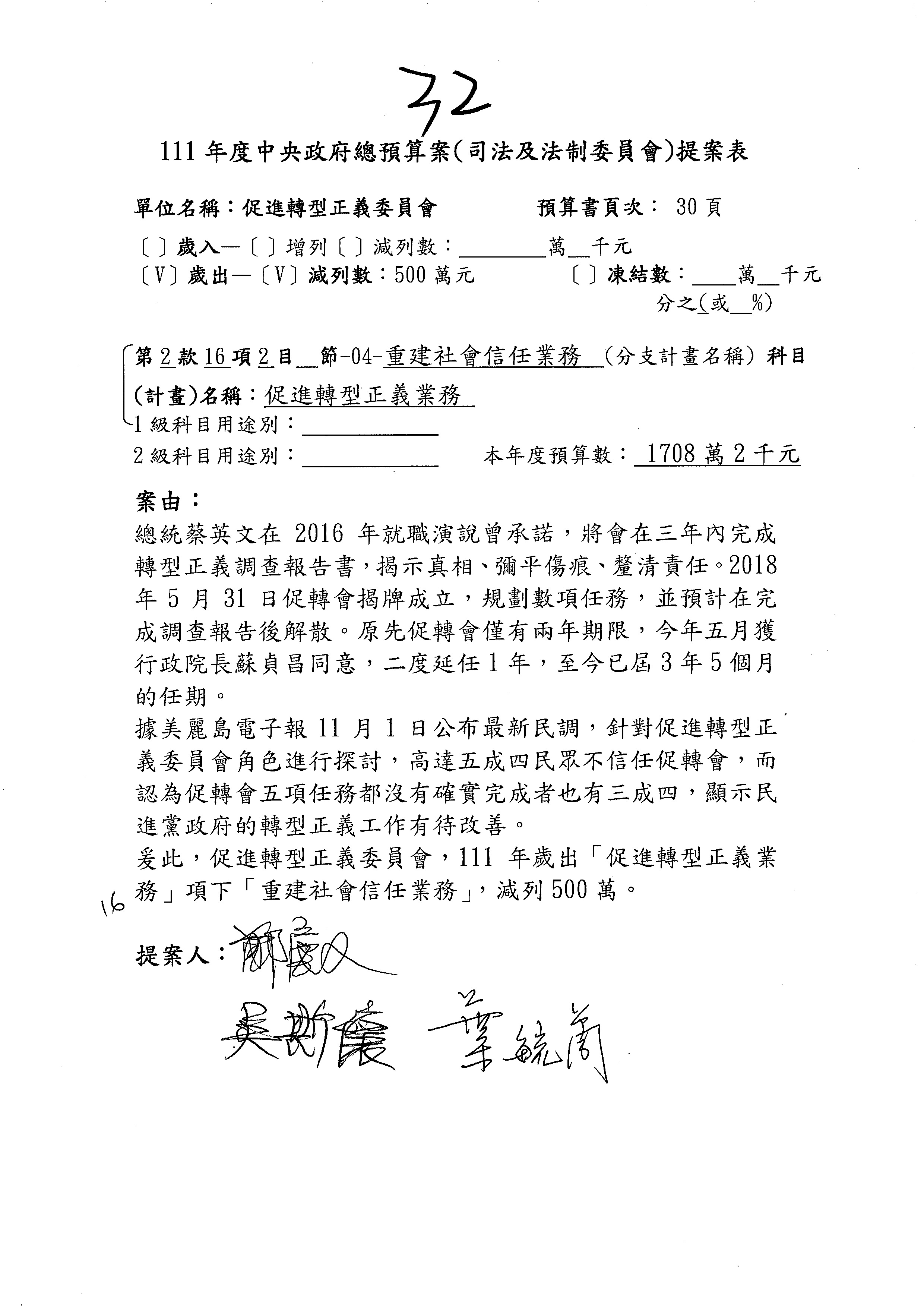 剛才已經宣讀完預算數及委員提案,我們現在開始進行預算審查。現在進行討論事項第一案,審查111年度中央政府總預算案關於促進轉型正義委員會主管收支部分。