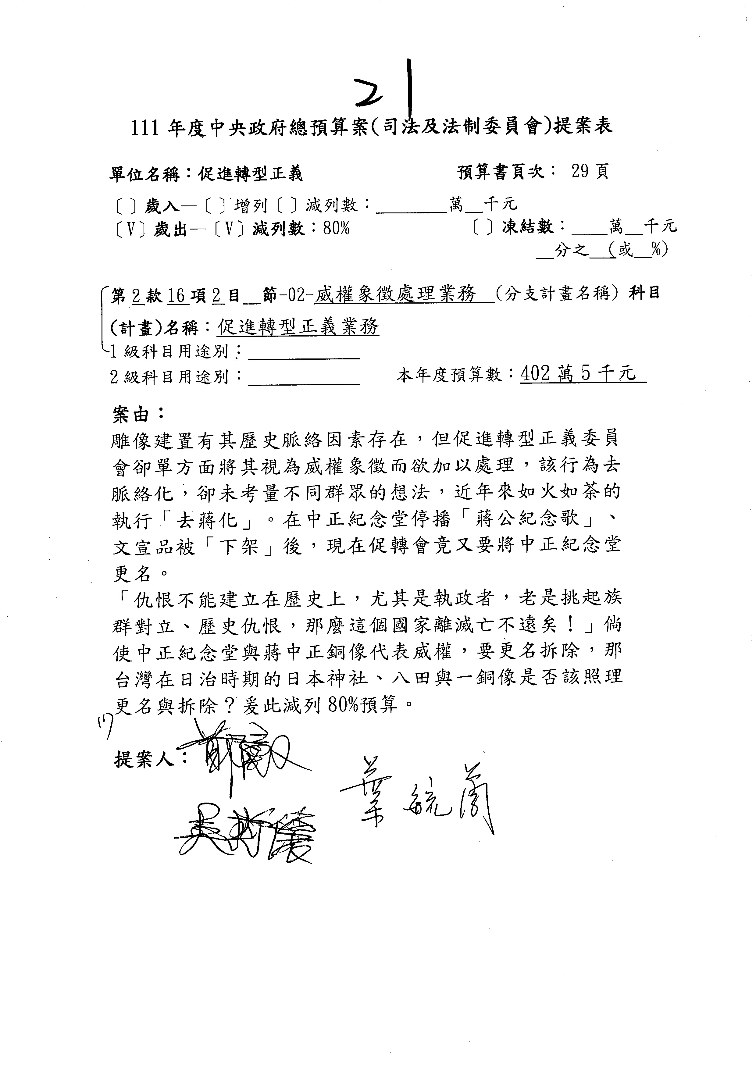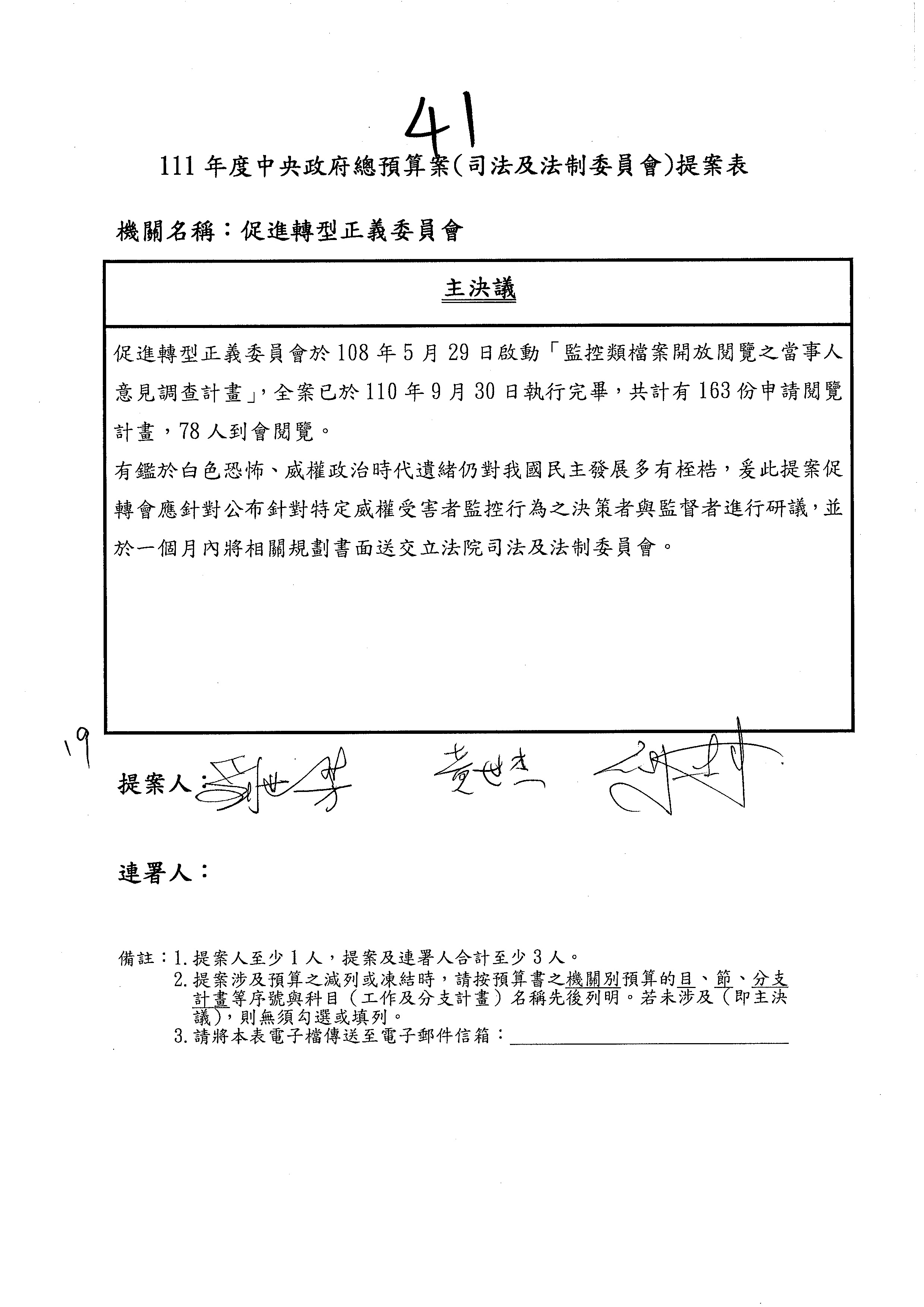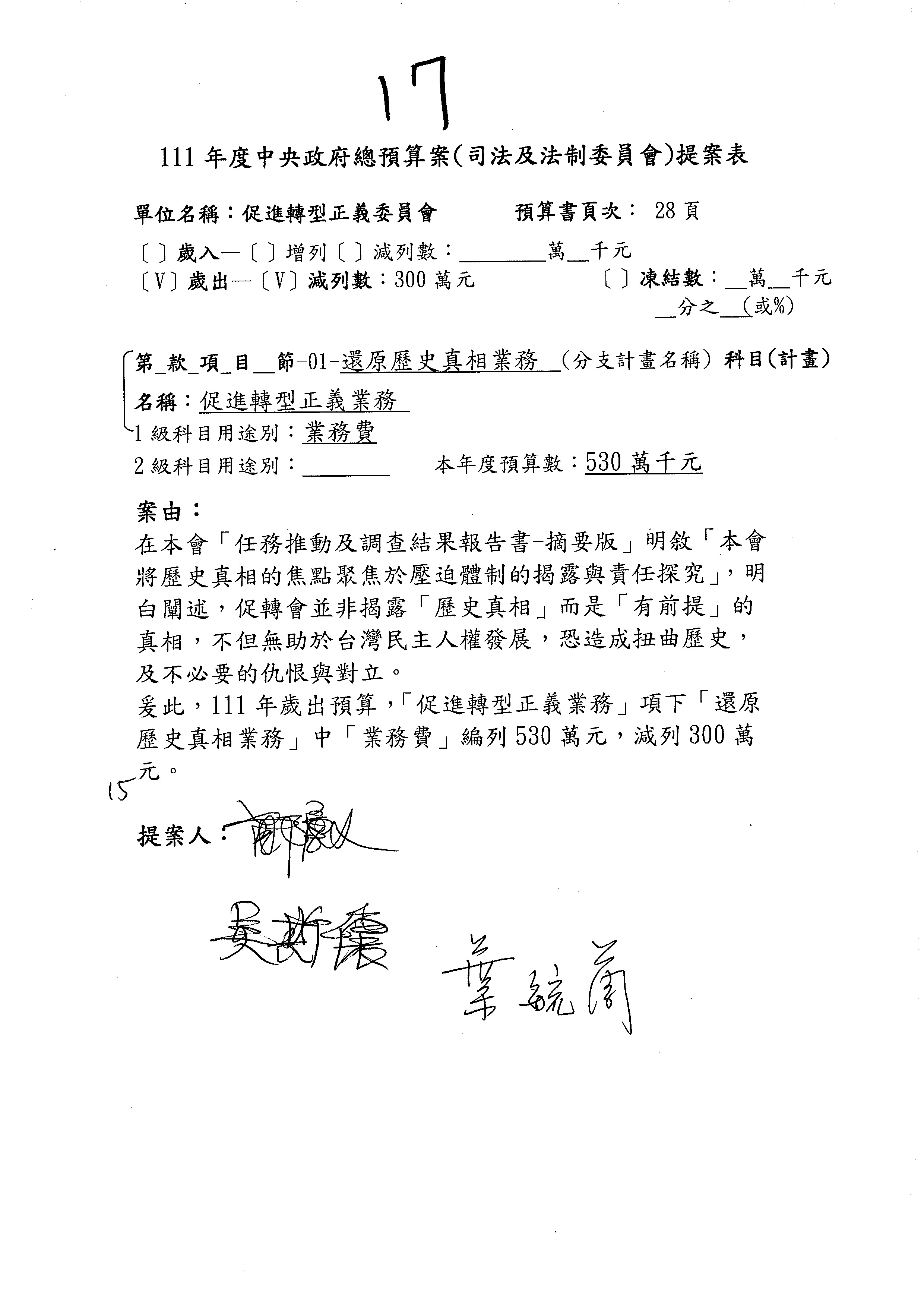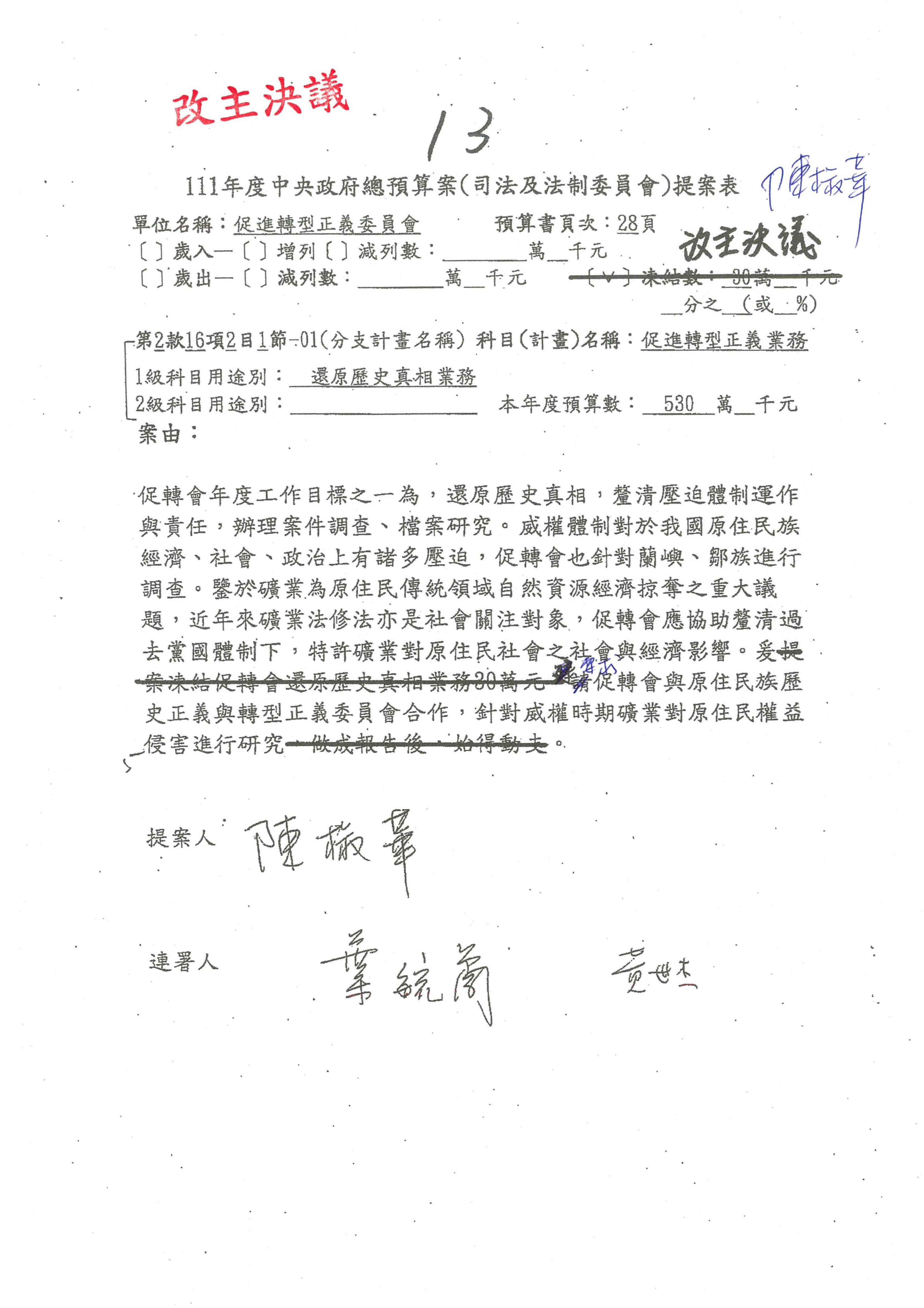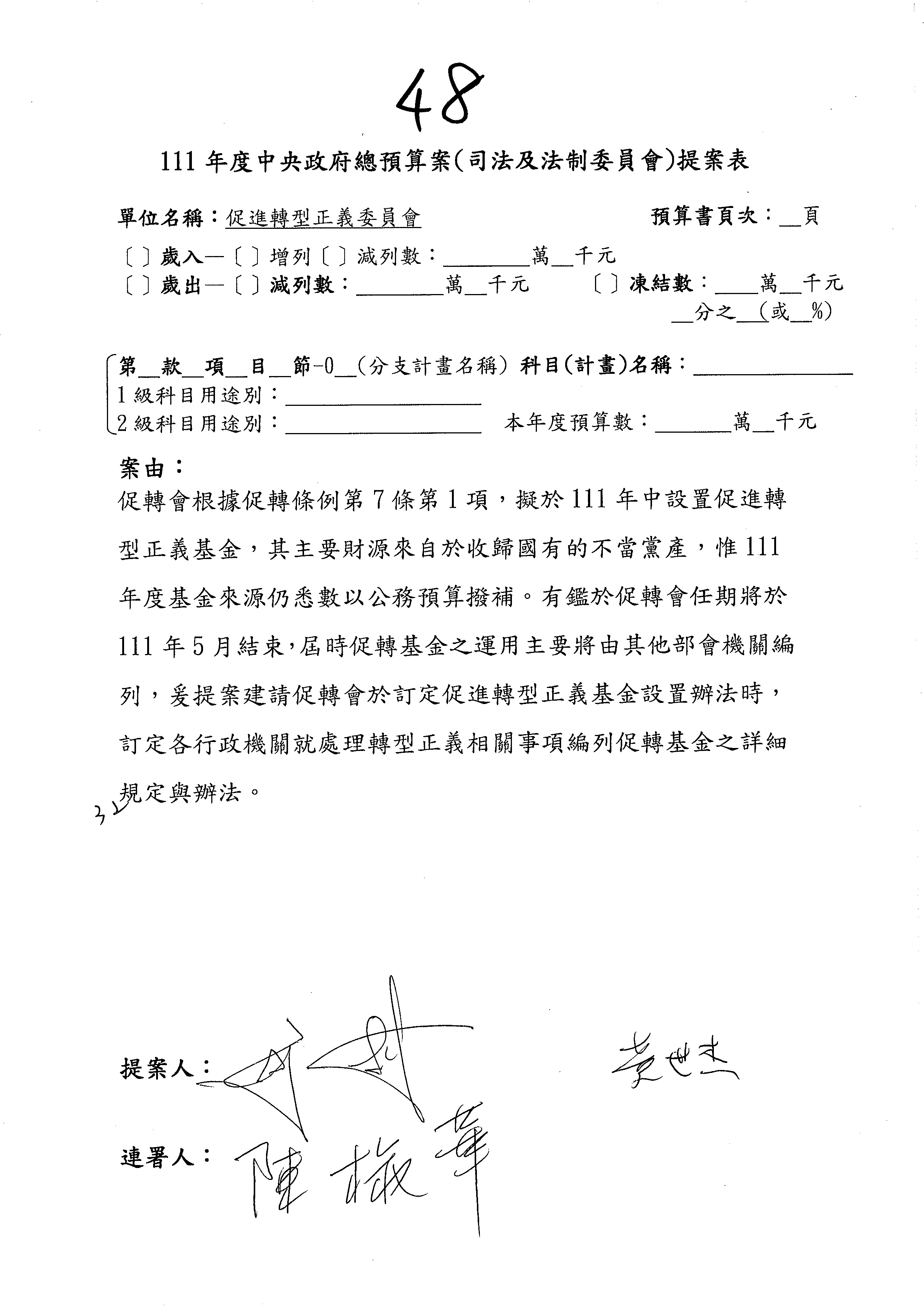 剛才已經宣讀完預算數及委員提案,我們現在開始進行預算審查。現在進行討論事項第一案,審查111年度中央政府總預算案關於促進轉型正義委員會主管收支部分。