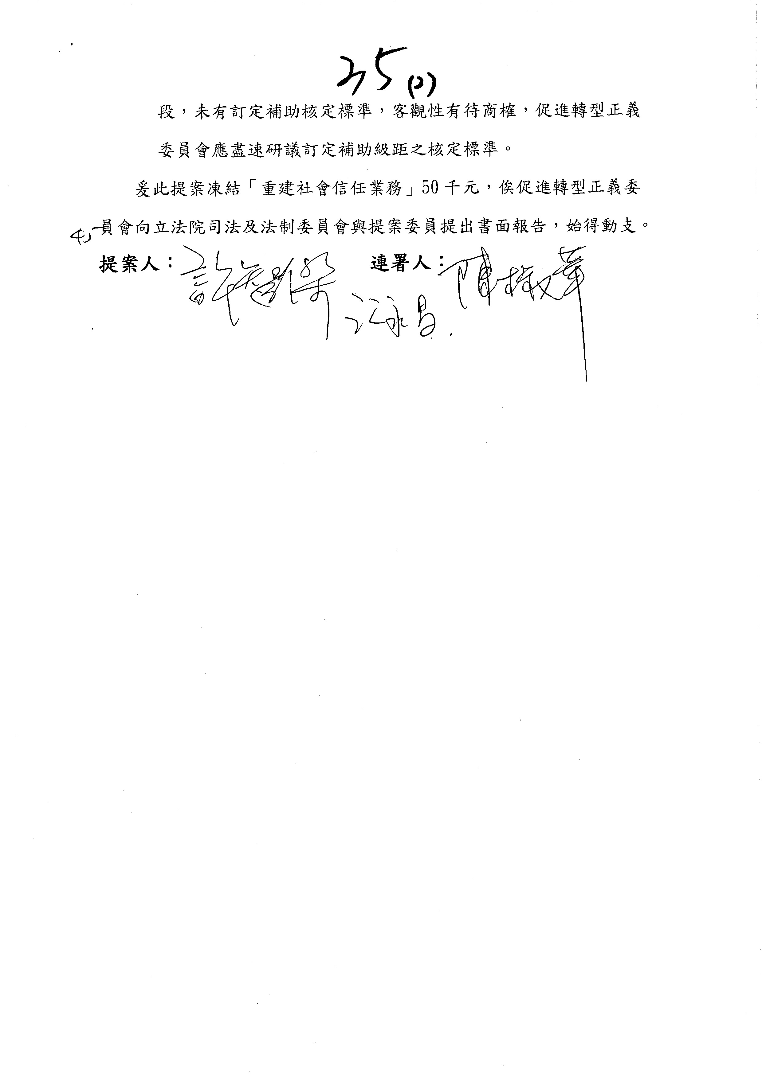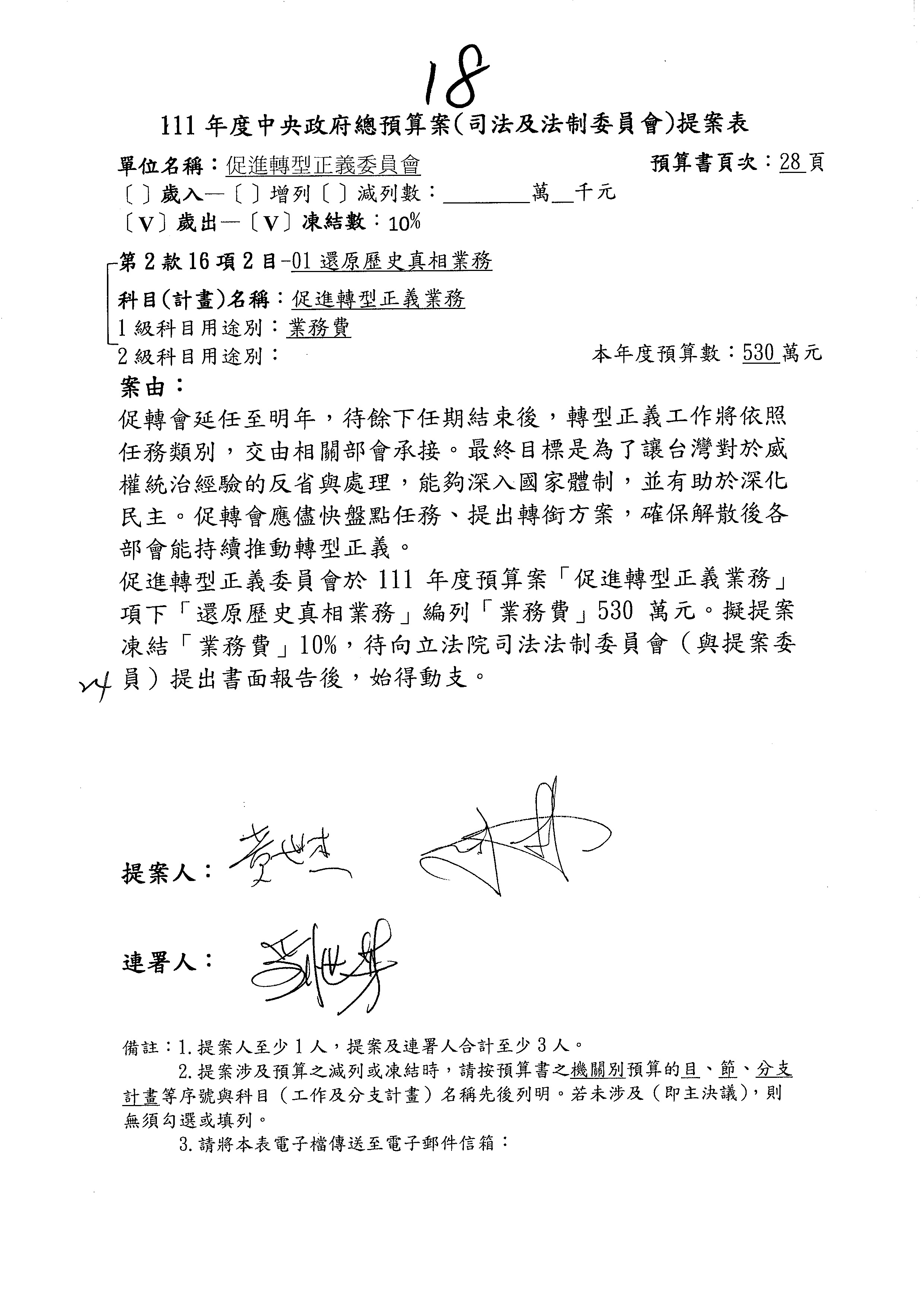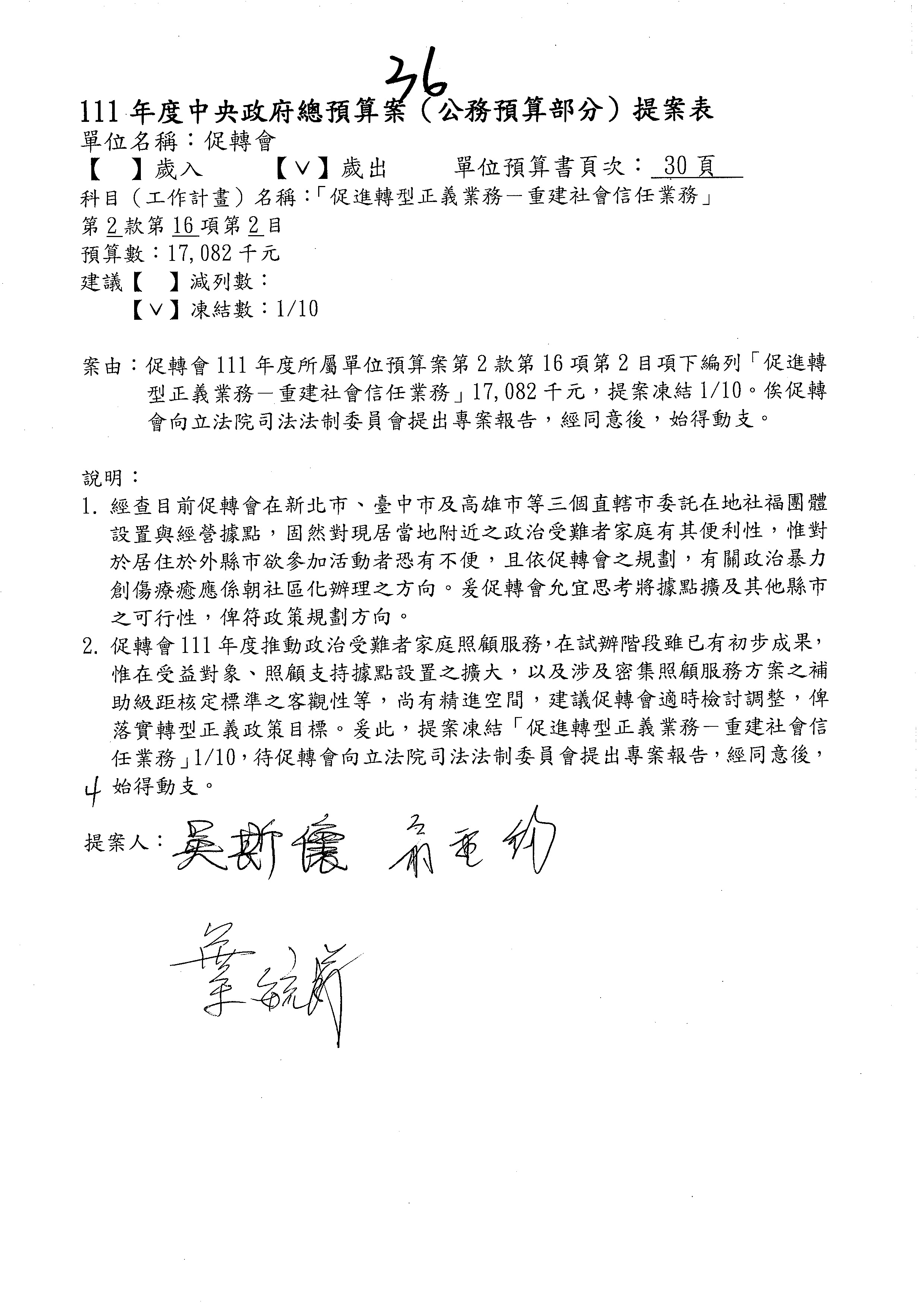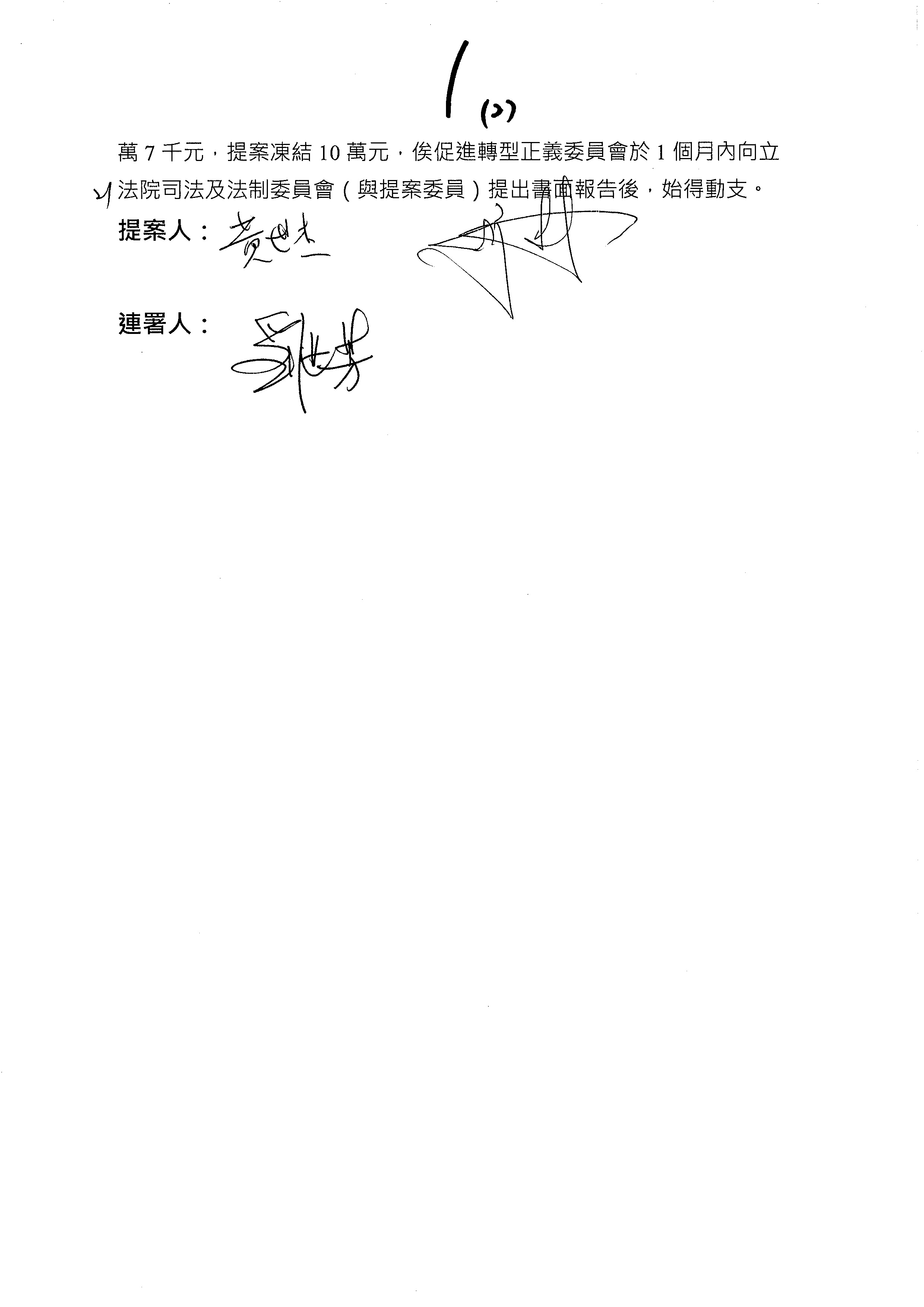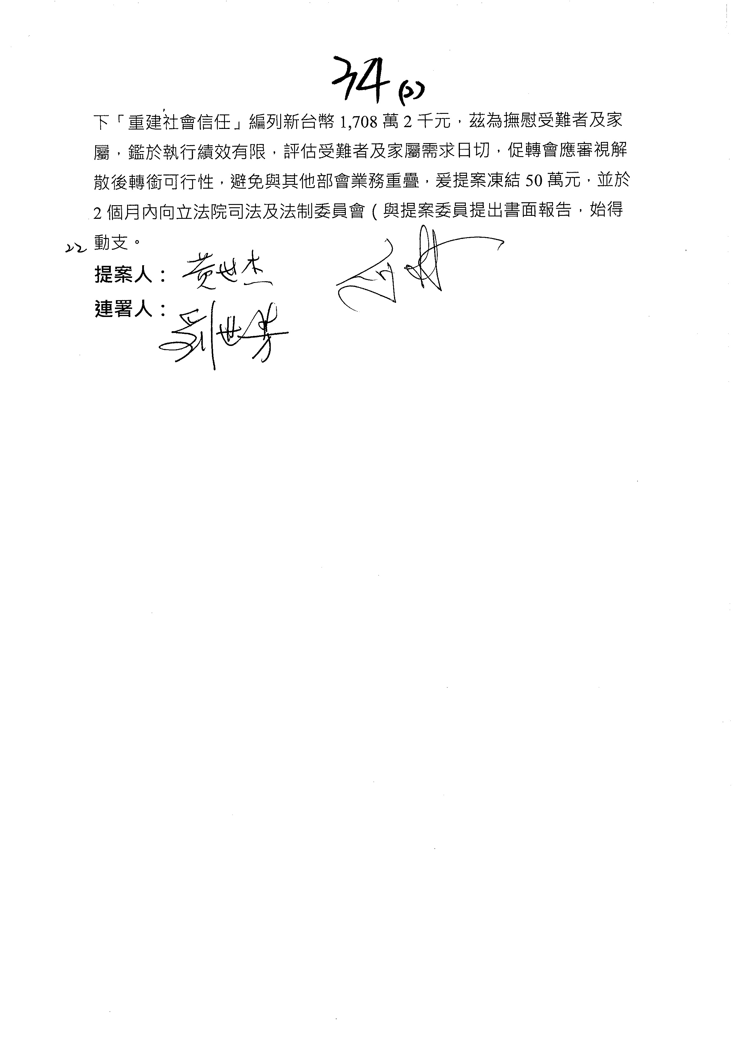 第2案部分,因為促轉會的任期到明年5月30日屆滿,各項工作都在收攏階段,如果凍結十分之一的業務費恐怕會造成困難,我們可以針對委員關切如何銜接任務的部分詳細跟委員做書面說明,但是不是可以在凍結的金額上酌減?請委員斟酌,謝謝。
