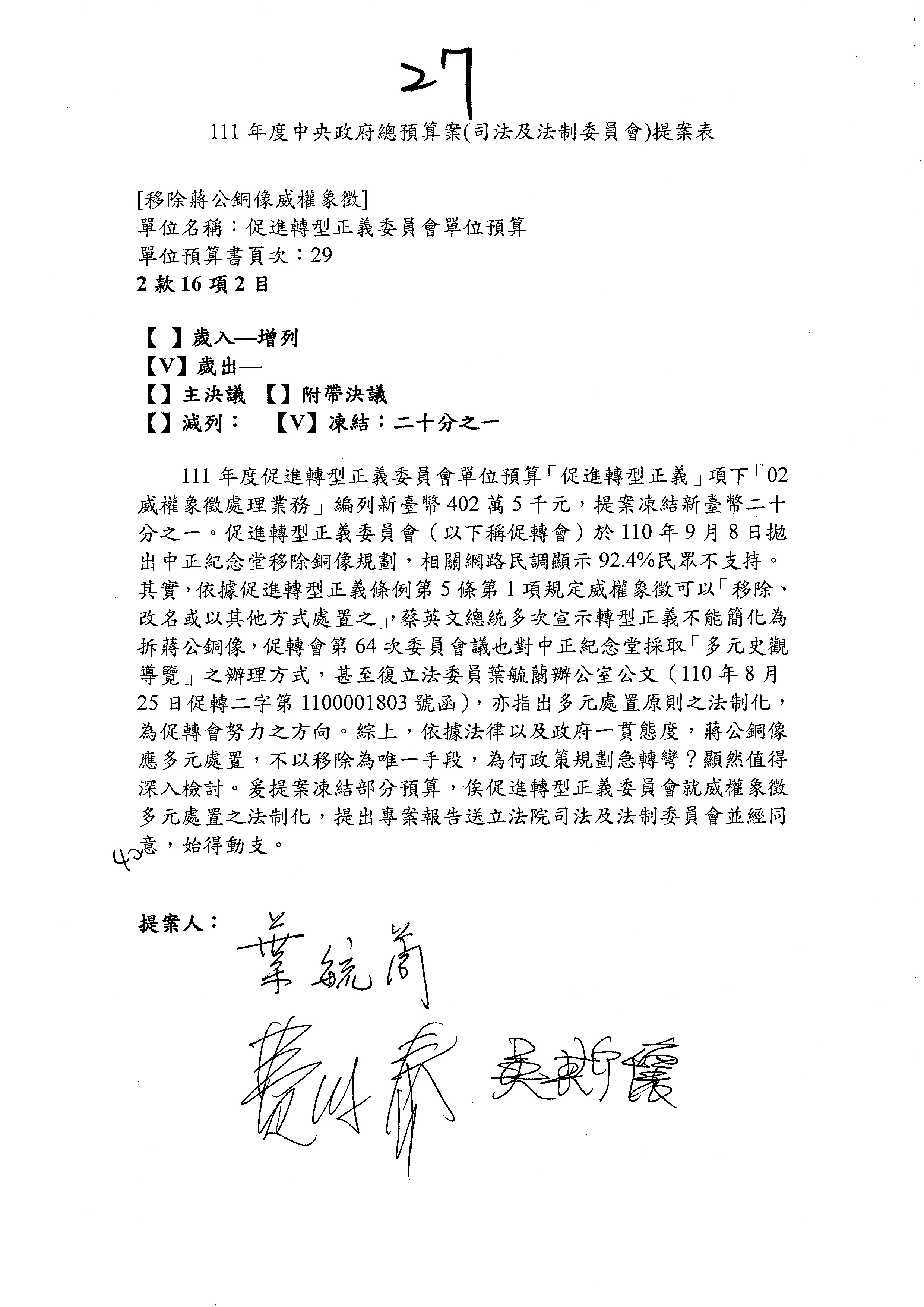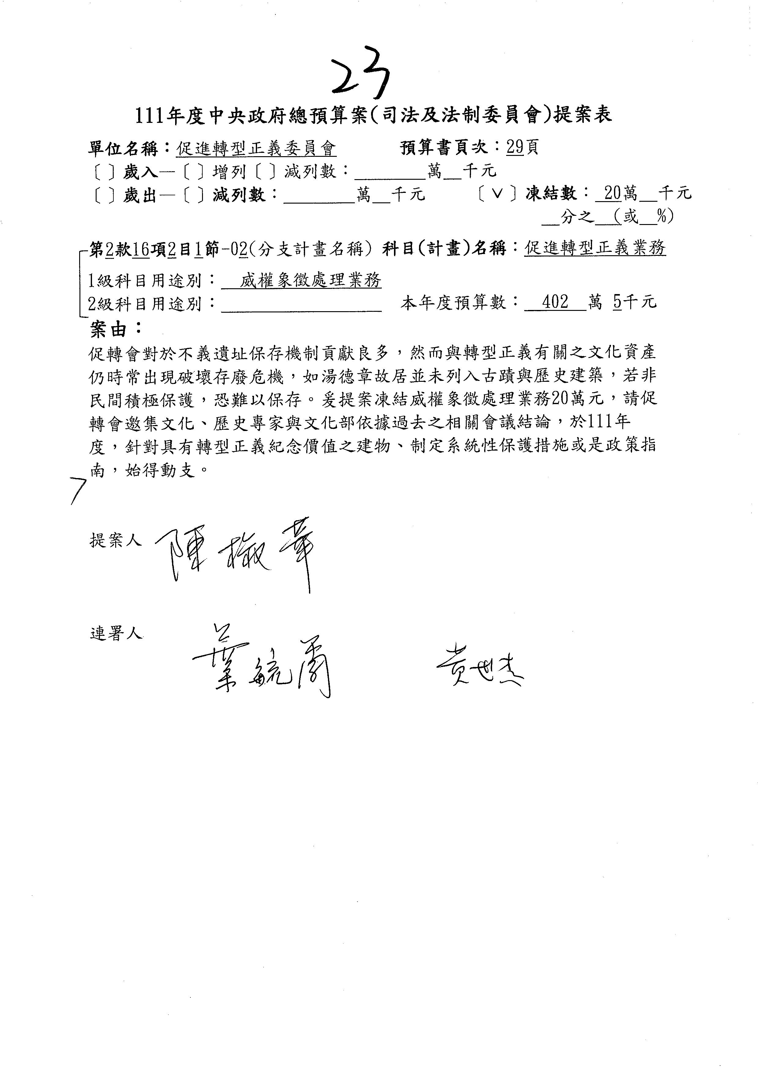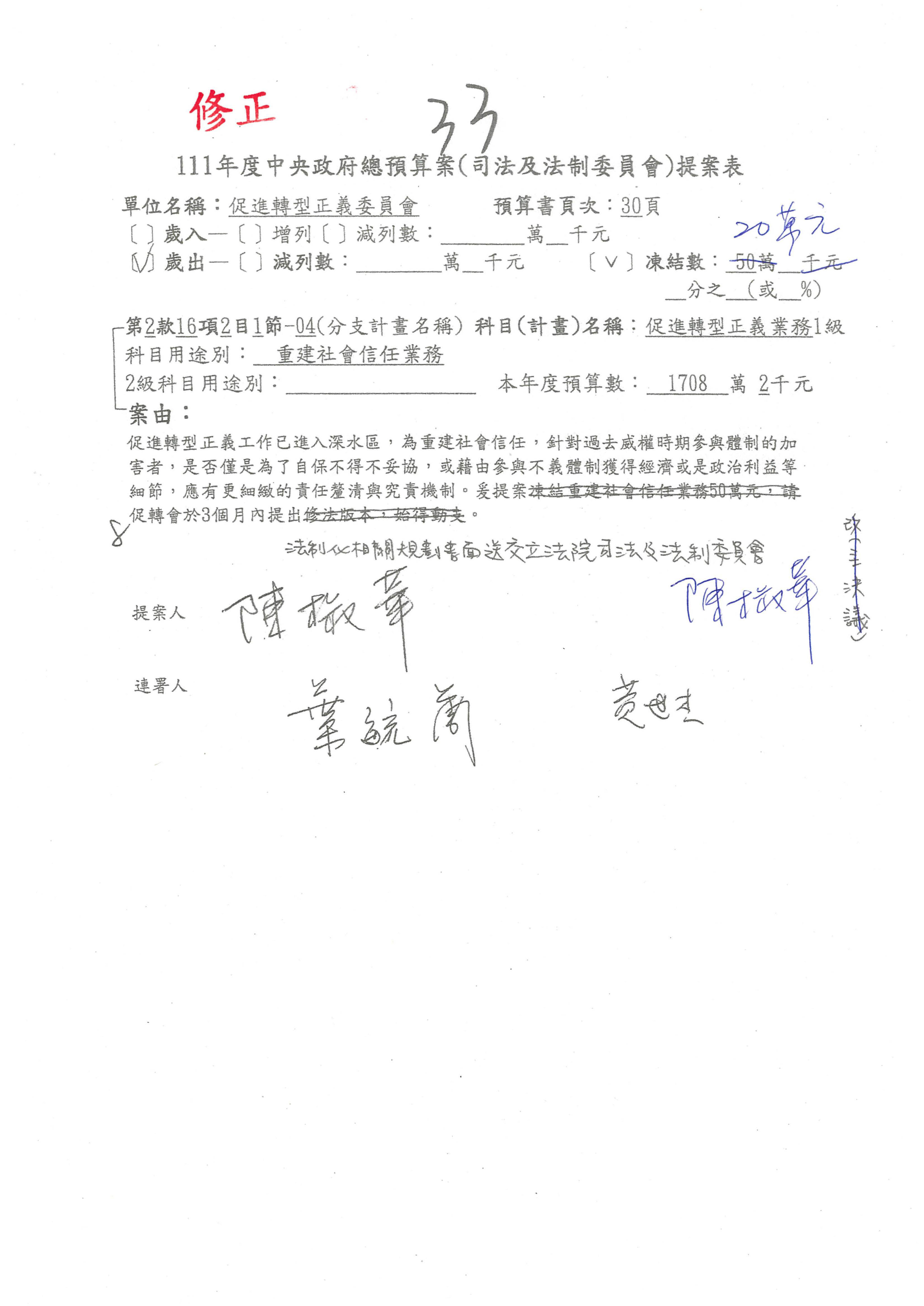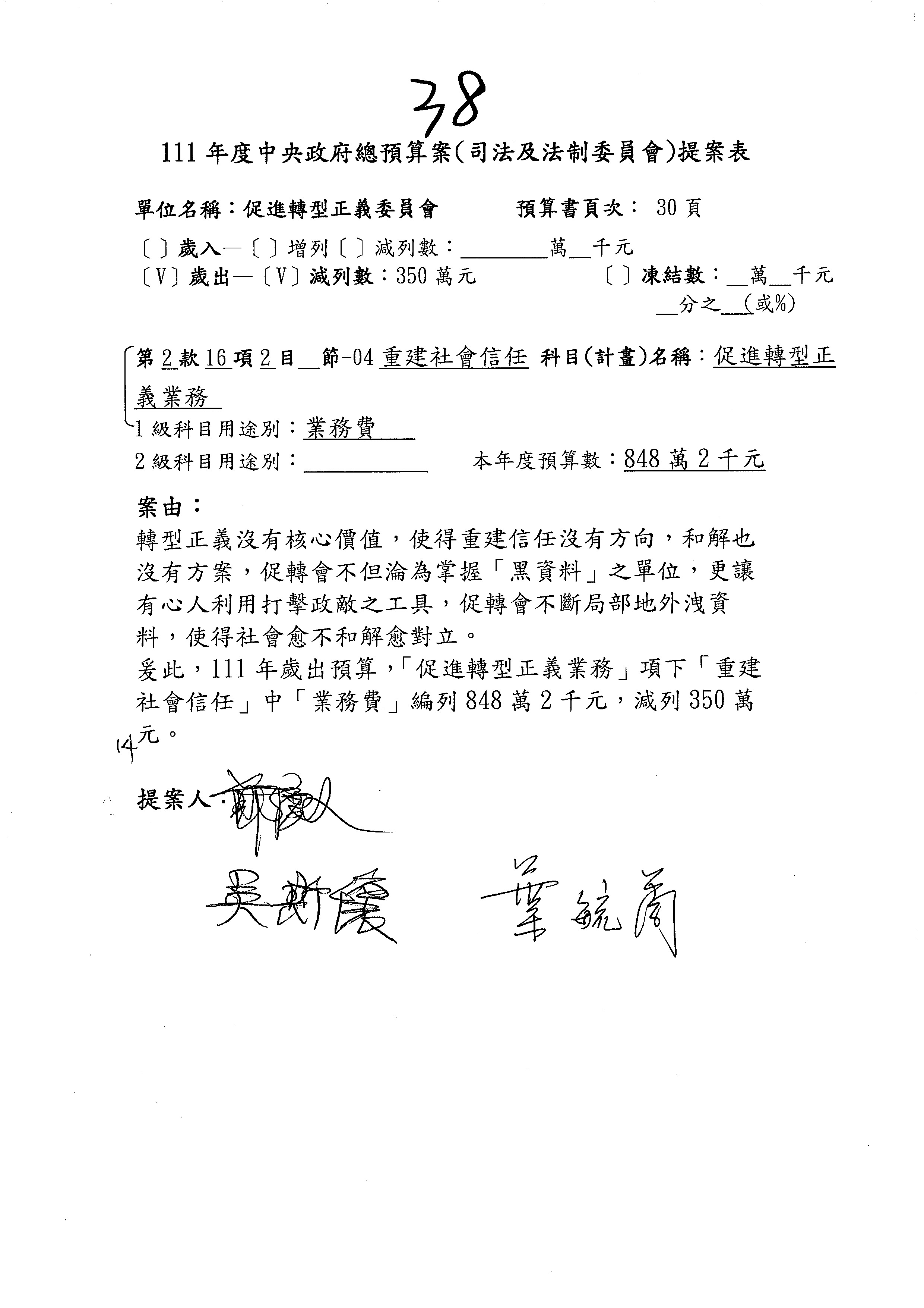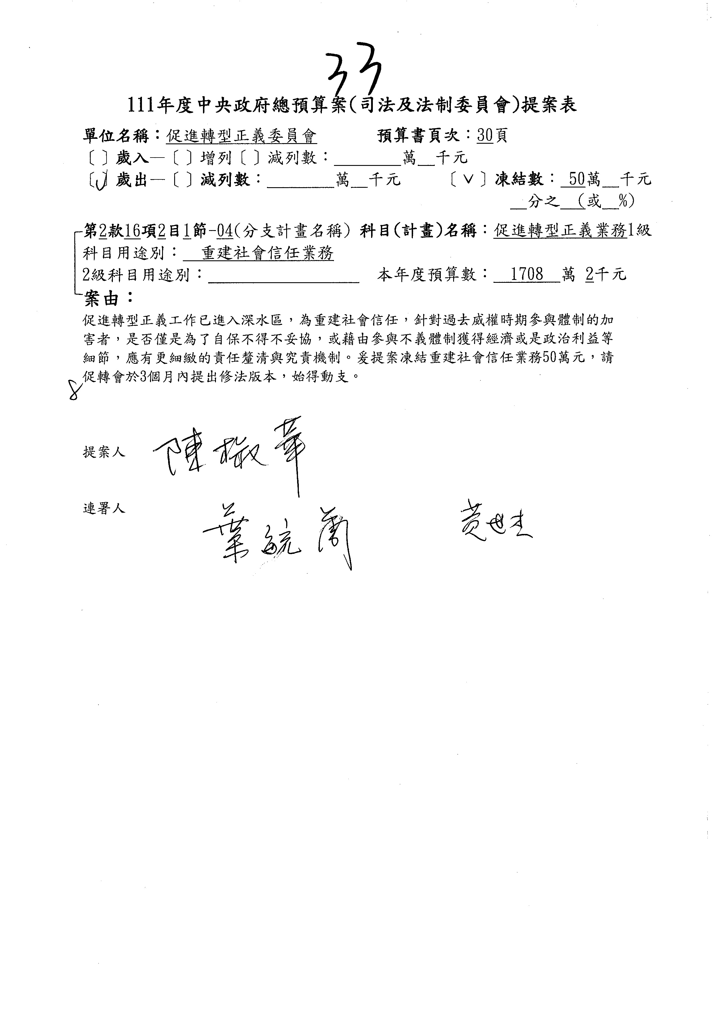 第2案部分,因為促轉會的任期到明年5月30日屆滿,各項工作都在收攏階段,如果凍結十分之一的業務費恐怕會造成困難,我們可以針對委員關切如何銜接任務的部分詳細跟委員做書面說明,但是不是可以在凍結的金額上酌減?請委員斟酌,謝謝。