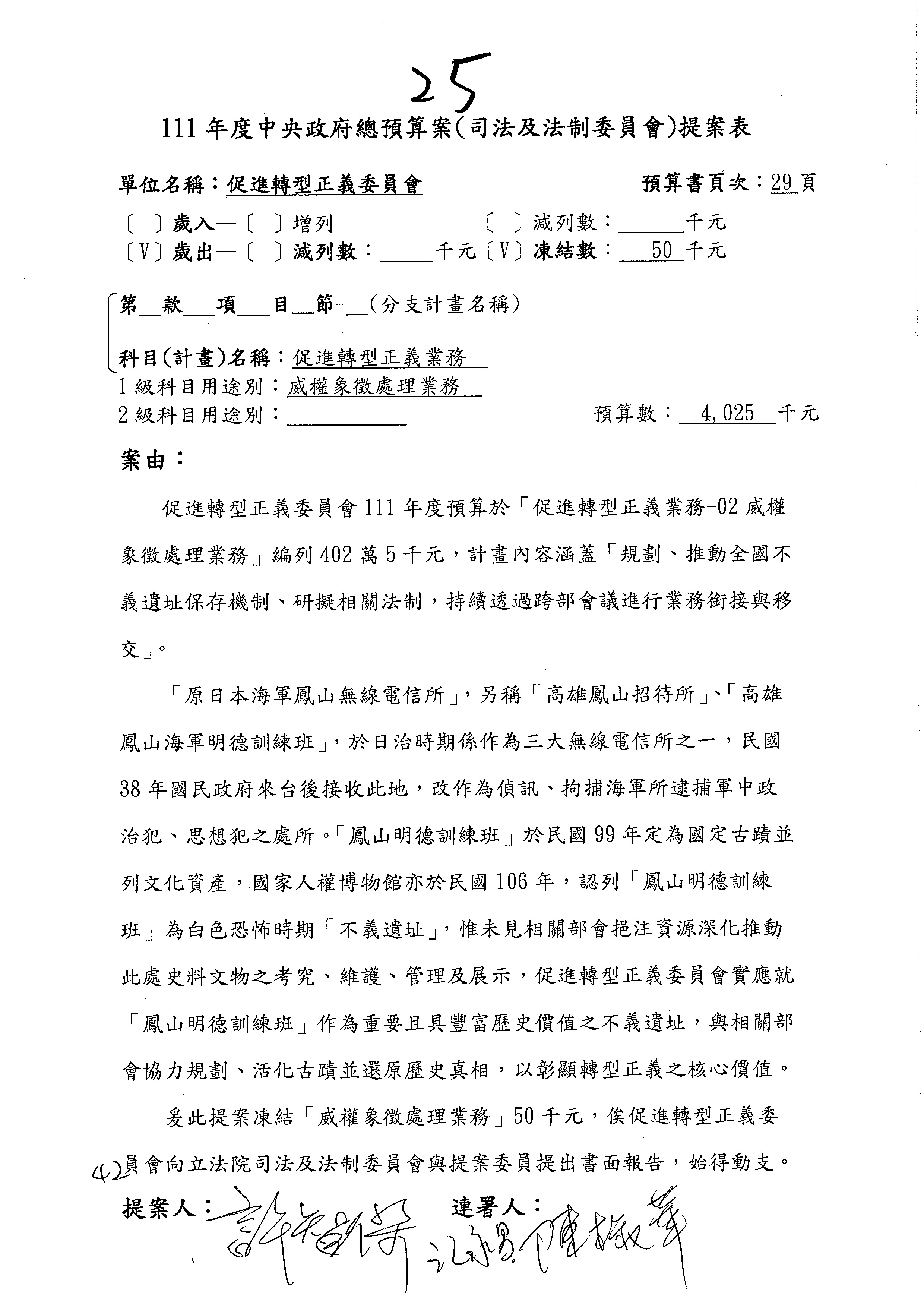 另外第25案,鳳山明德訓練班我已經講很久了,但是都沒有具體的動作,到底你們未來的規劃是什麼?總要讓我們知道後續促轉會、我們的國家想做什麼事?不然陳設在那邊其實都有人去參觀,但都沒有好好整理,這部分我希望先凍結,等你們給我一些書面報告之後,可以開始解凍再來說。包括第28案,對於中正紀念堂大家已經談很久了,但是你們都沒有具體的答復;第29案有一點小改,沒關係,大觀念上還是威權的處理,我就一併提出,謝謝。