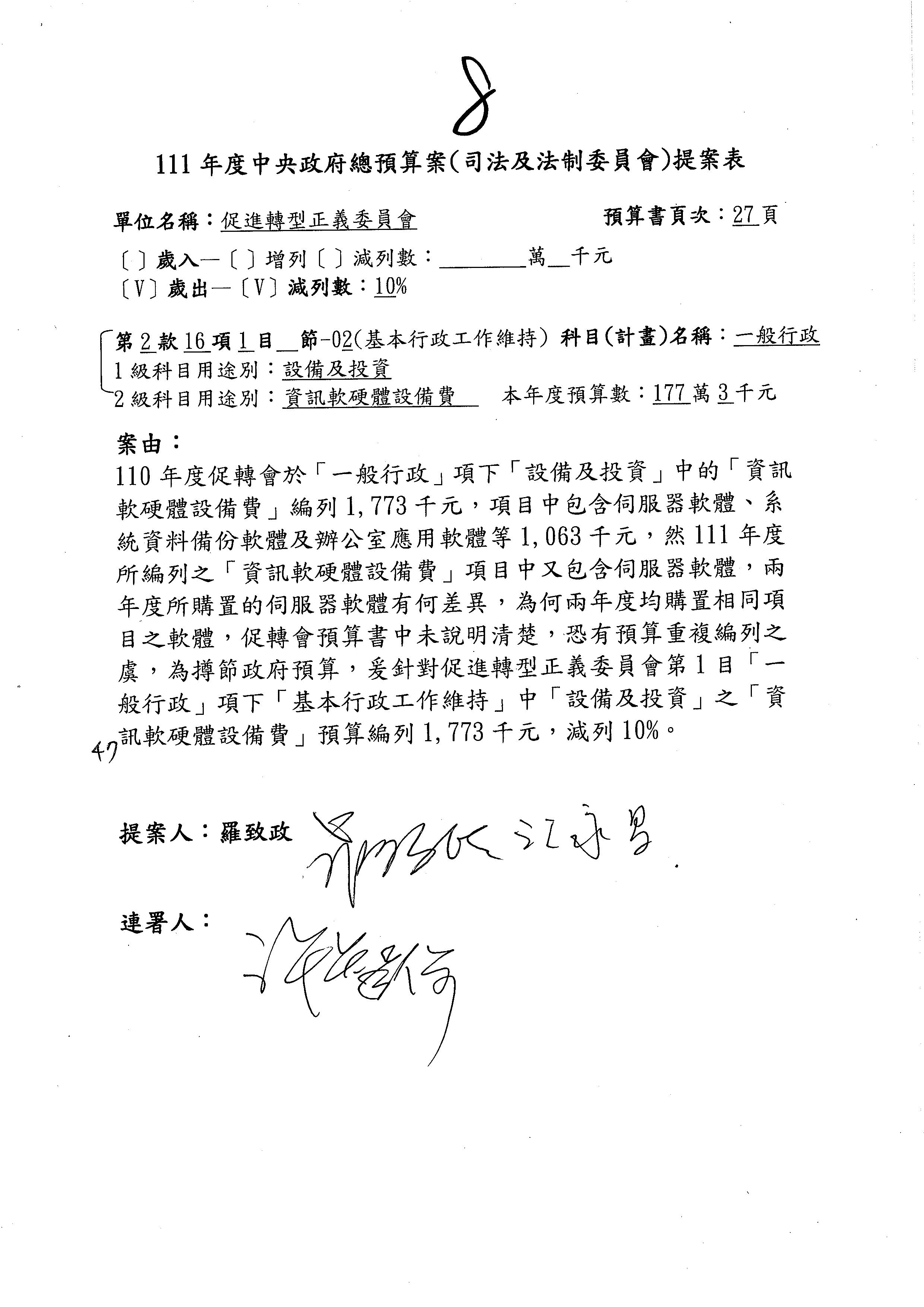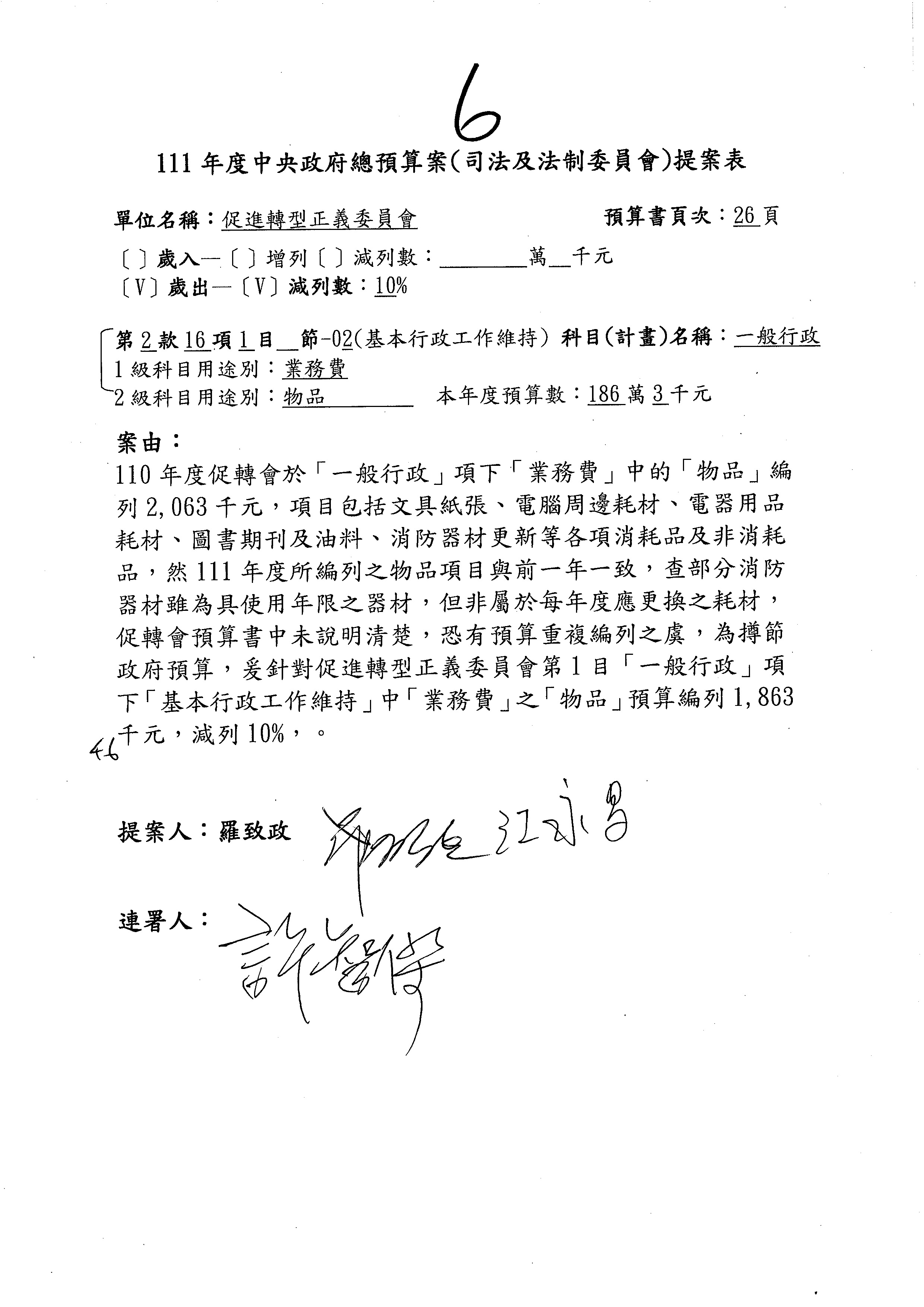 羅委員致政:主席,我的第6案跟第8案剛剛有跟促轉會溝通,原則上第6案就是減10萬元、第8案減5萬元,我同意。