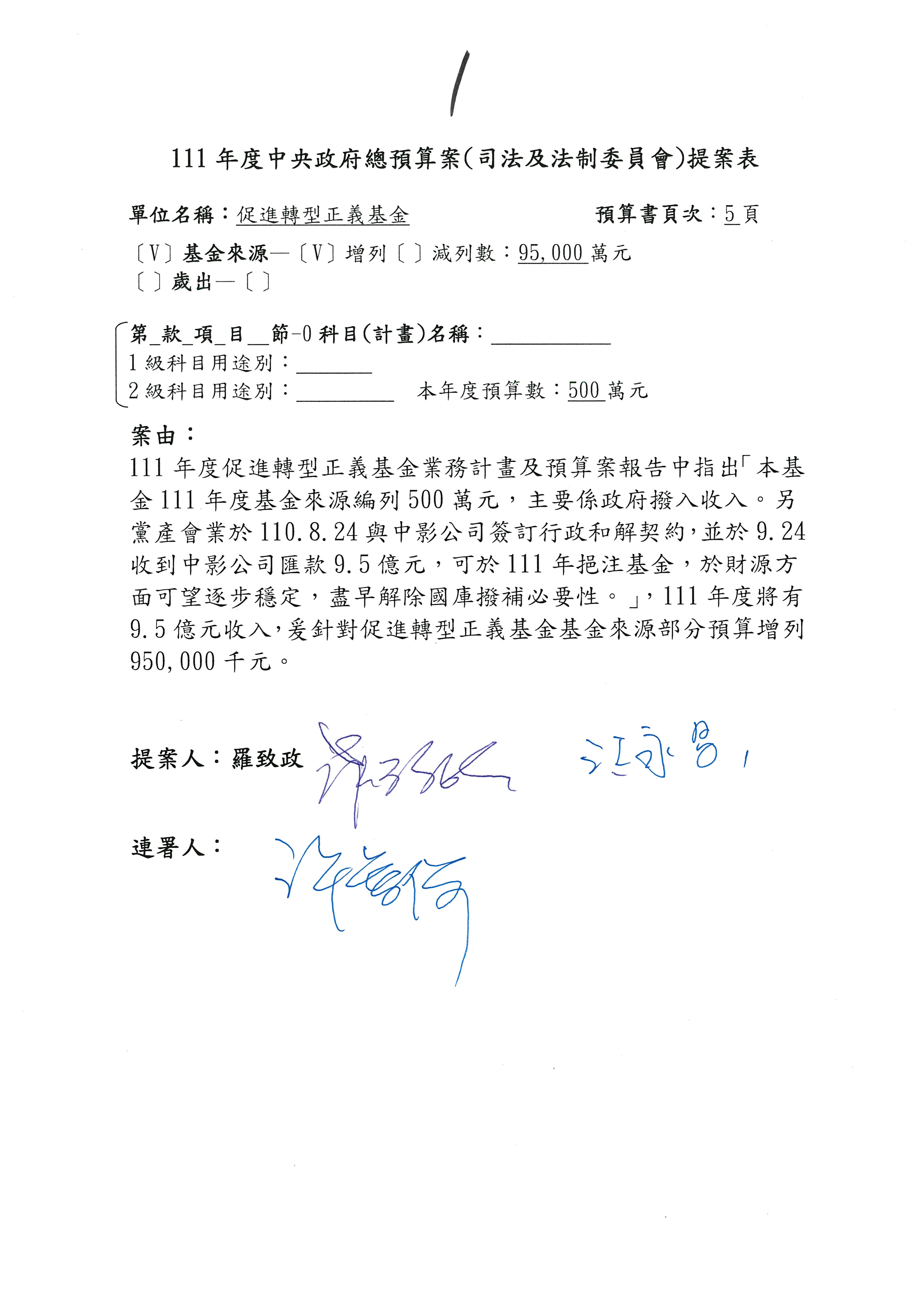 羅委員致政:促轉會送預算來立法院的期程與後來的發展有一些落差,主要是中影和解金額中有將近9億5,000萬元會進到促轉會,因為預算來不及編,由於基金明年就要開始運作了,如果能夠把這9億5,000萬元直接編進去,我相信對於未來運作會有很大的幫助,所以我建議歲入增加9億5,000萬元。反正這是已經到手的錢嘛!所以OK啊!