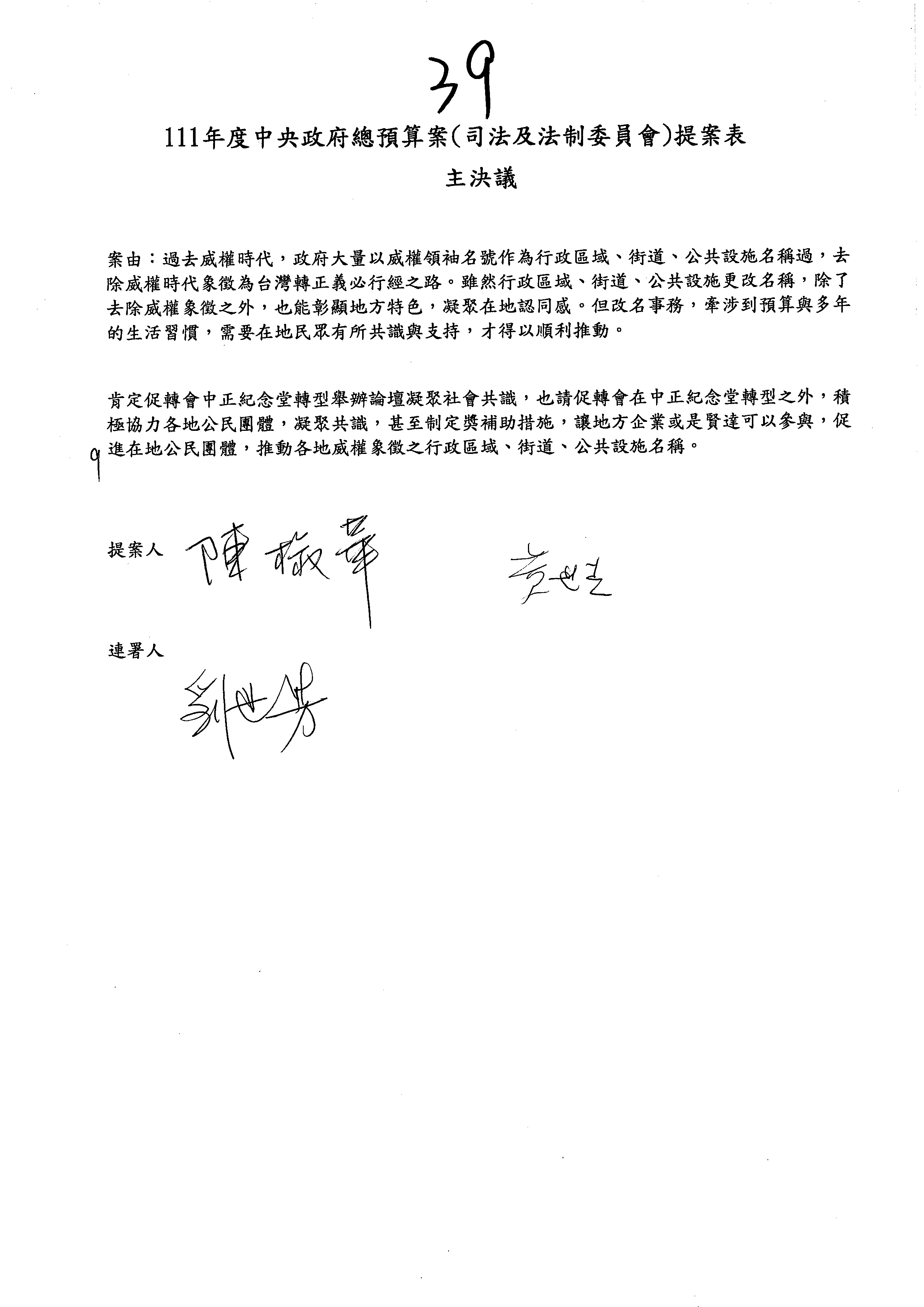 主席:由於第39案修正文字已經送到委員會了,所以先作如下宣告: