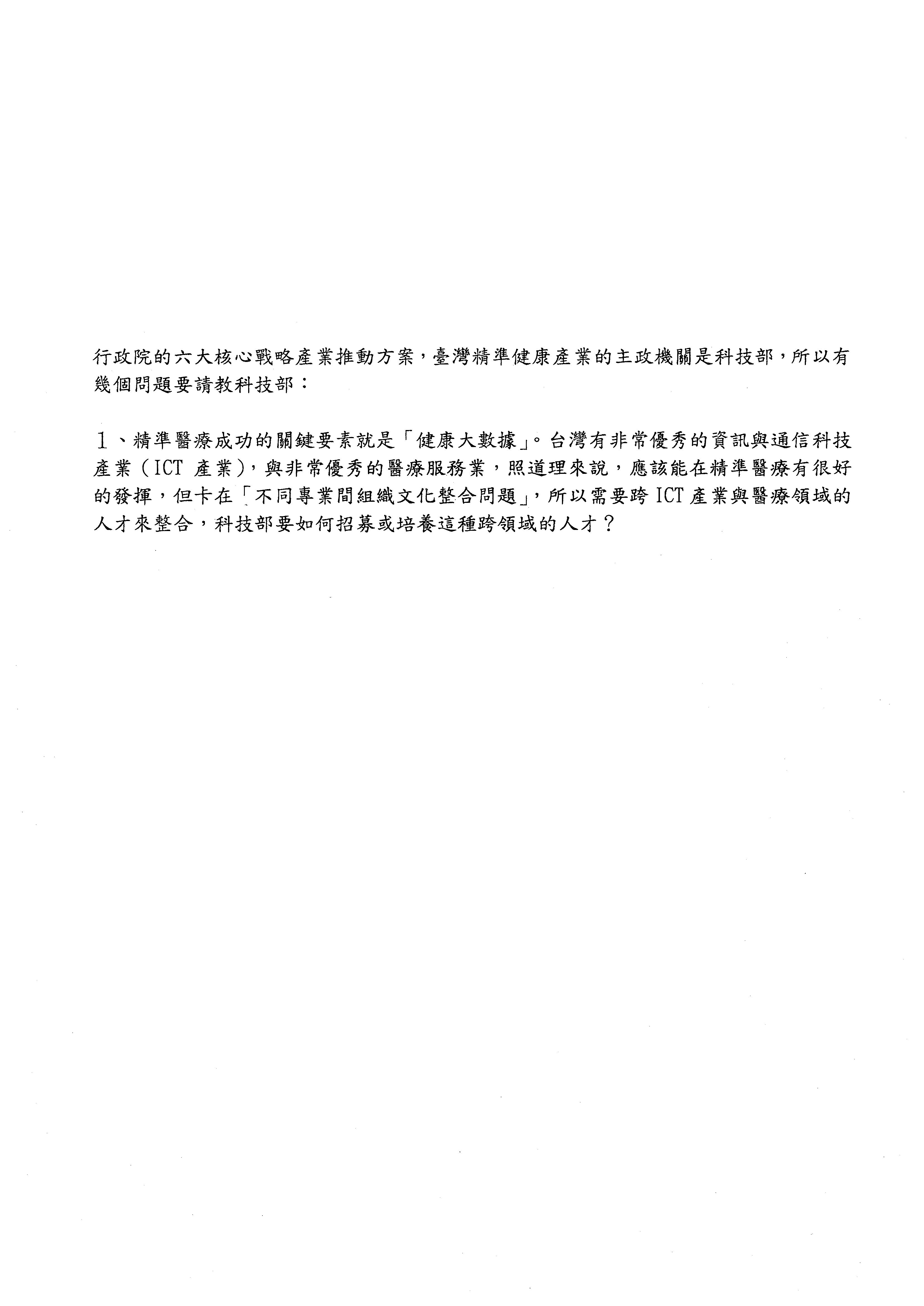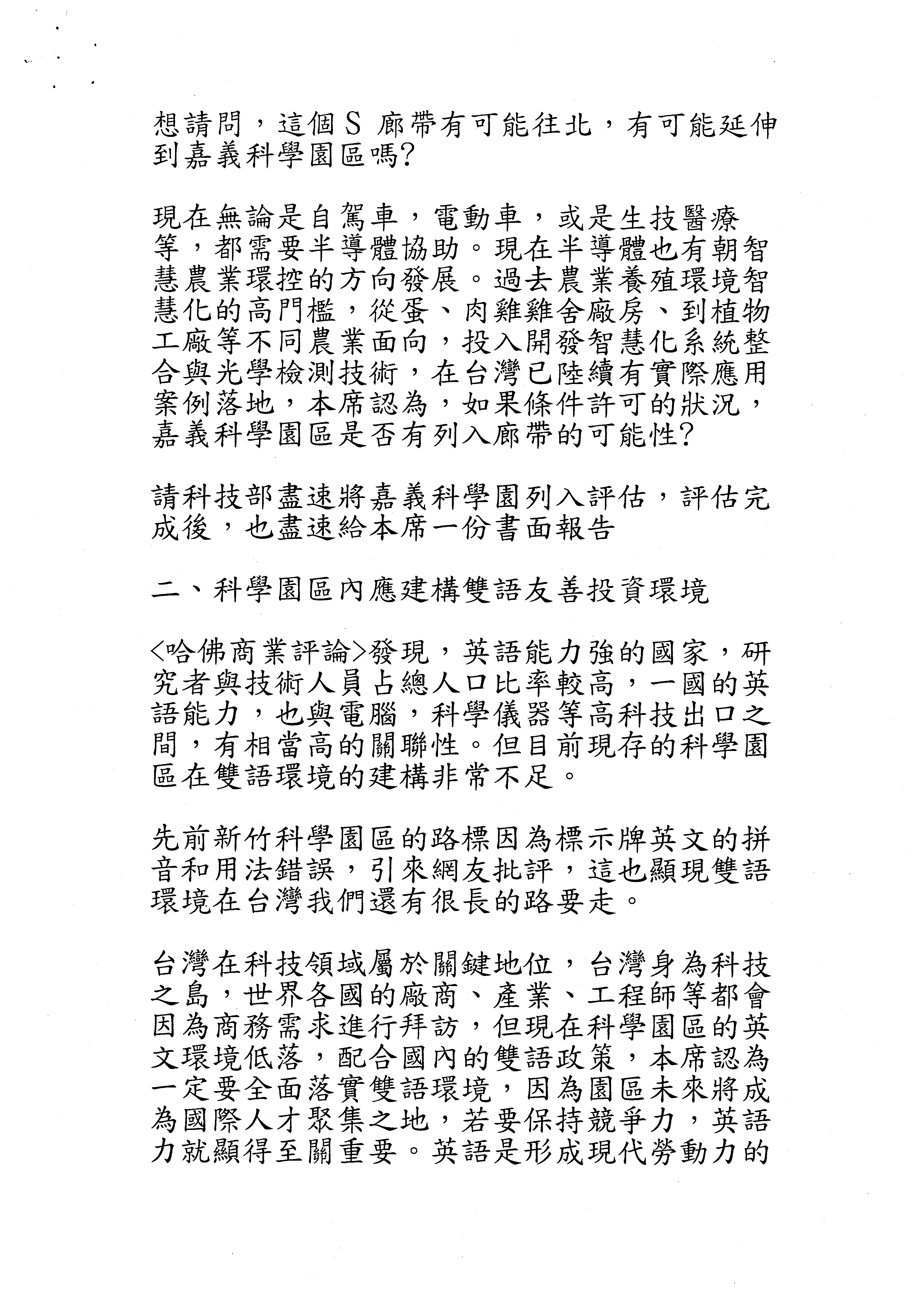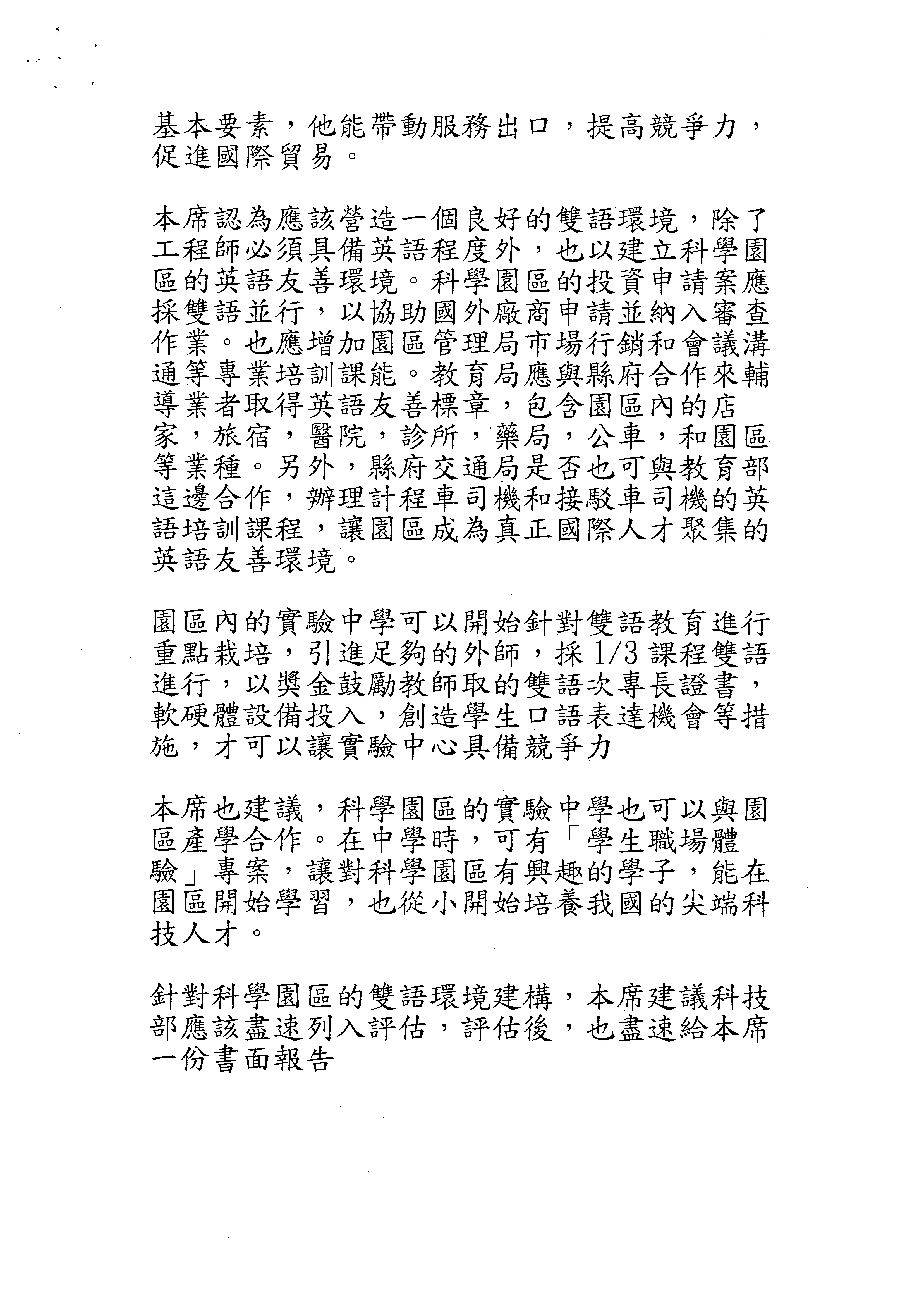 另外,因為時間上的關係,你這邊有提到設立實驗中學,就是人才的培育及培訓,我看到的可能都是在科學園區裡設置實驗中學。然你們是放在教育委員會的話,未來在人才的培育及培訓中,也應該與社區及一般高中結合,不是只與大學結合而已。現在在少子化之後,很多國中要有一些亮點的訓練,未來的國中及高中,針對我們產業發展的職業訓練,應在技職教育的課程設計上提供一些具體的作為,可以嗎?